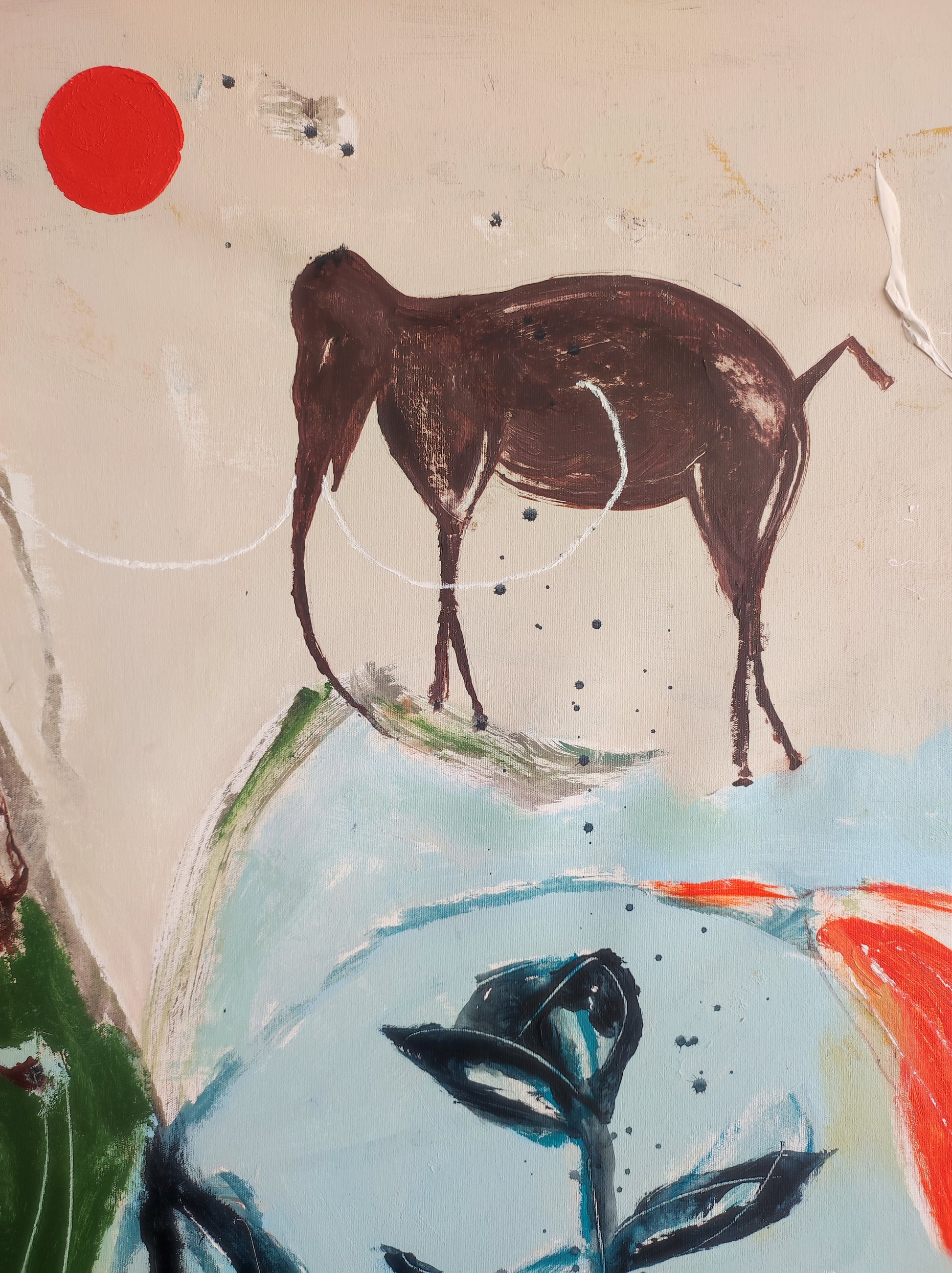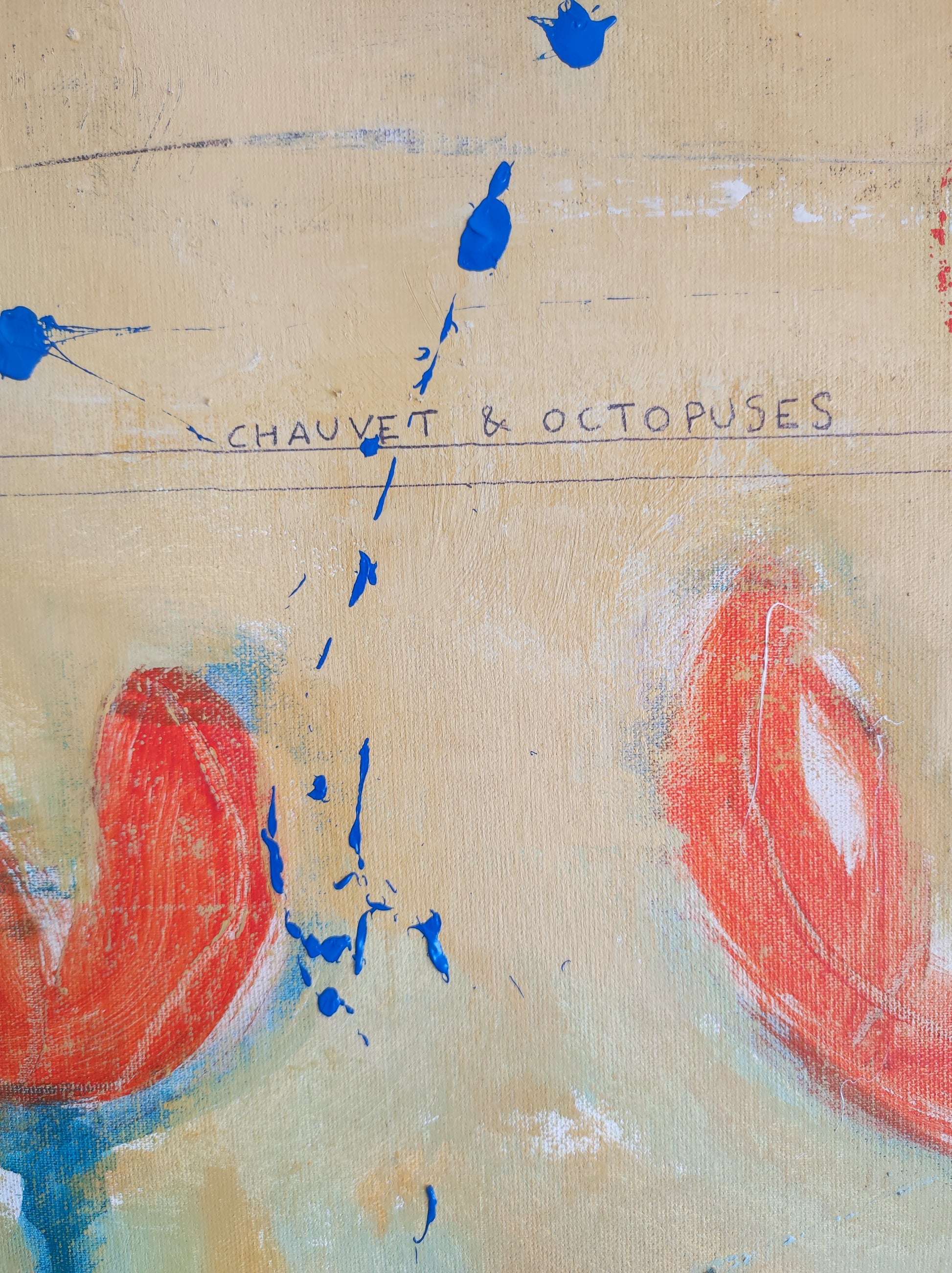 Rastros y marcas de capas anteriores. Naturaleza desubicada, un bodegón y  dibujos de la Cueva de Chauvet forman esta historia de pasado y de futuro. Lo que nos hace humanos y nuestra esencia animal.