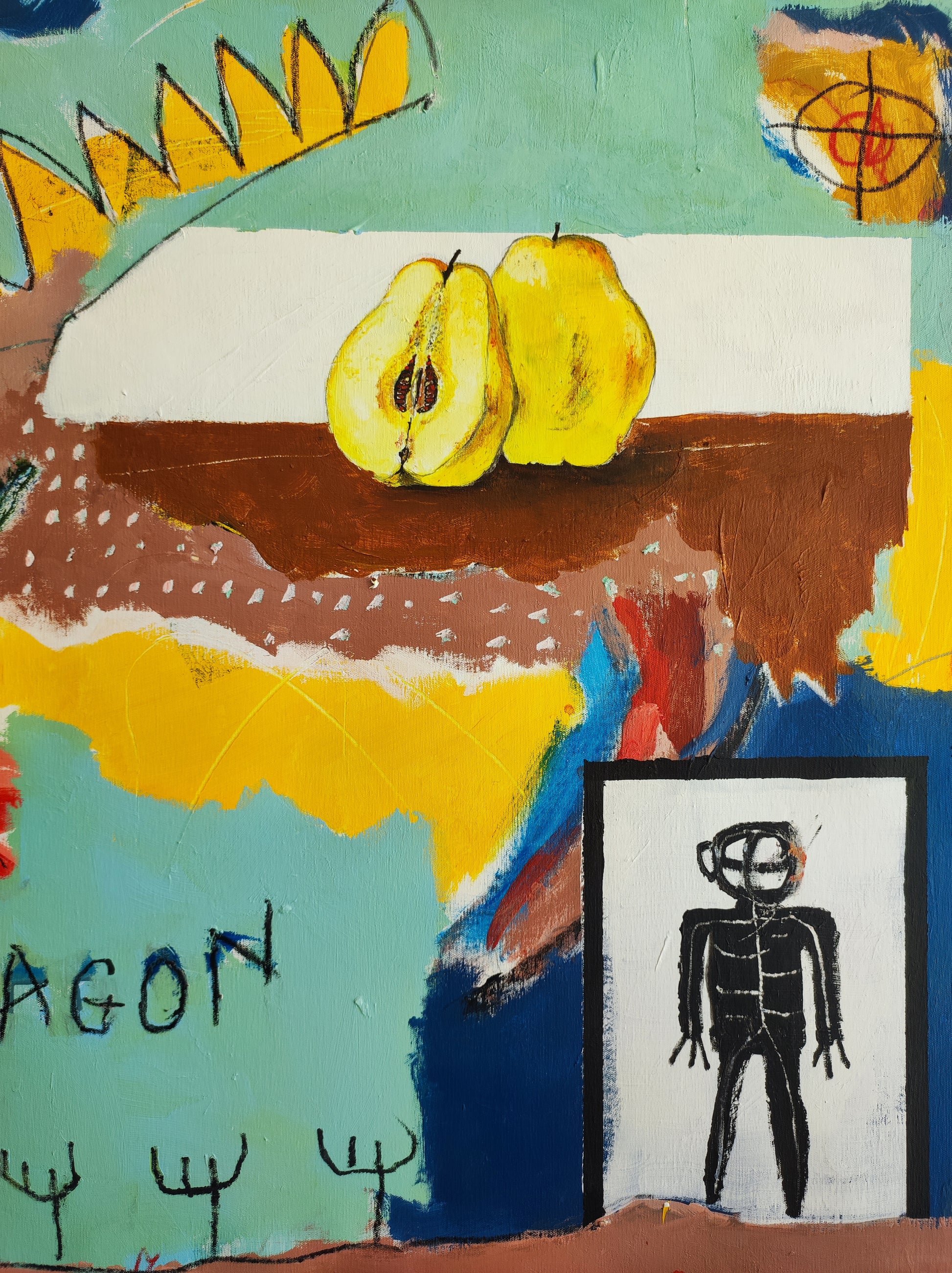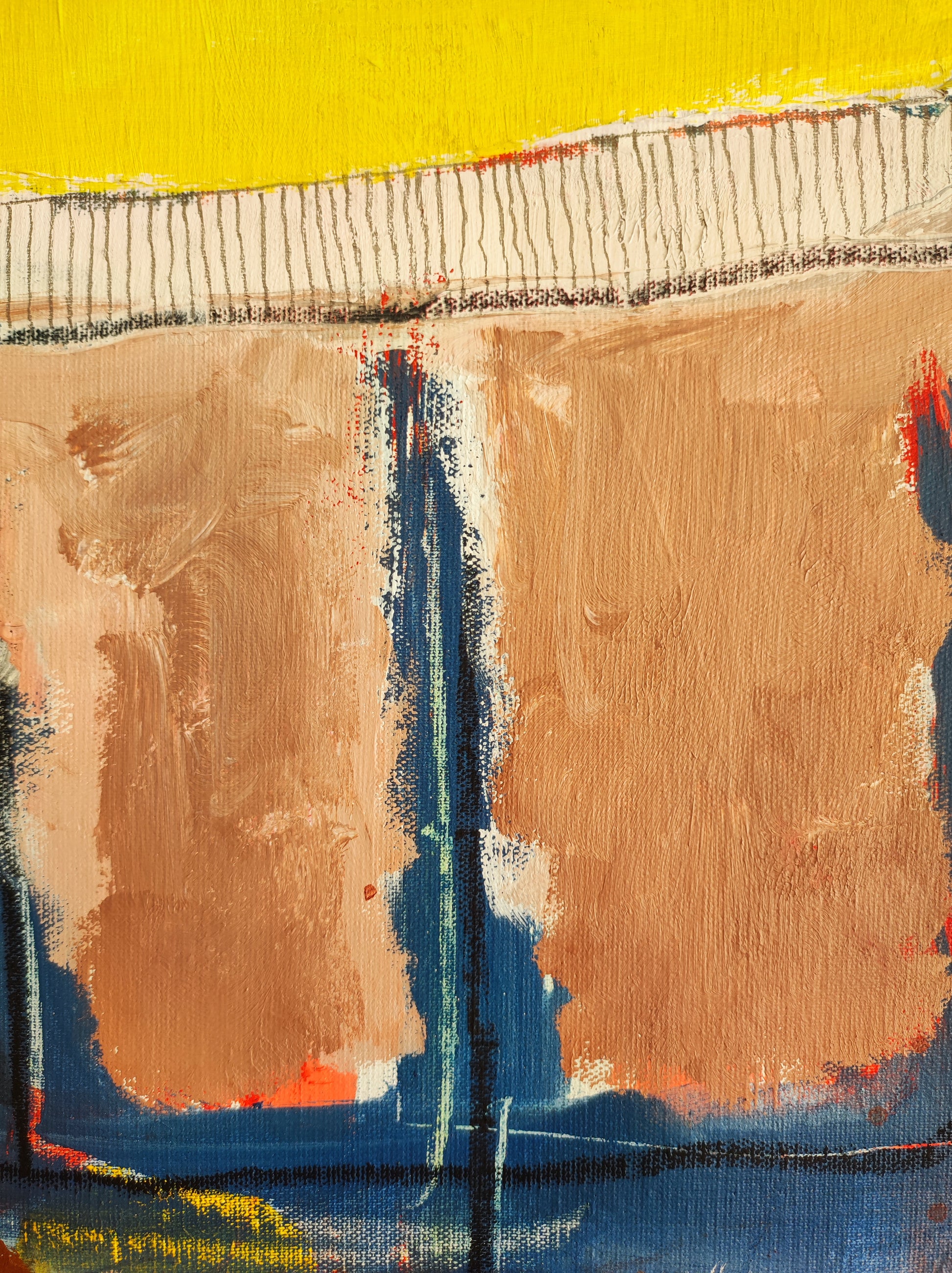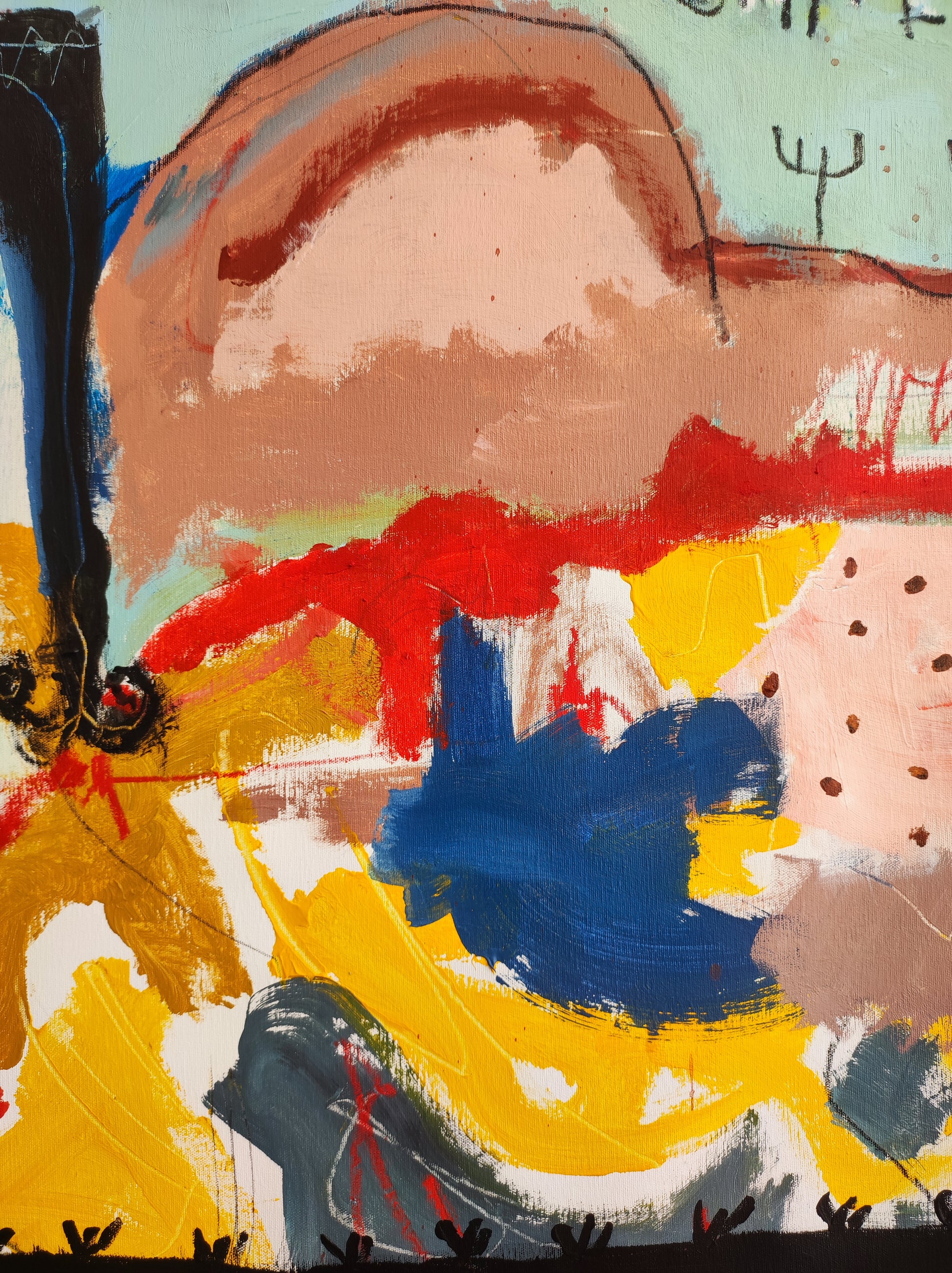 Pintura gestual, intuitiva, que deja que las cosas pasen y se apoya sobre lo que aparece. Aprovechando el accidente y aceptando las consecuencias.