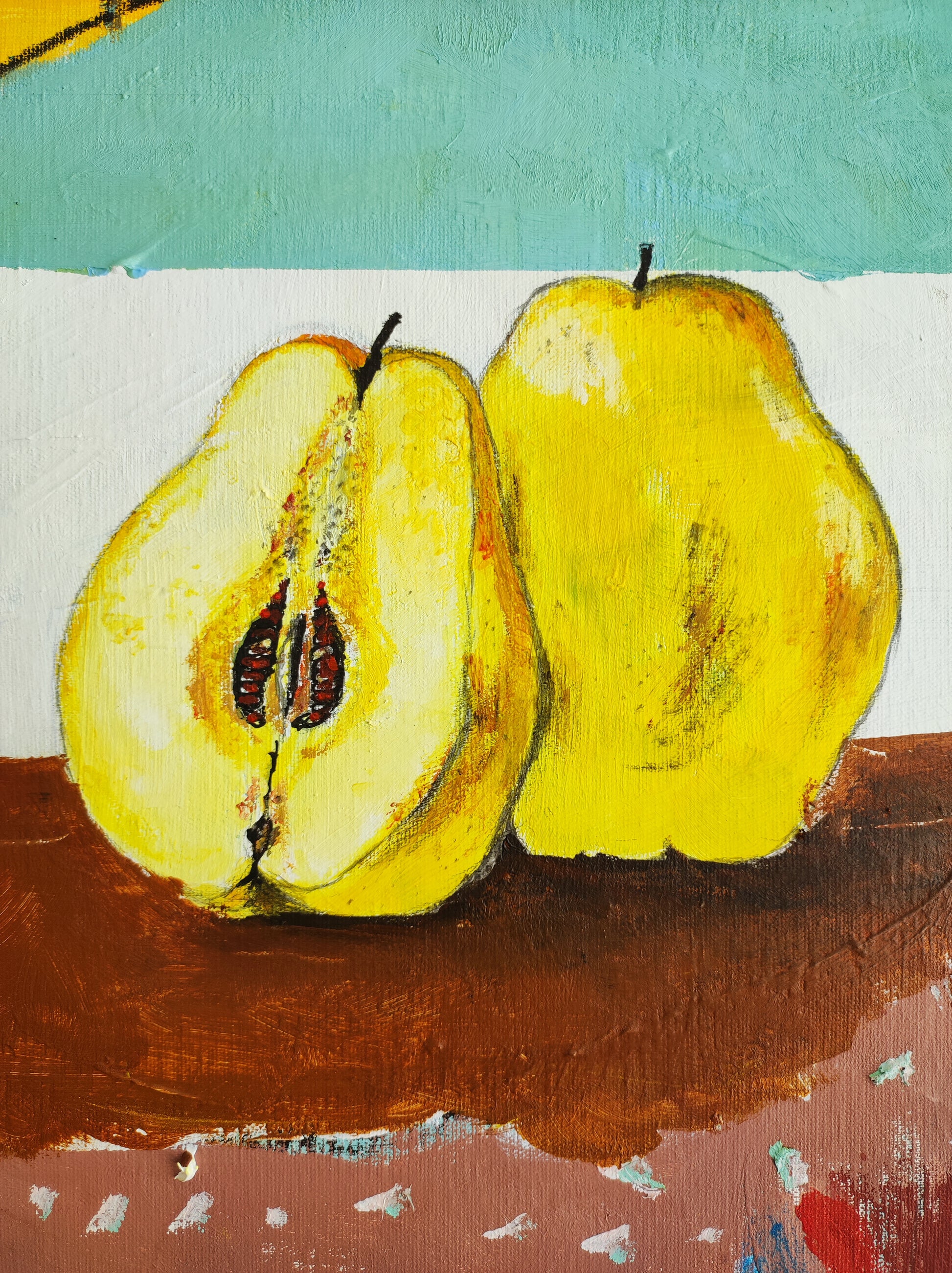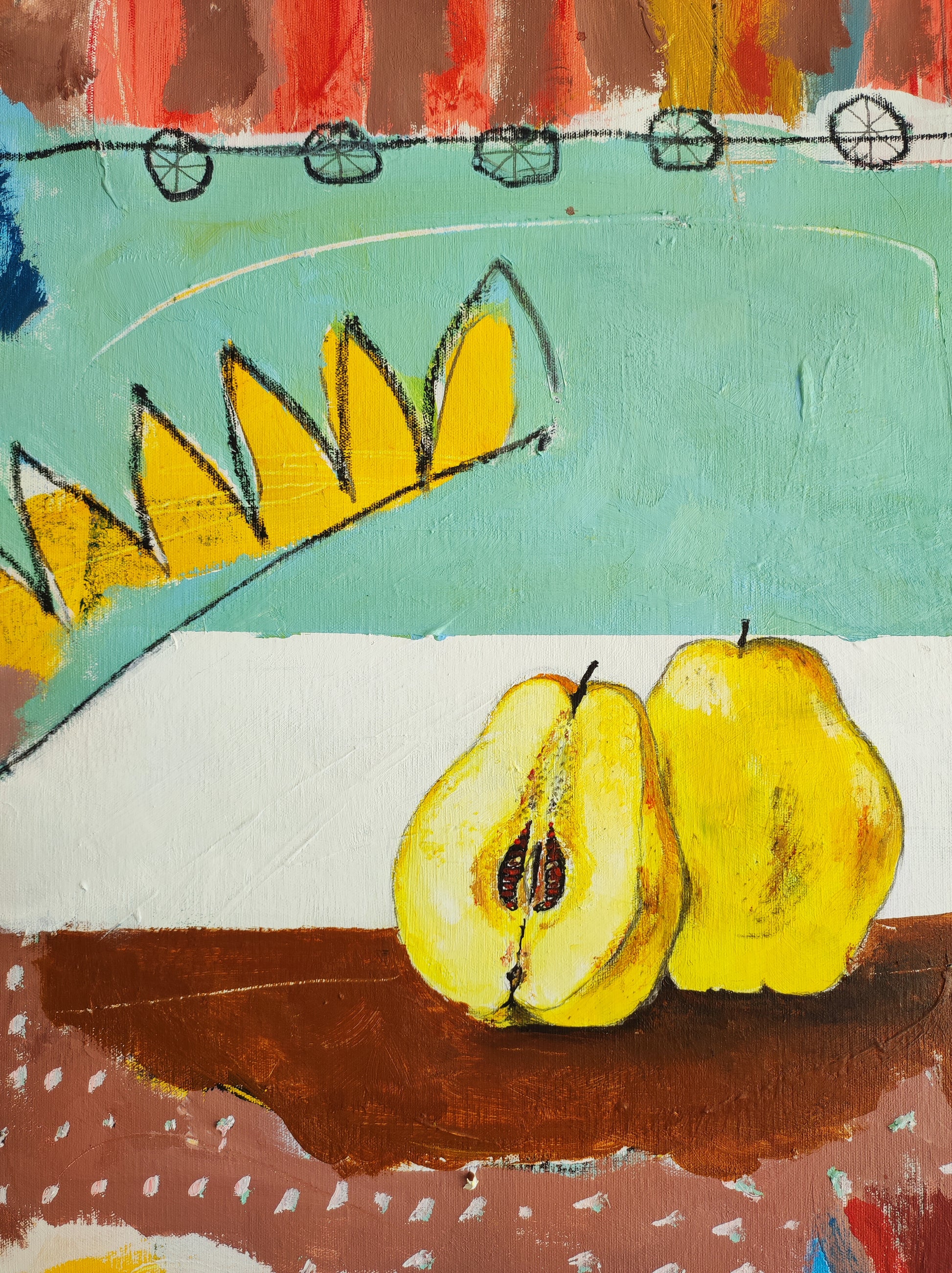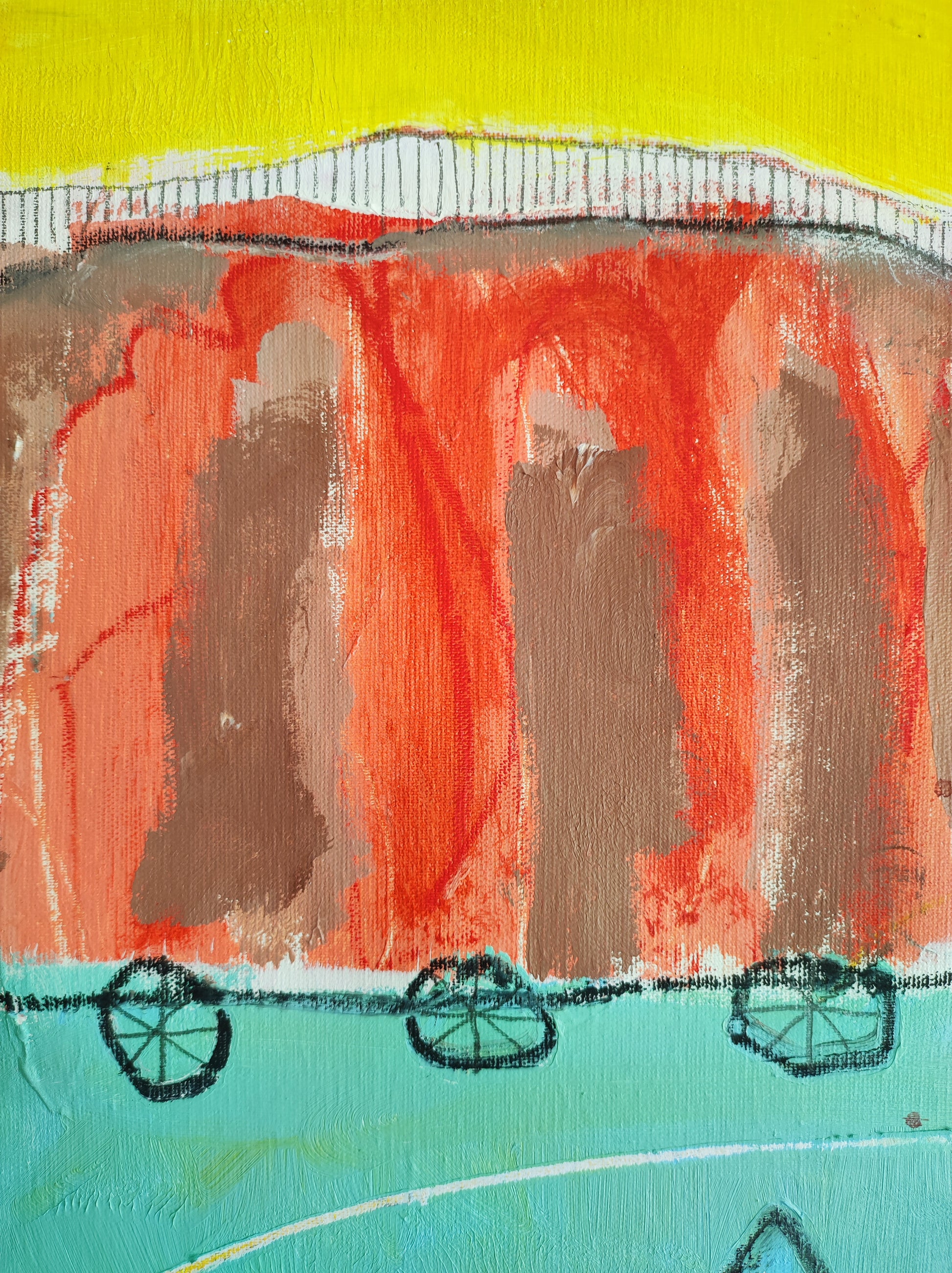 Pintura gestual, intuitiva, que deja que las cosas pasen y se apoya sobre lo que aparece. Aprovechando el accidente y aceptando las consecuencias.