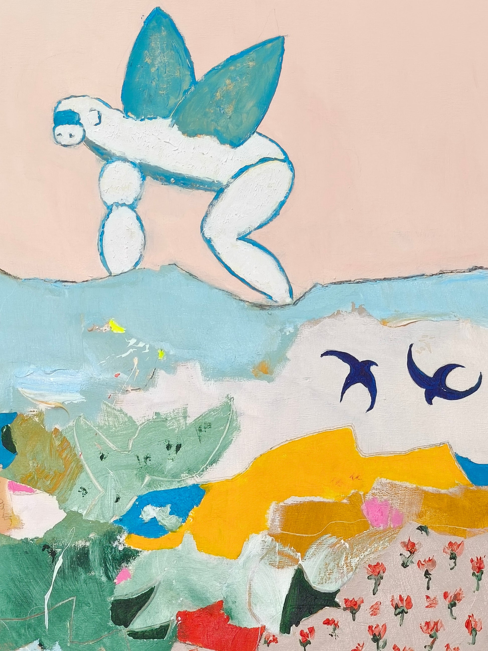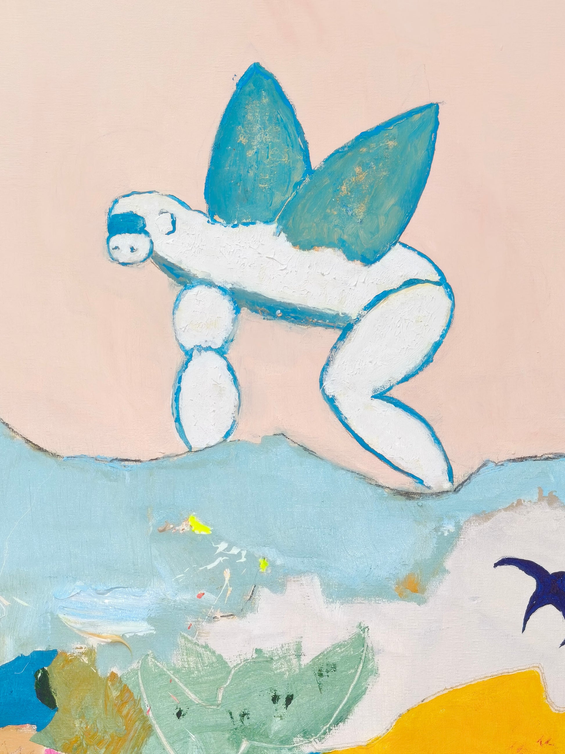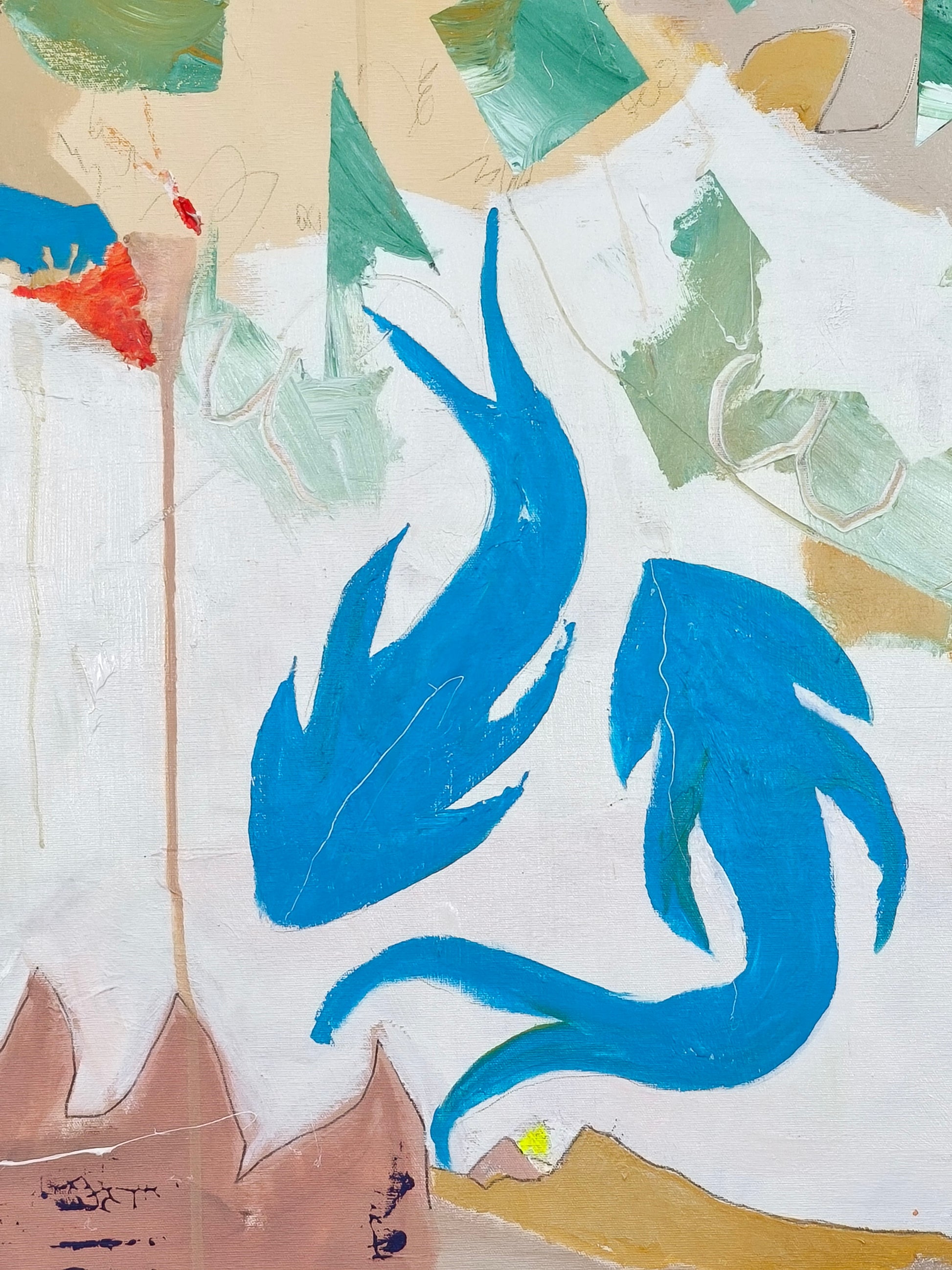 Pintura gestual, intuitiva, que deja que las cosas pasen y se apoya sobre lo que aparece. Aprovechando el accidente y aceptando las consecuencias.