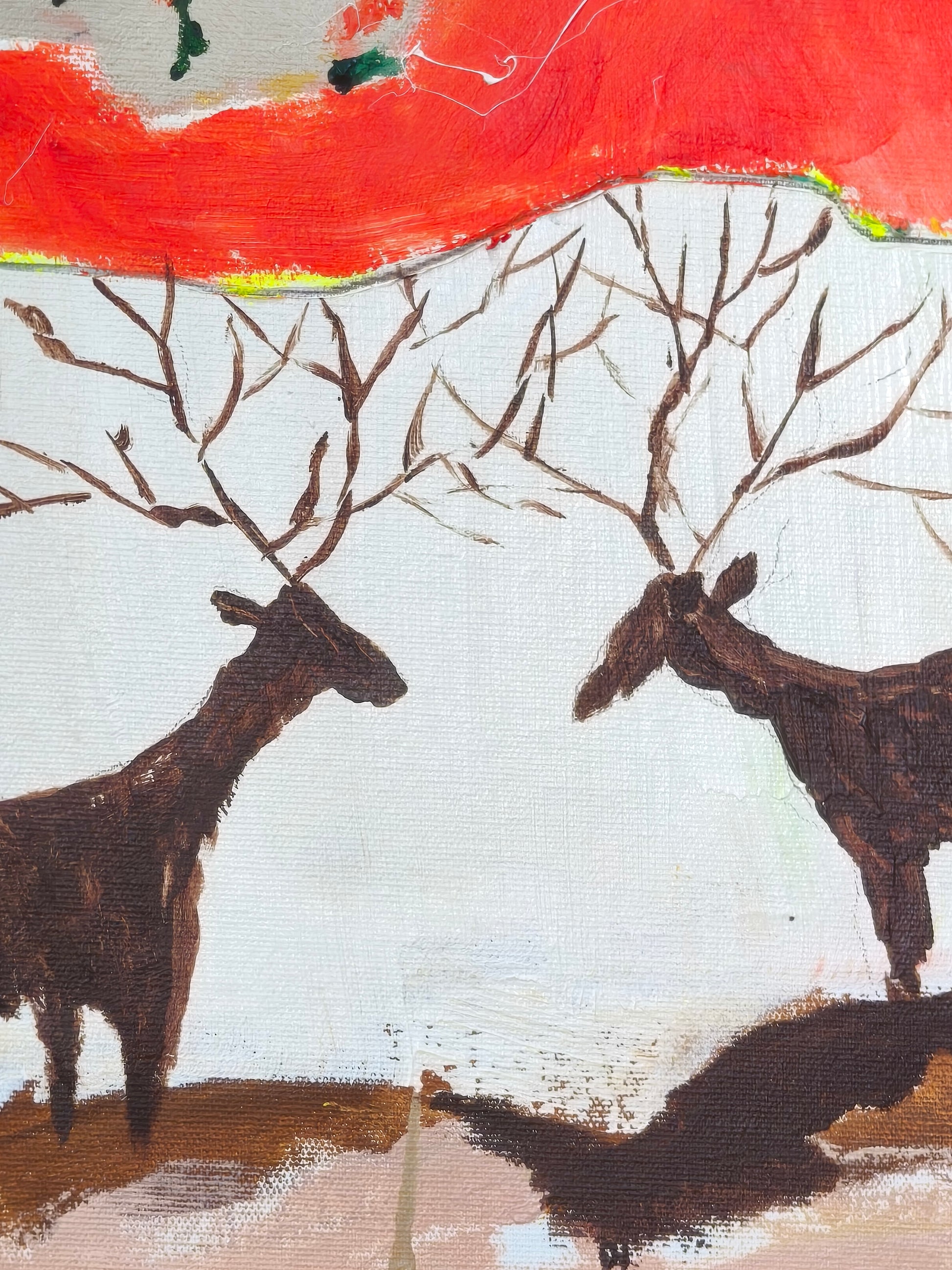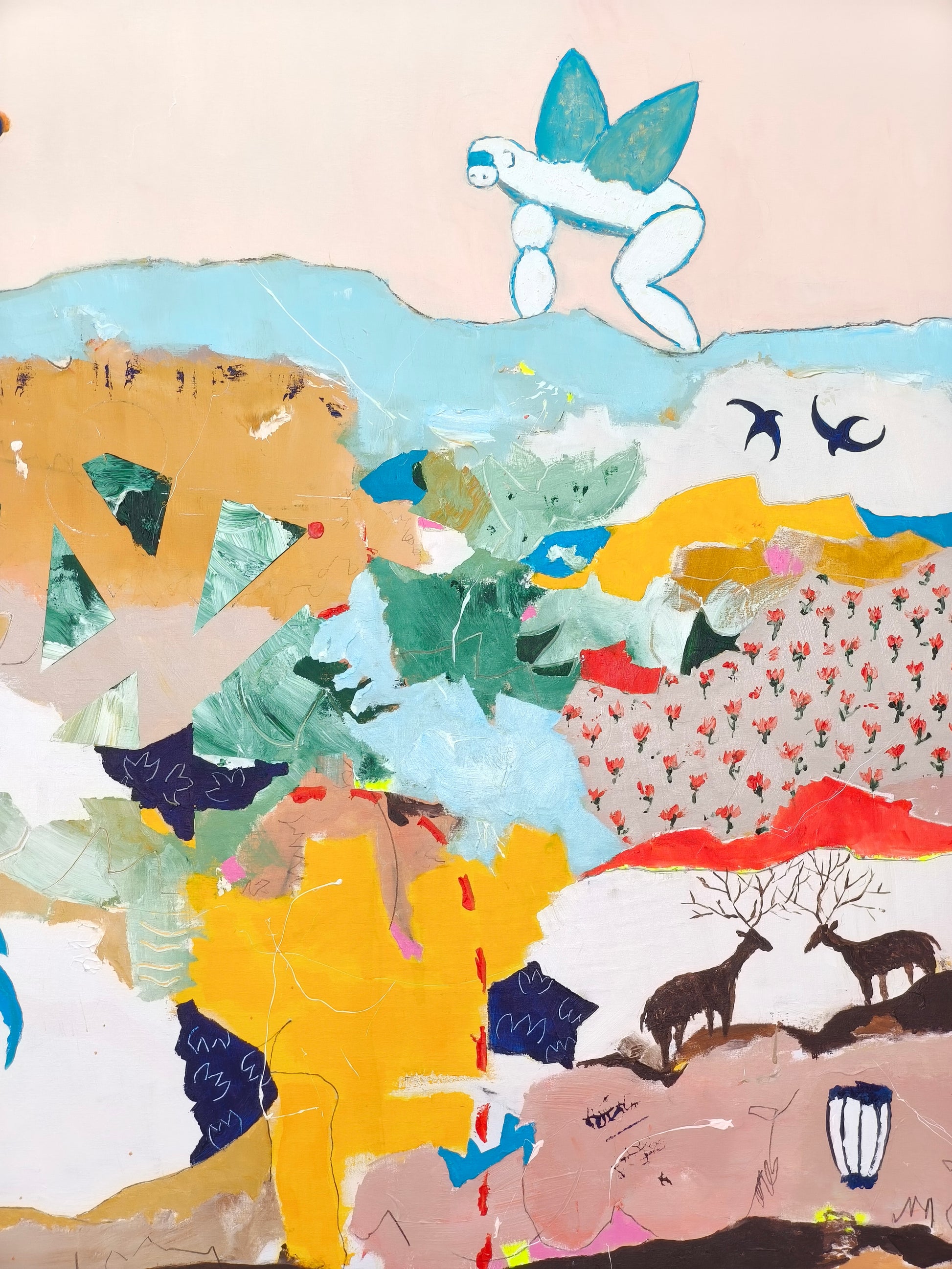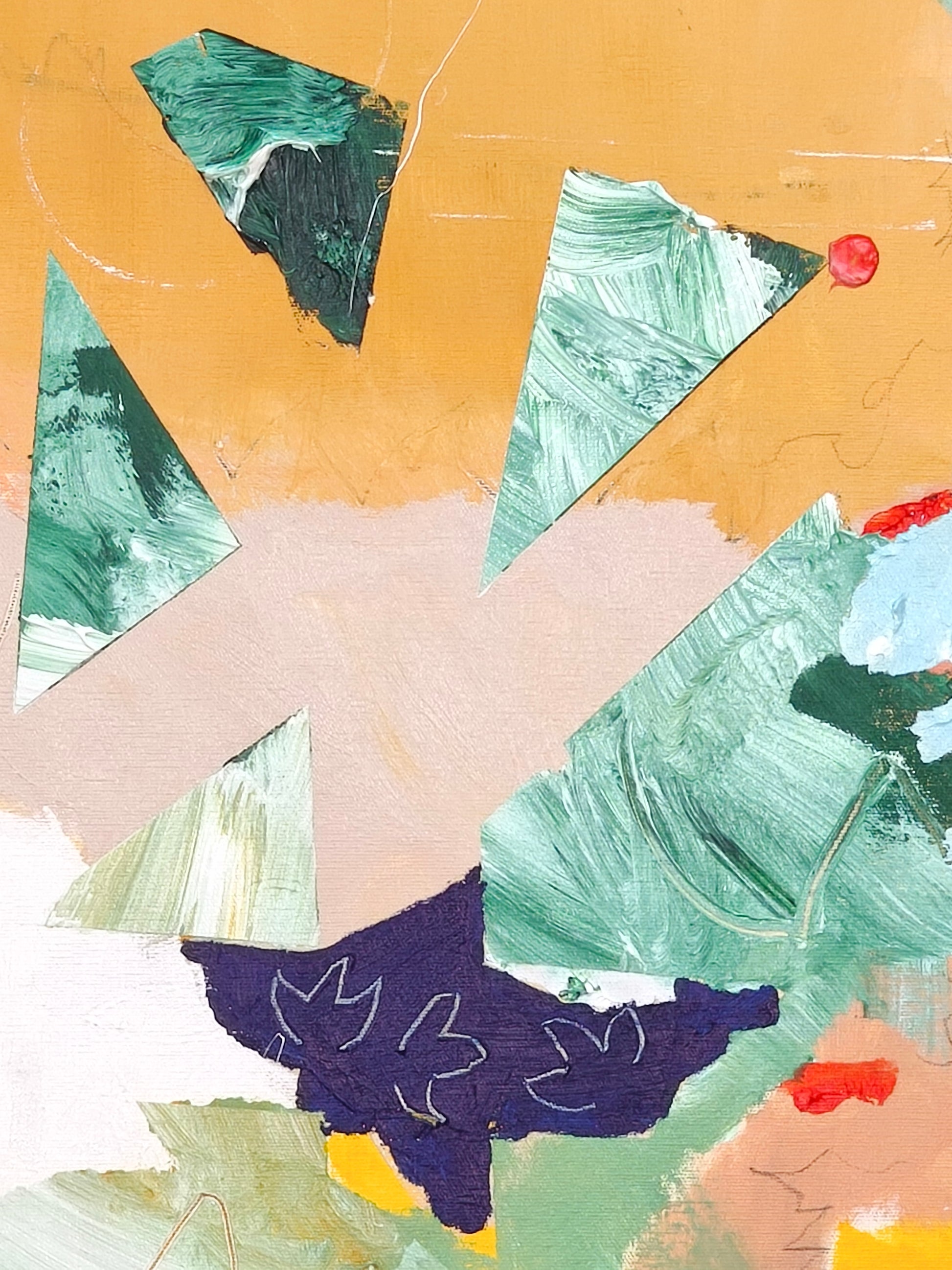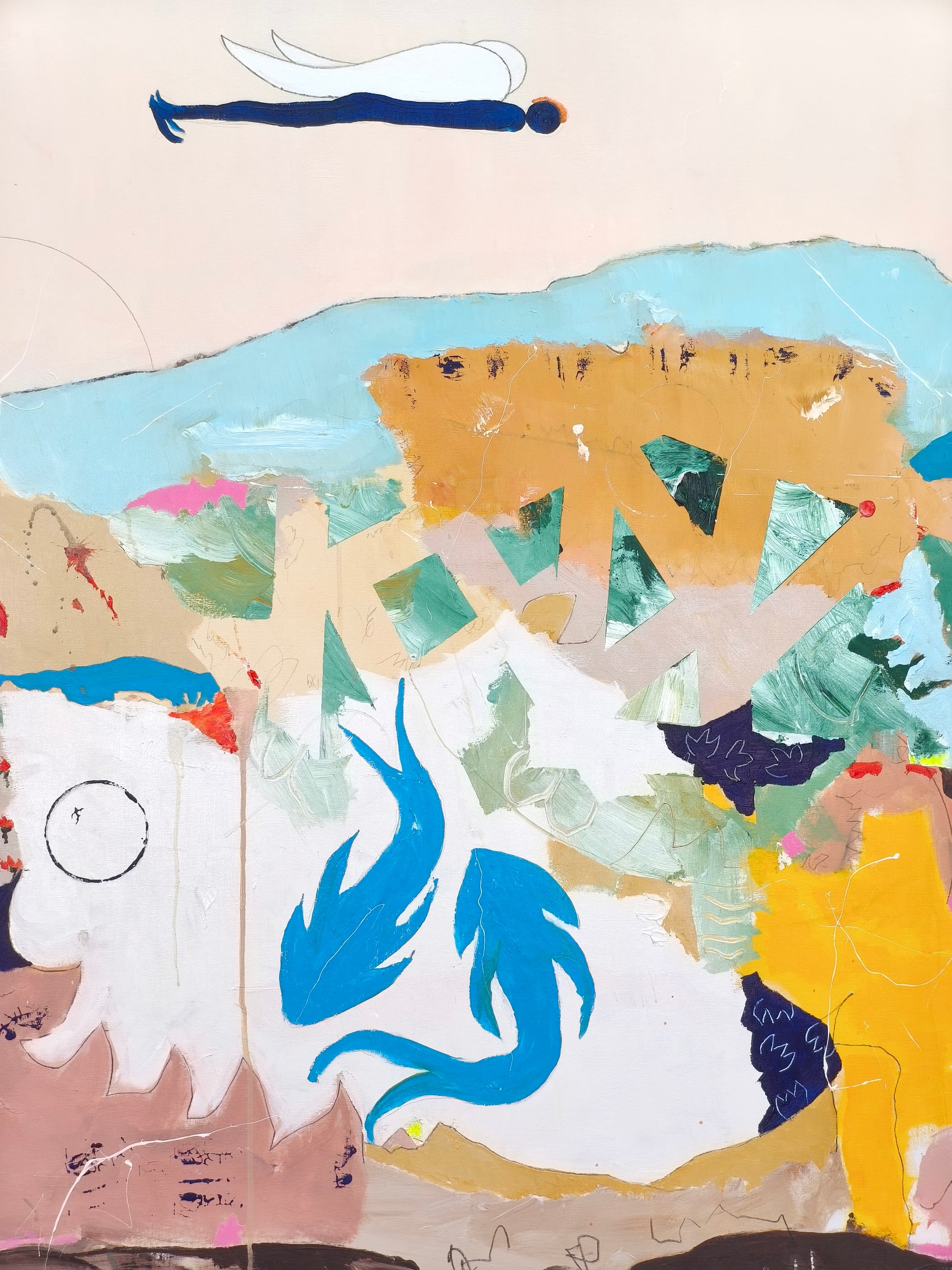 Pintura gestual, intuitiva, que deja que las cosas pasen y se apoya sobre lo que aparece. Aprovechando el accidente y aceptando las consecuencias.