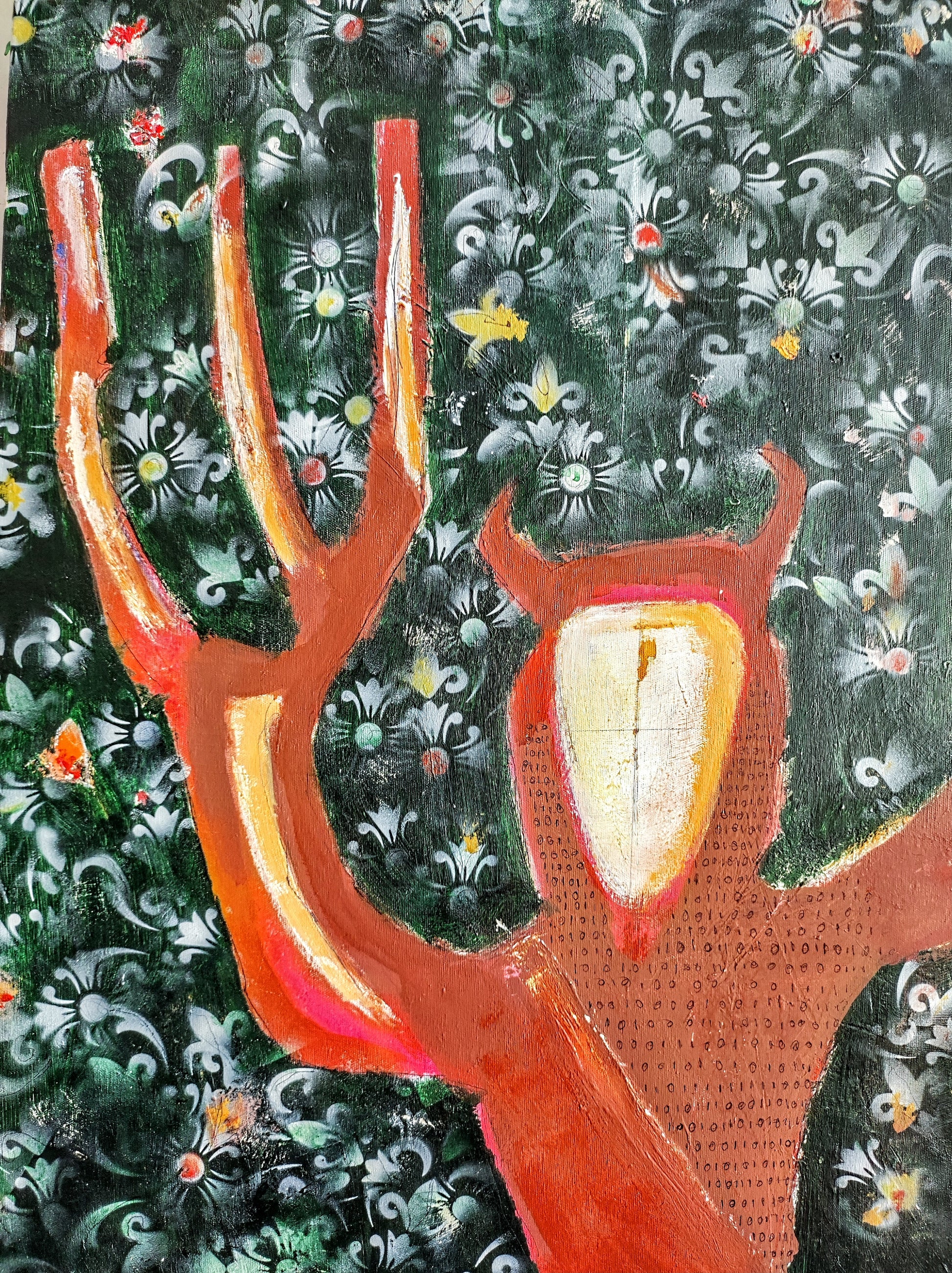 La figura se muestra sobre diferentes planos con motivos de la Naturaleza y una de las capas del cuerpo tiene una trama de código binario.