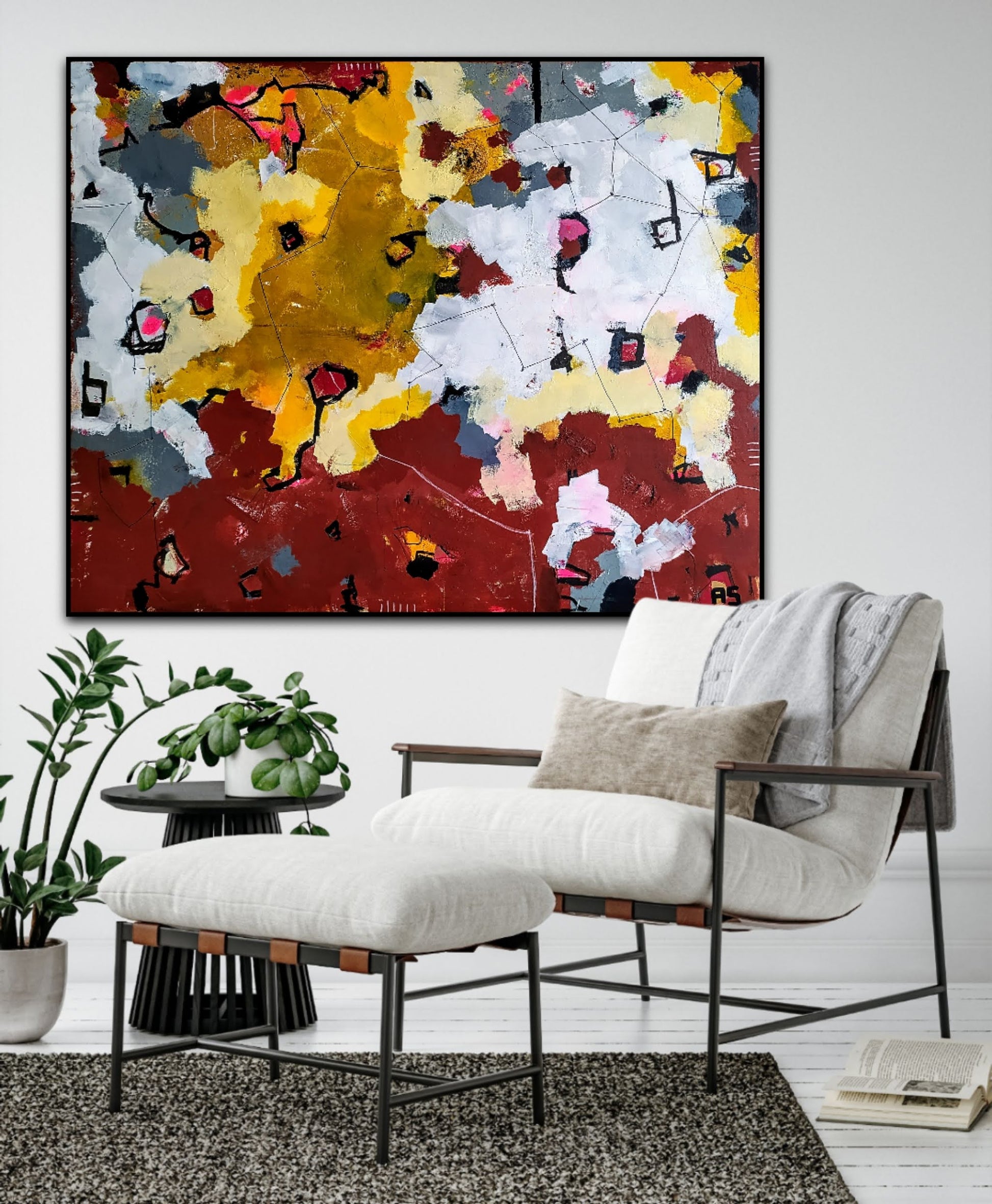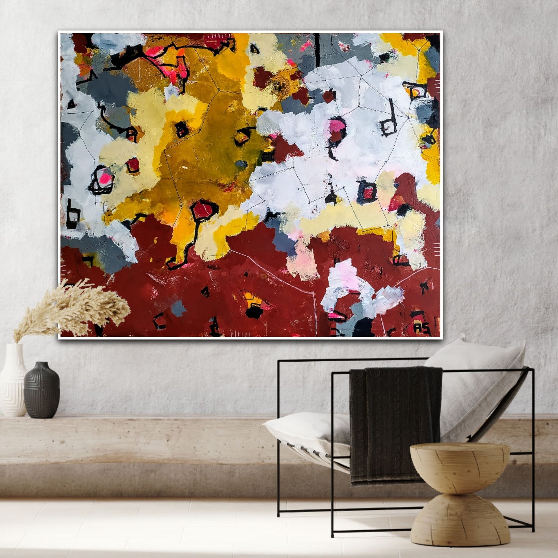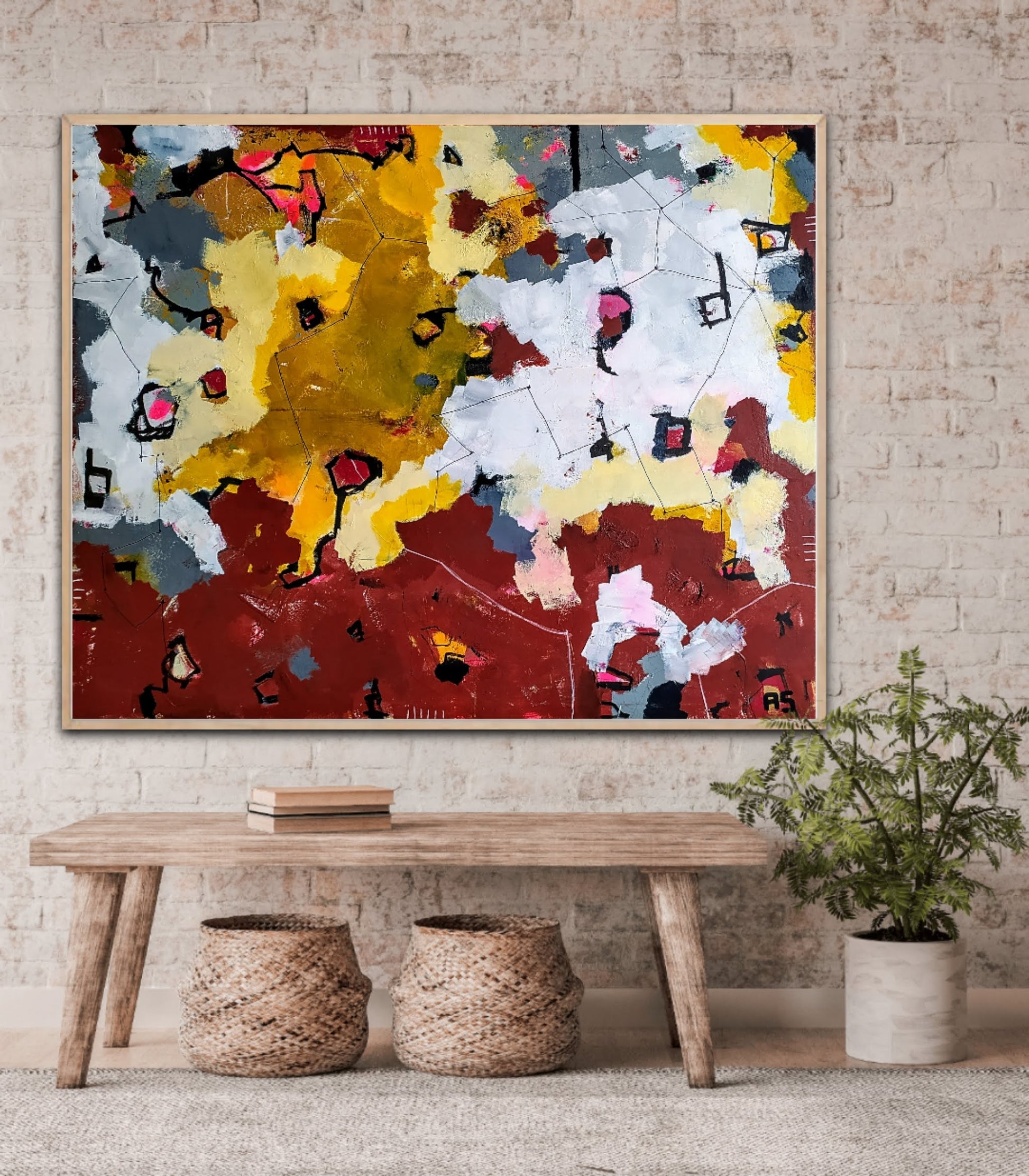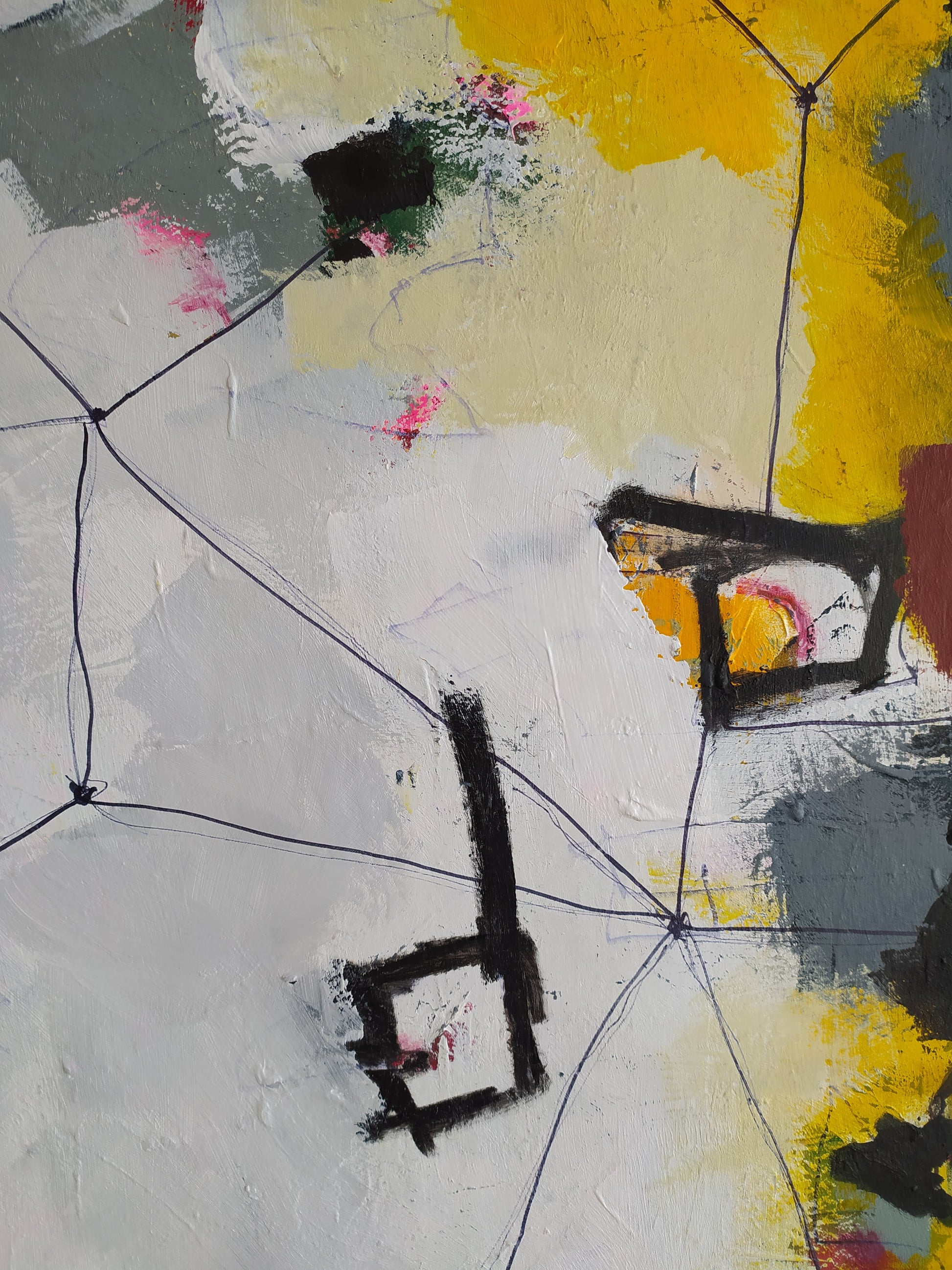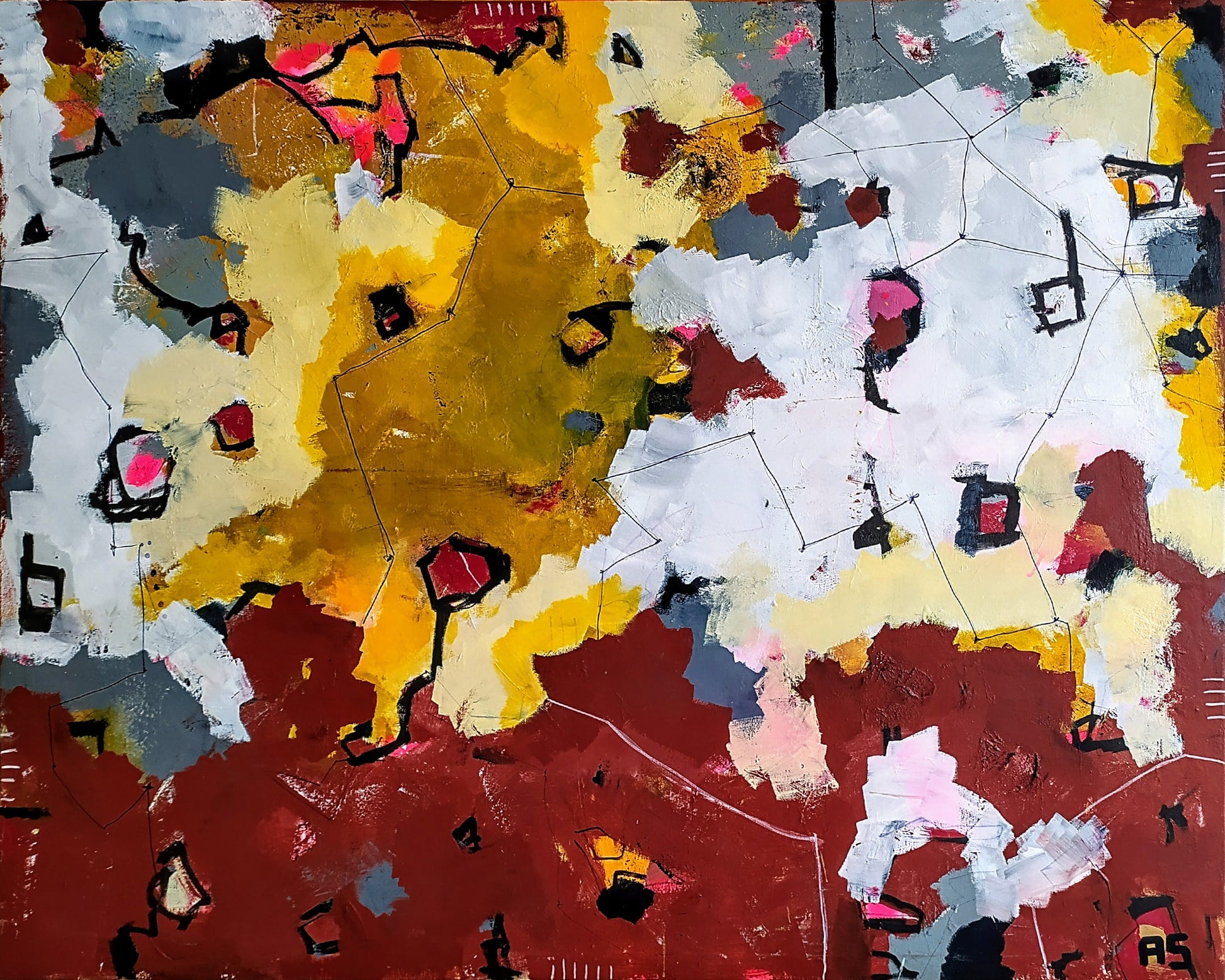 Técnica: mixed media: acrílico, pintura en spray, tintas al alcohol, carboncillo, ceras.