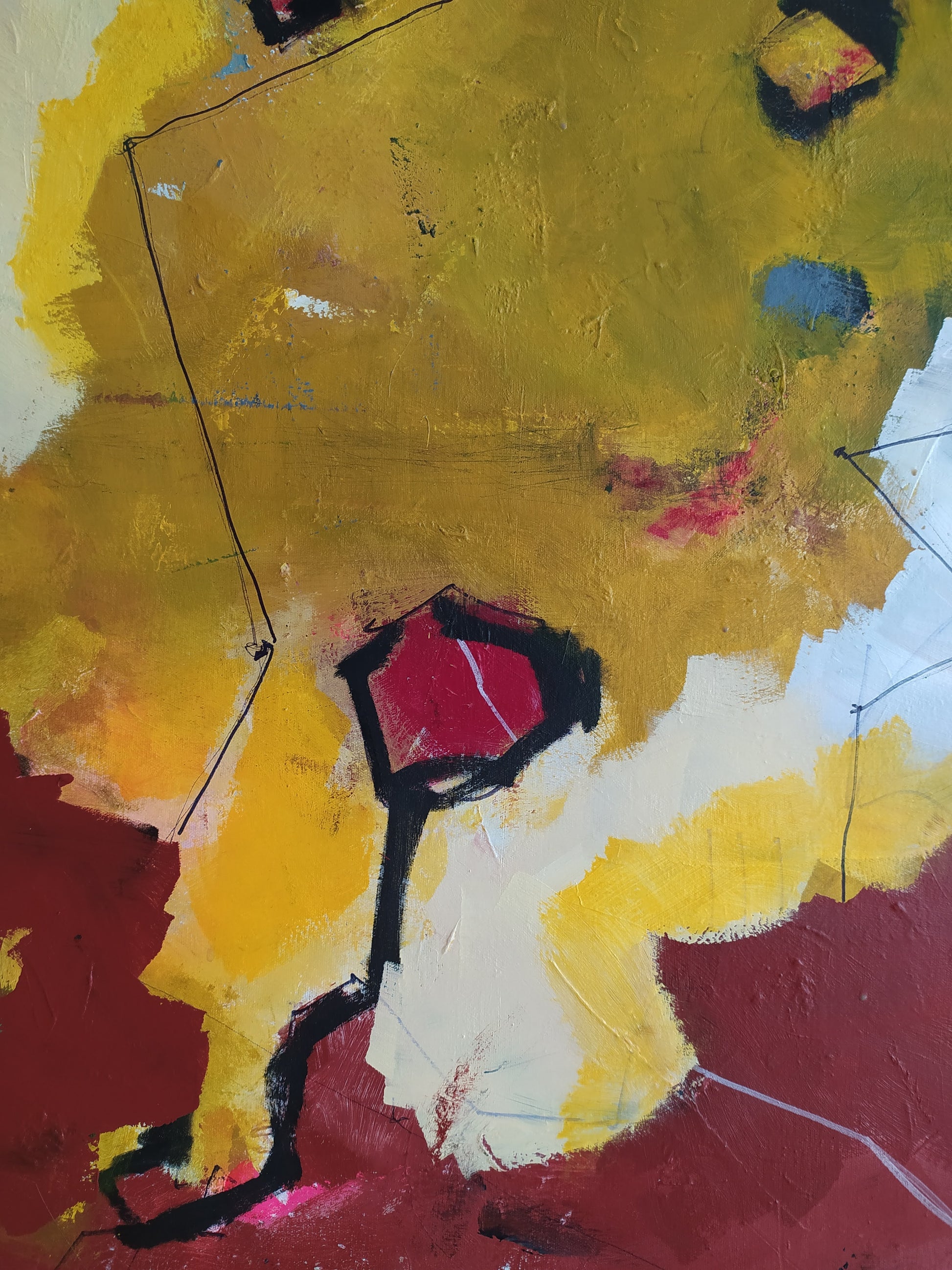 El cuadro tuvo diferentes enfoques durante el proceso creativo, hasta encontrar finalmente una composición donde las manchas y las formas juegan a encontrarse y desencontrarse. Entre lo cotidiano y lo universal, los detalles del día a día y los pensamientos sobre el sentido de la vida, al igual que en los poemas de Luís García Montero, todo se mezcla y se intuye.