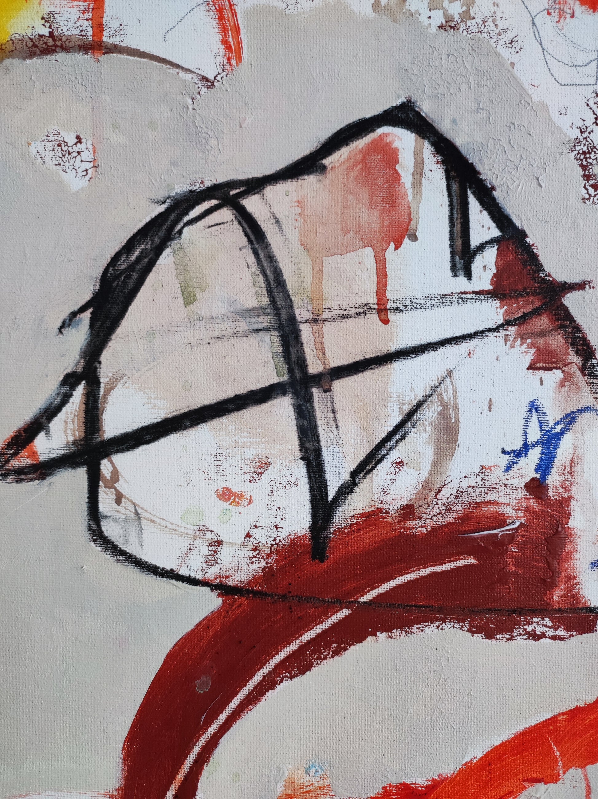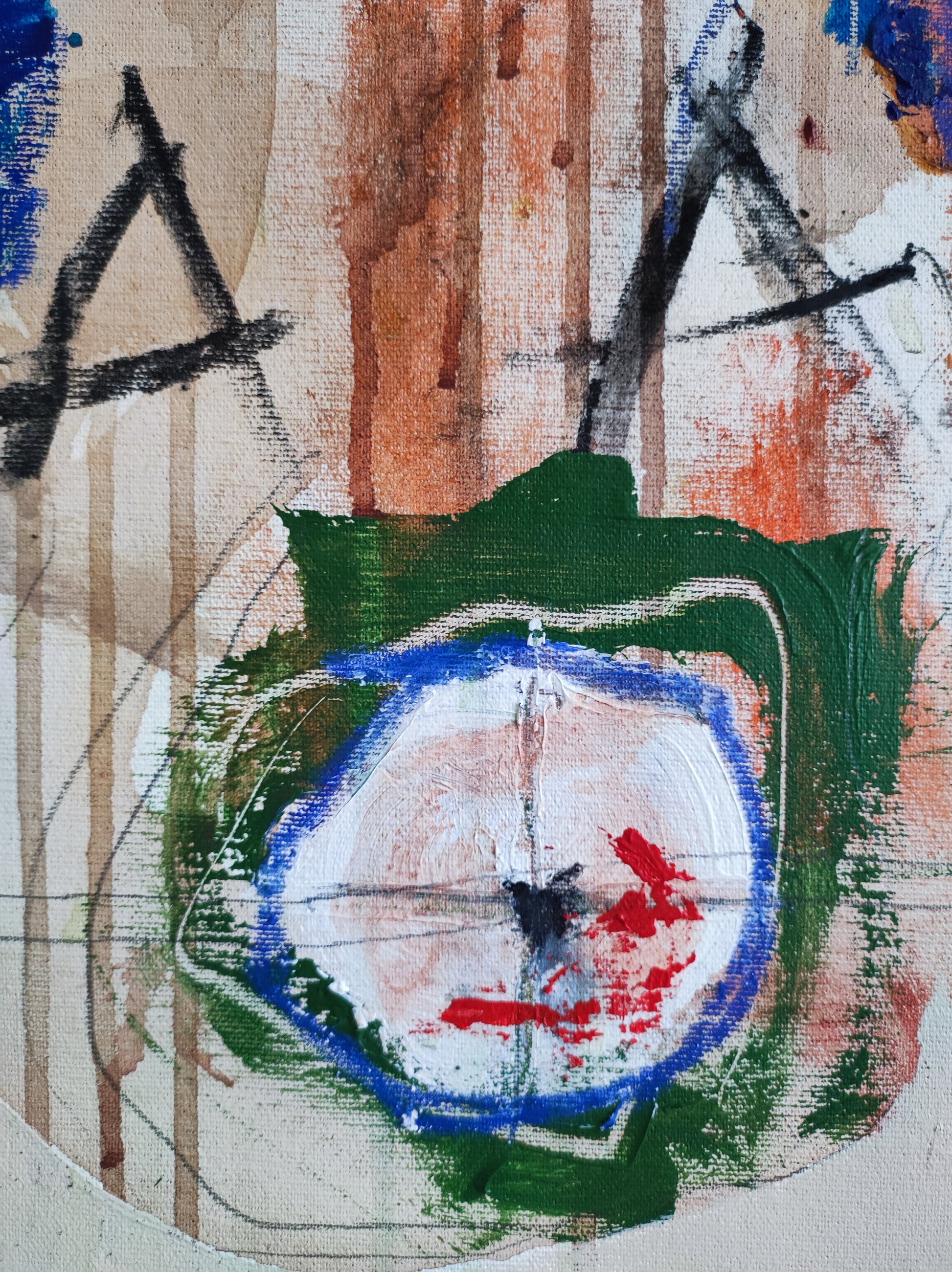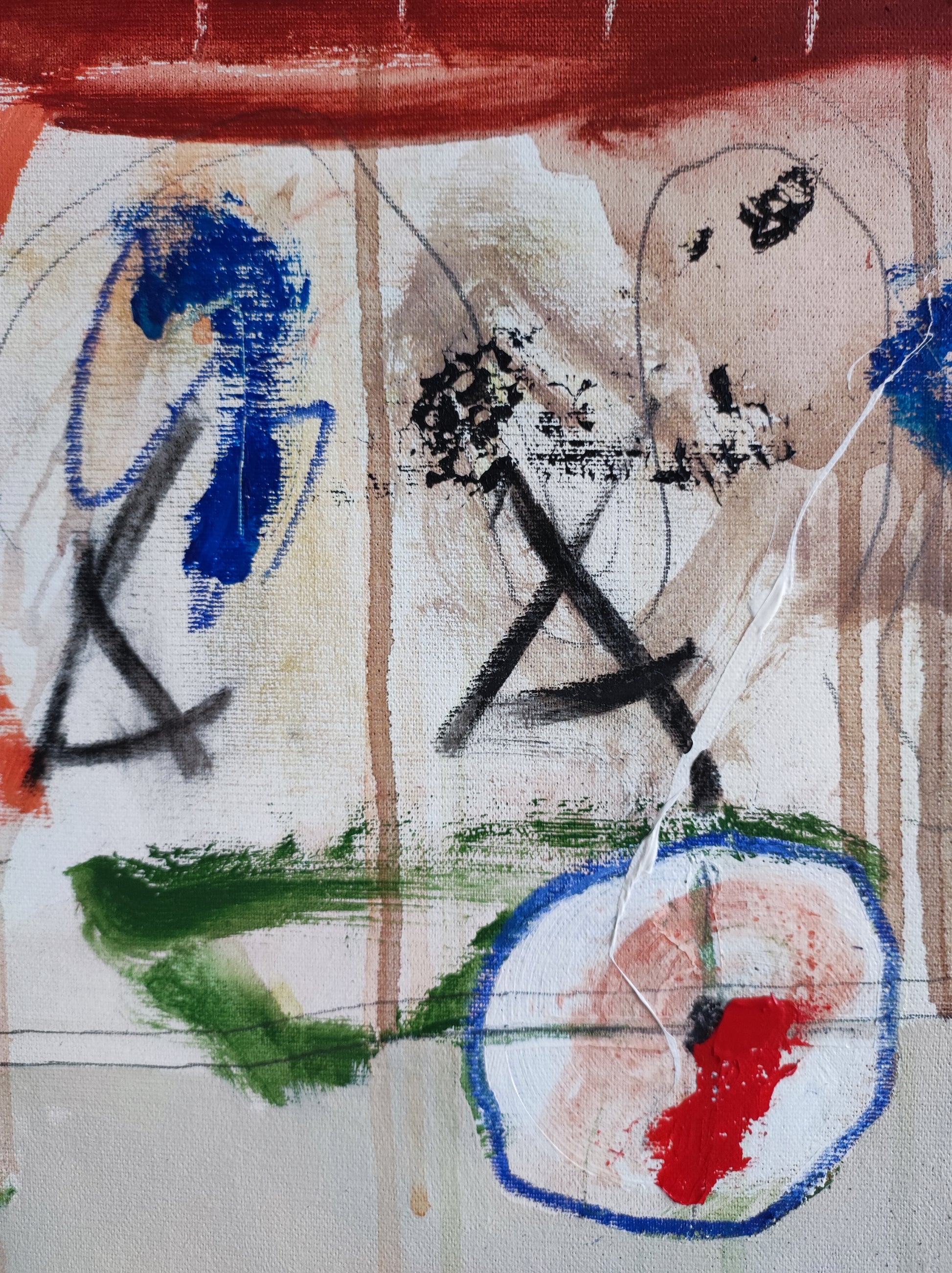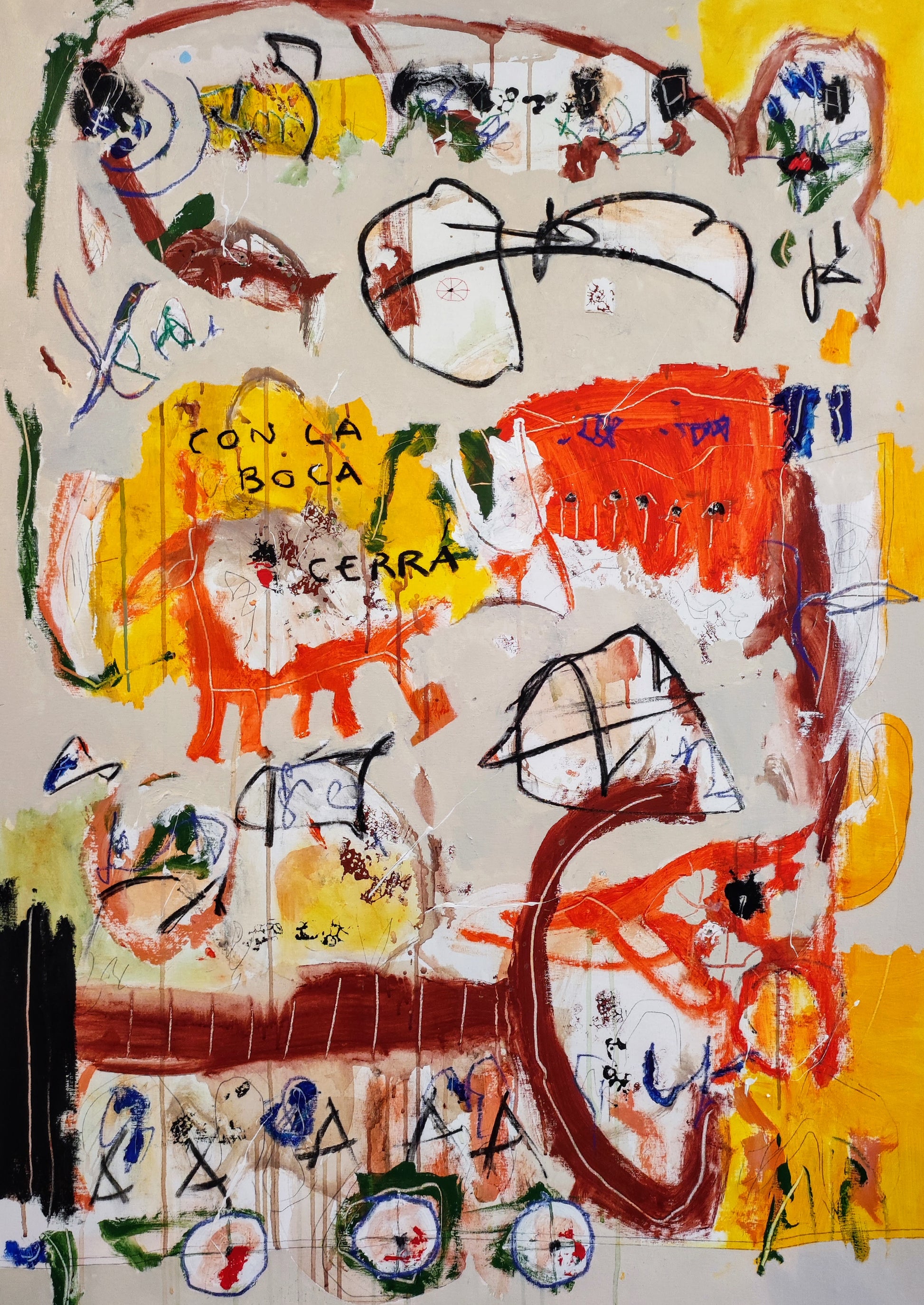 Técnica: acrílico, pigmentos, ceras, carboncillo y lápiz.