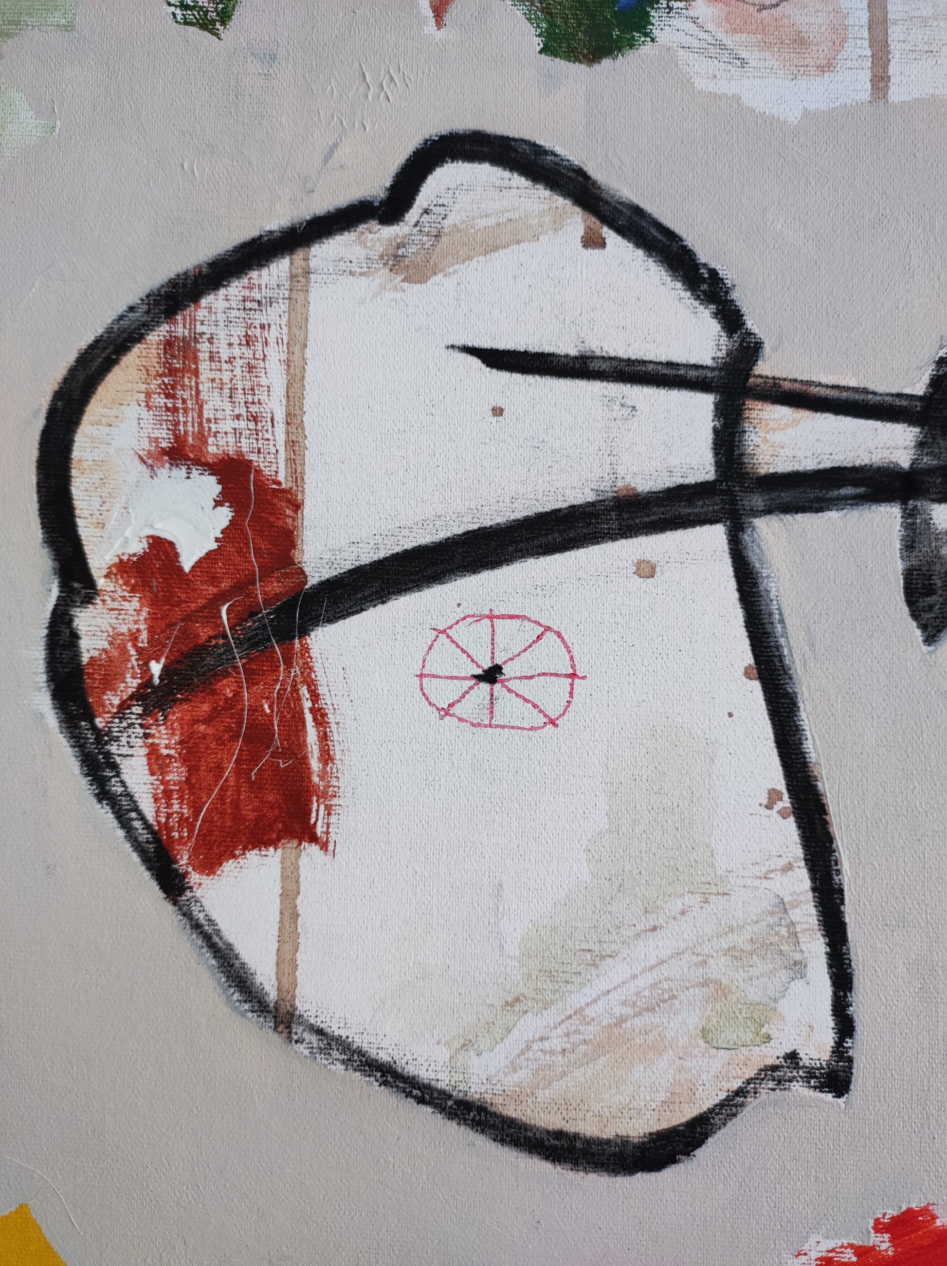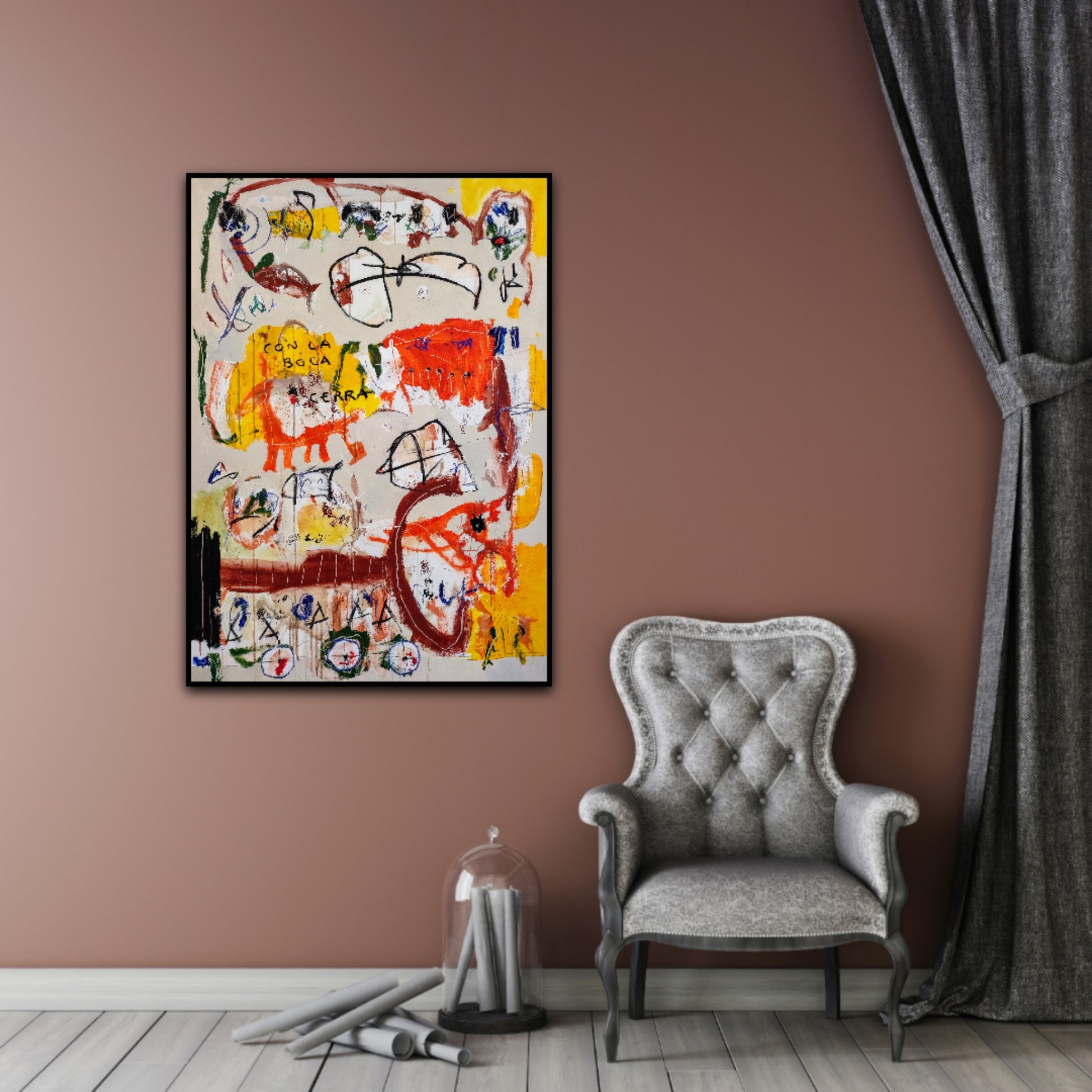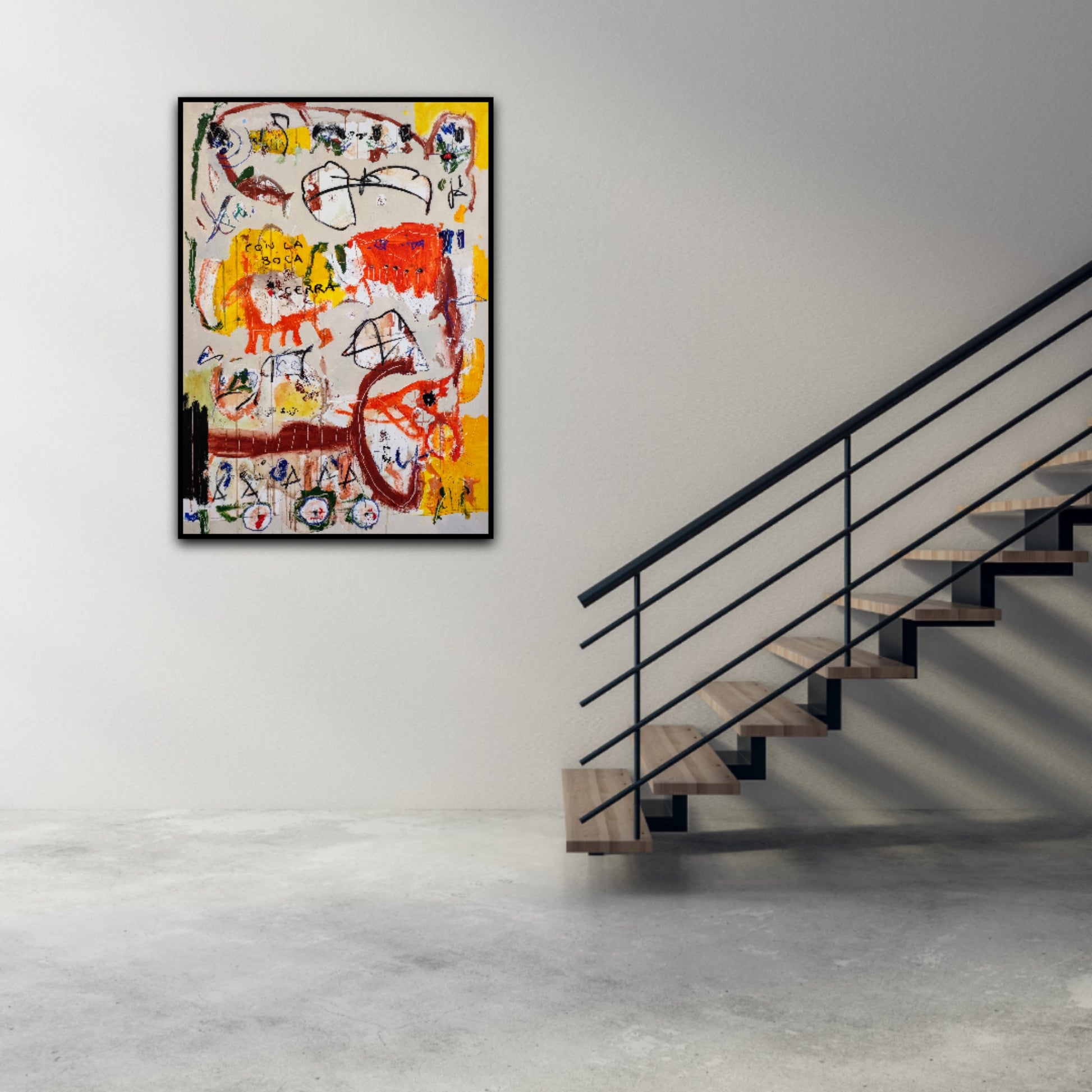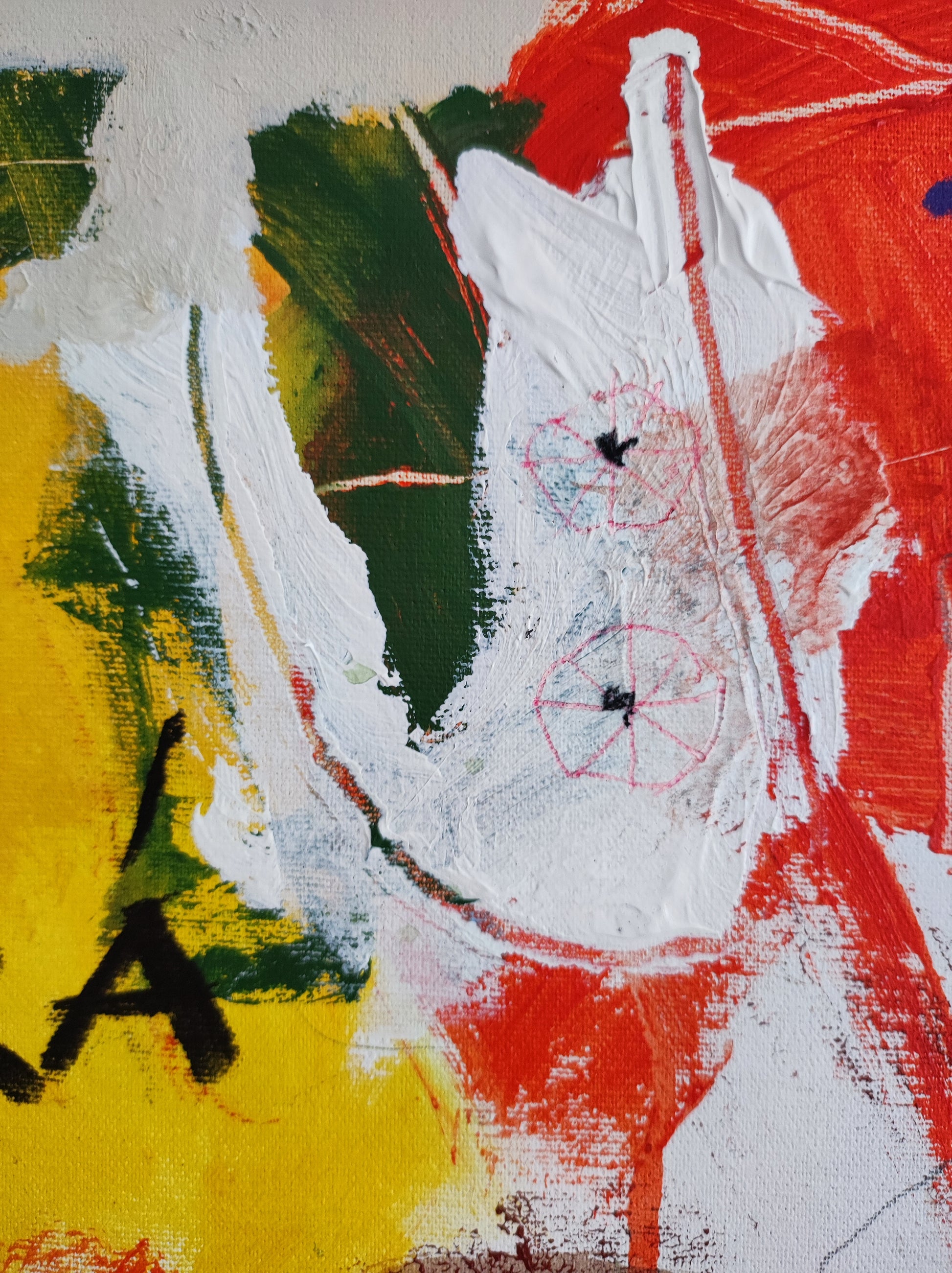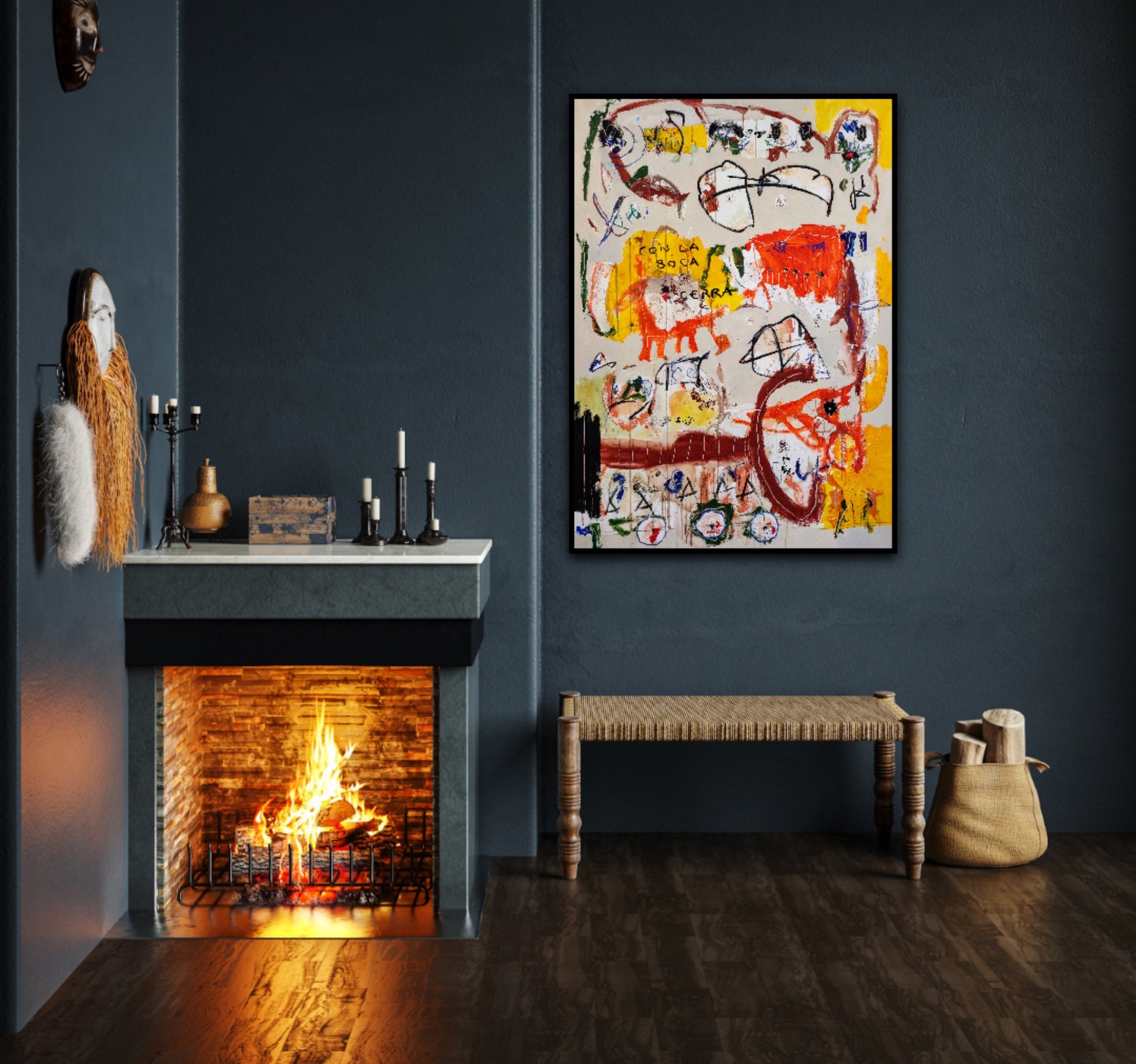 Técnica: acrílico, pigmentos, ceras, carboncillo y lápiz.