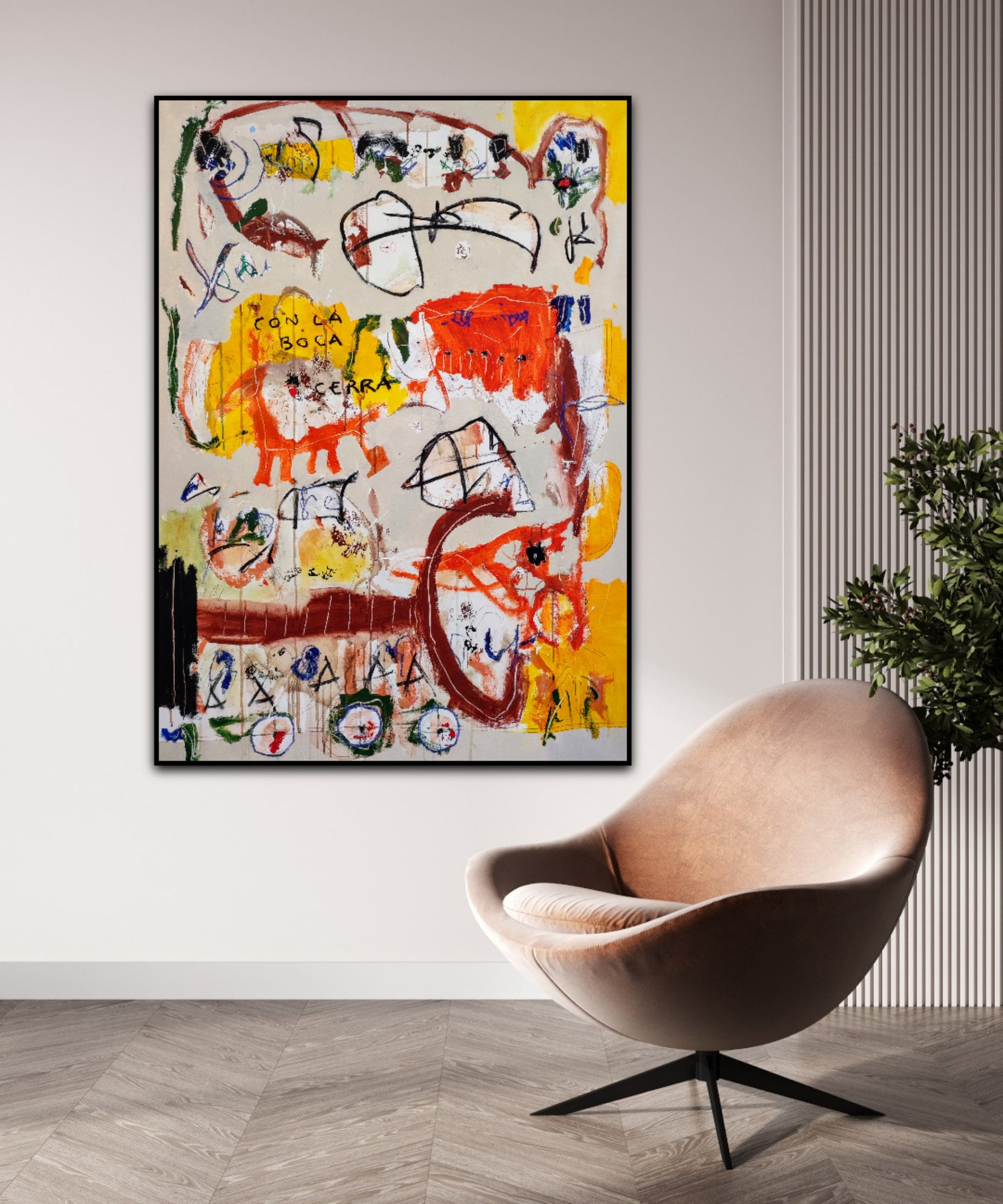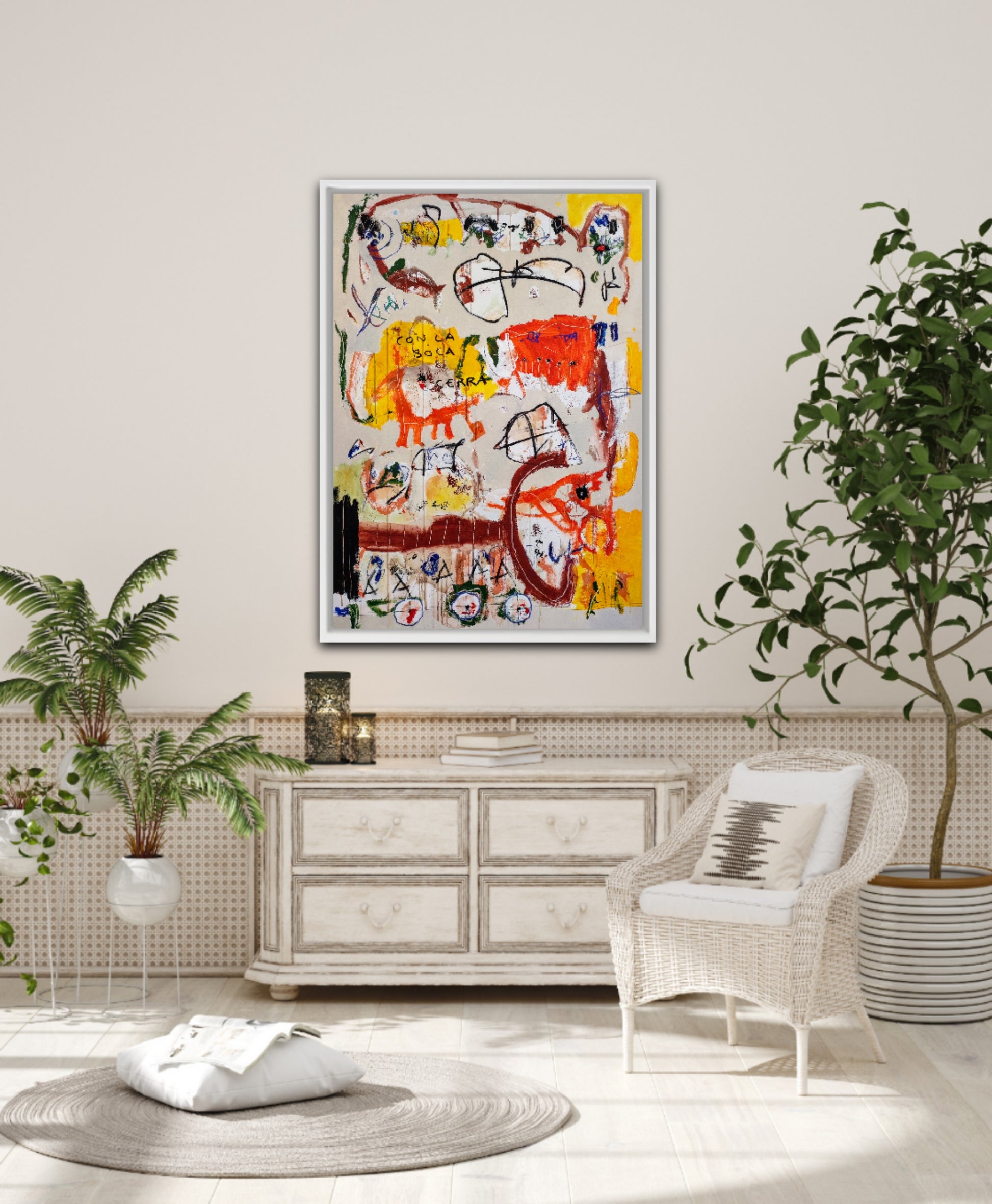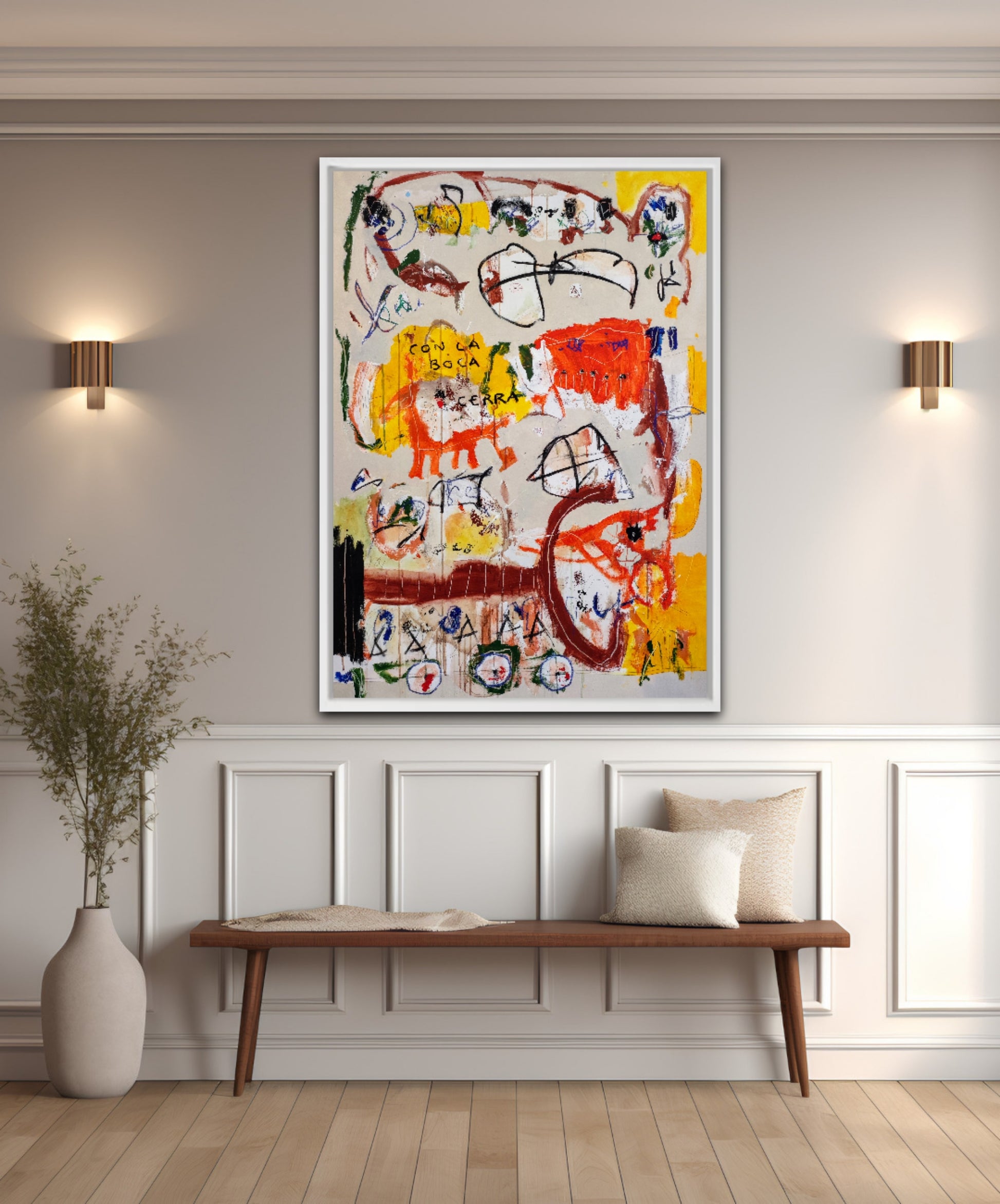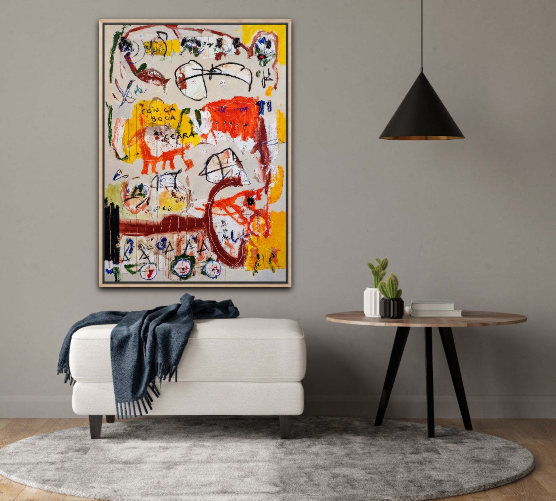 Técnica: acrílico, pigmentos, ceras, carboncillo y lápiz.