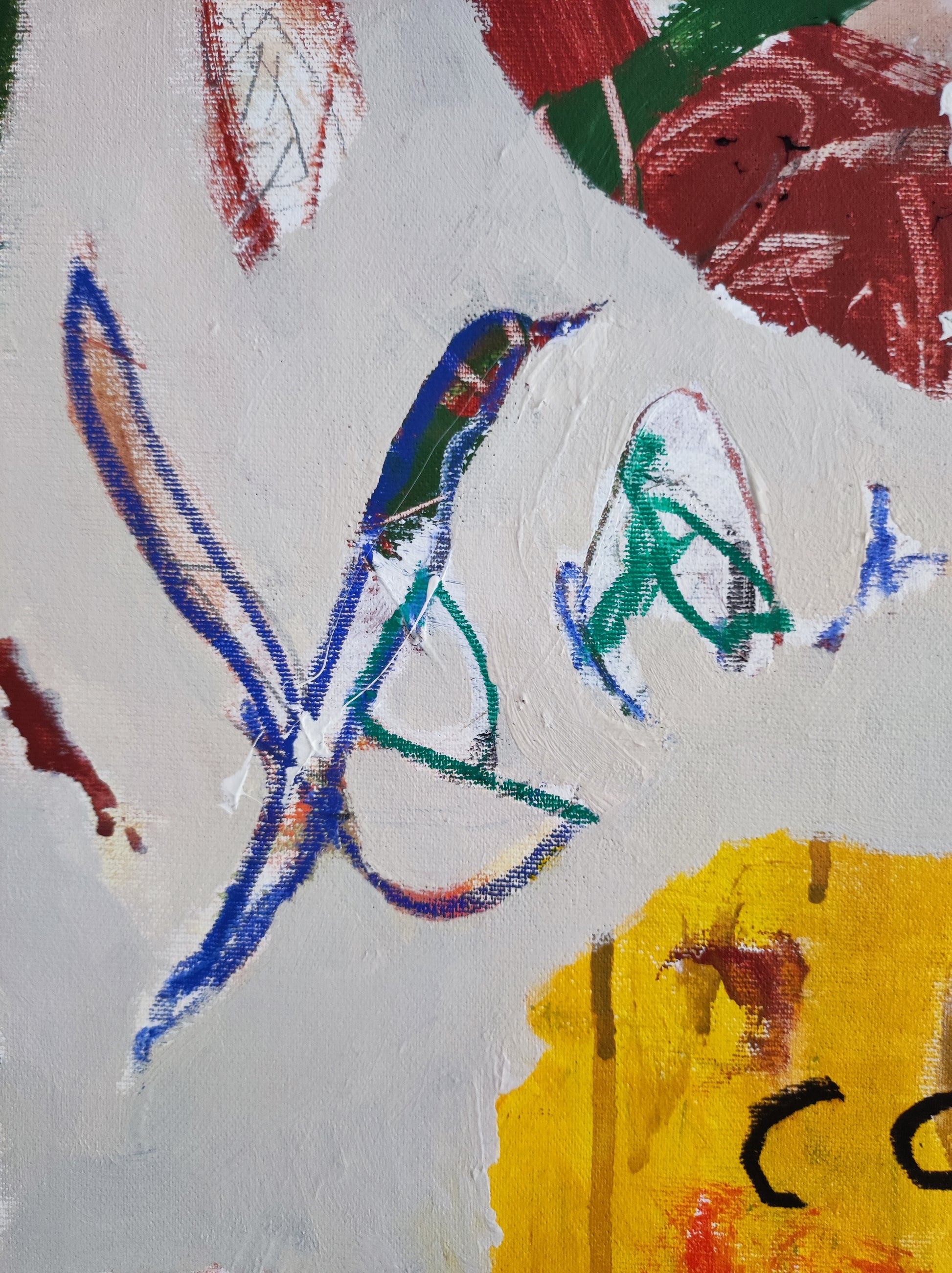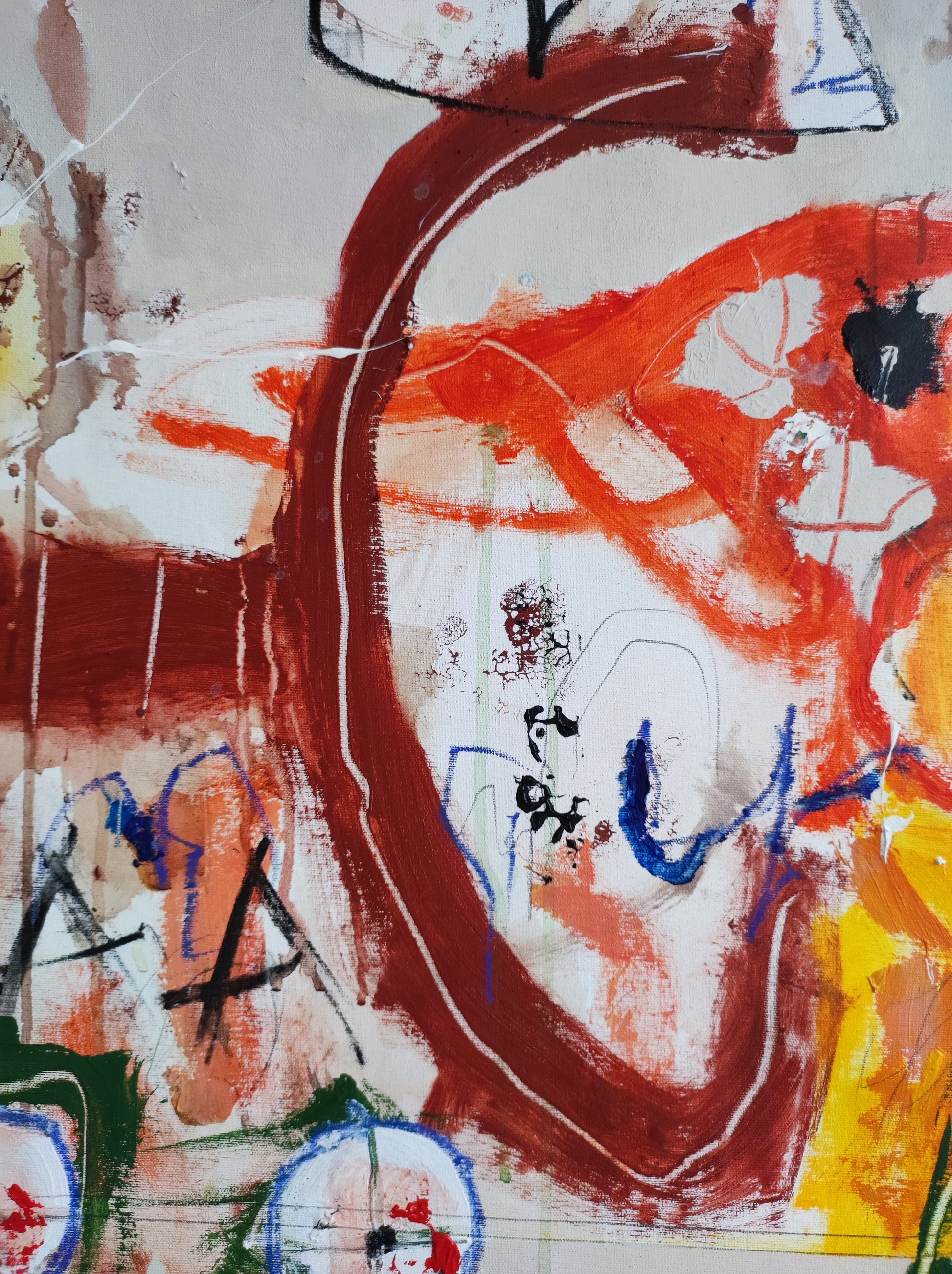 Pintura gestual, intuitiva, que deja que las cosas pasen y se apoya sobre lo que aparece. Aprovechando el accidente y aceptando las consecuencias.