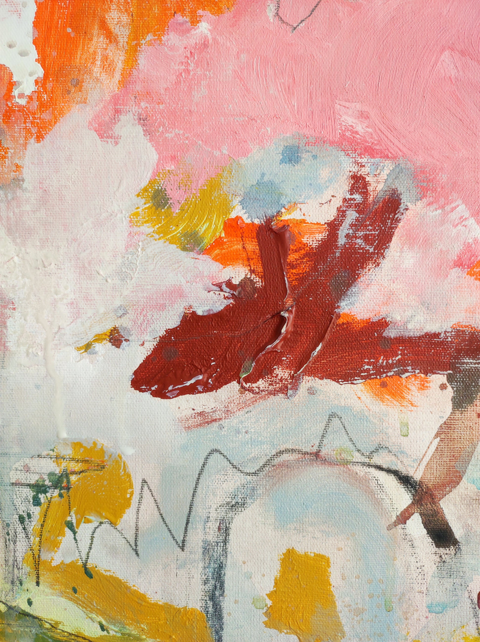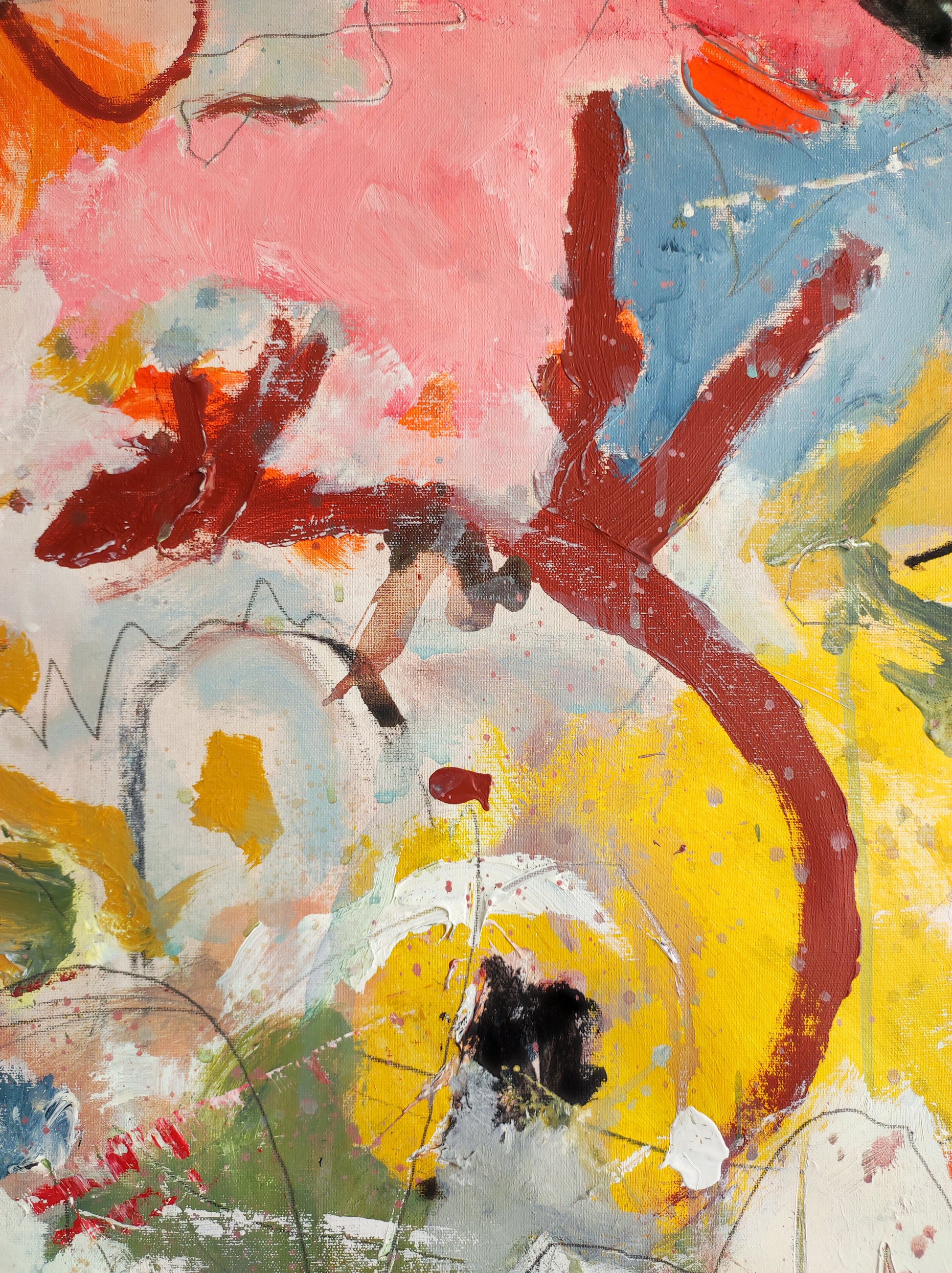 Pintura gestual, intuitiva, que deja que las cosas pasen. Aprovechando el accidente y aceptando las consecuencias.