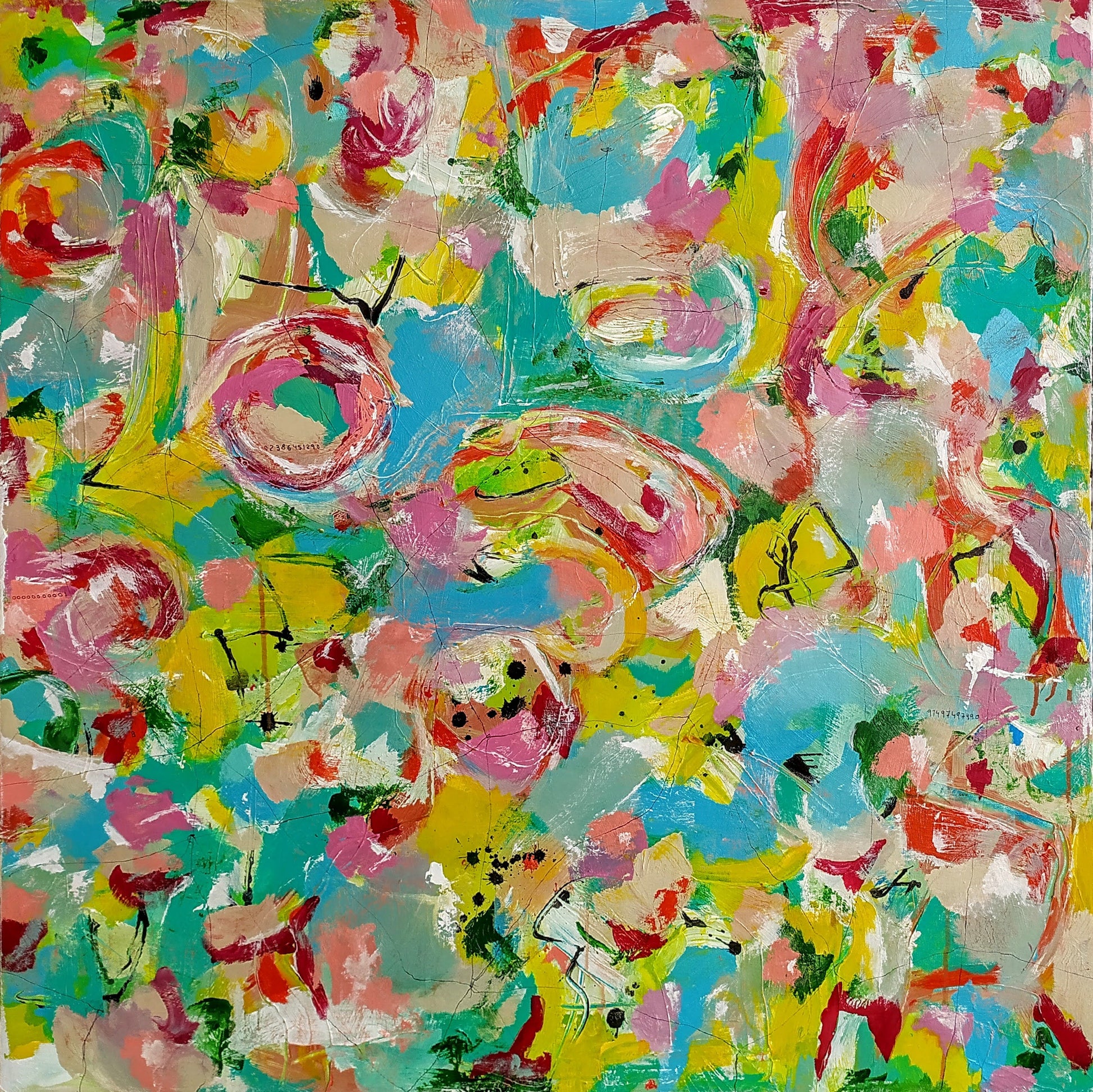 Finalmente en el cuadro predominan azules y rosas con marcas que denotan movimientos de danza.