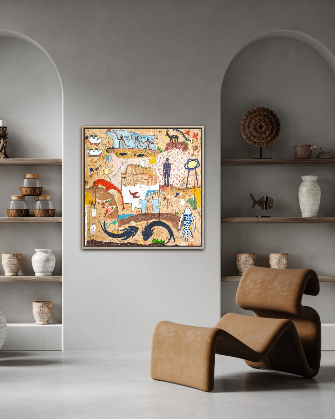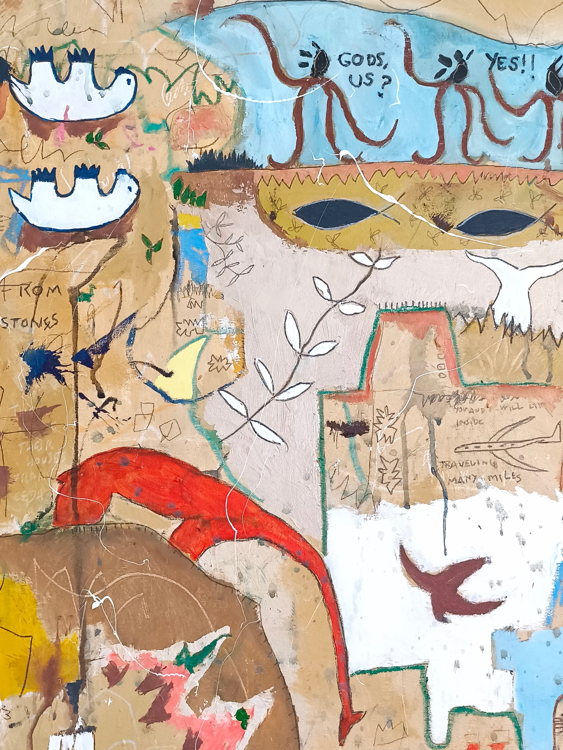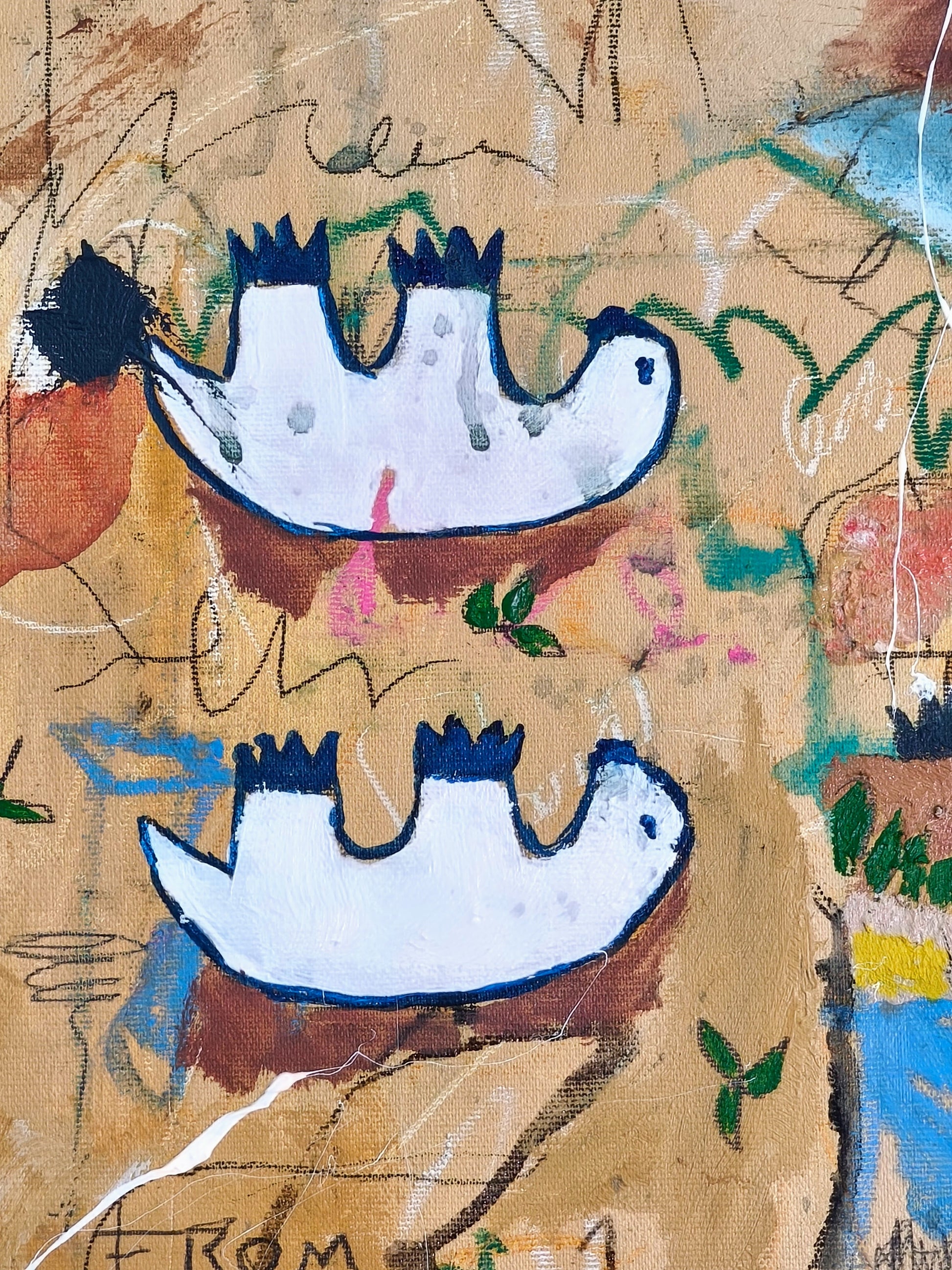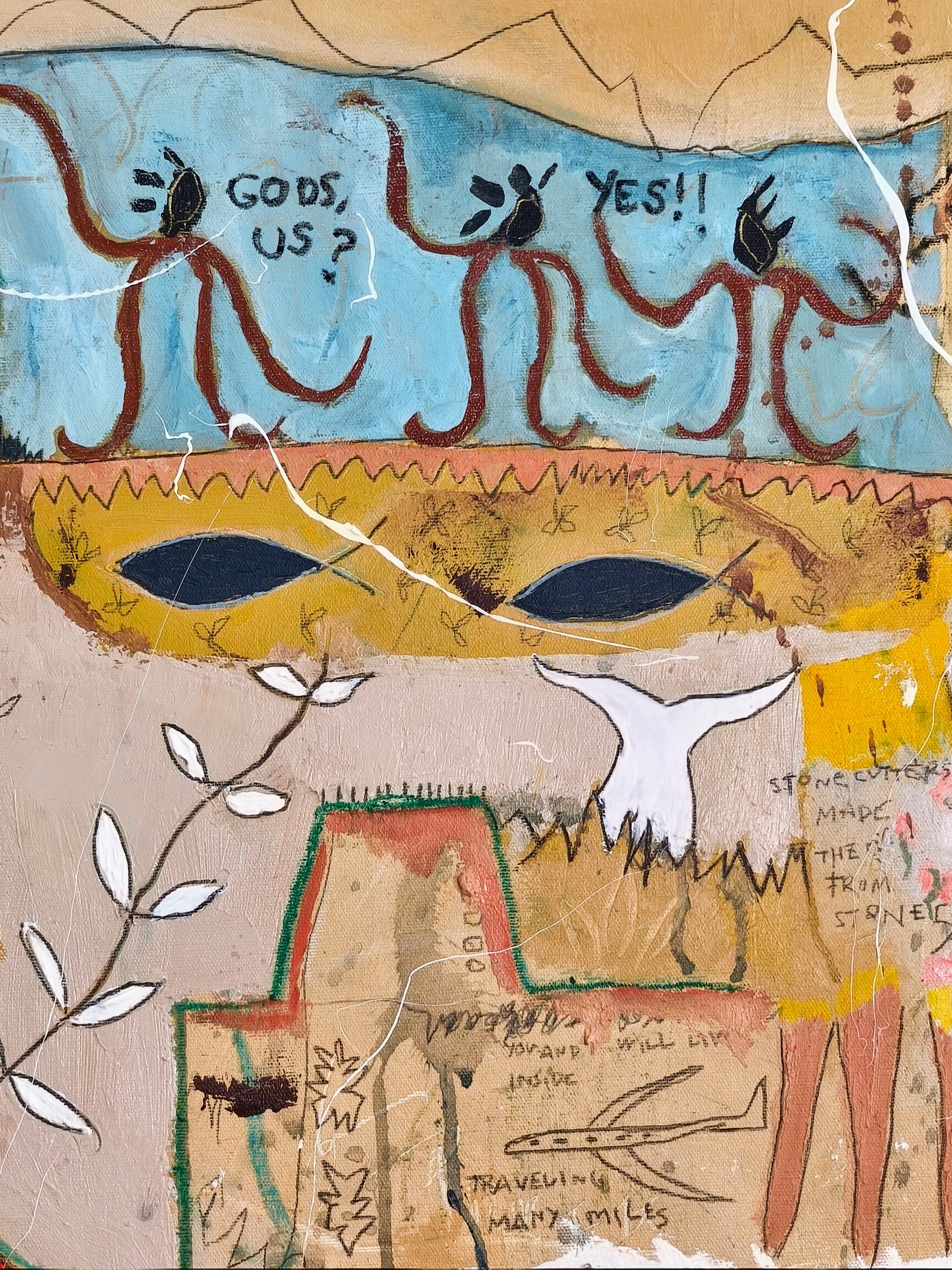 Técnica: acrílico, pigmentos, lápiz, carboncillo, gesso, ceras.