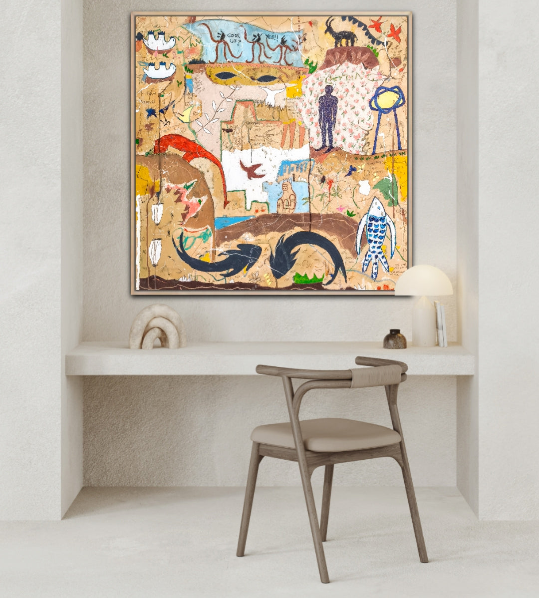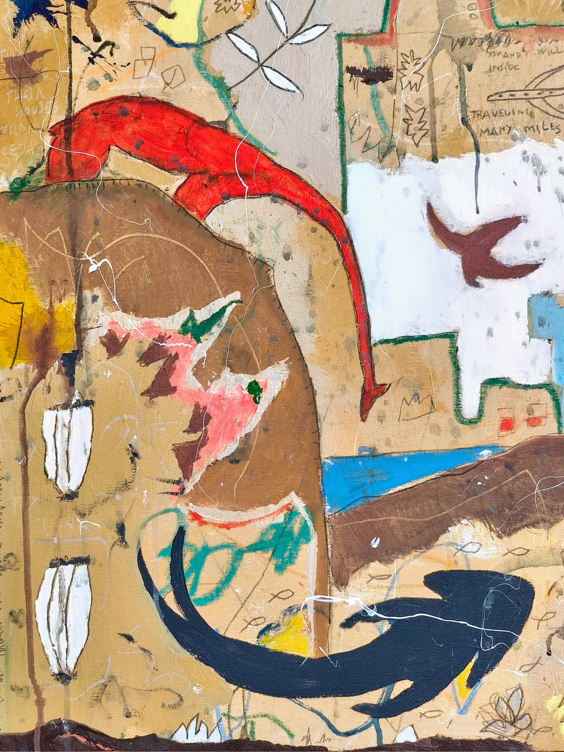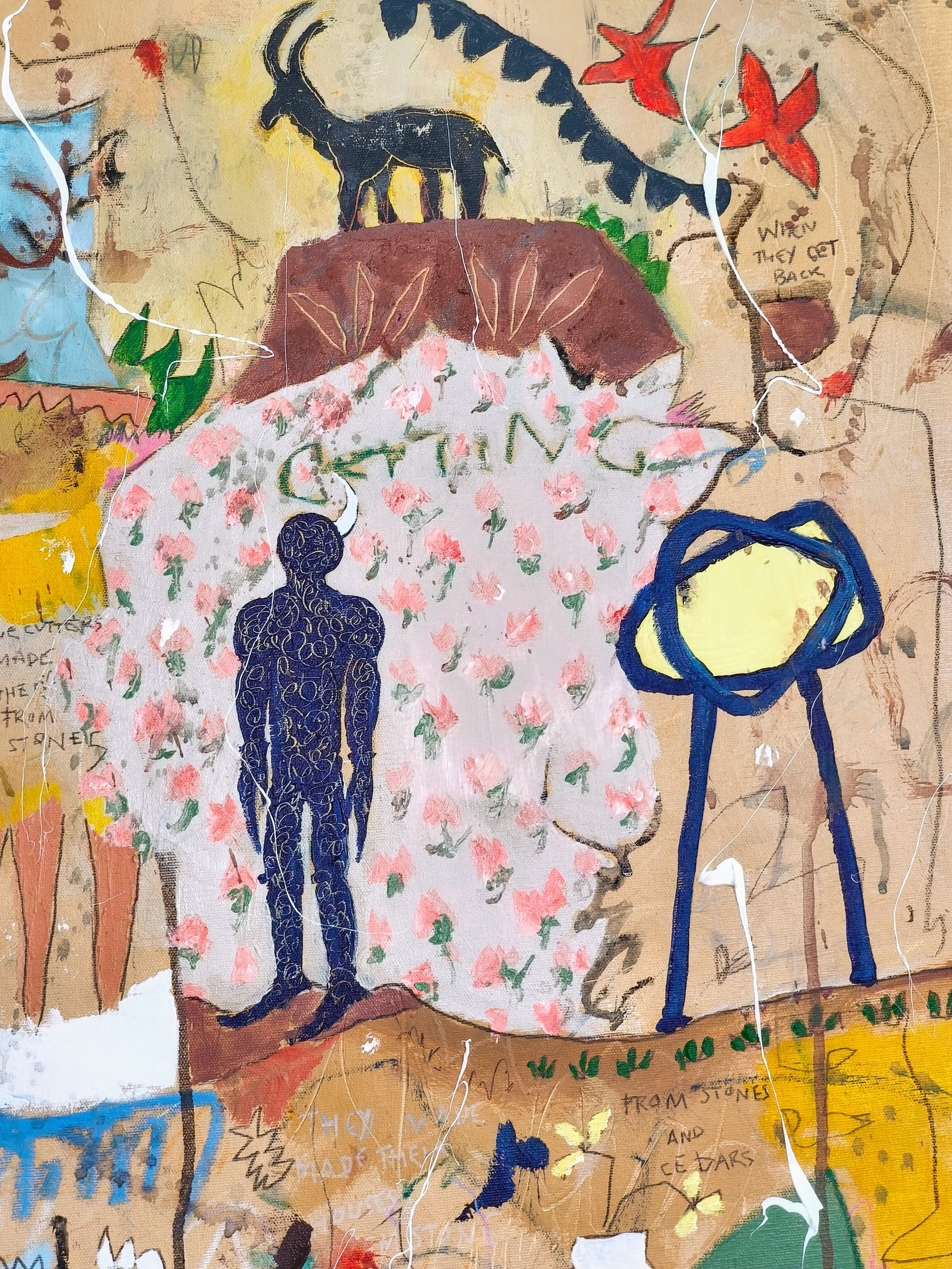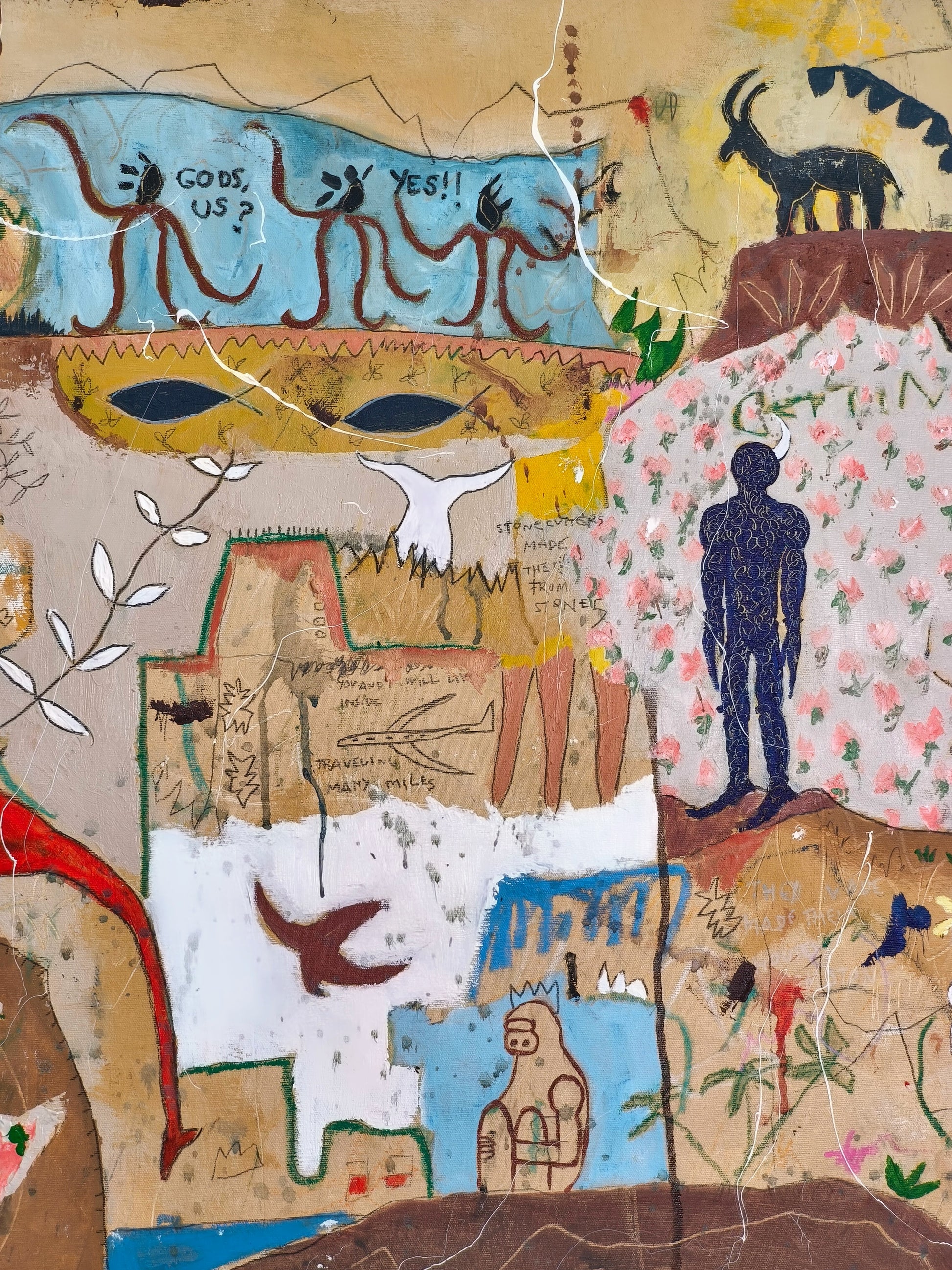 Técnica: acrílico, pigmentos, lápiz, carboncillo, gesso, ceras.