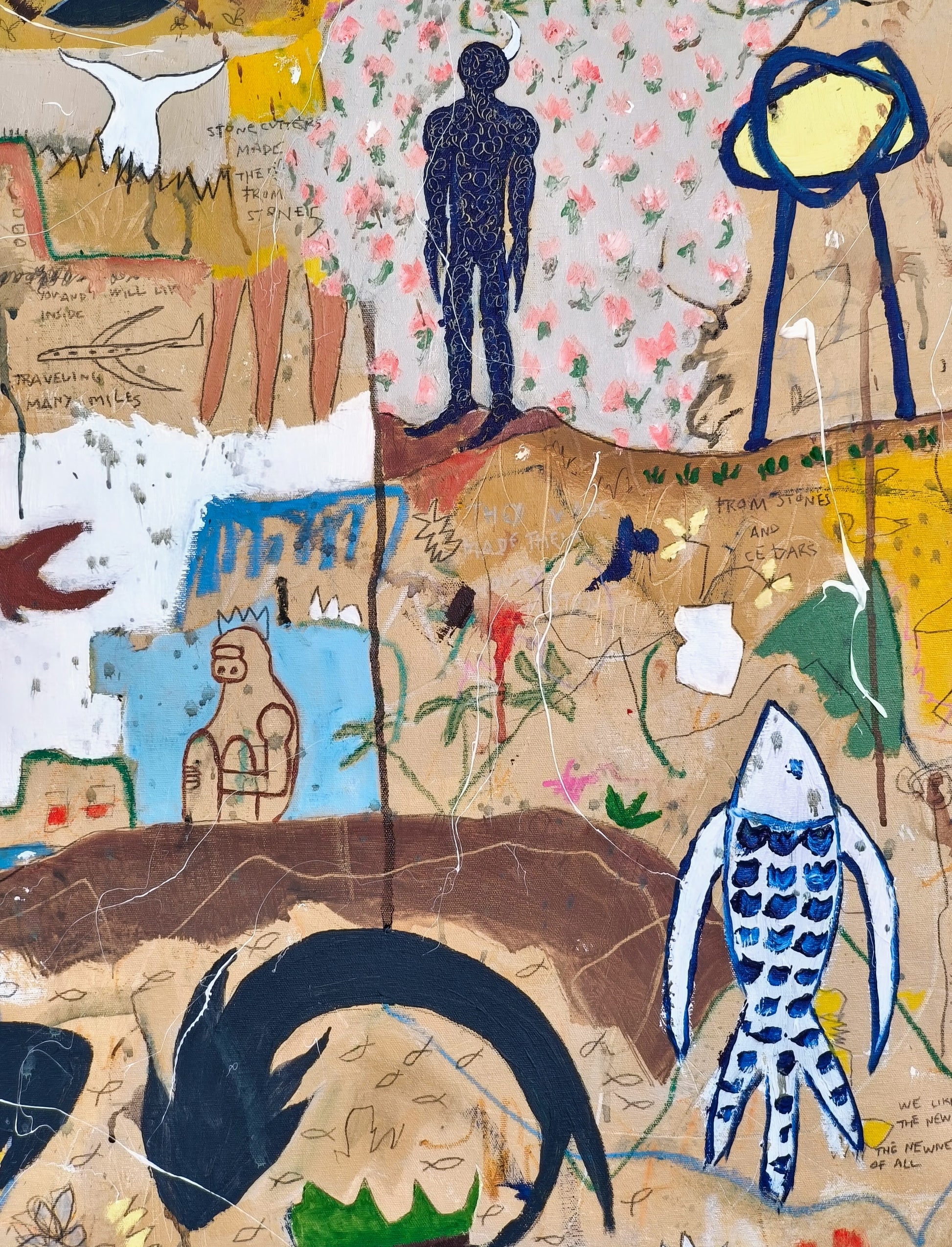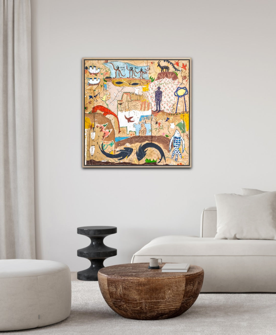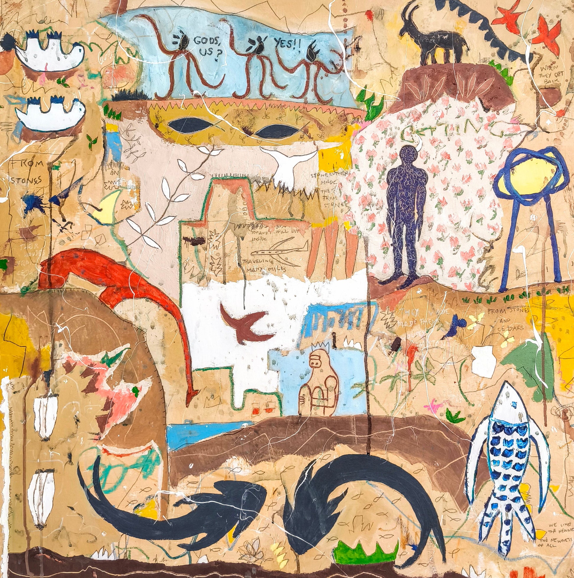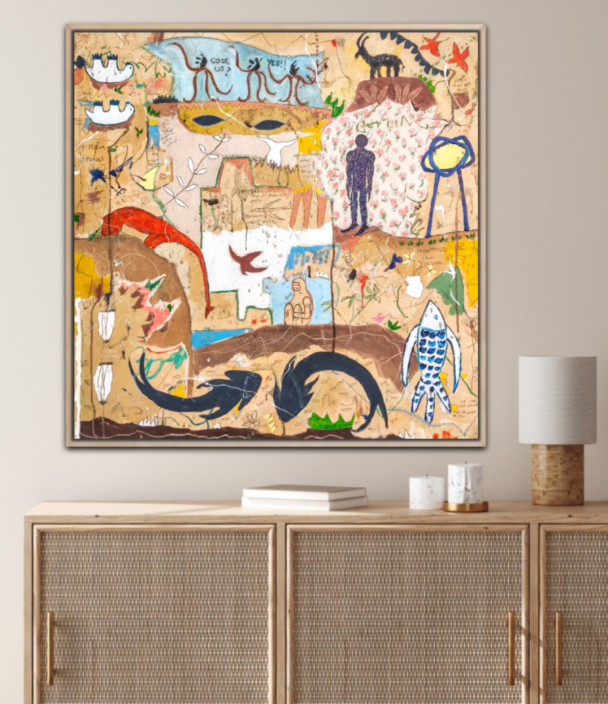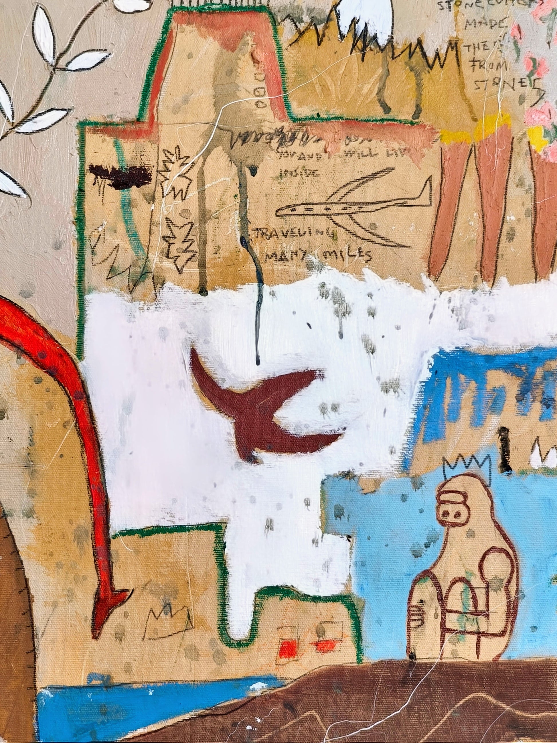 Técnica: acrílico, pigmentos, lápiz, carboncillo, gesso, ceras.