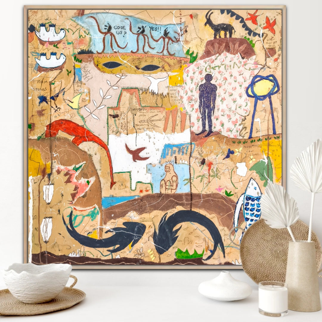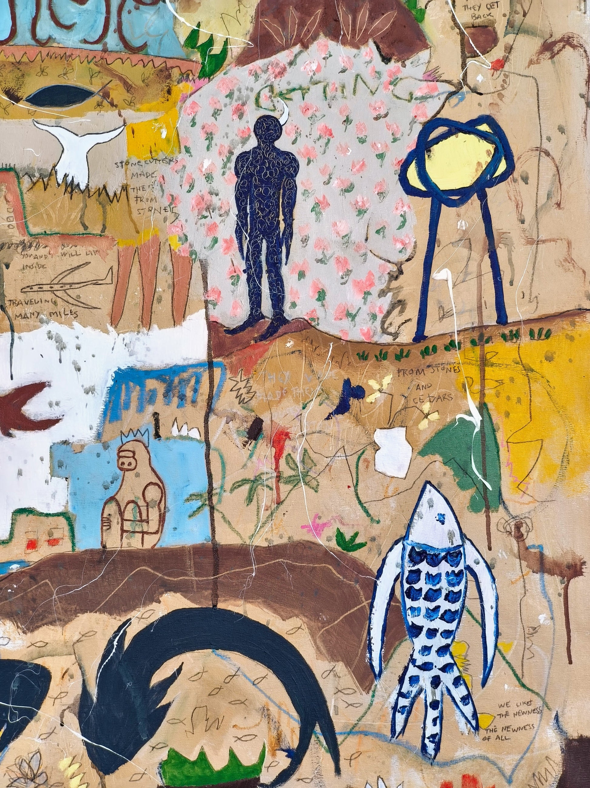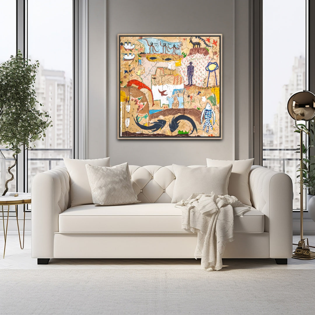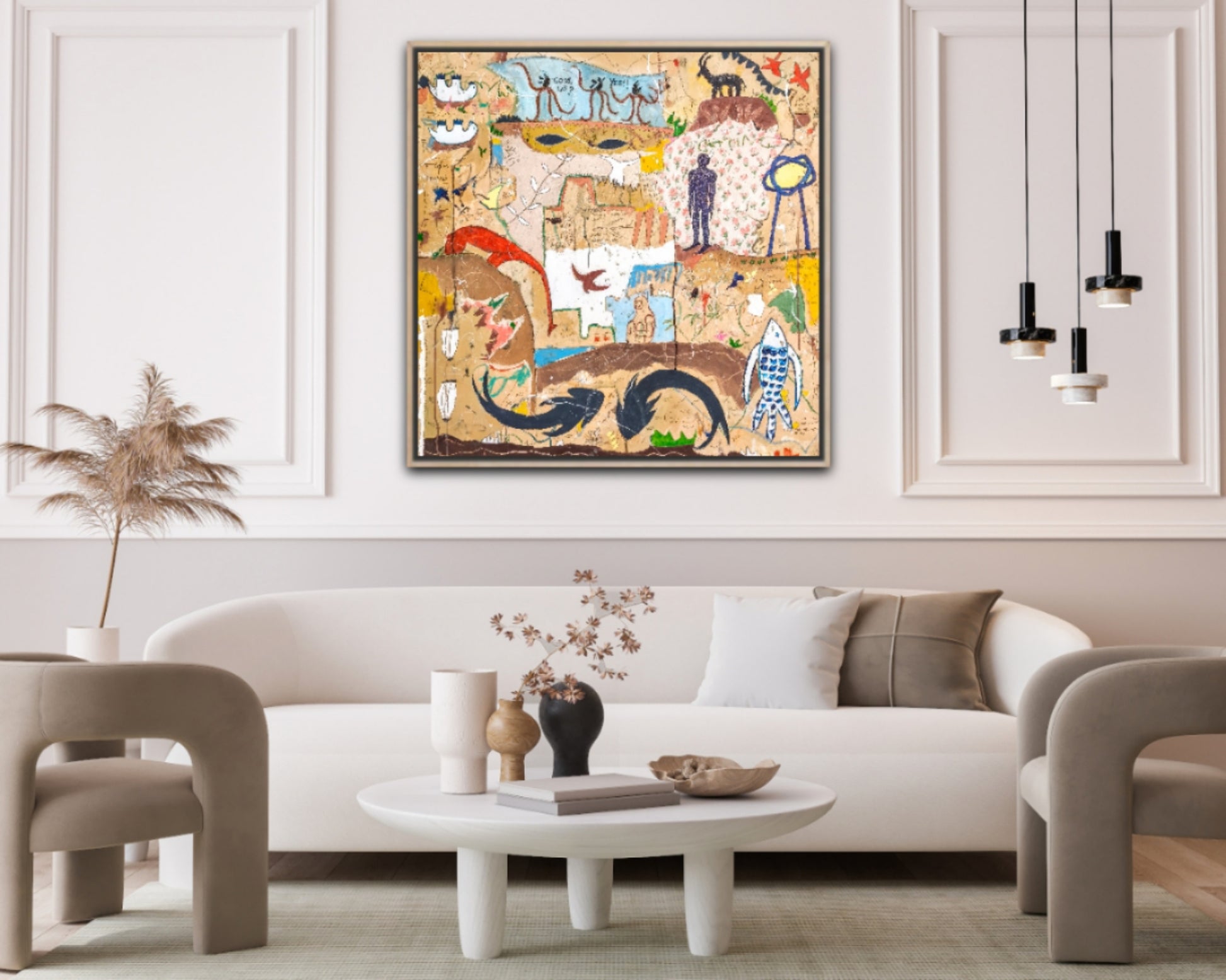 Técnica: acrílico, pigmentos, lápiz, carboncillo, gesso, ceras.