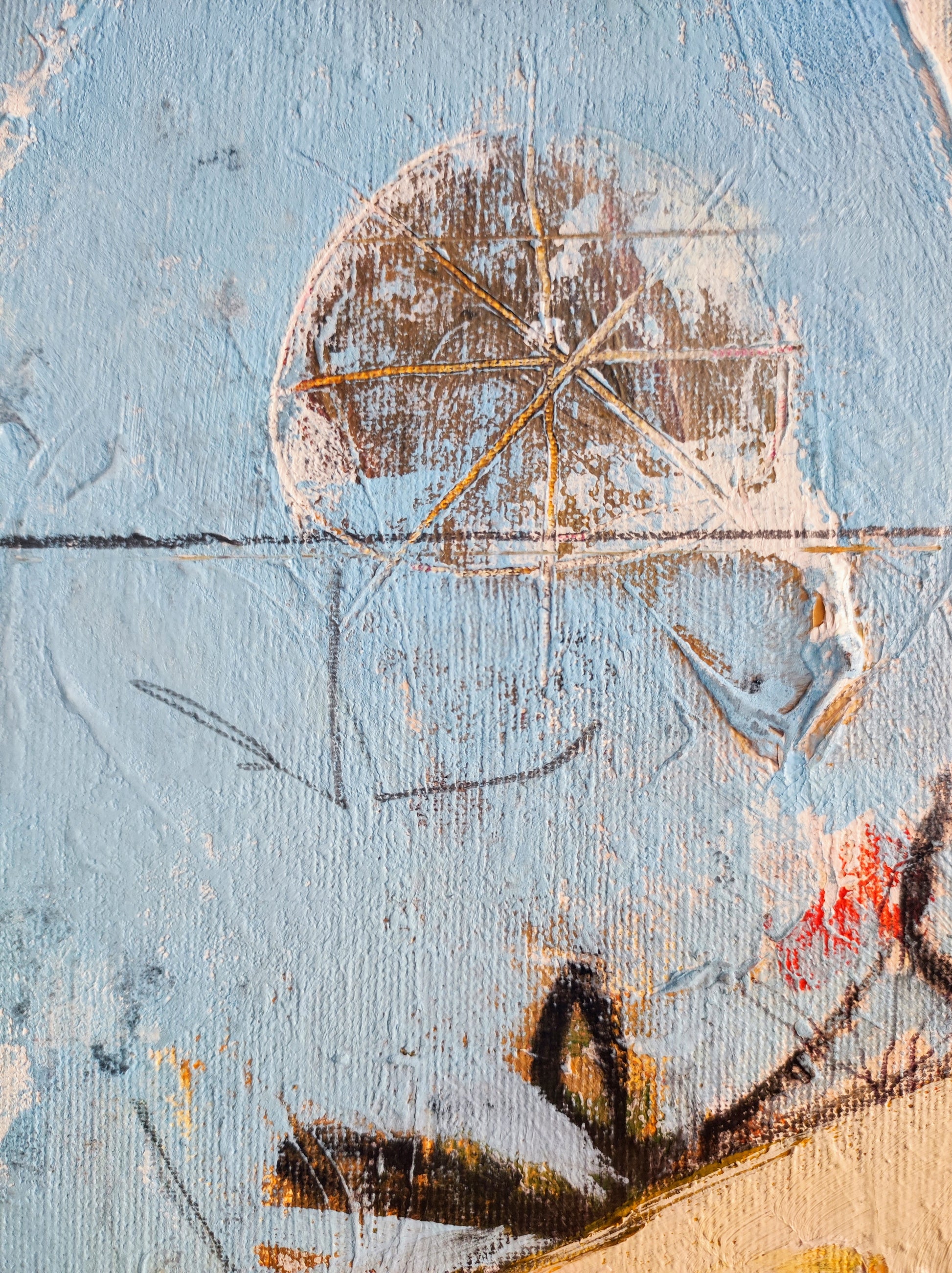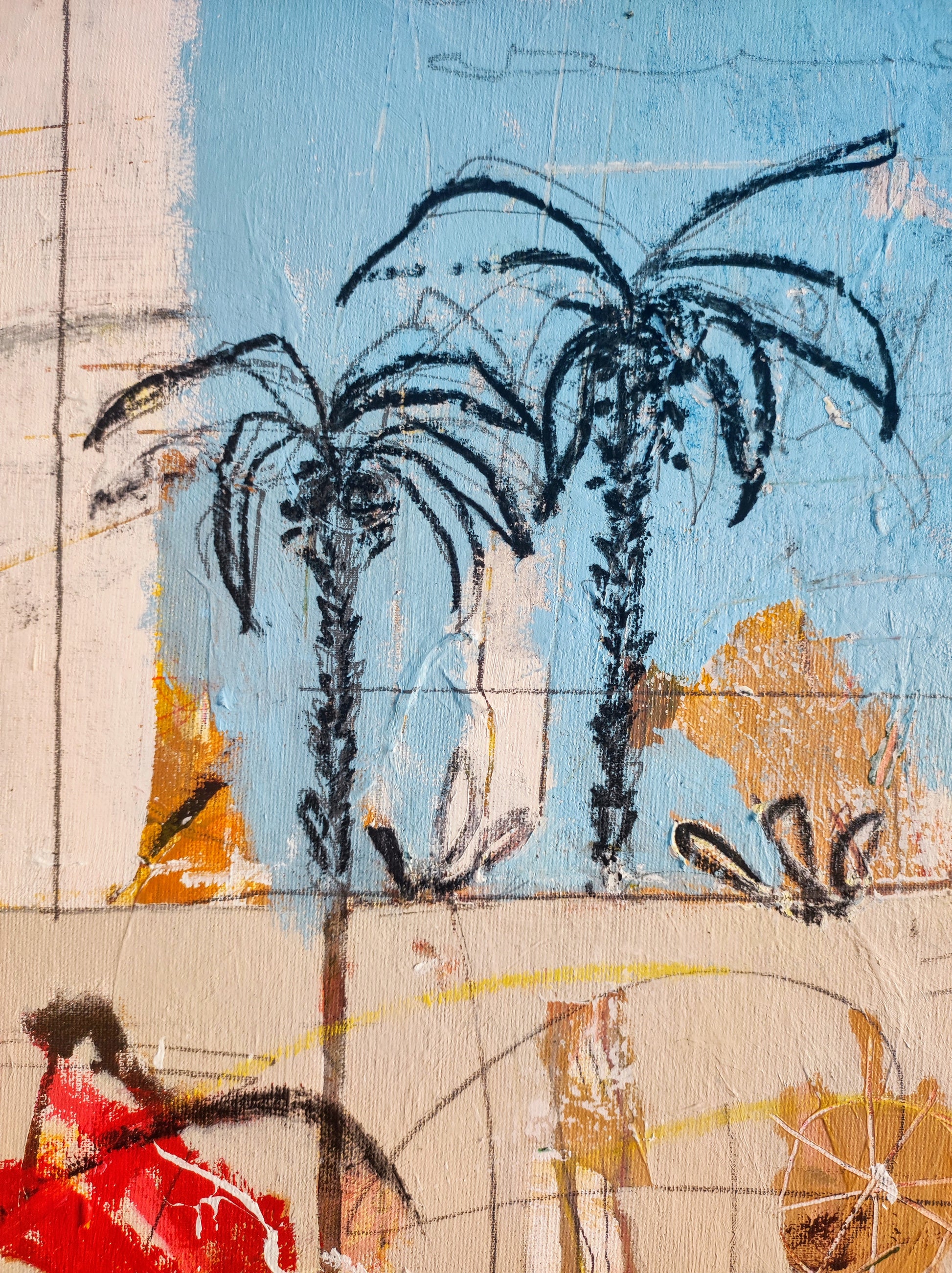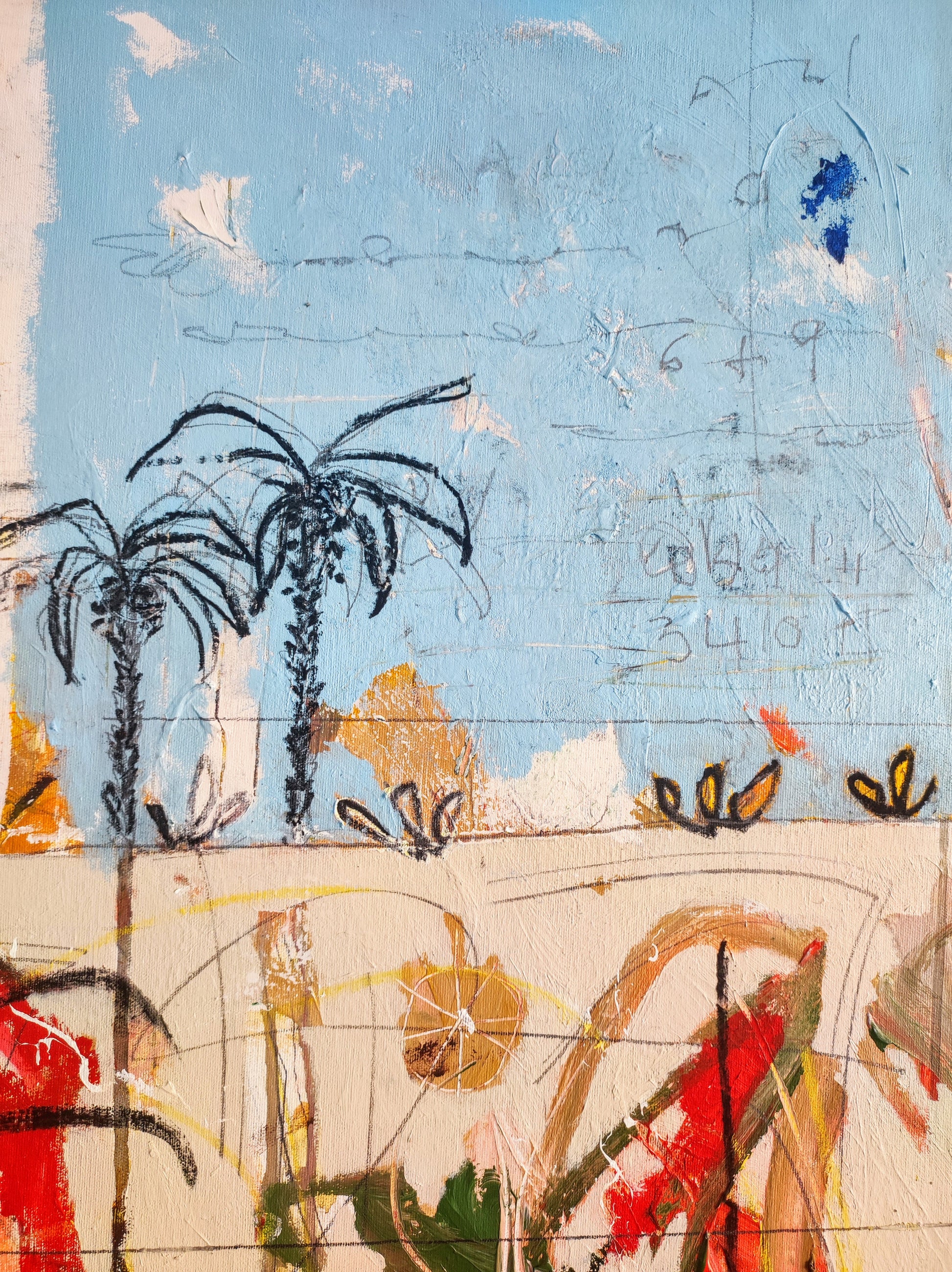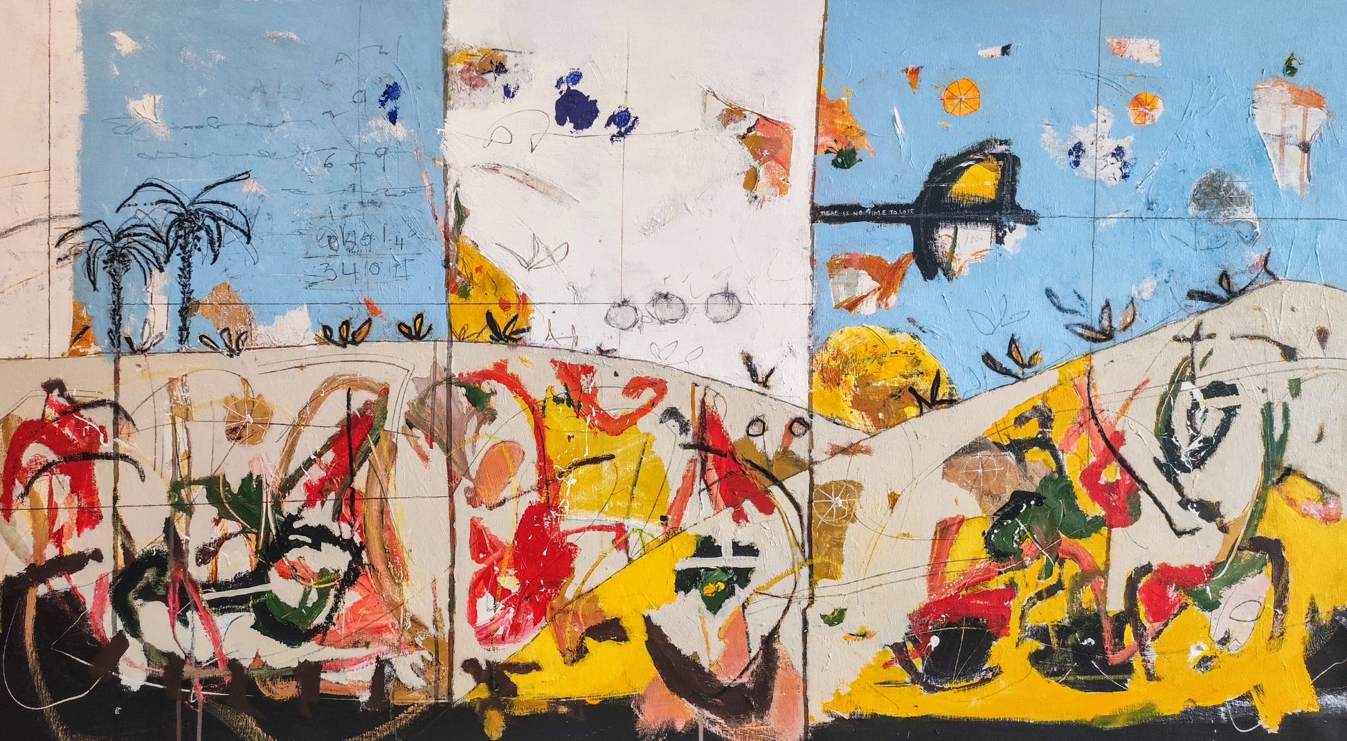 Técnica: acrílico, pigmentos, ceras, bolígrafo, carboncillo y lápiz.