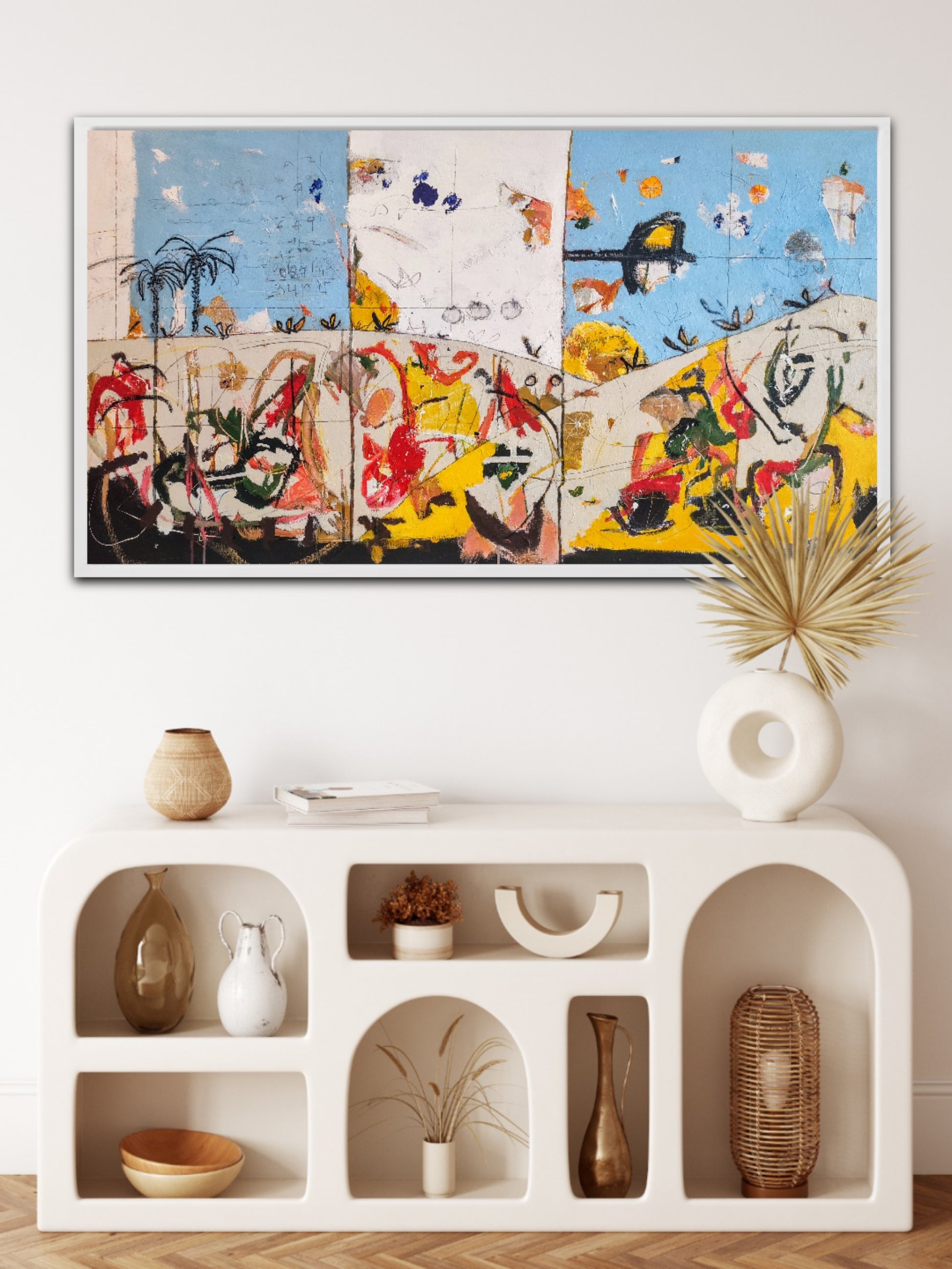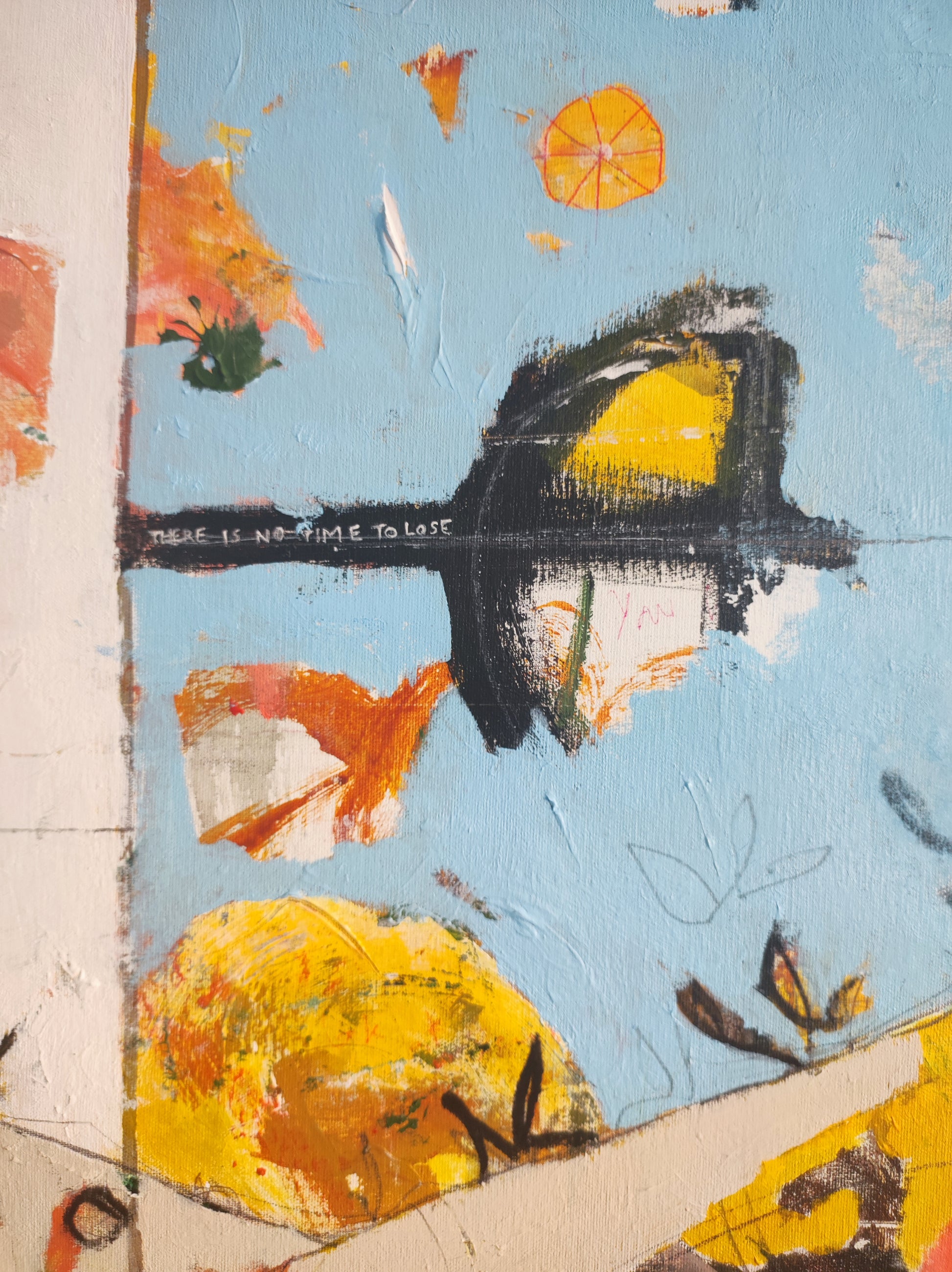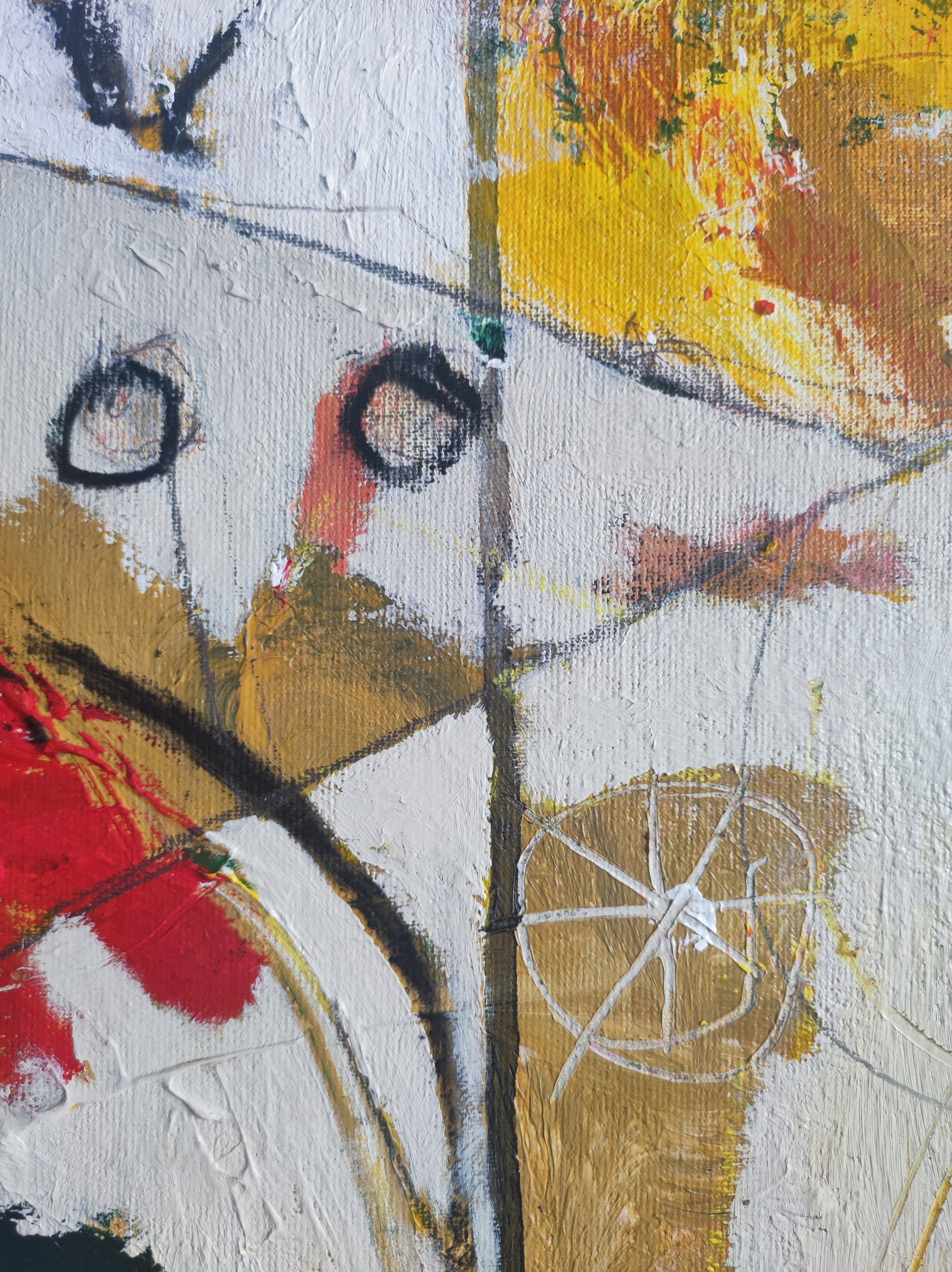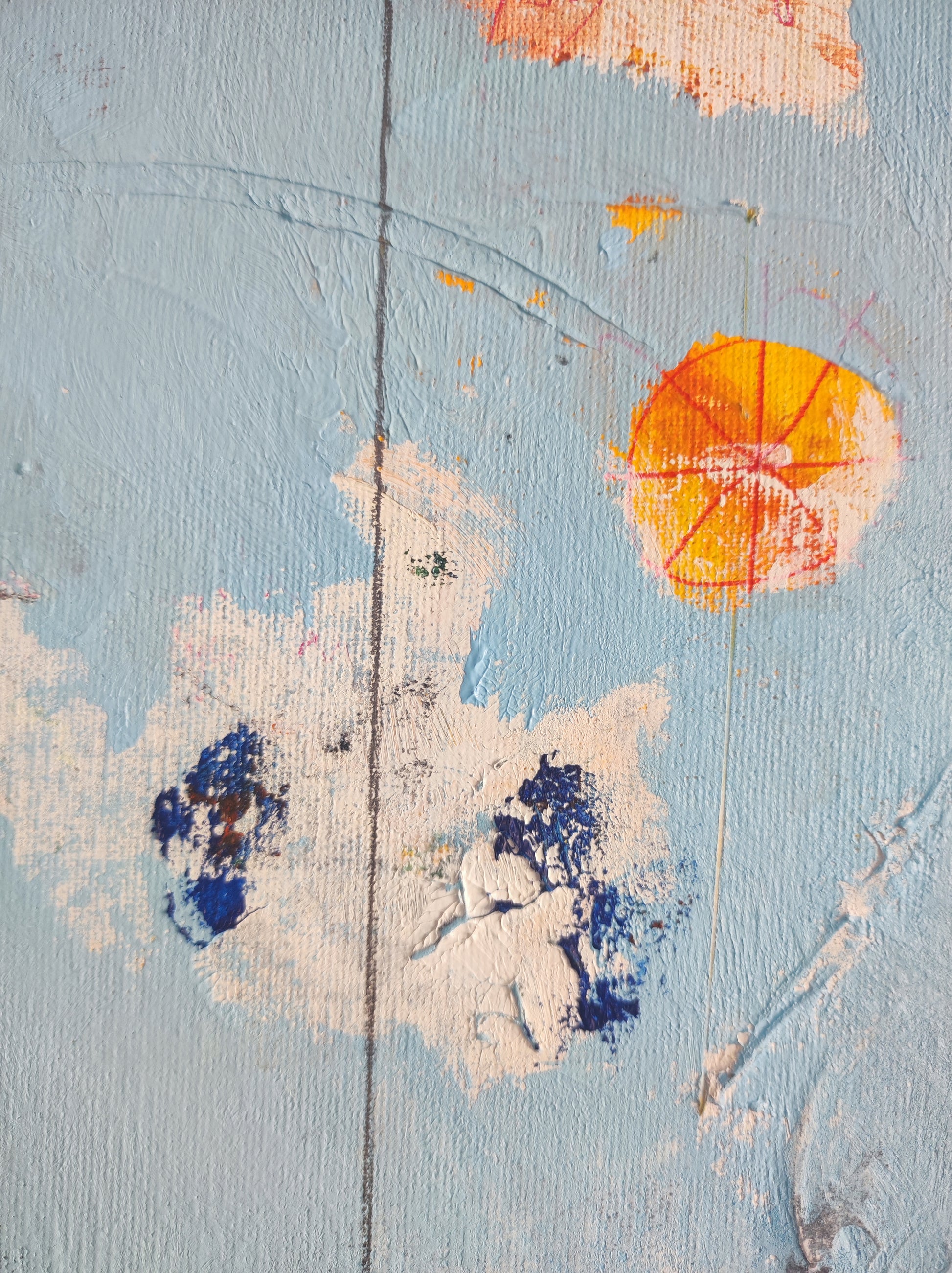 Técnica: acrílico, pigmentos, ceras, bolígrafo, carboncillo y lápiz.