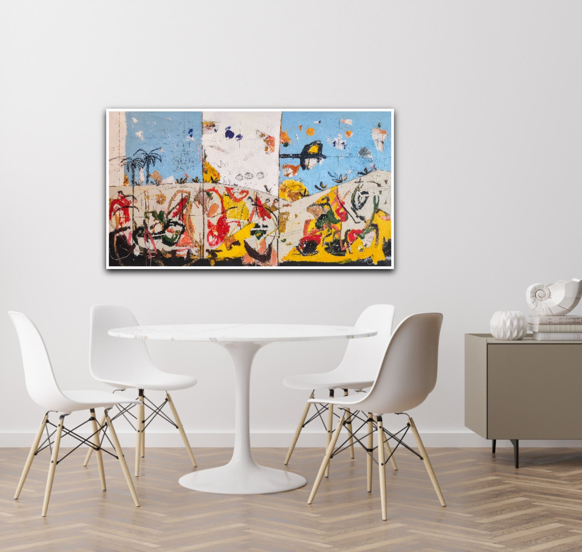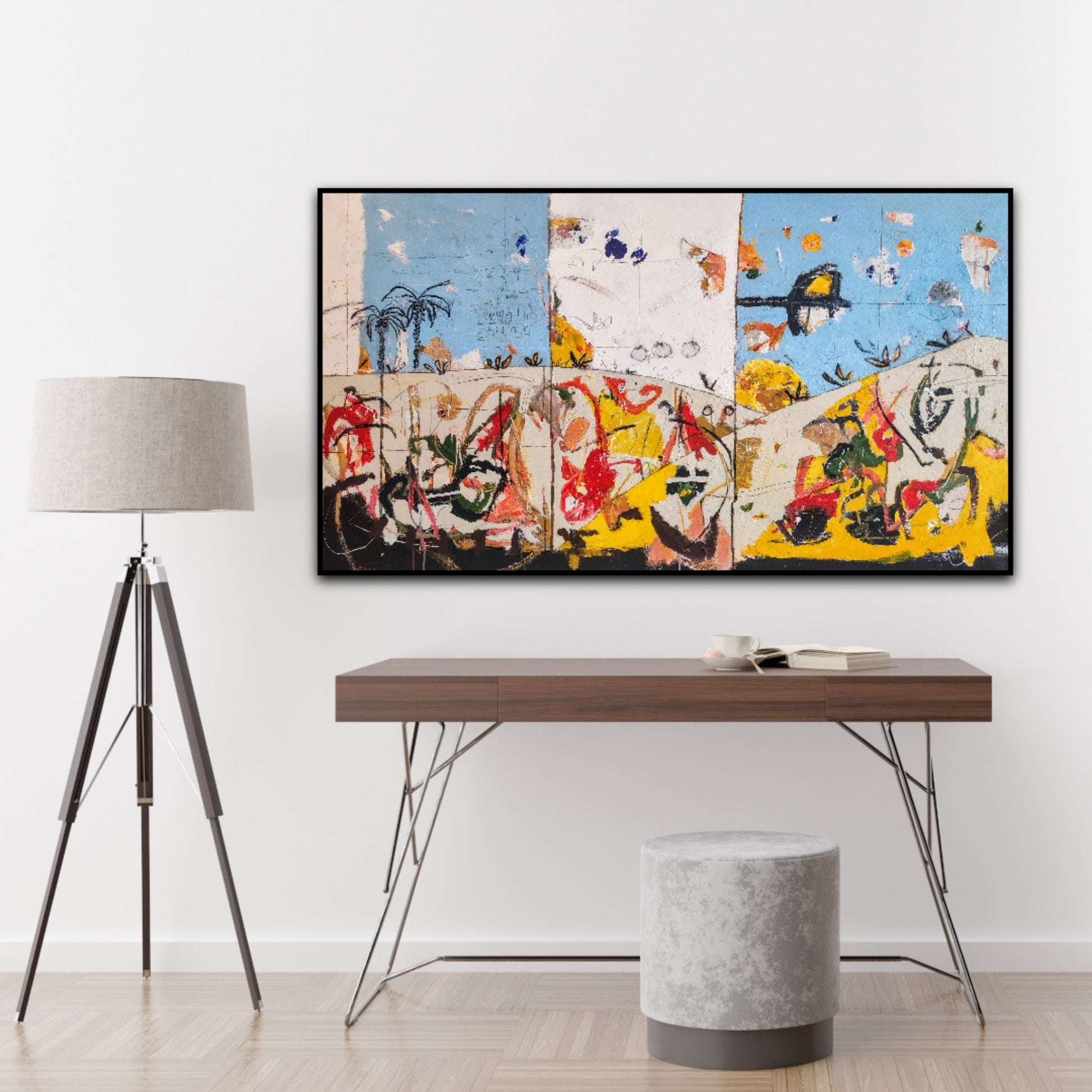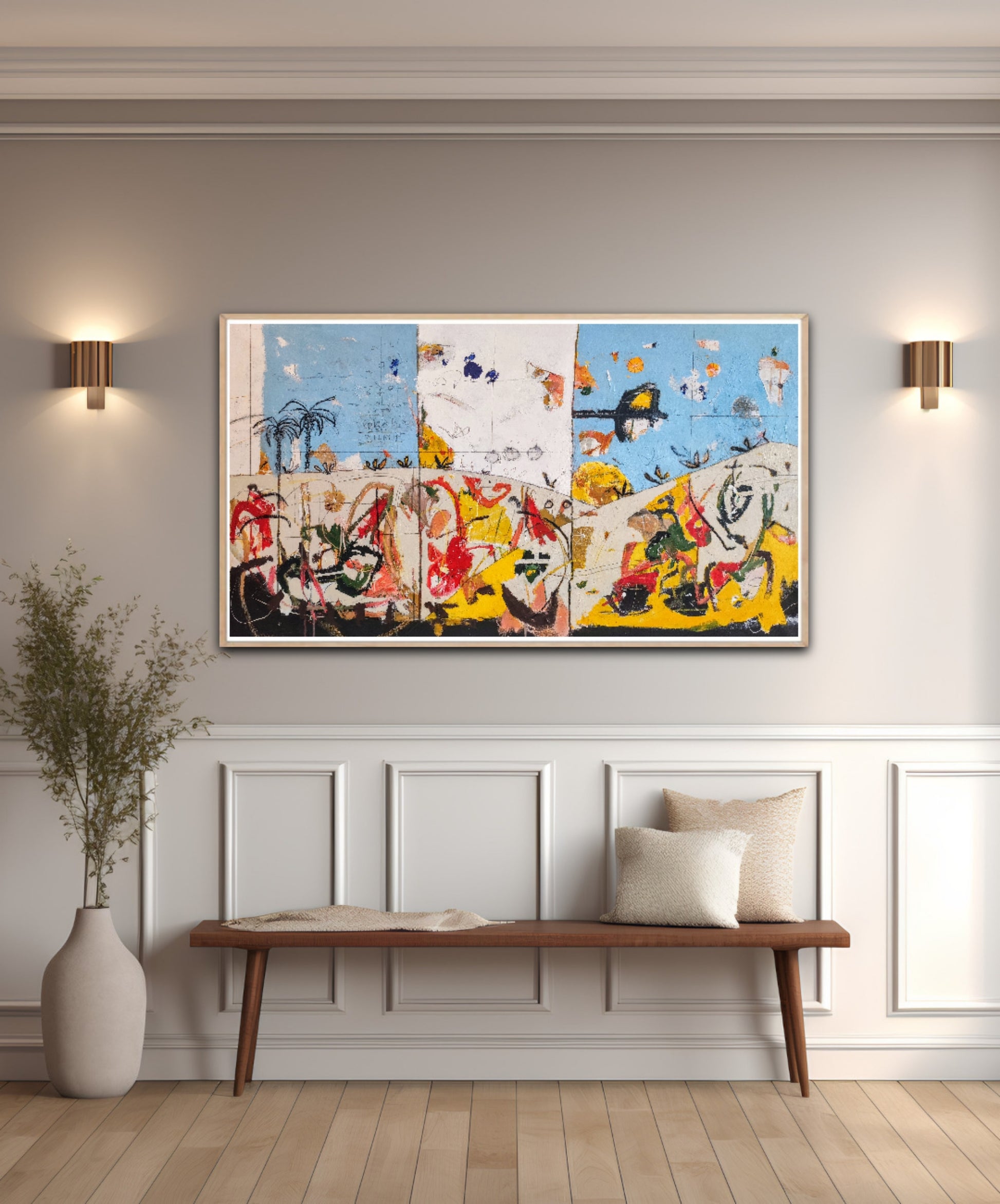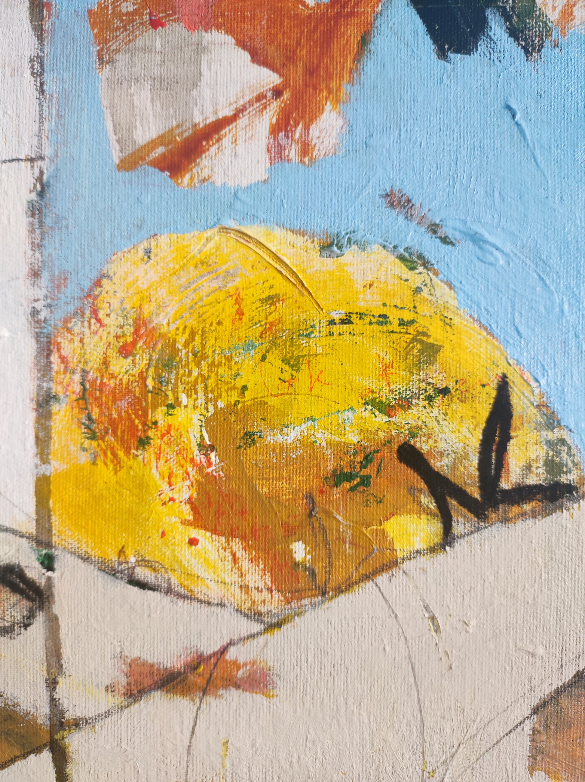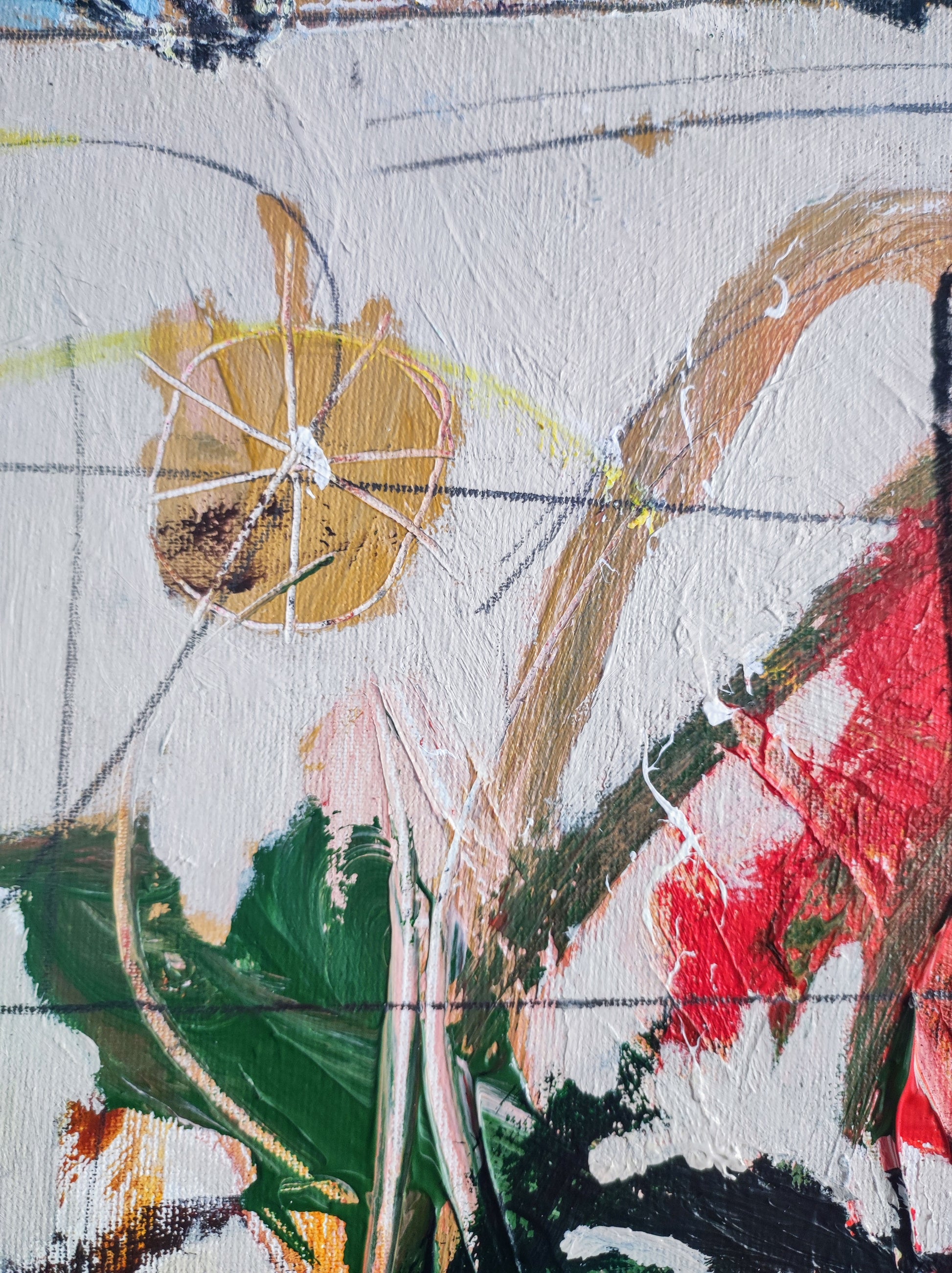 Técnica: acrílico, pigmentos, ceras, bolígrafo, carboncillo y lápiz.