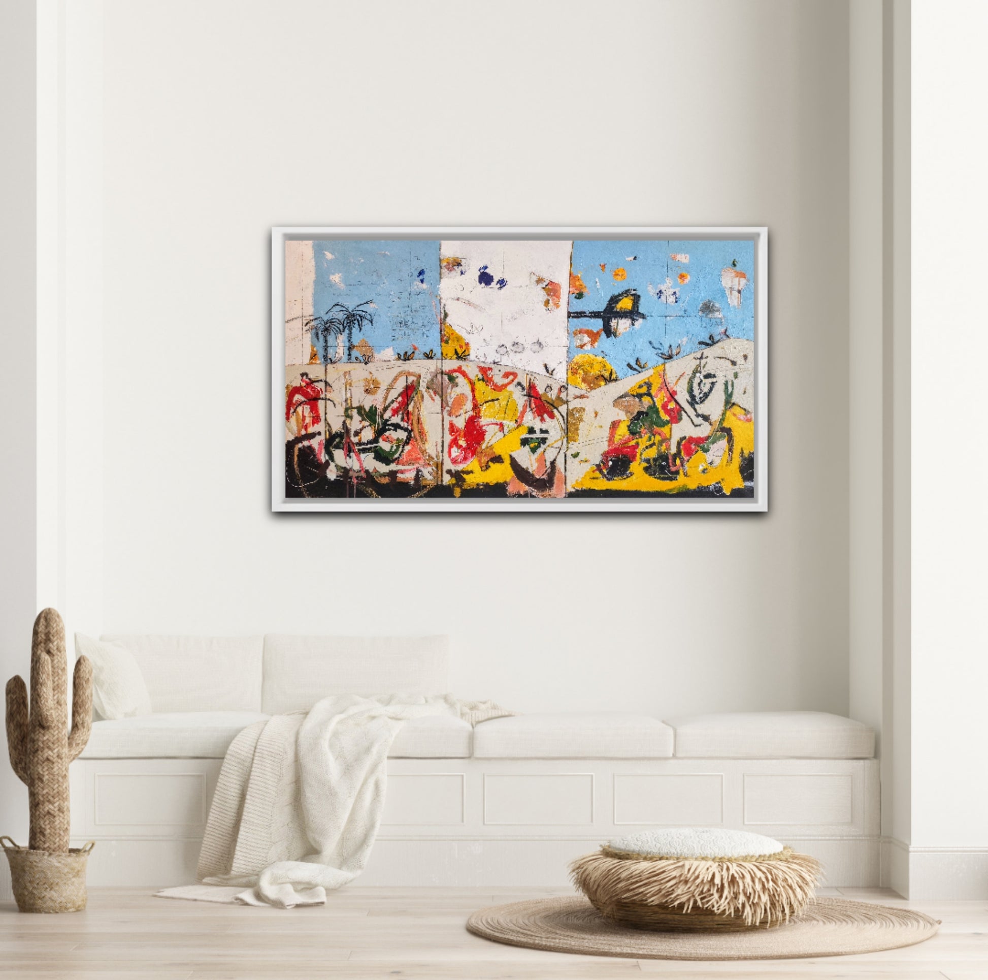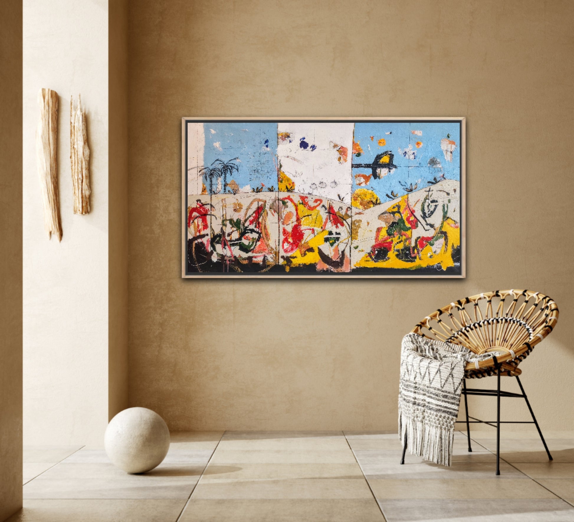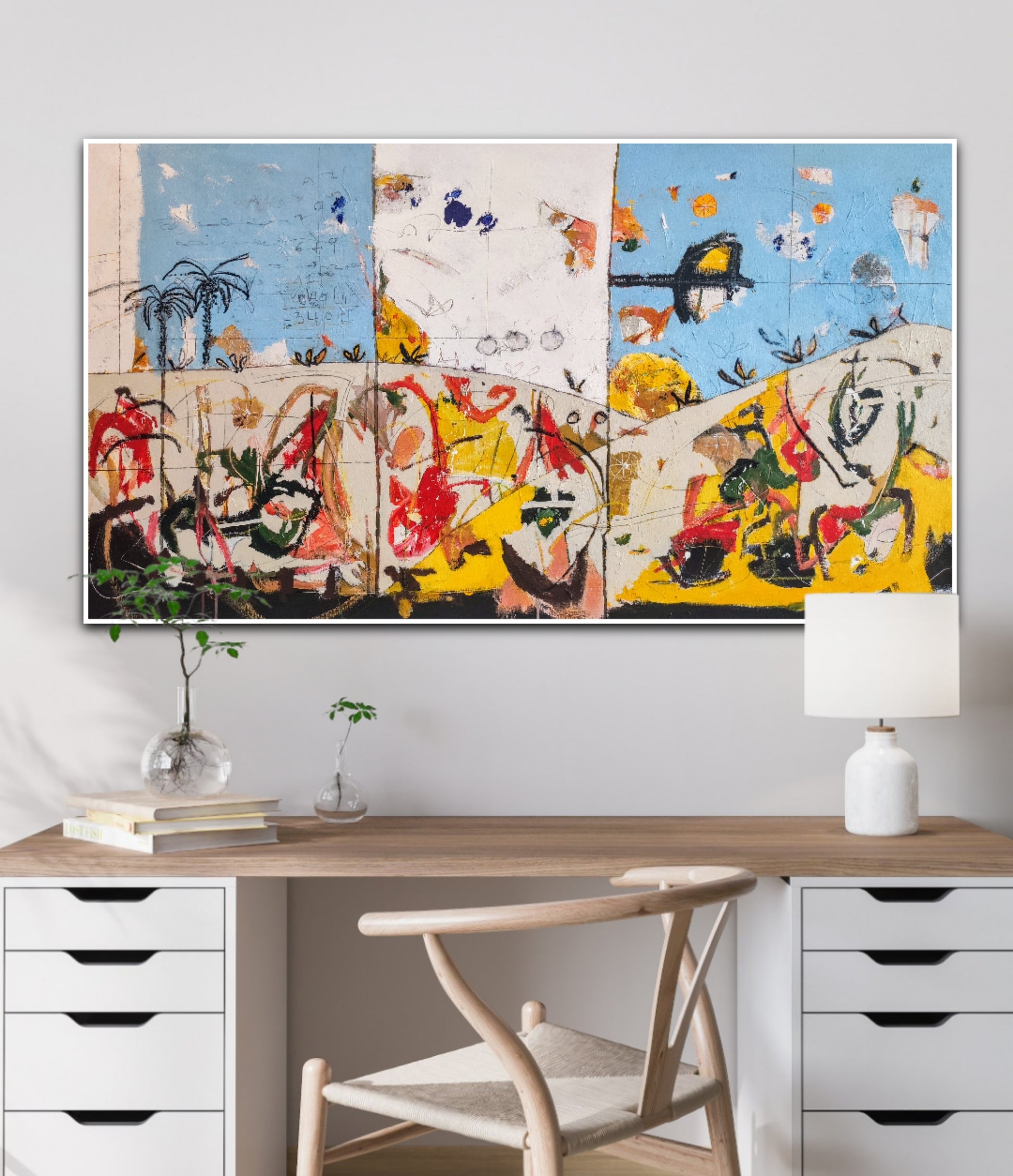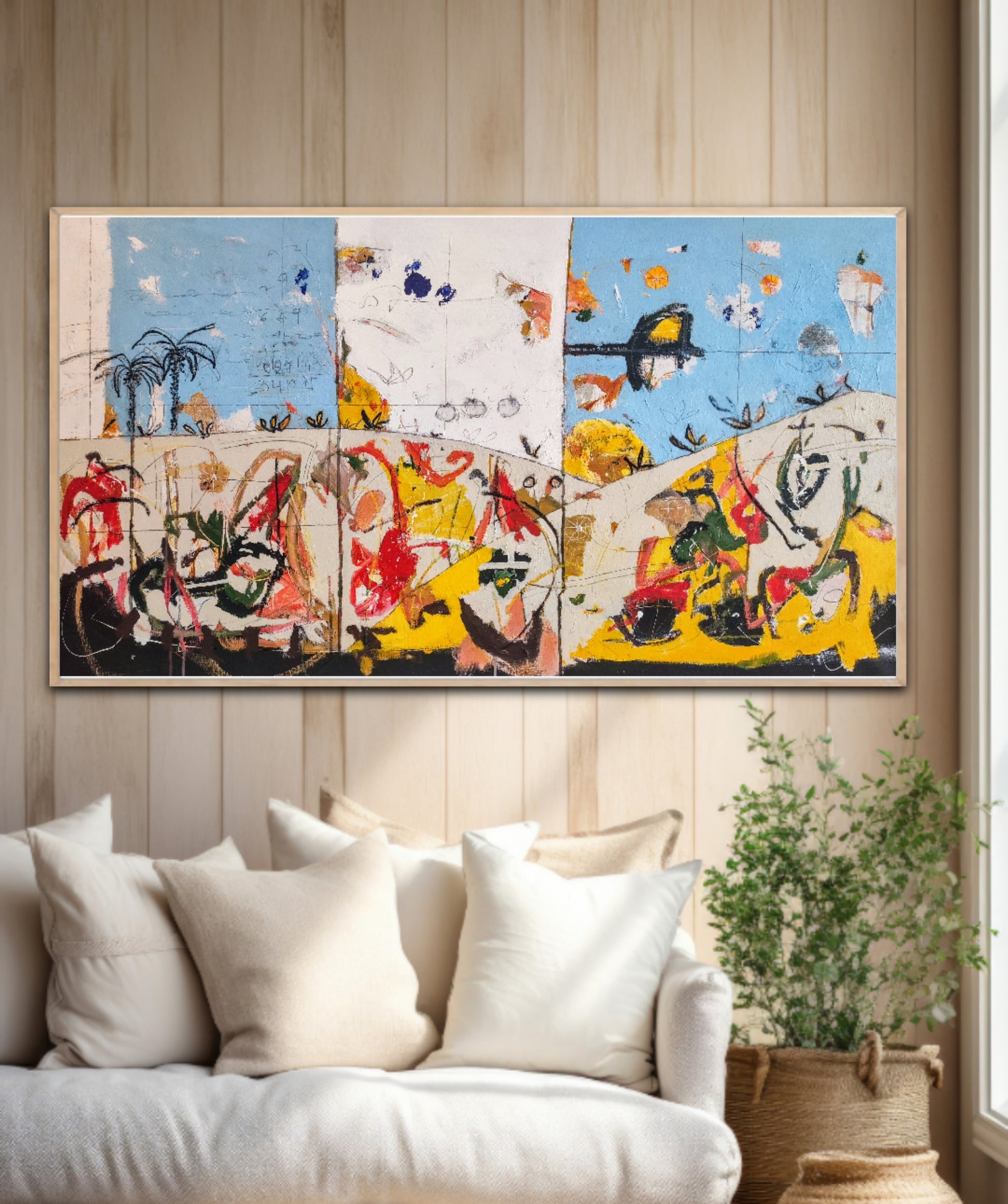 Técnica: acrílico, pigmentos, ceras, bolígrafo, carboncillo y lápiz.