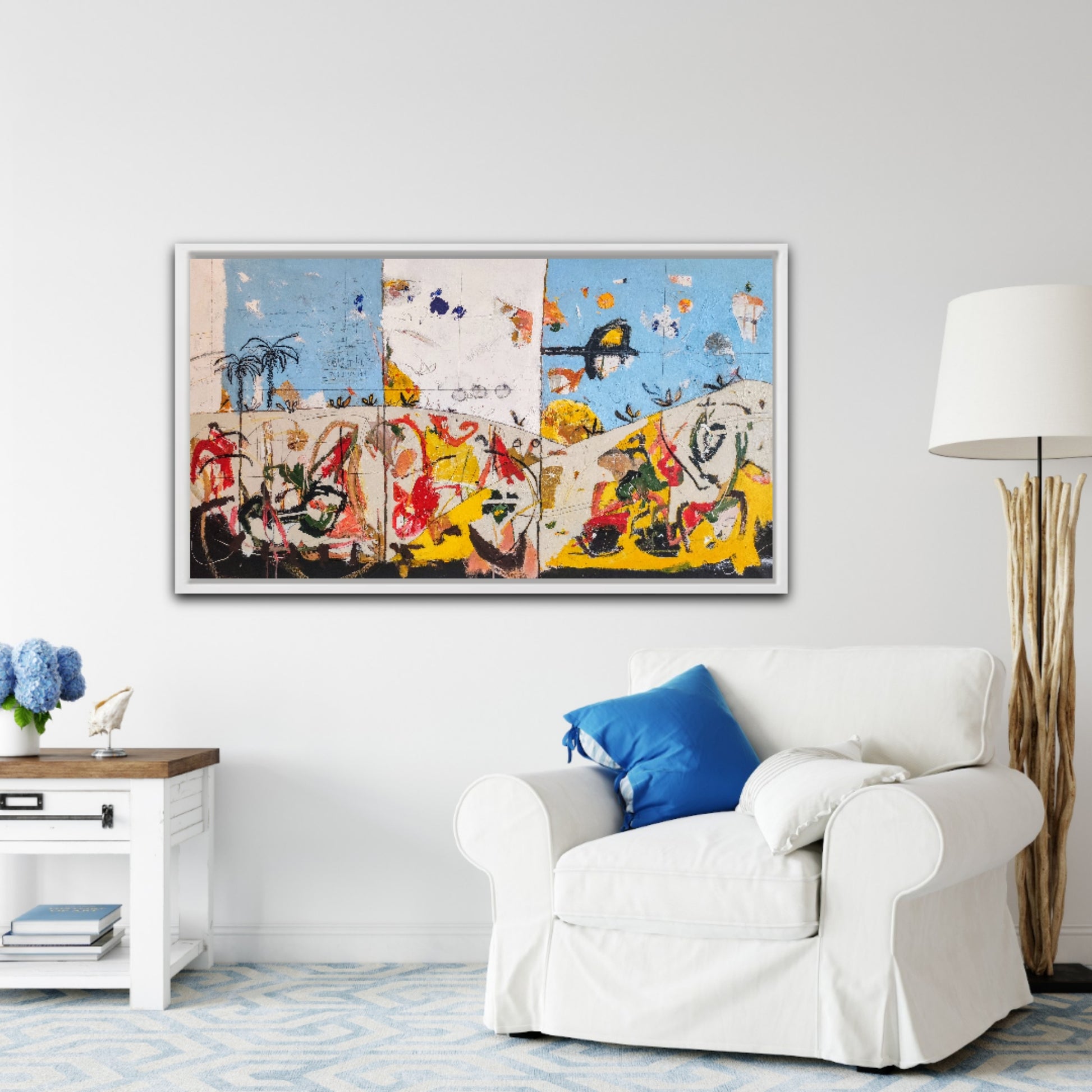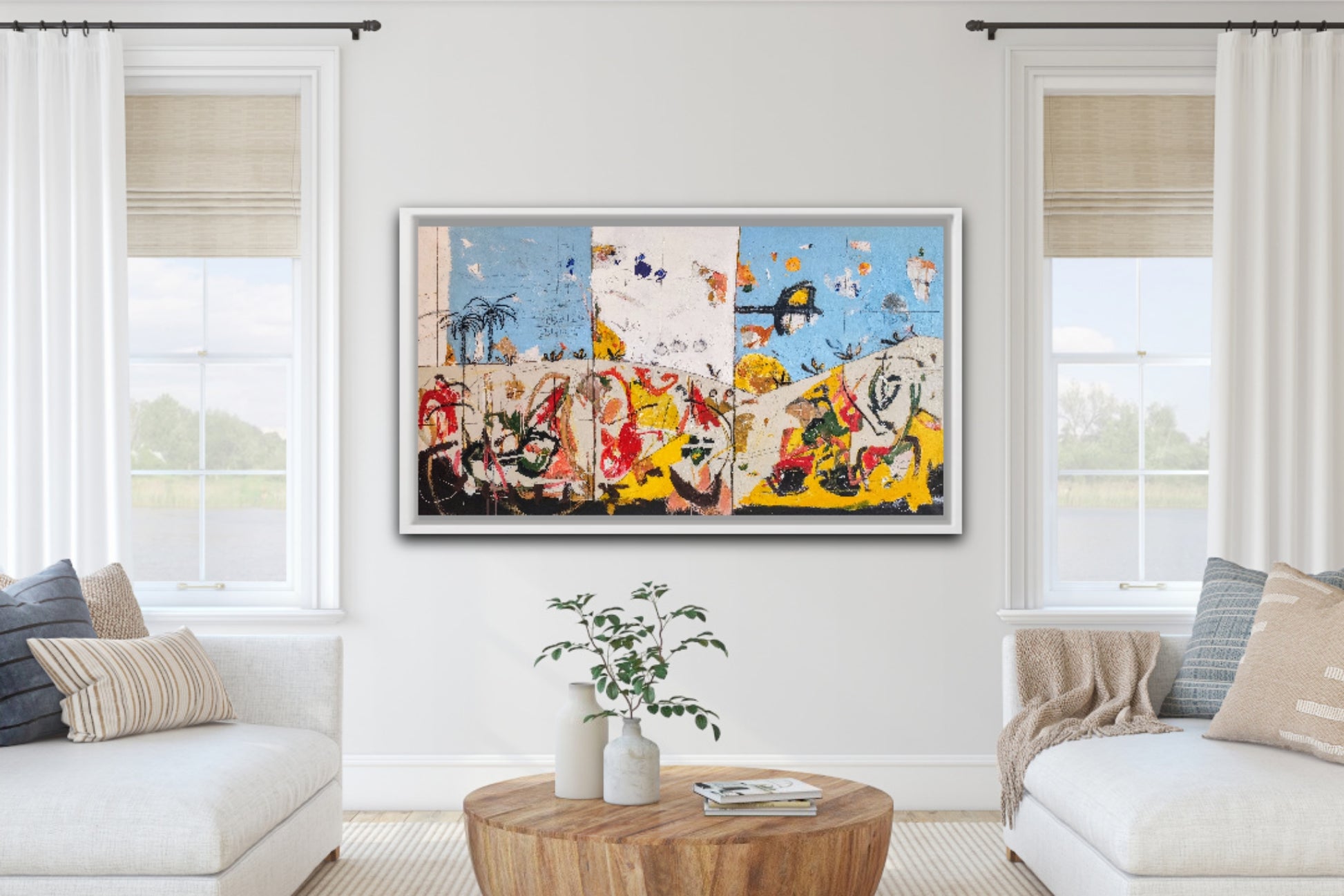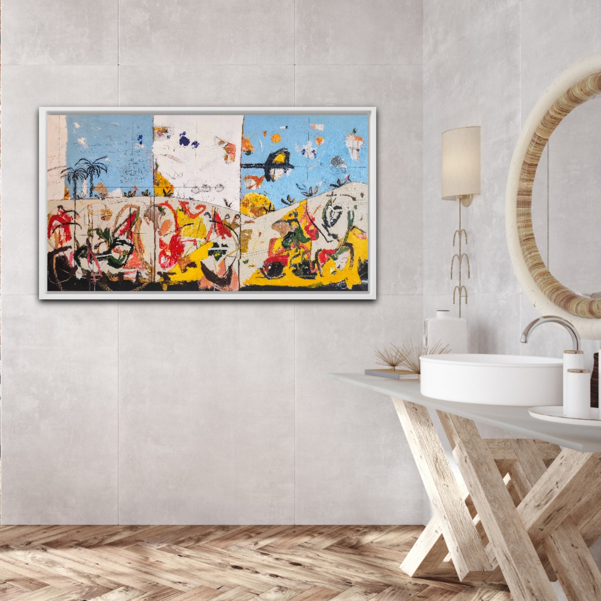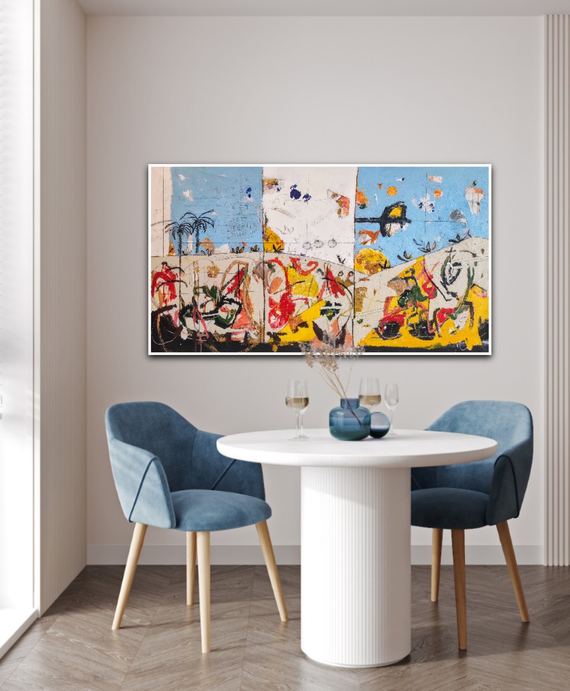 Técnica: acrílico, pigmentos, ceras, bolígrafo, carboncillo y lápiz.