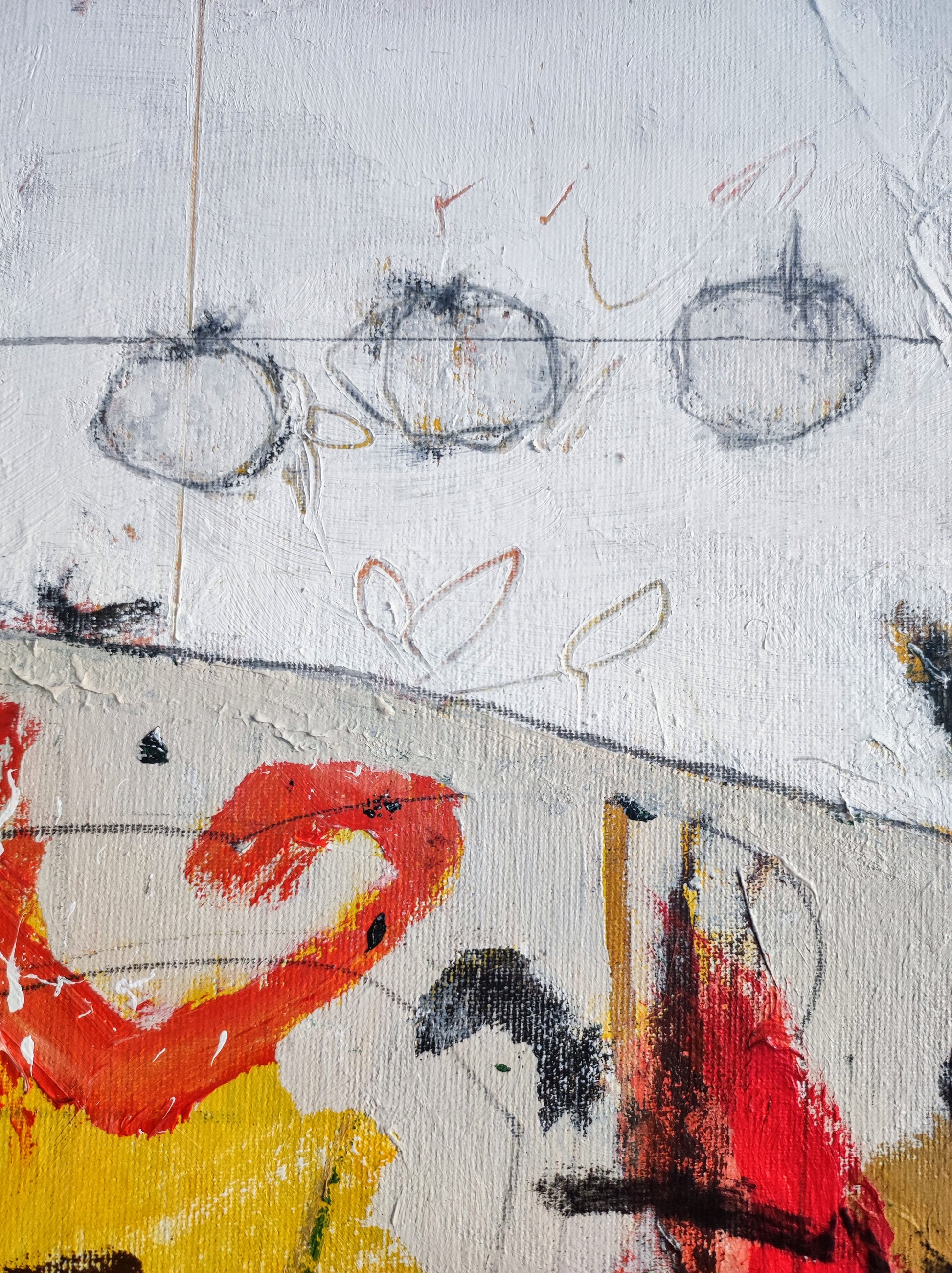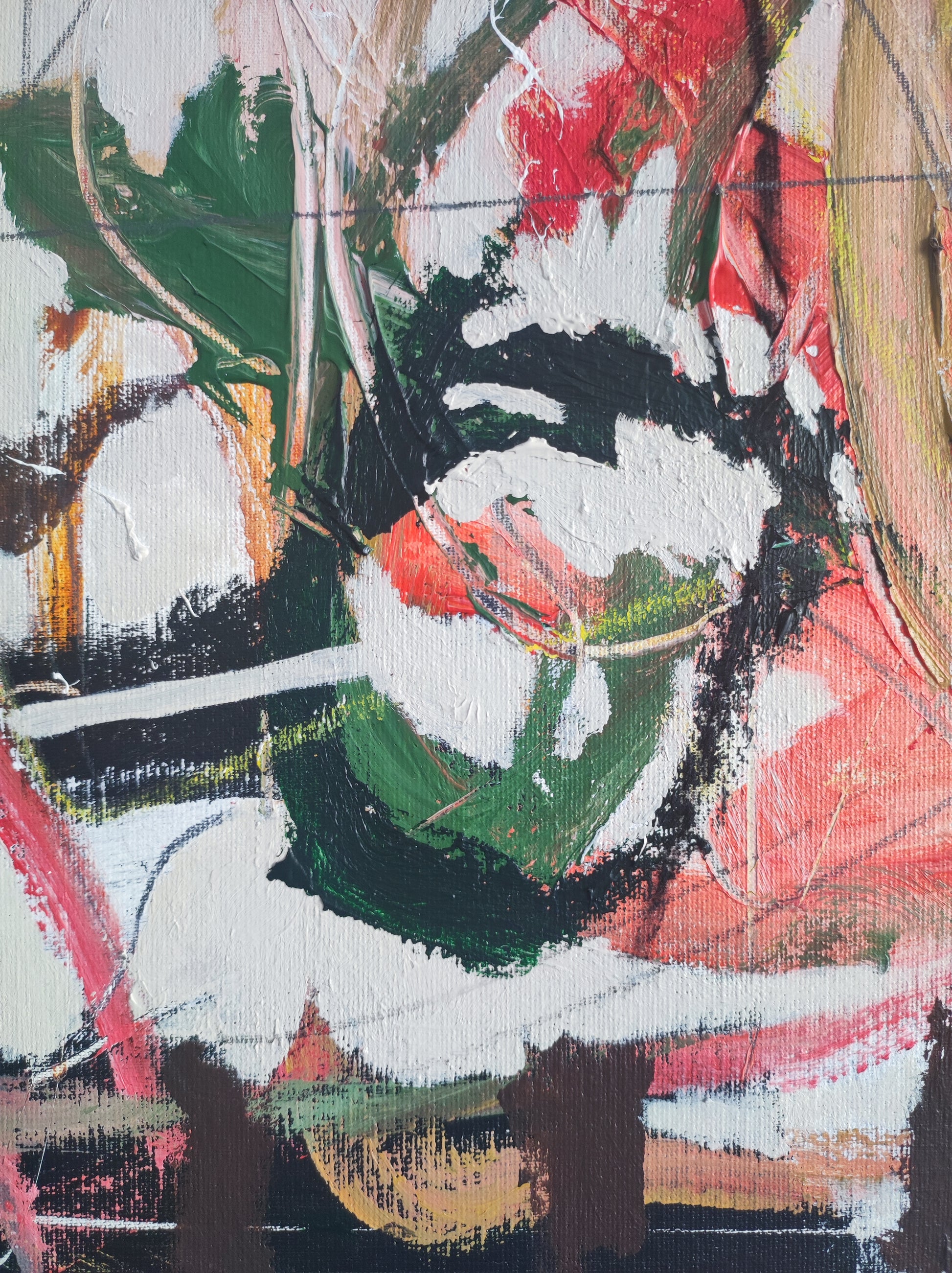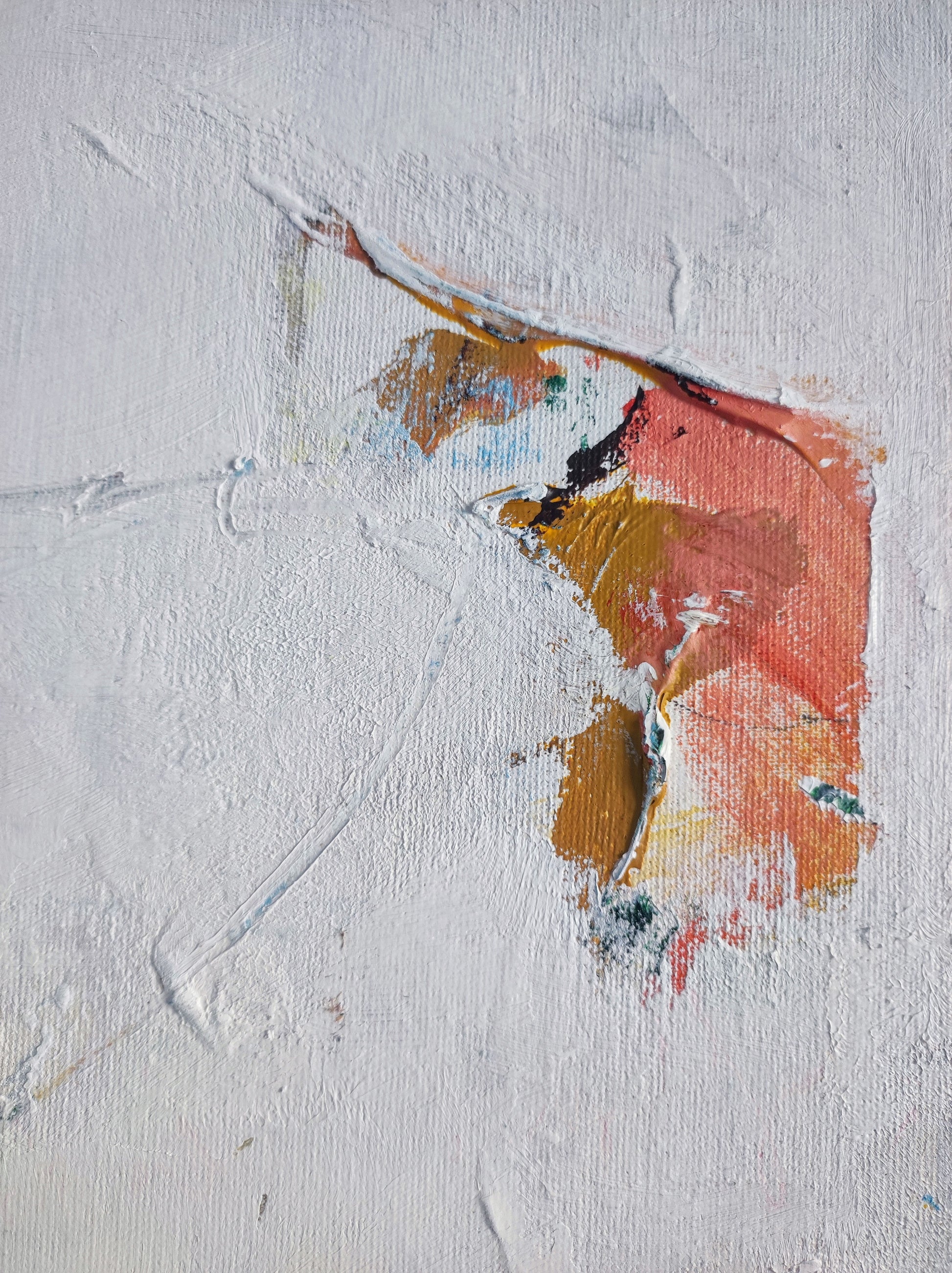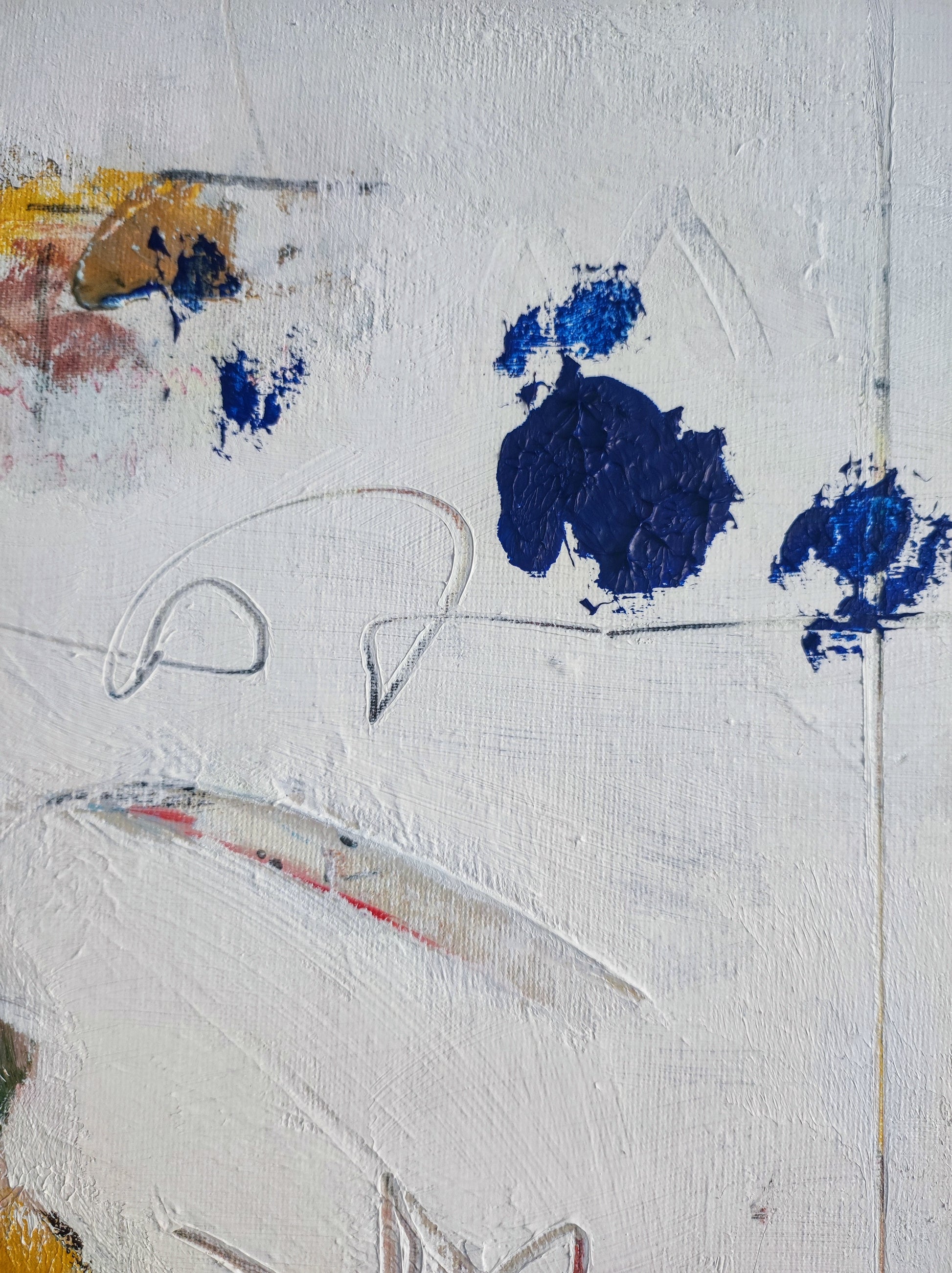 Pintura gestual, intuitiva, que deja que las cosas pasen y se apoya sobre lo que aparece. Aprovechando el accidente y aceptando las consecuencias.