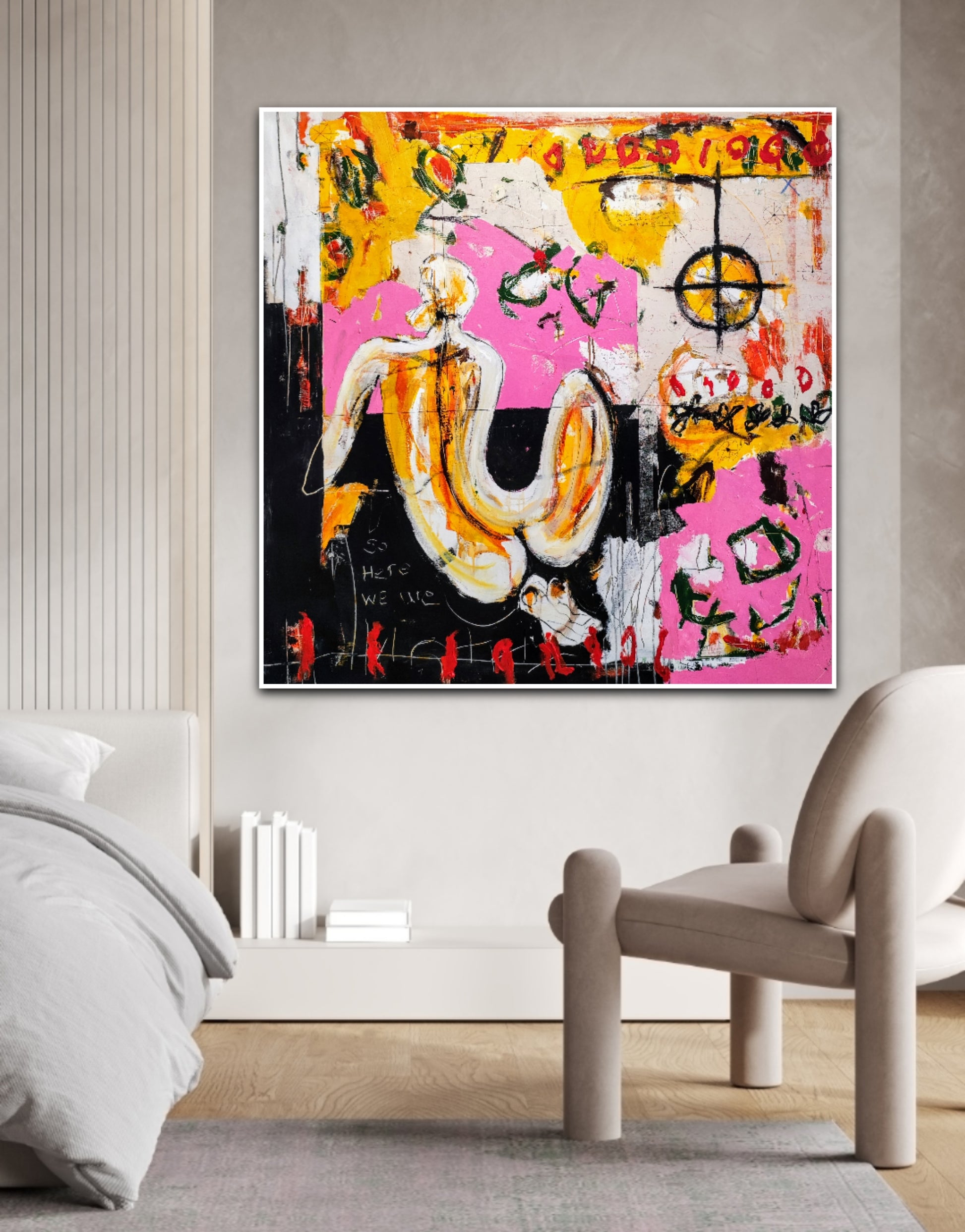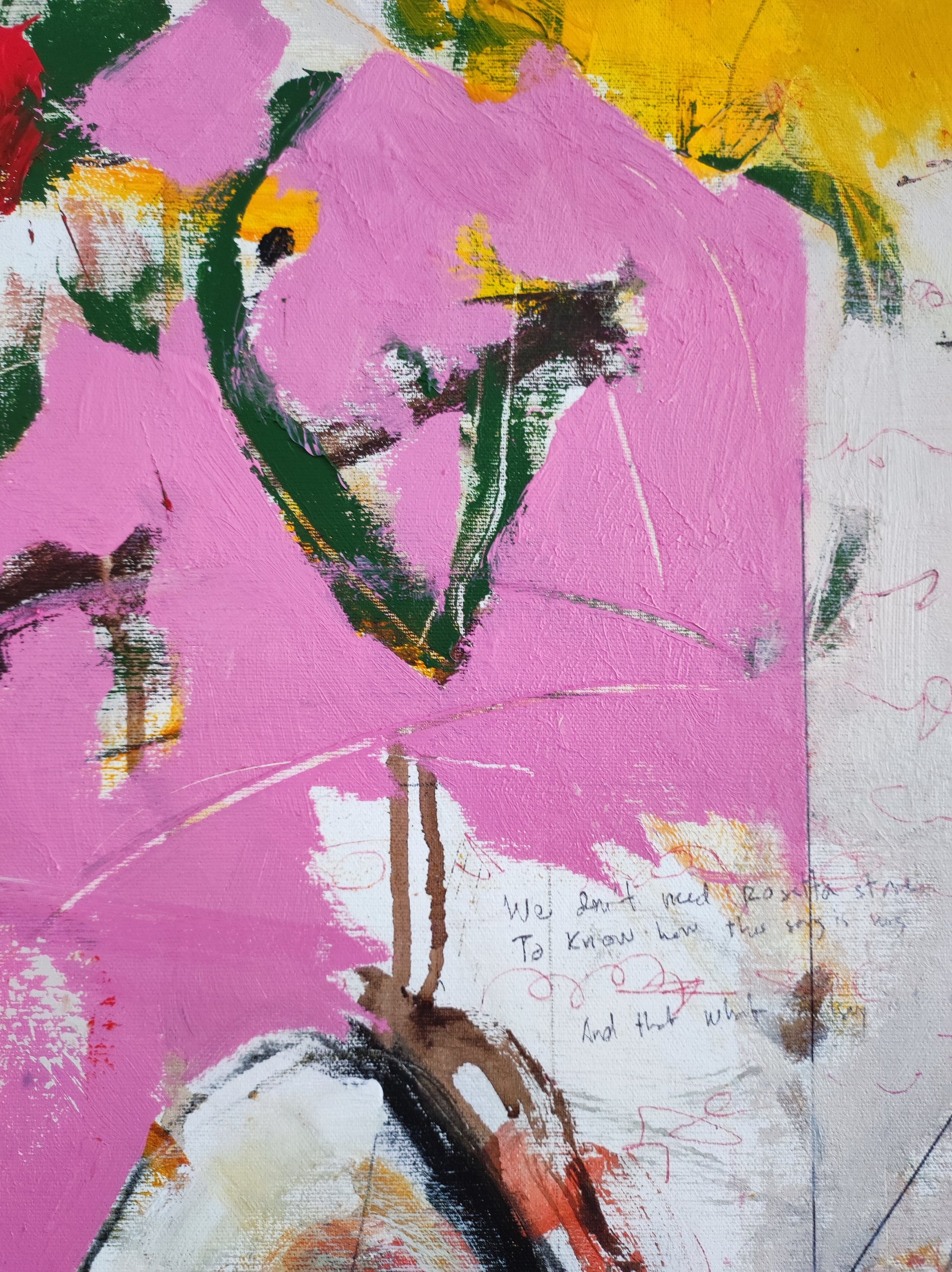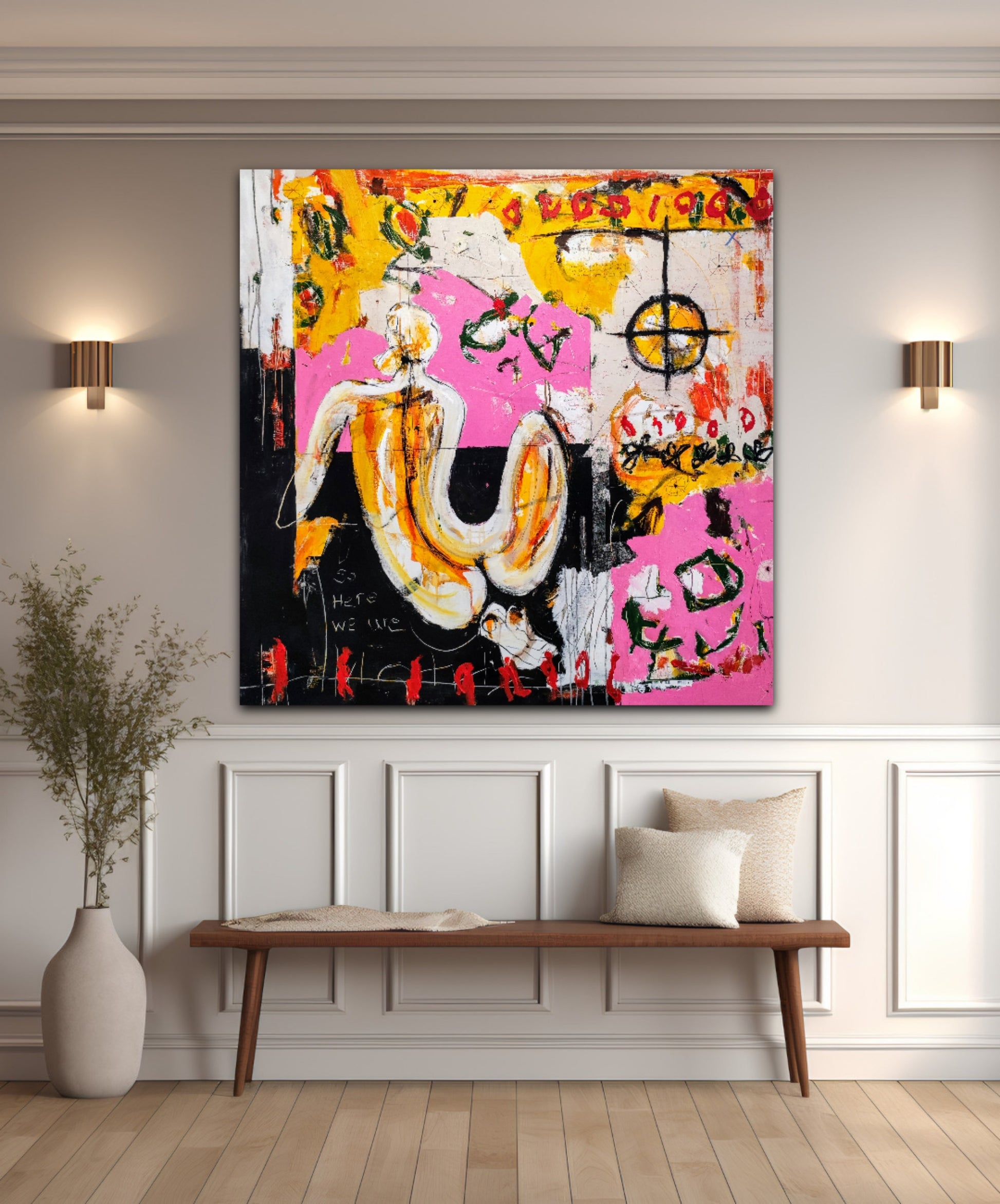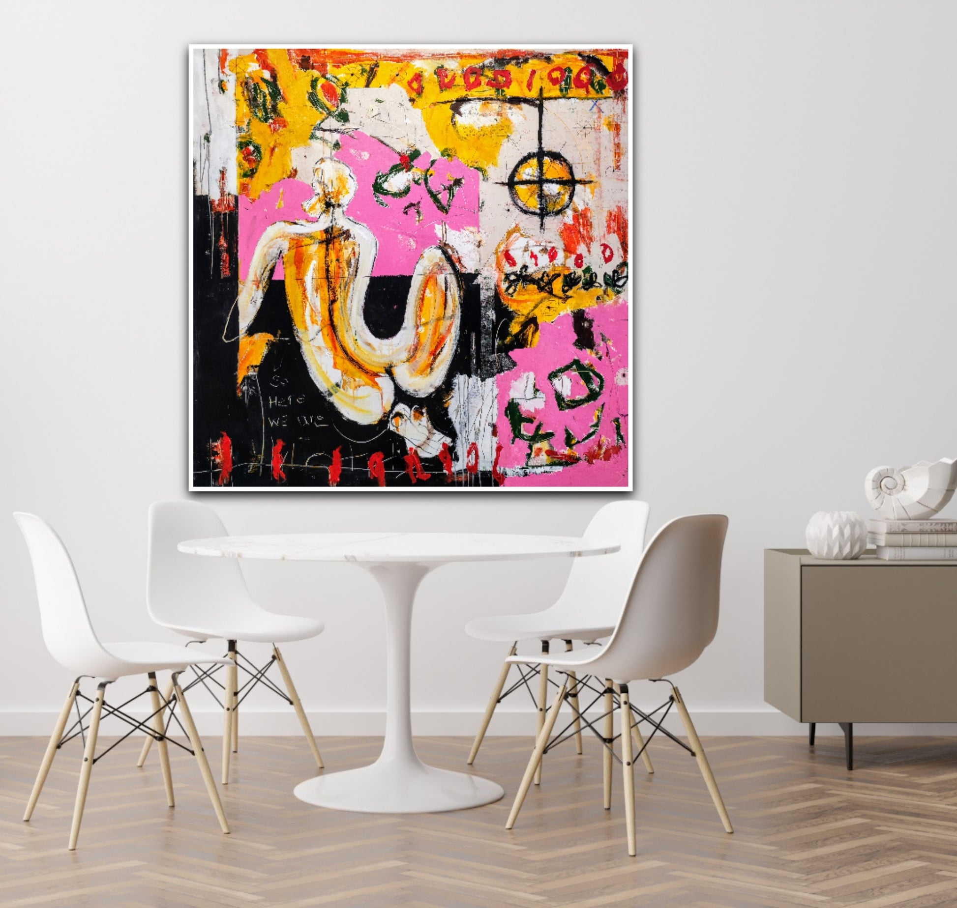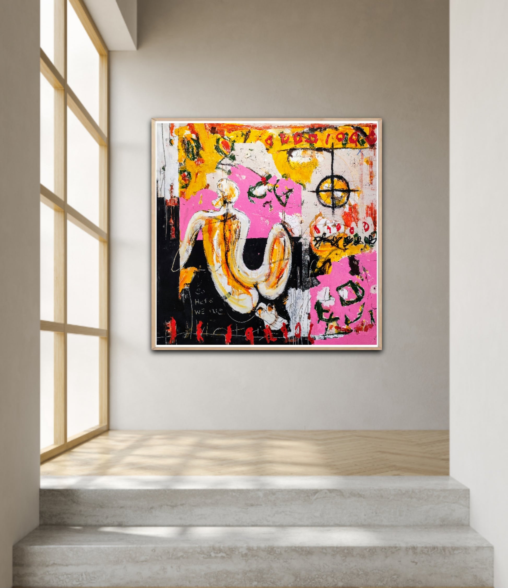 Técnica: acrílico, pigmentos, bolígrafo, carboncillo y lápiz.