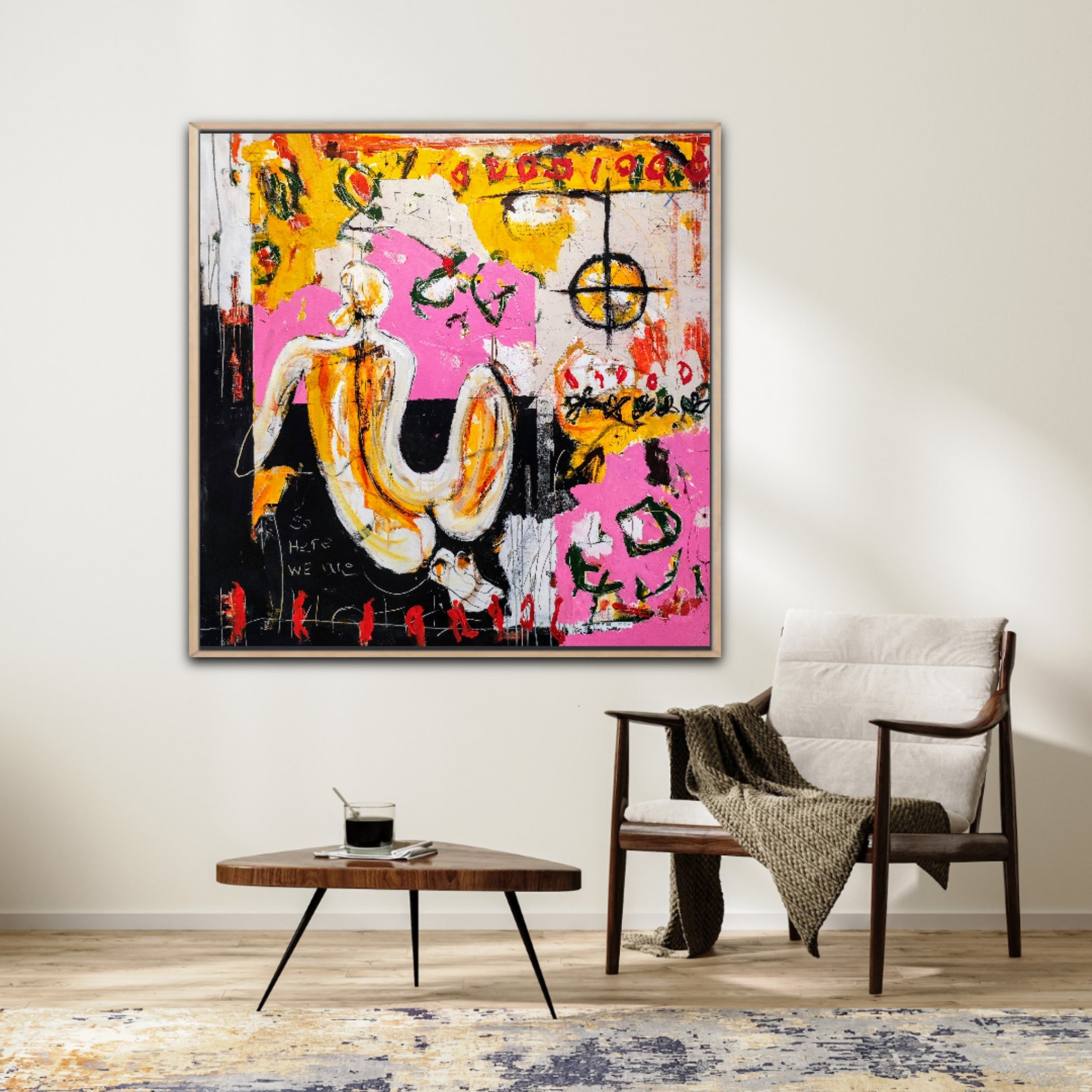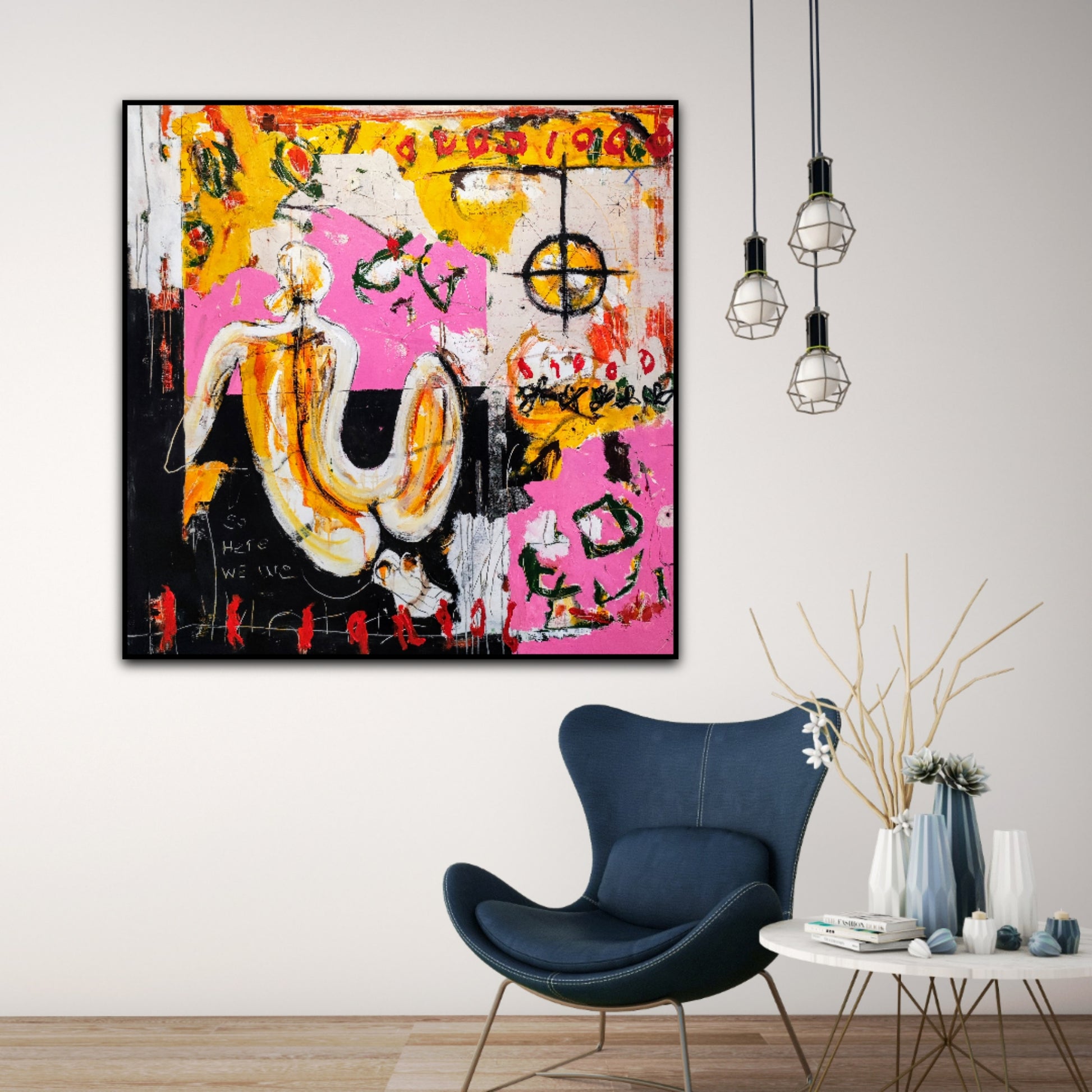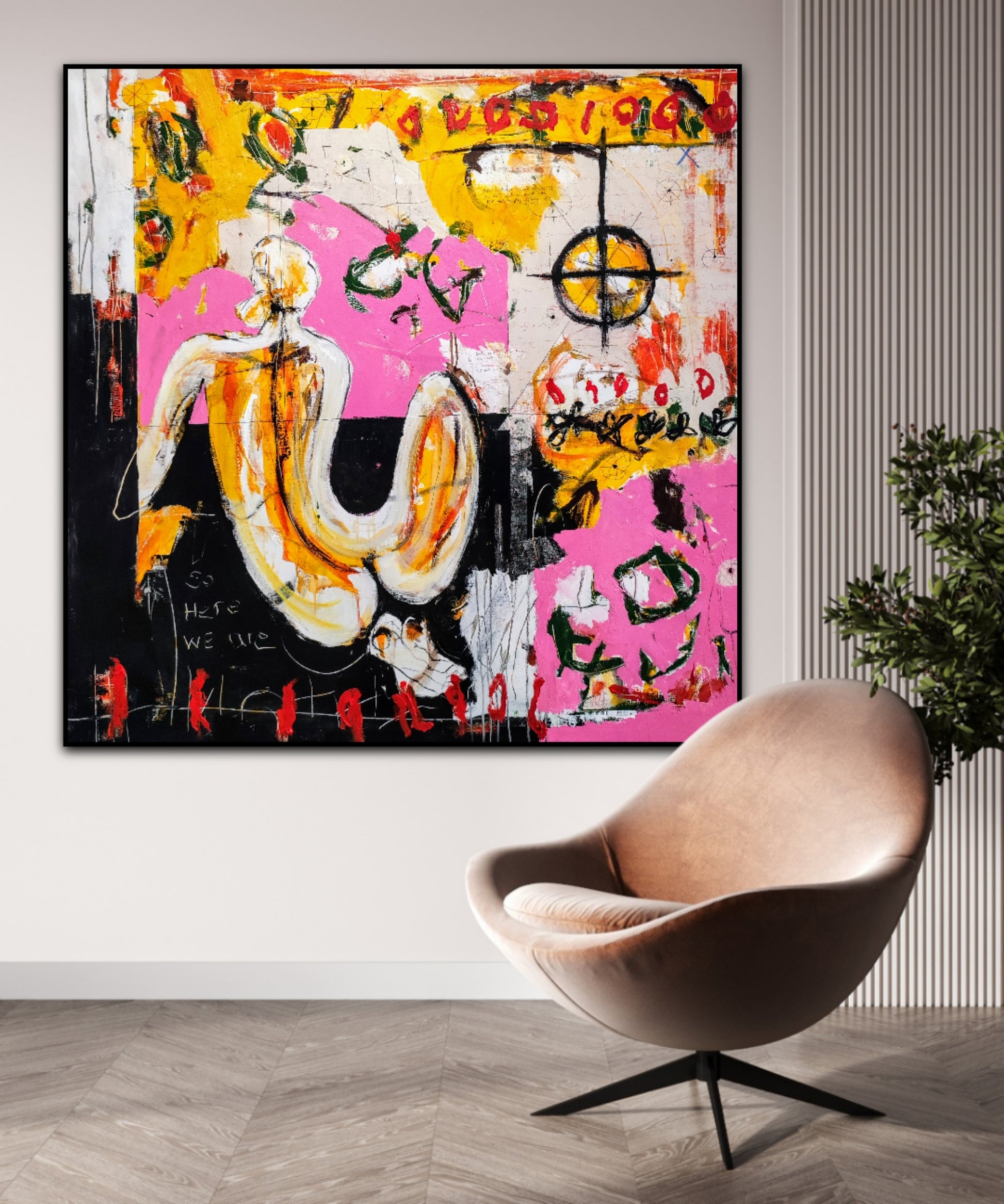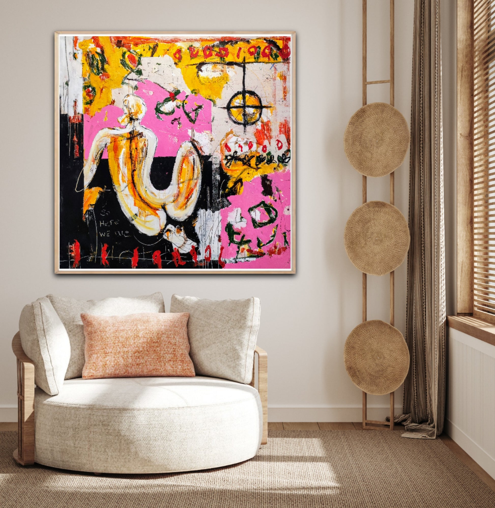 Técnica: acrílico, pigmentos, bolígrafo, carboncillo y lápiz.