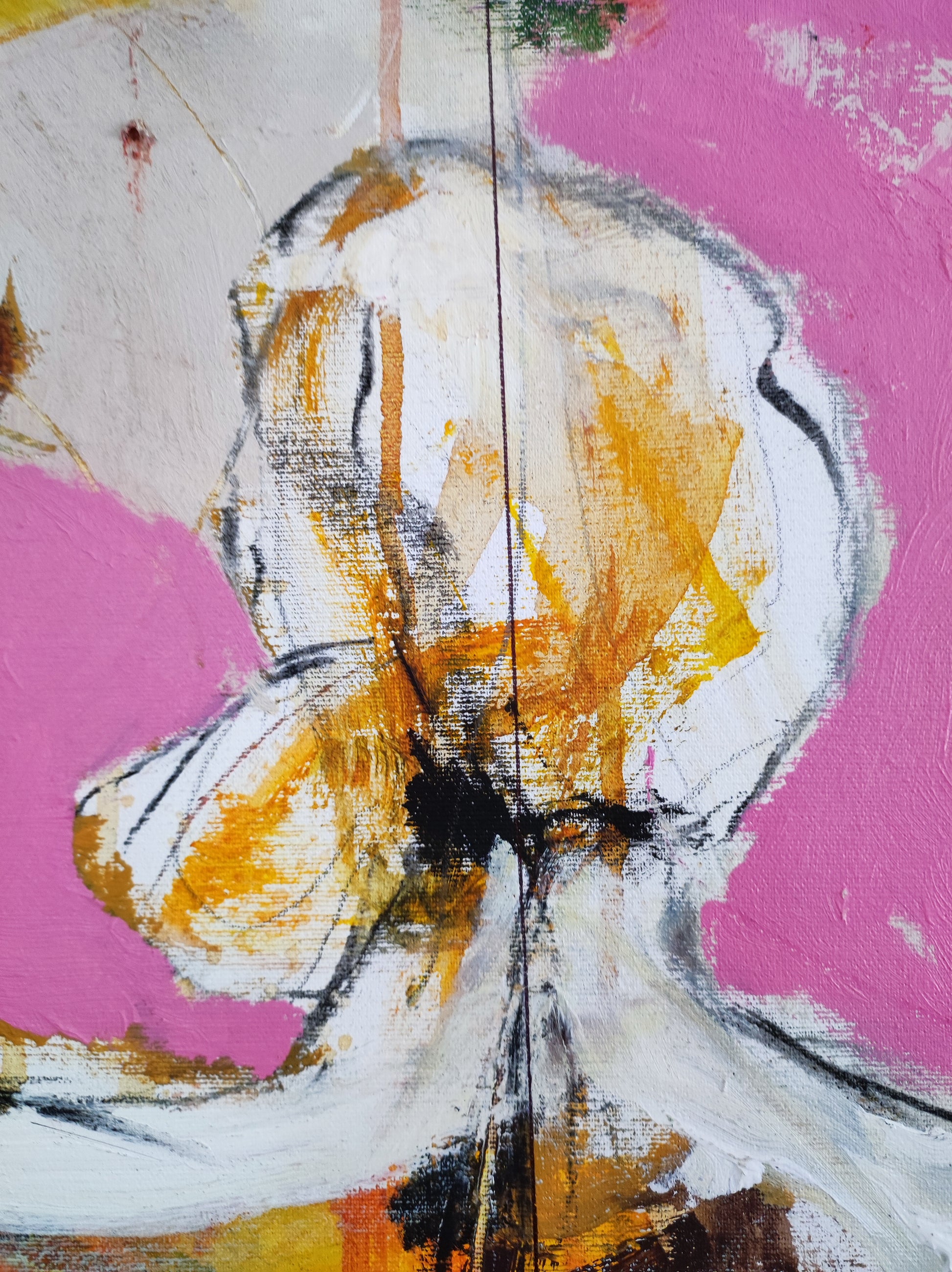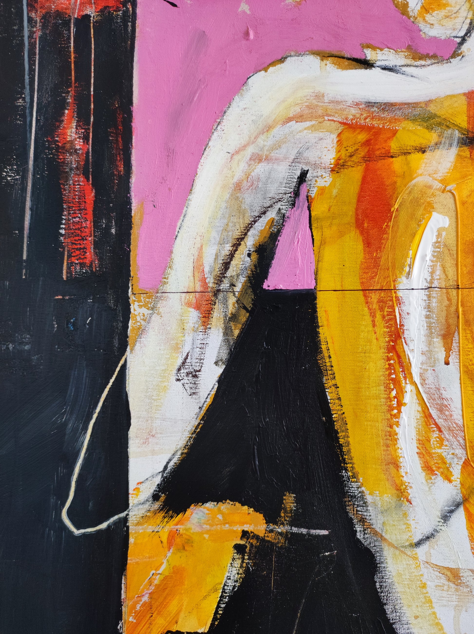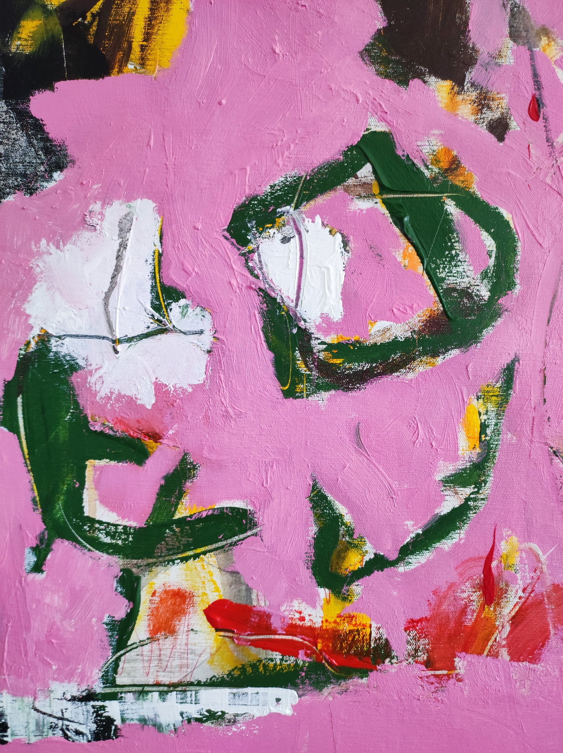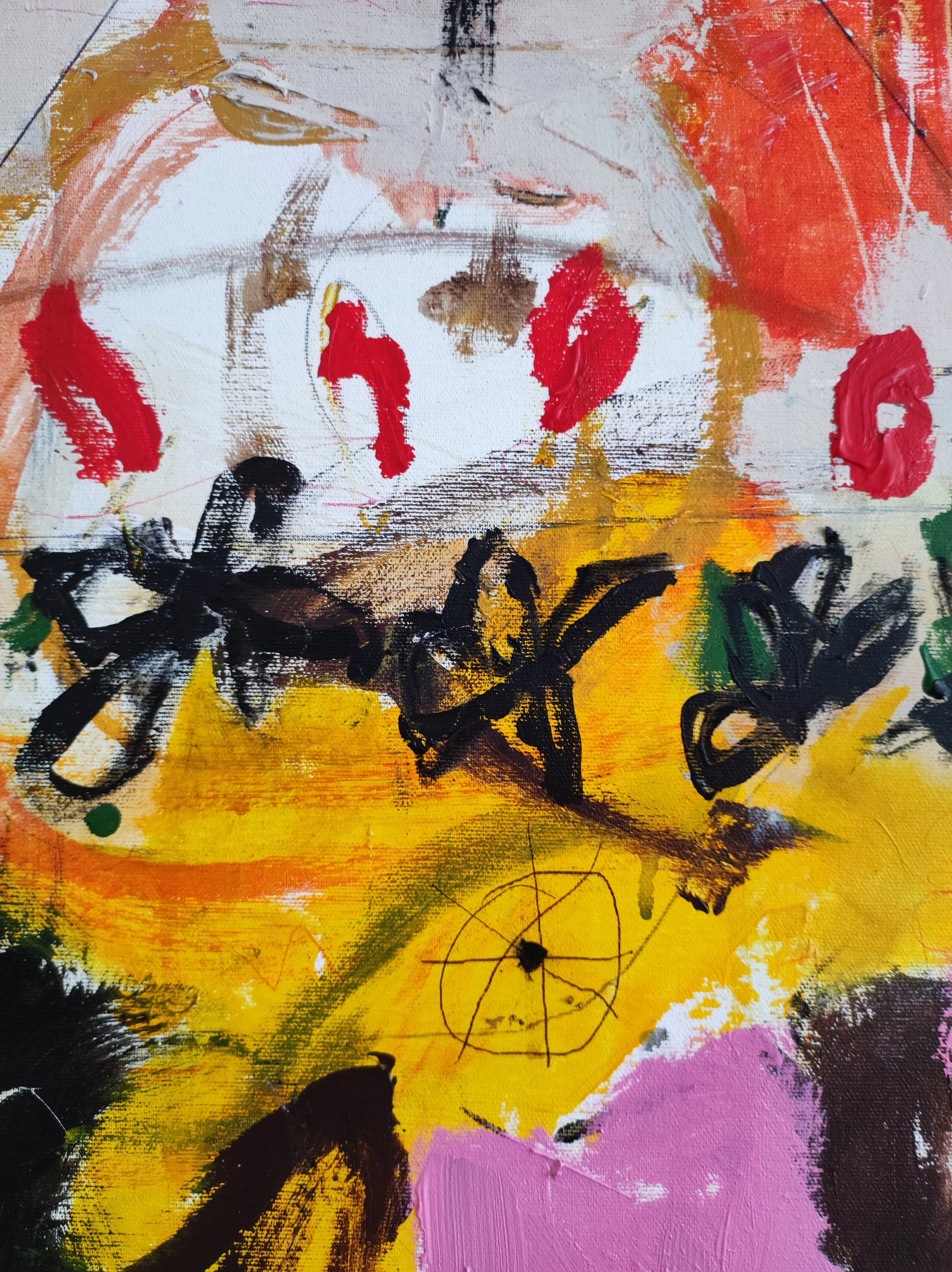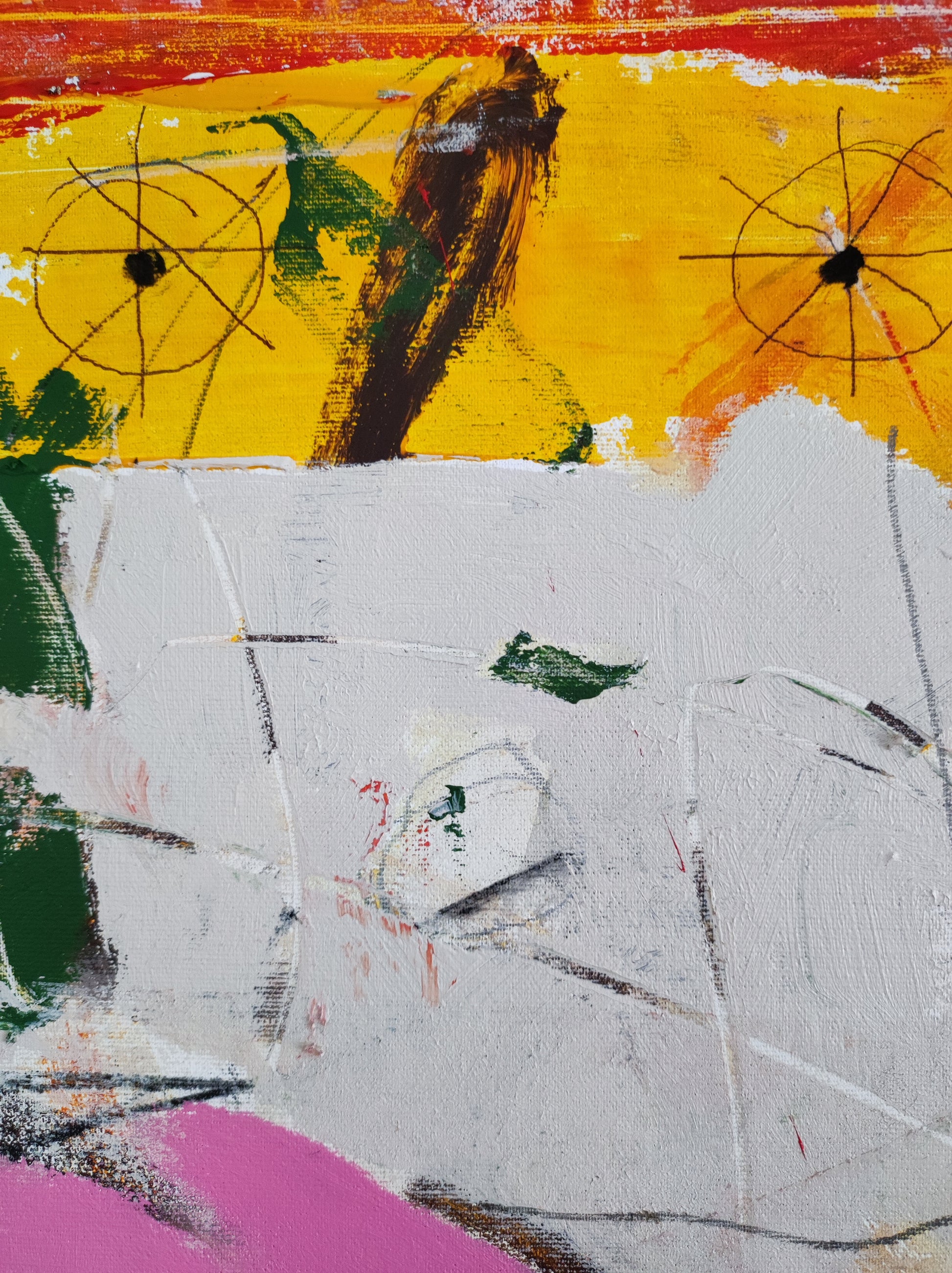 Pintura gestual, intuitiva, que deja que las cosas pasen y se apoya sobre lo que aparece. Aprovechando el accidente y aceptando las consecuencias.