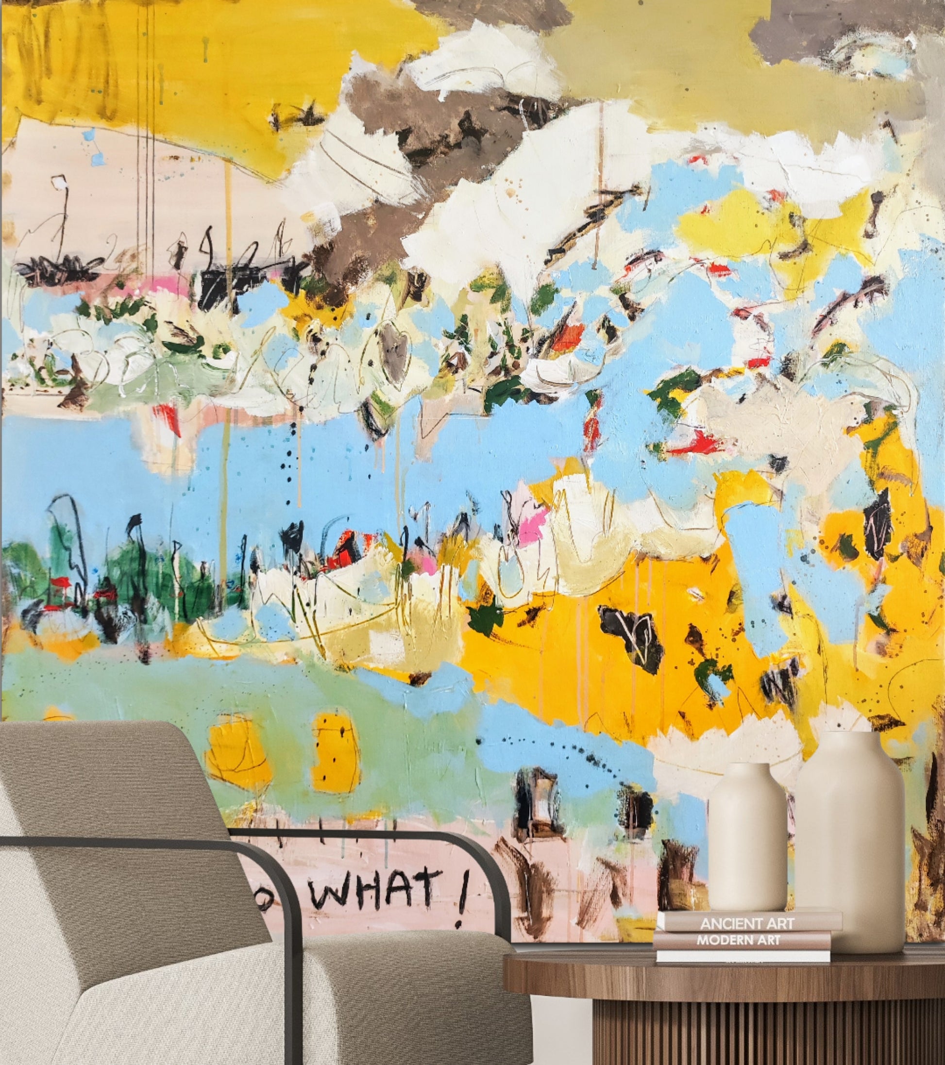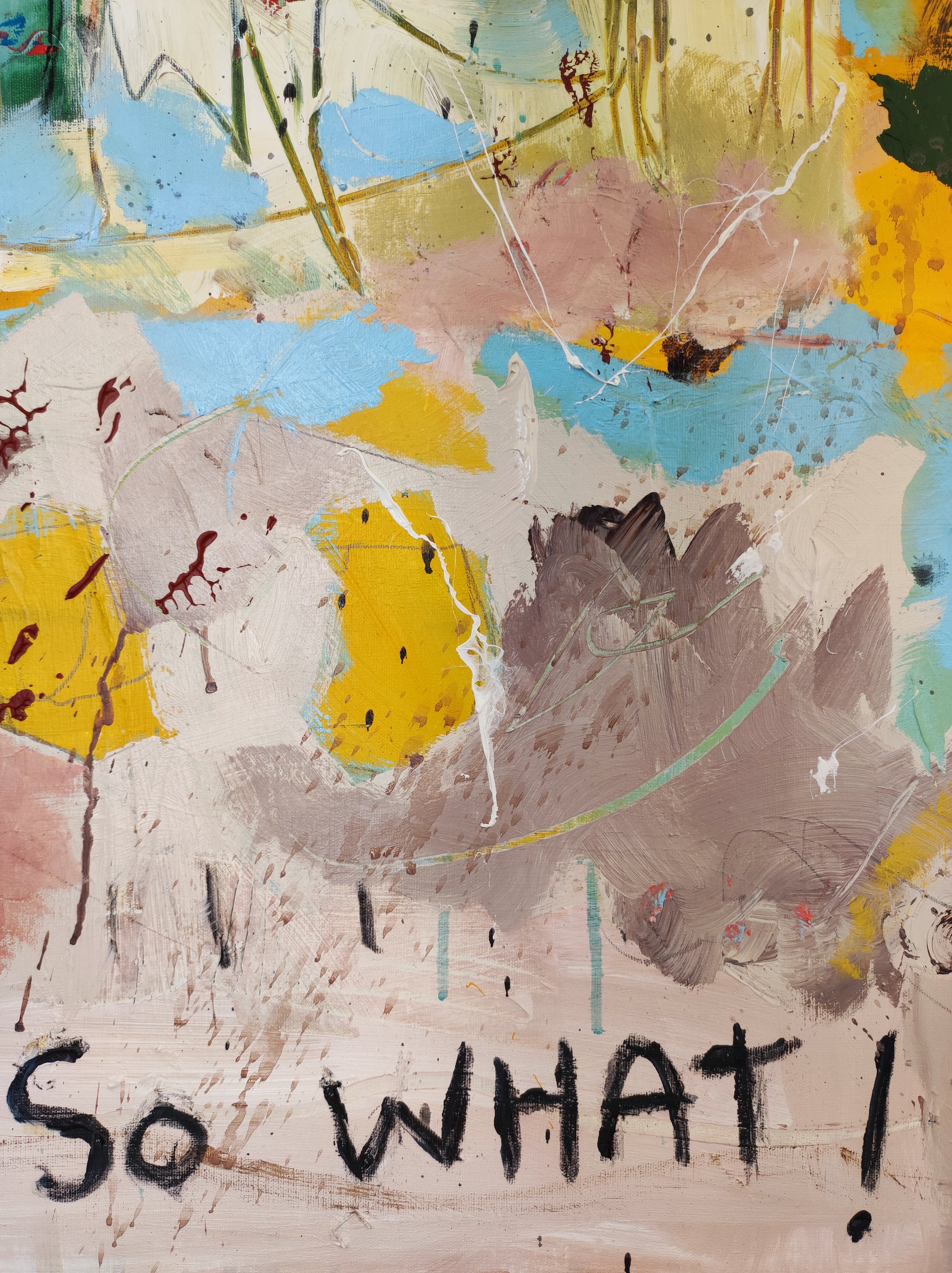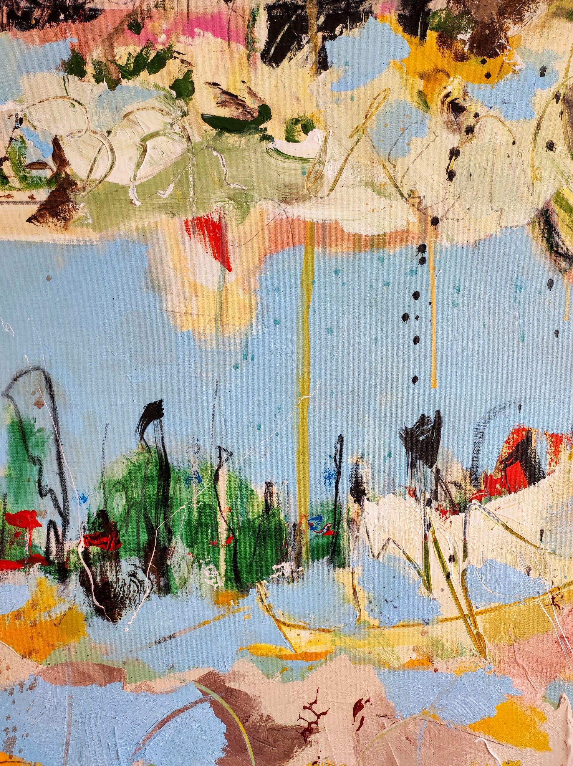 Pintura gestual, intuitiva, que deja que las cosas pasen y se apoya sobre lo que aparece. Aprovechando el accidente y aceptando las consecuencias.