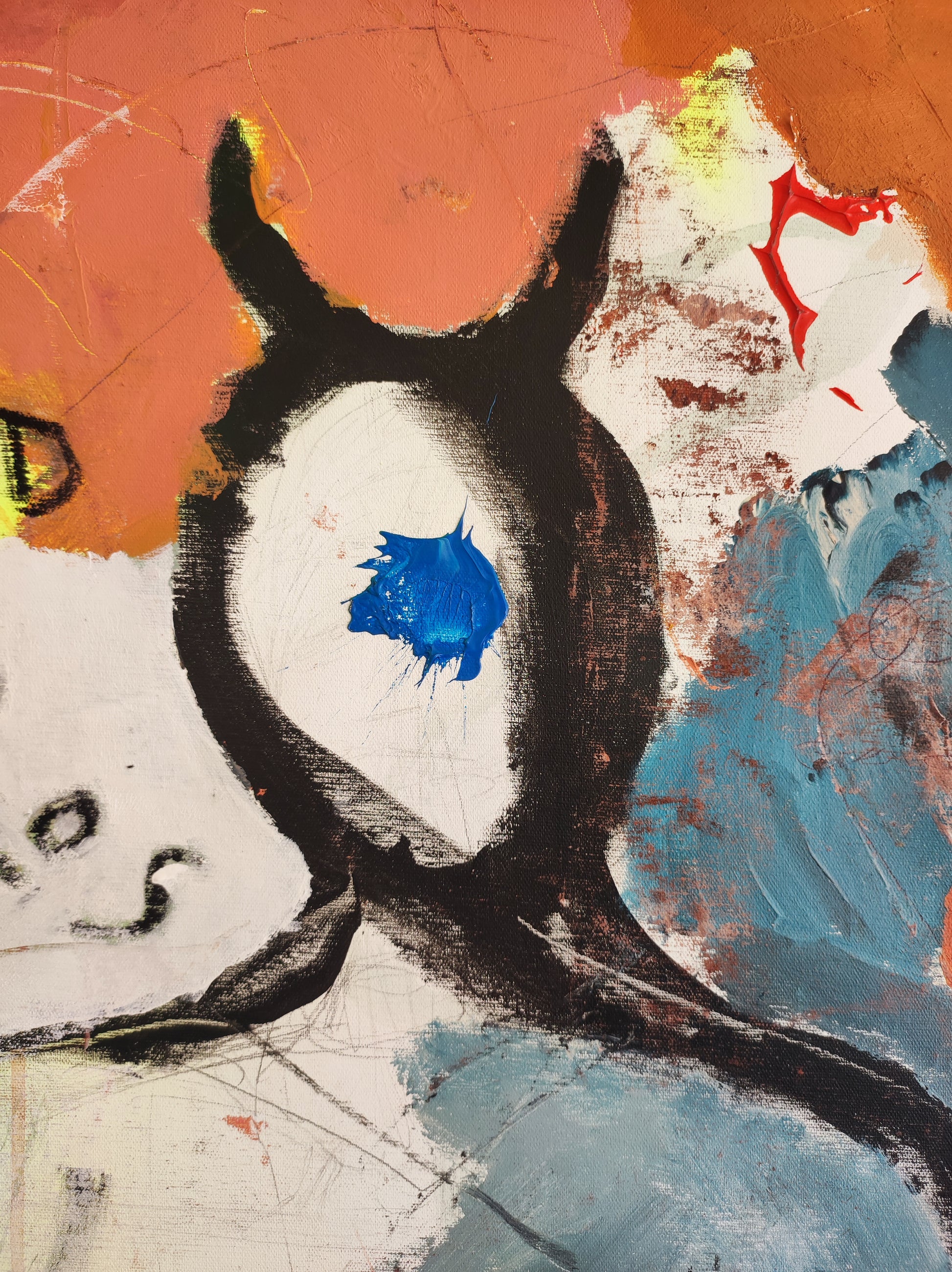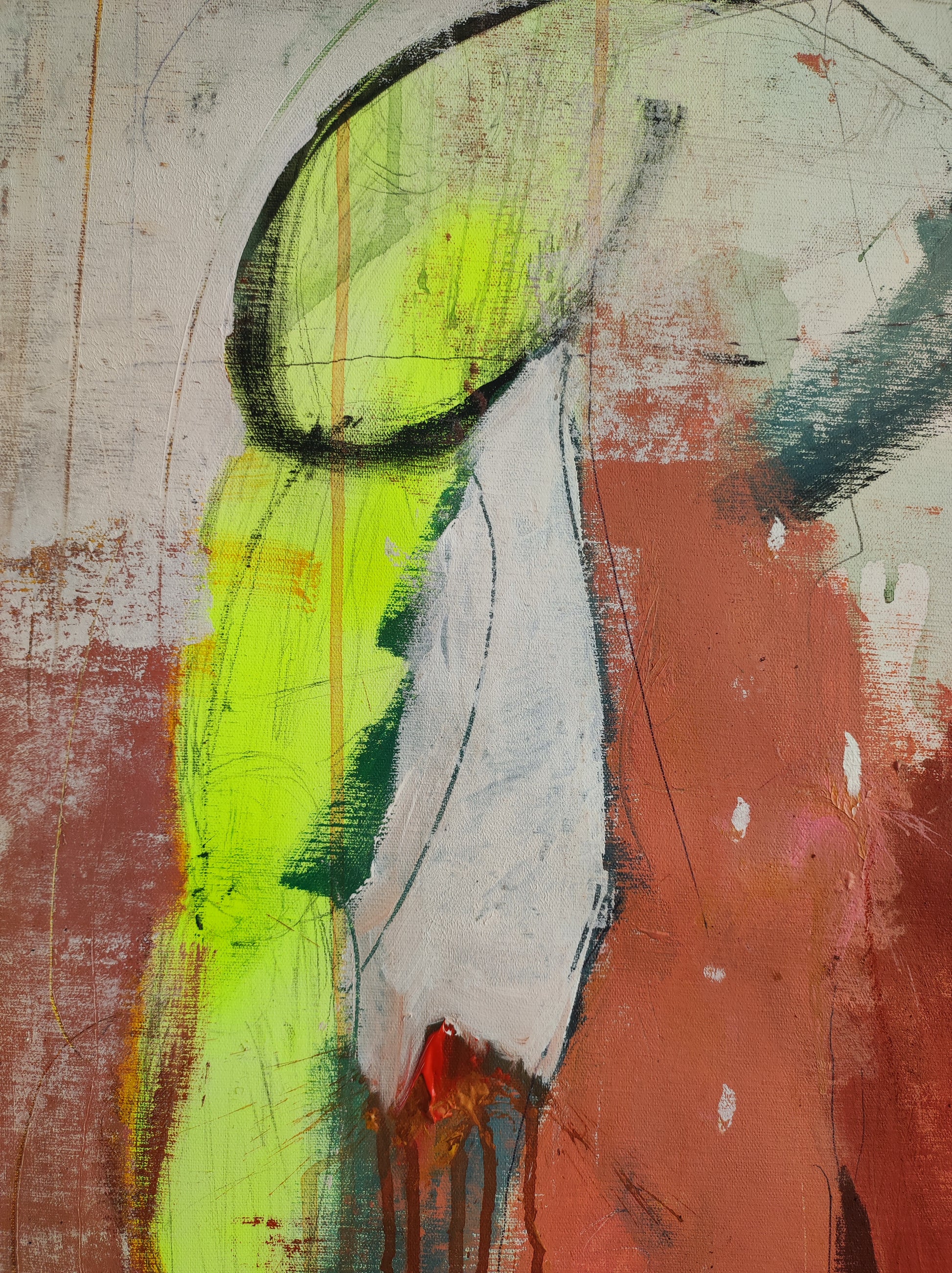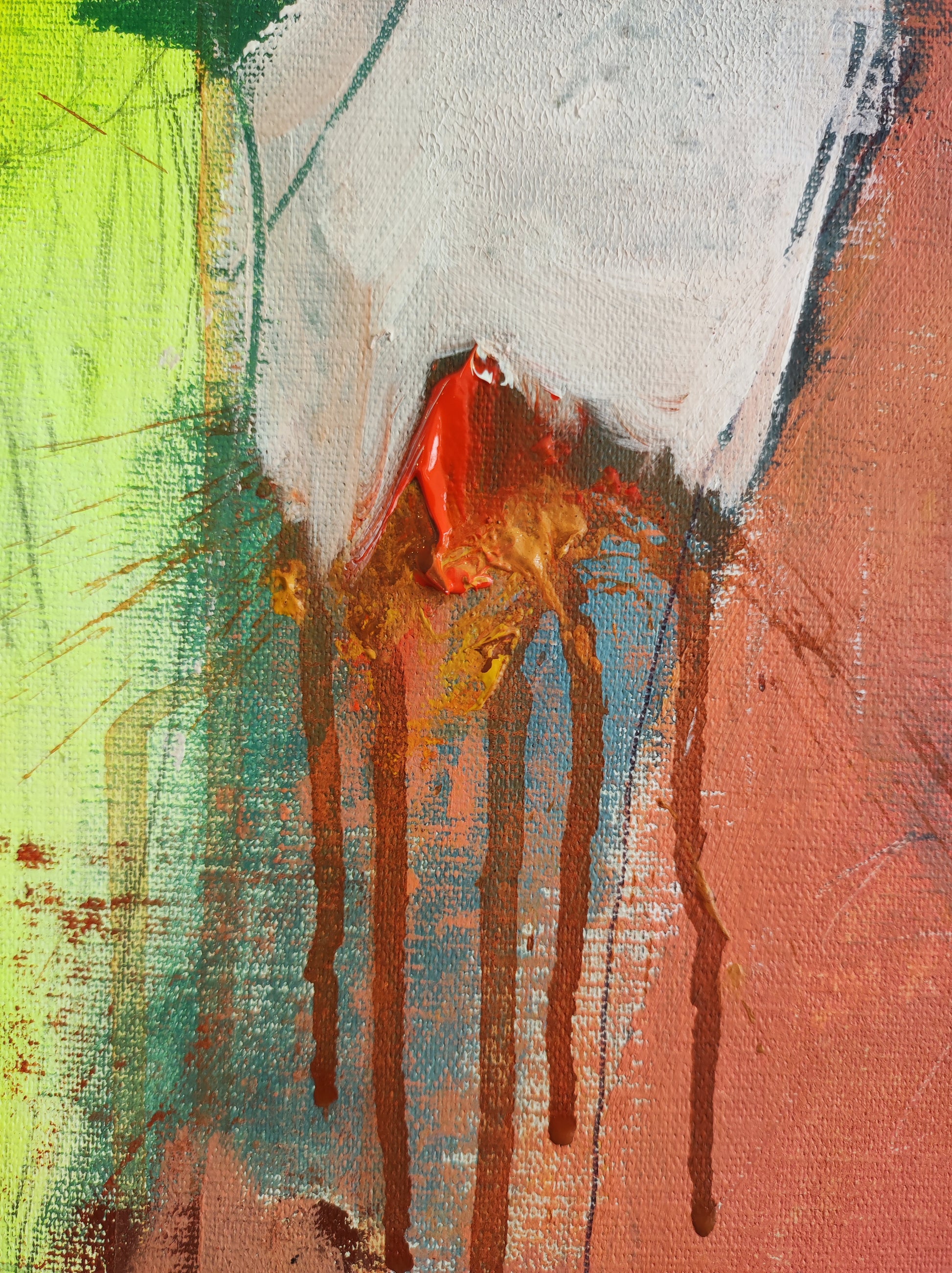 Pintura gestual, intuitiva, que deja que las cosas pasen y se apoya sobre lo que aparece. Aprovechando el accidente y aceptando las consecuencias.