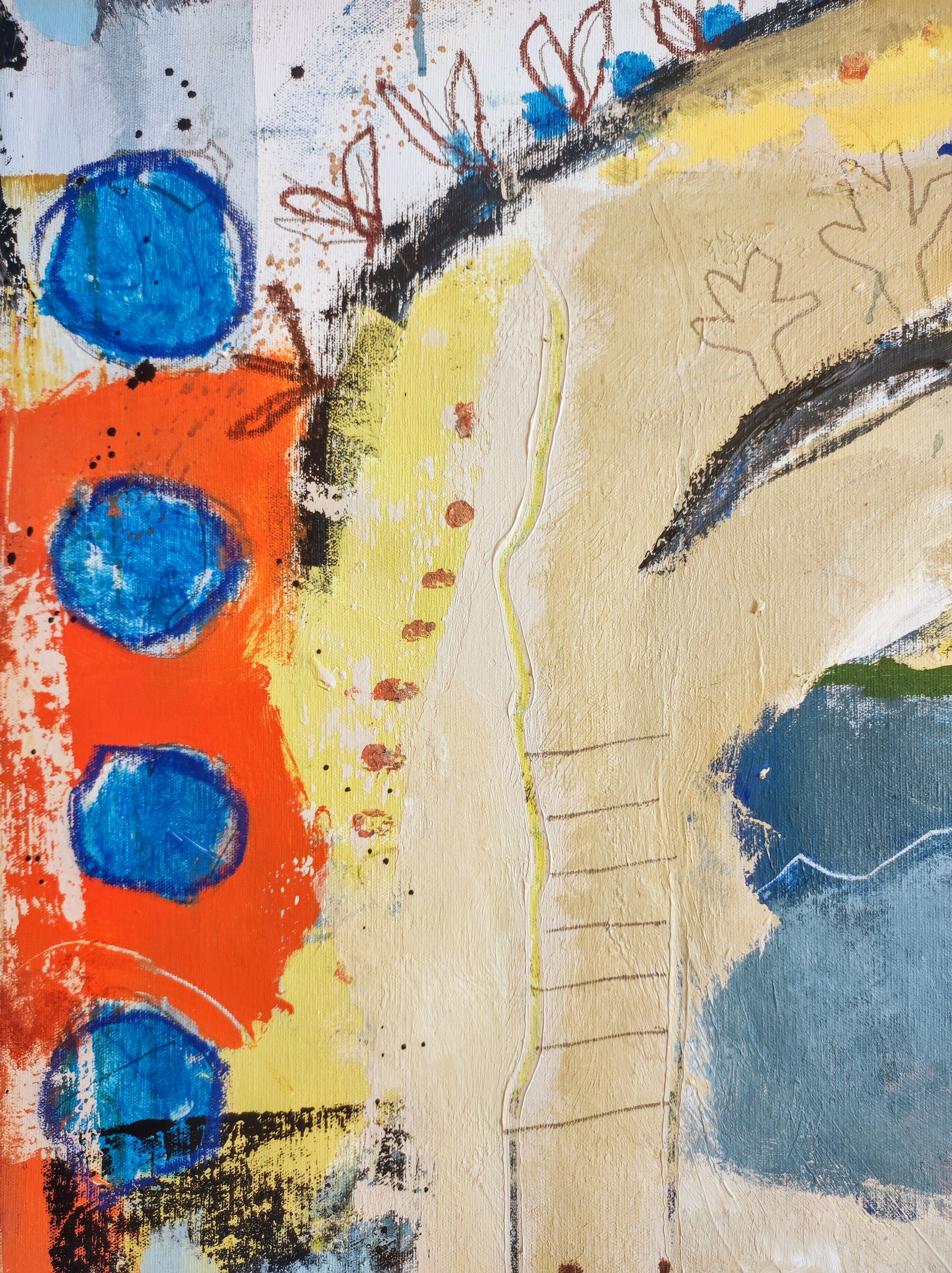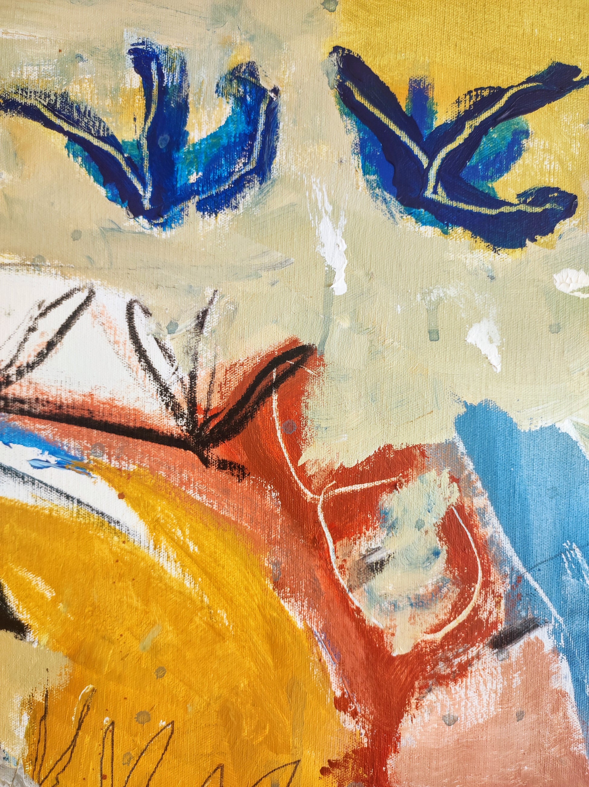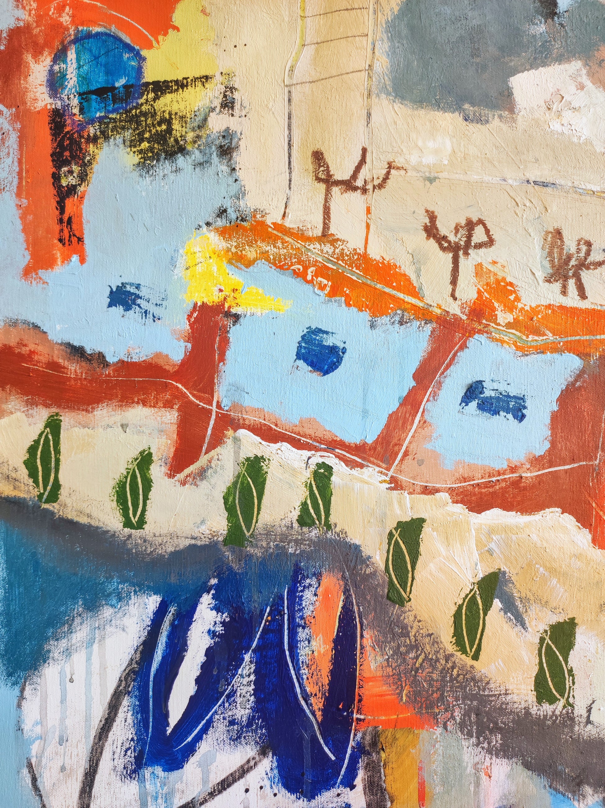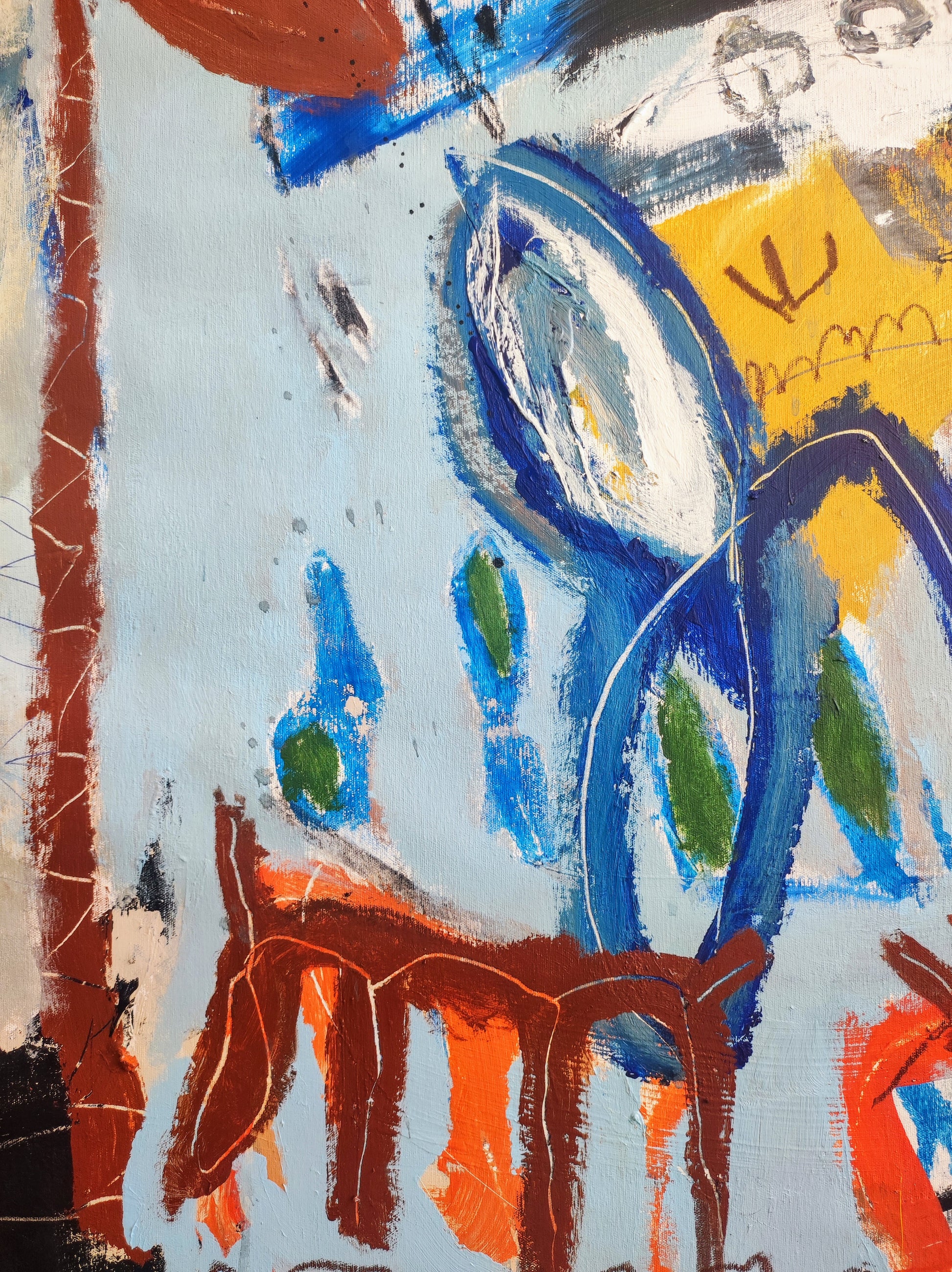 Formas que aparecen sin pensar, Naturaleza viva y muerta. Manchas, color, formas y líneas construyen escenas fuera de lugar, ocupando el espacio que se han ganado dentro de la extraña organización que se construye durante el proceso creativo. De alguna manera todo estaba en el lienzo y había que extraerlo, combinarlo y organizarlo.