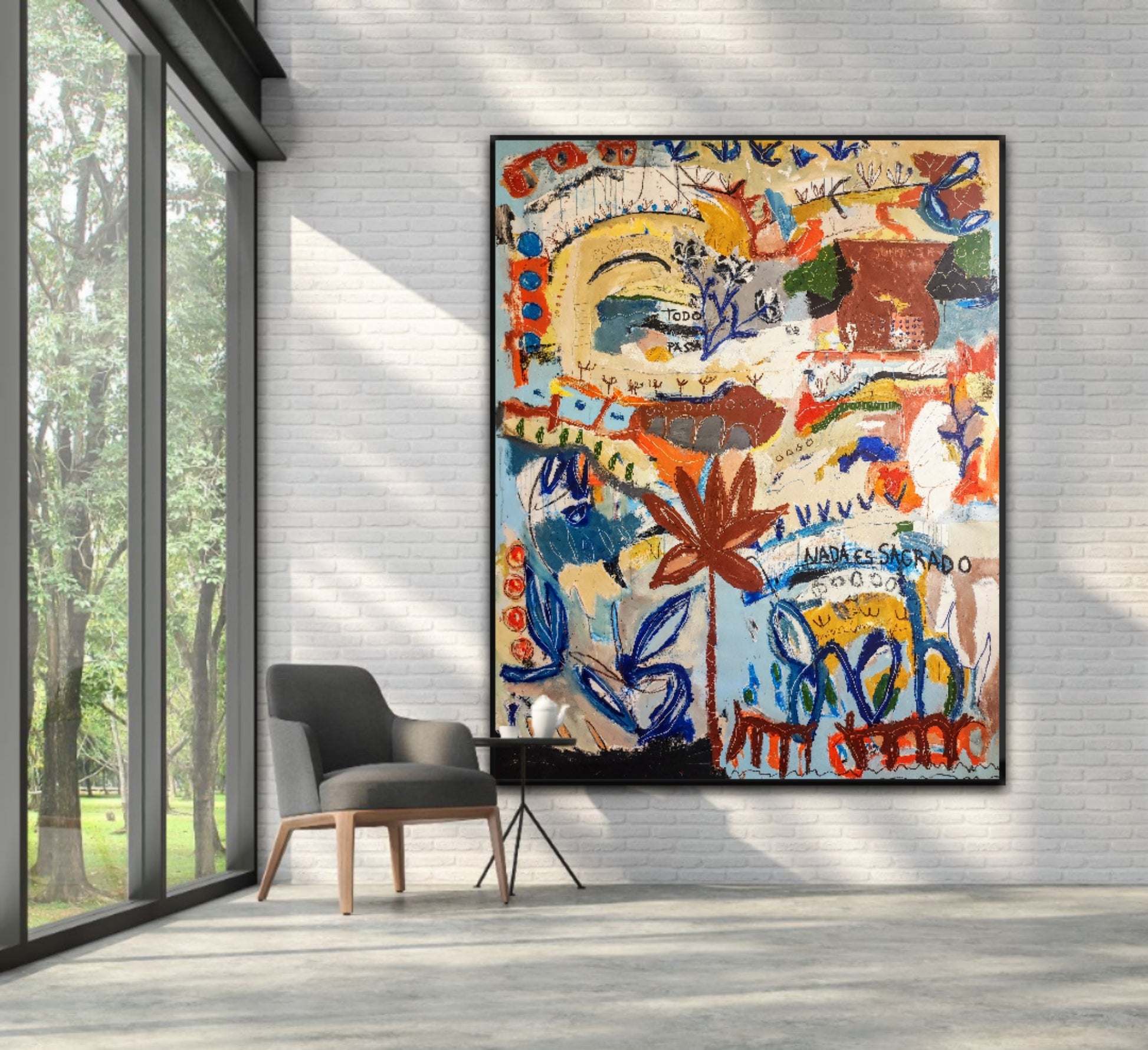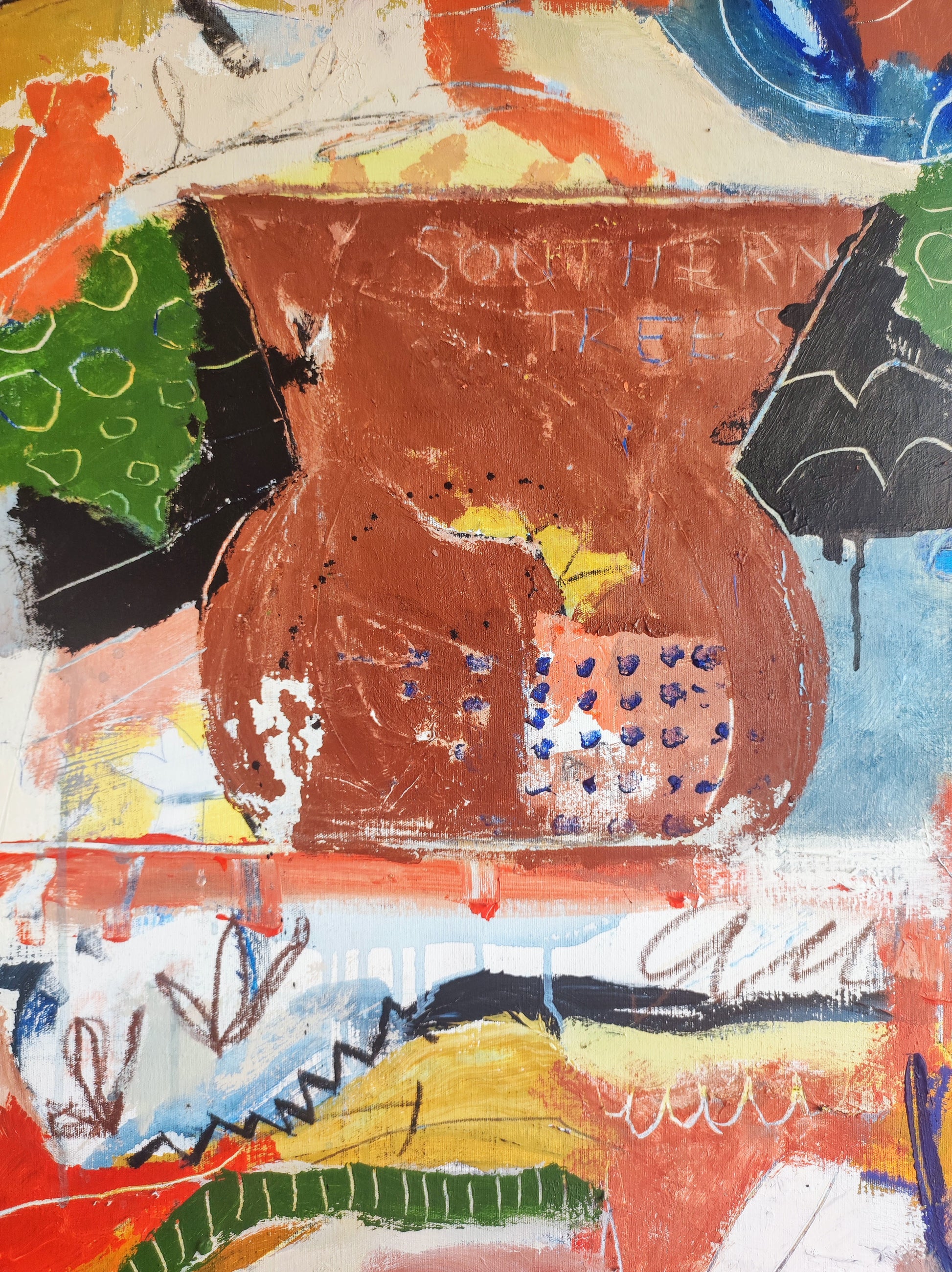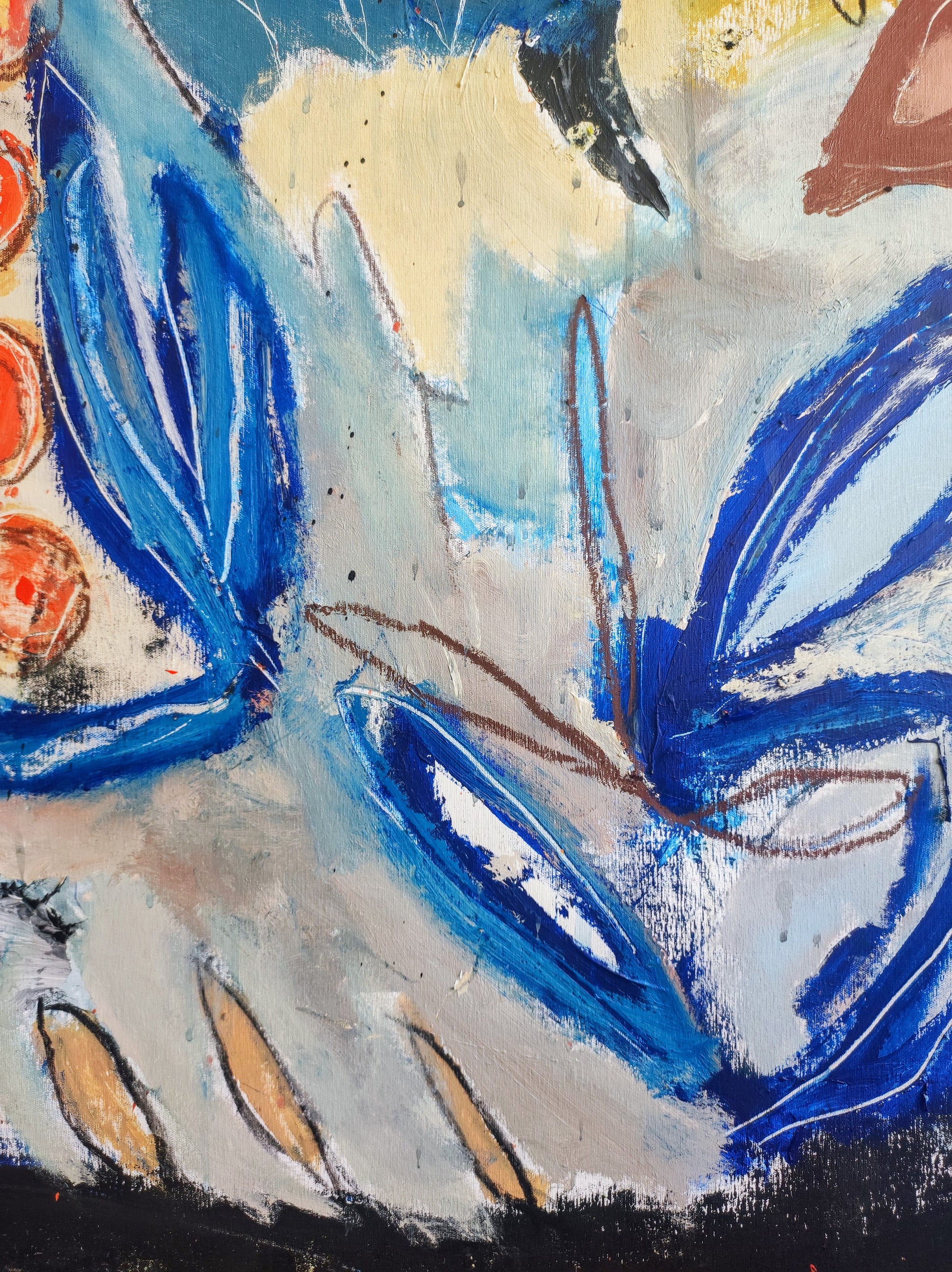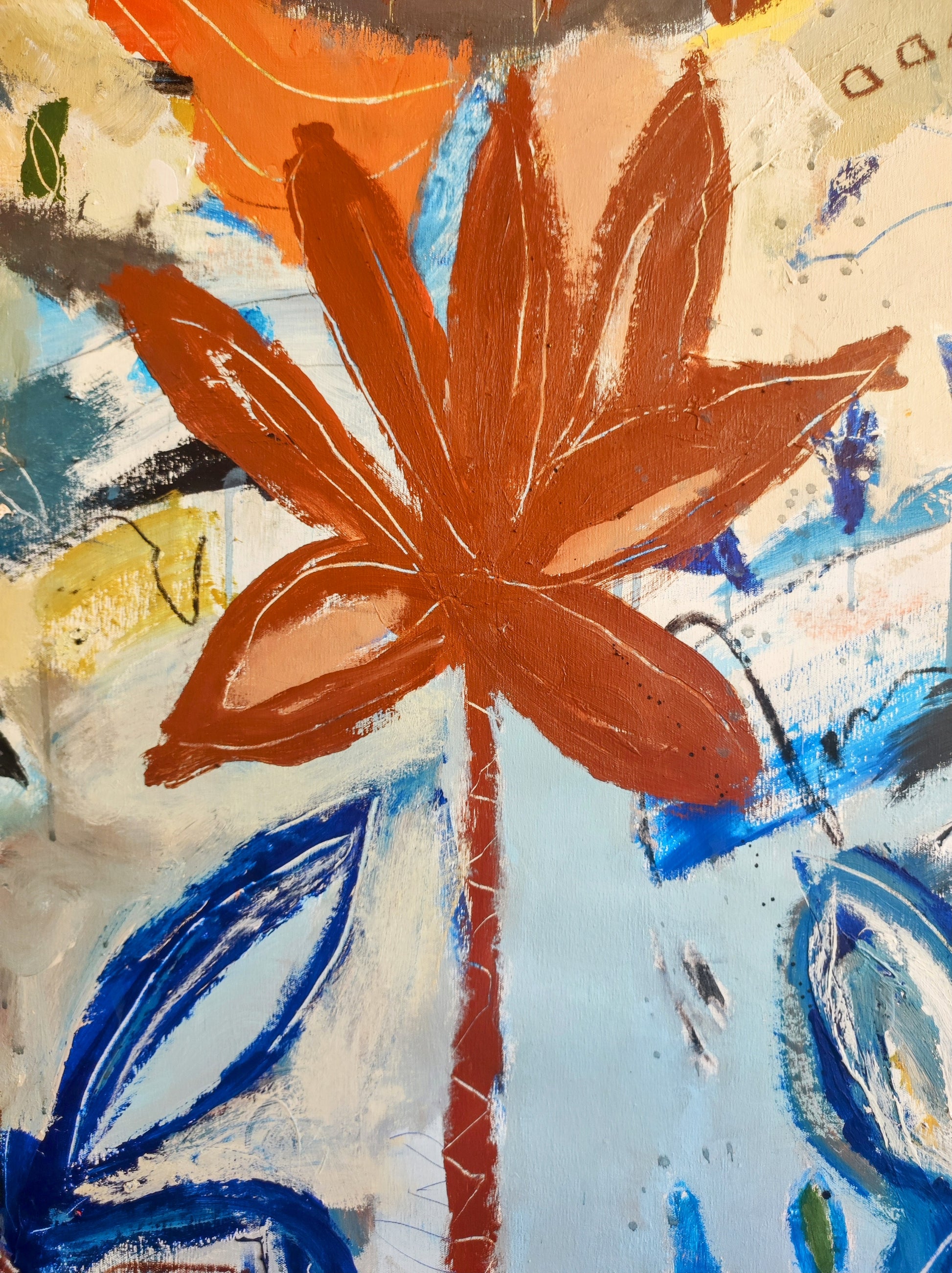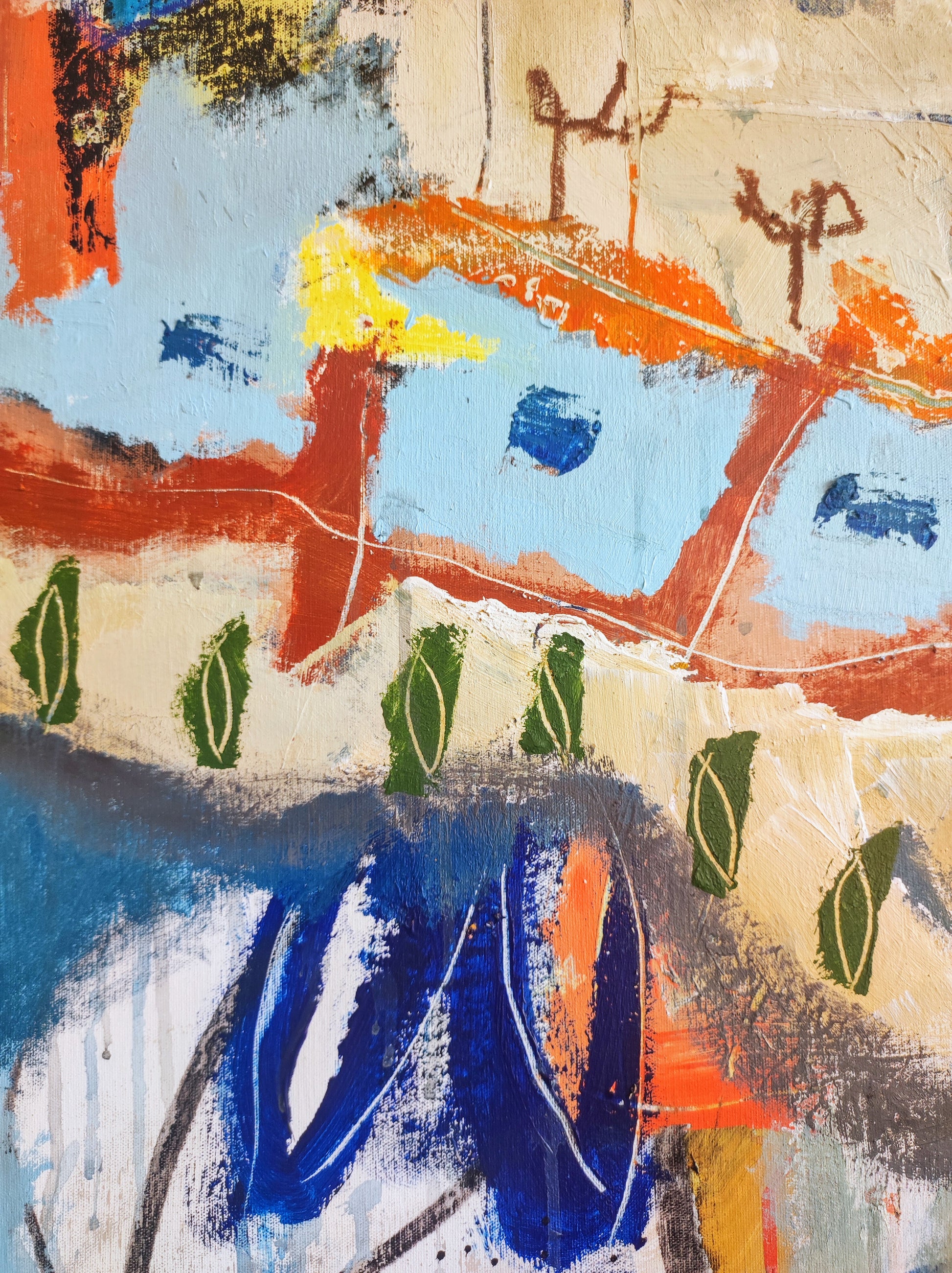 Formas que aparecen sin pensar, Naturaleza viva y muerta. Manchas, color, formas y líneas construyen escenas fuera de lugar, ocupando el espacio que se han ganado dentro de la extraña organización que se construye durante el proceso creativo. De alguna manera todo estaba en el lienzo y había que extraerlo, combinarlo y organizarlo.