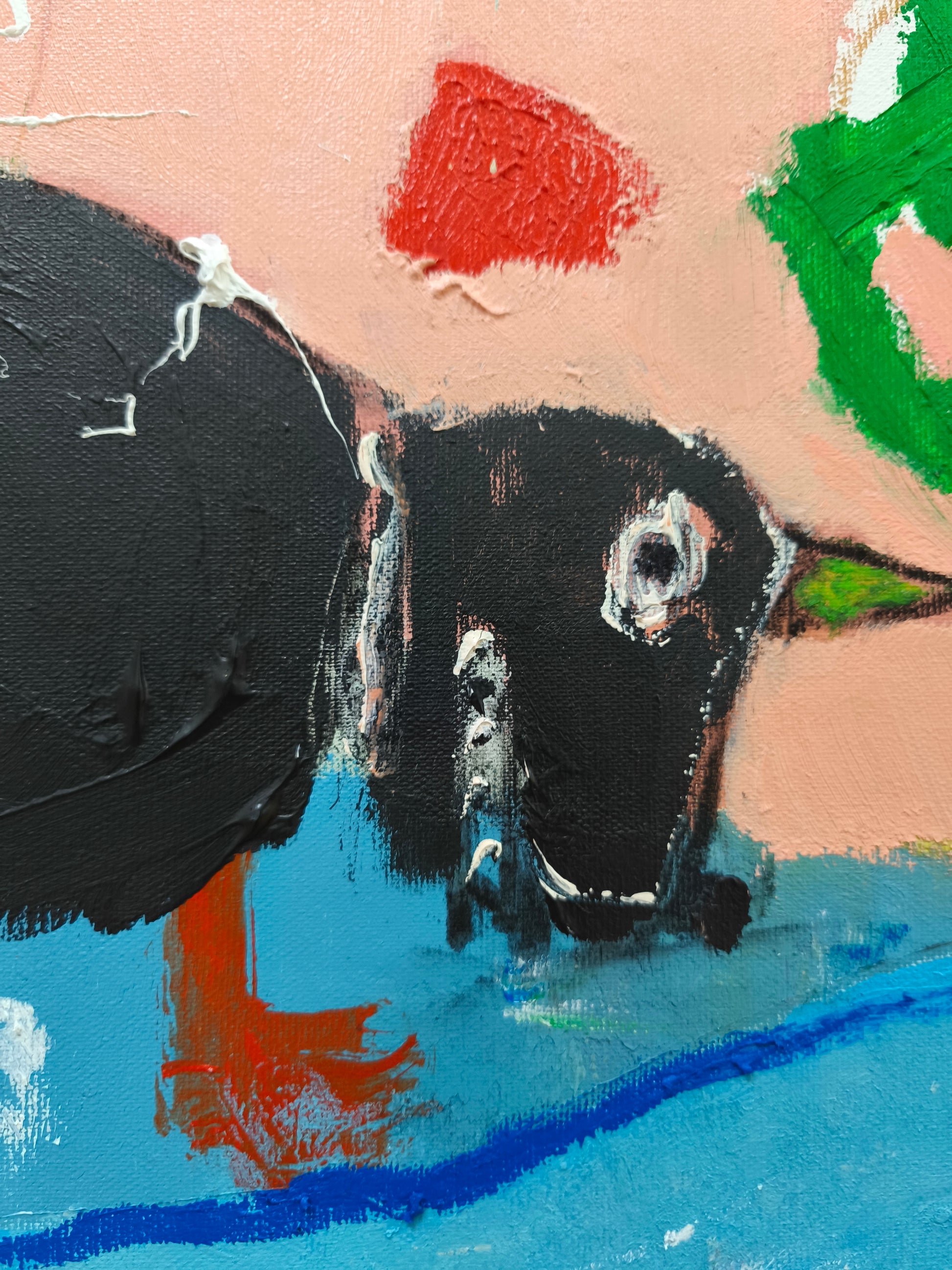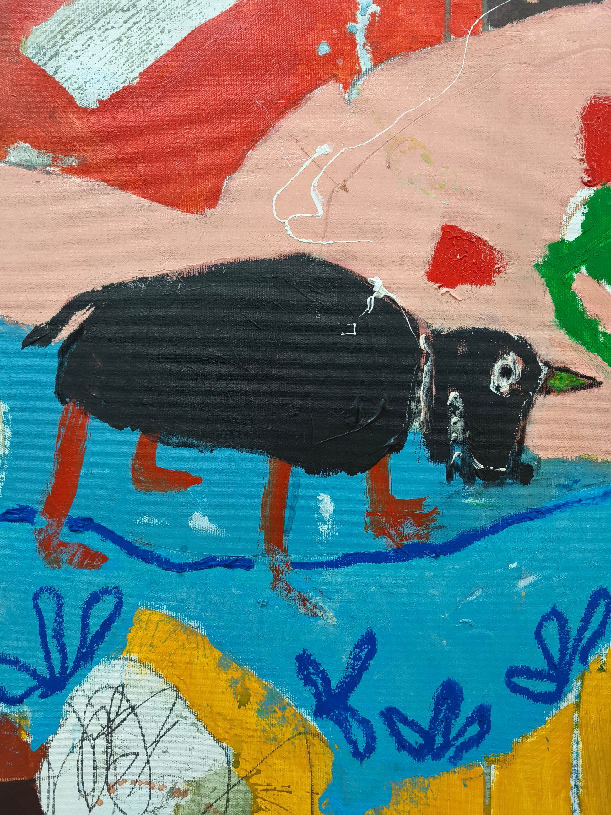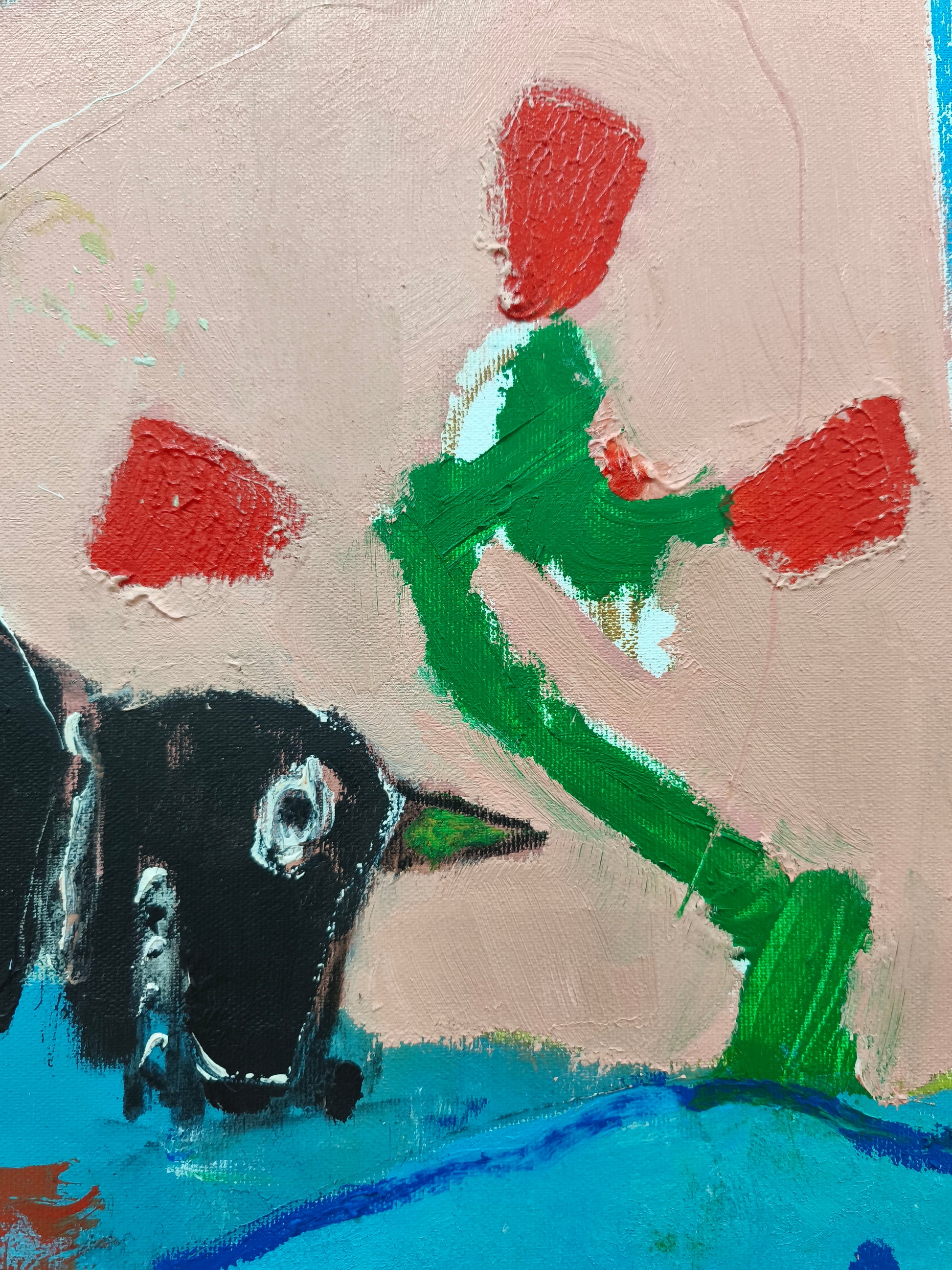 Pintura gestual, intuitiva, que deja que las cosas pasen. Aprovechando el accidente y aceptando las consecuencias.
