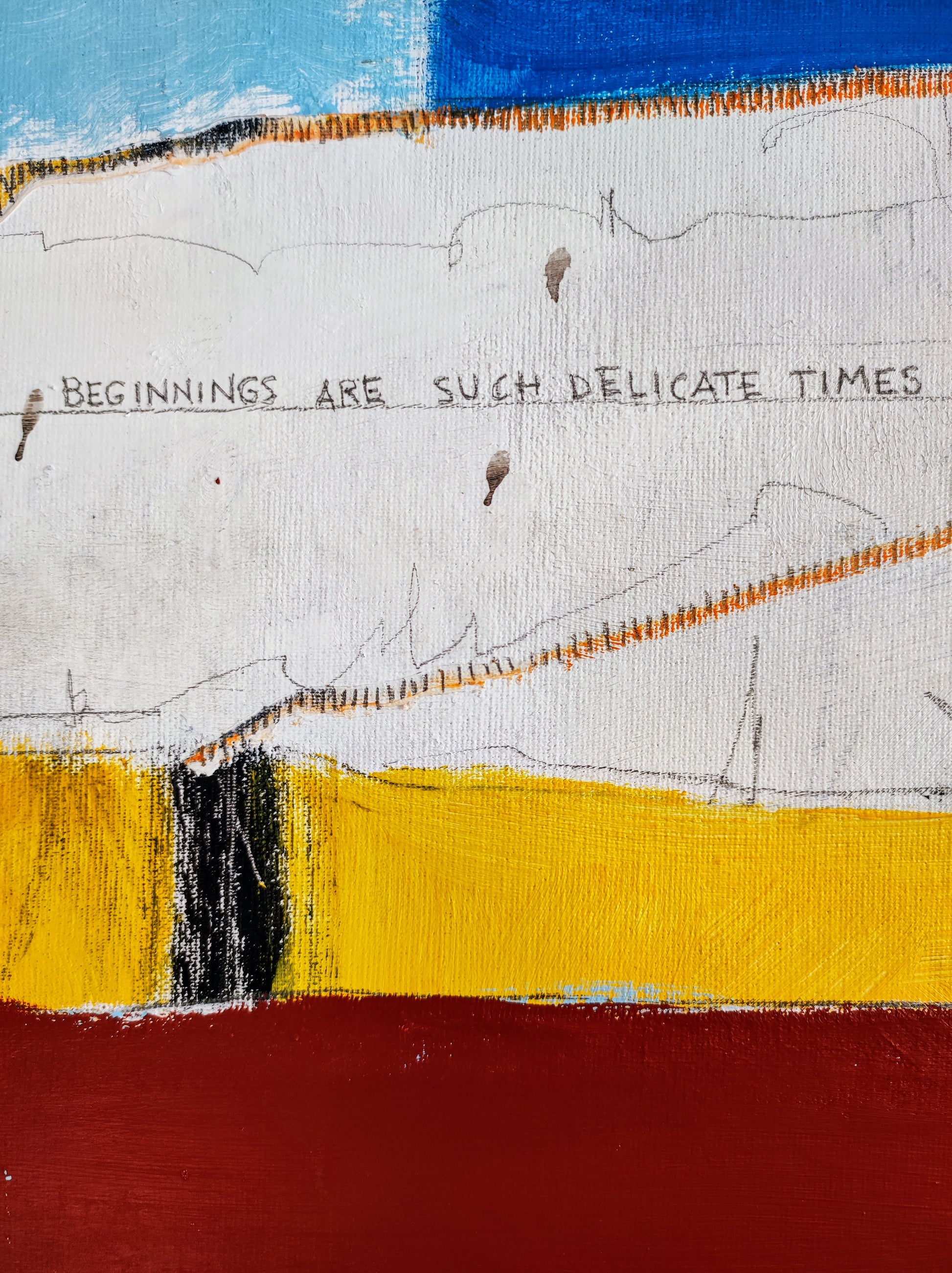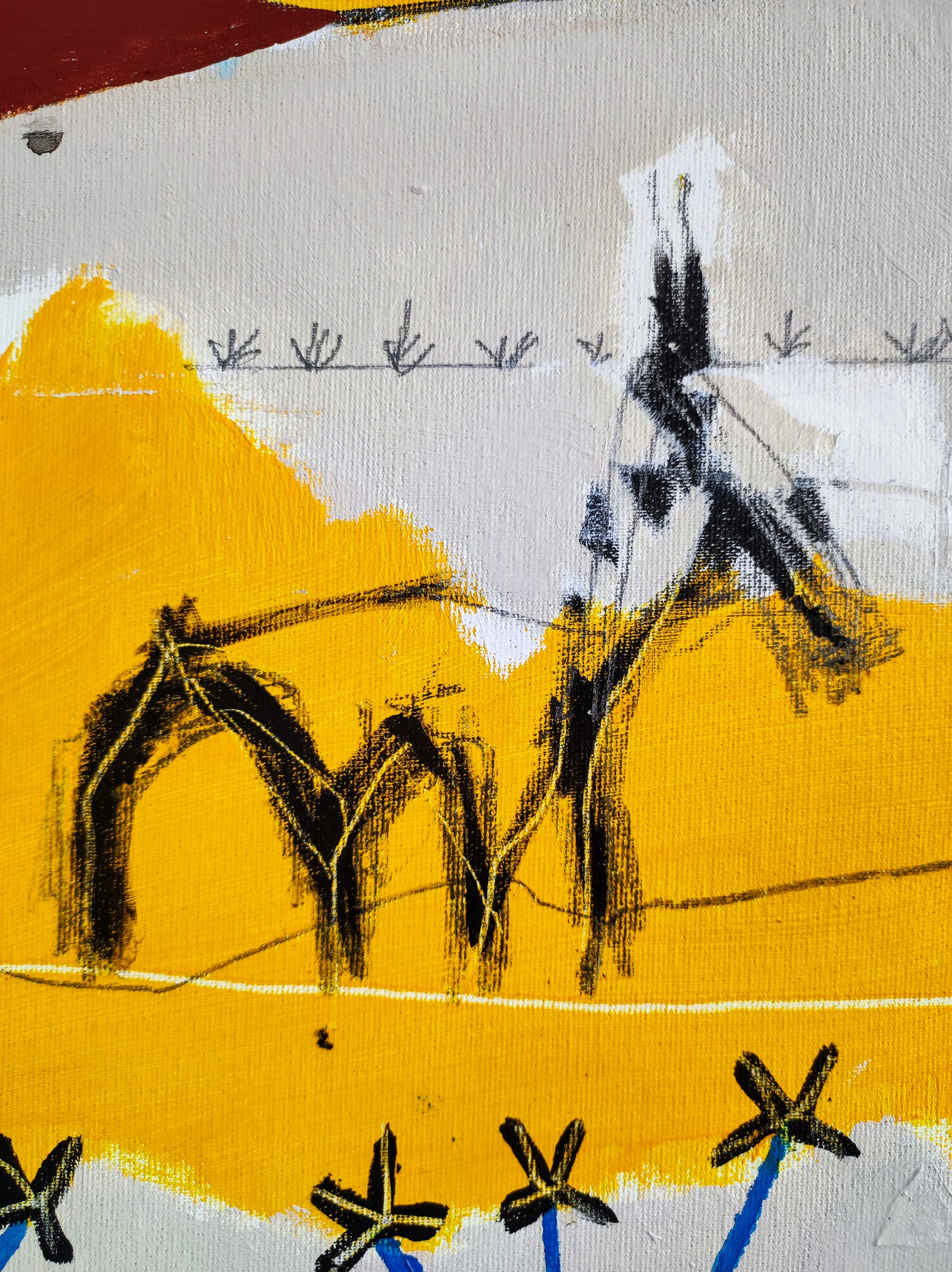 Pintura gestual, intuitiva, que deja que las cosas pasen y se apoya sobre lo que aparece. Aprovechando el accidente y aceptando las consecuencias.