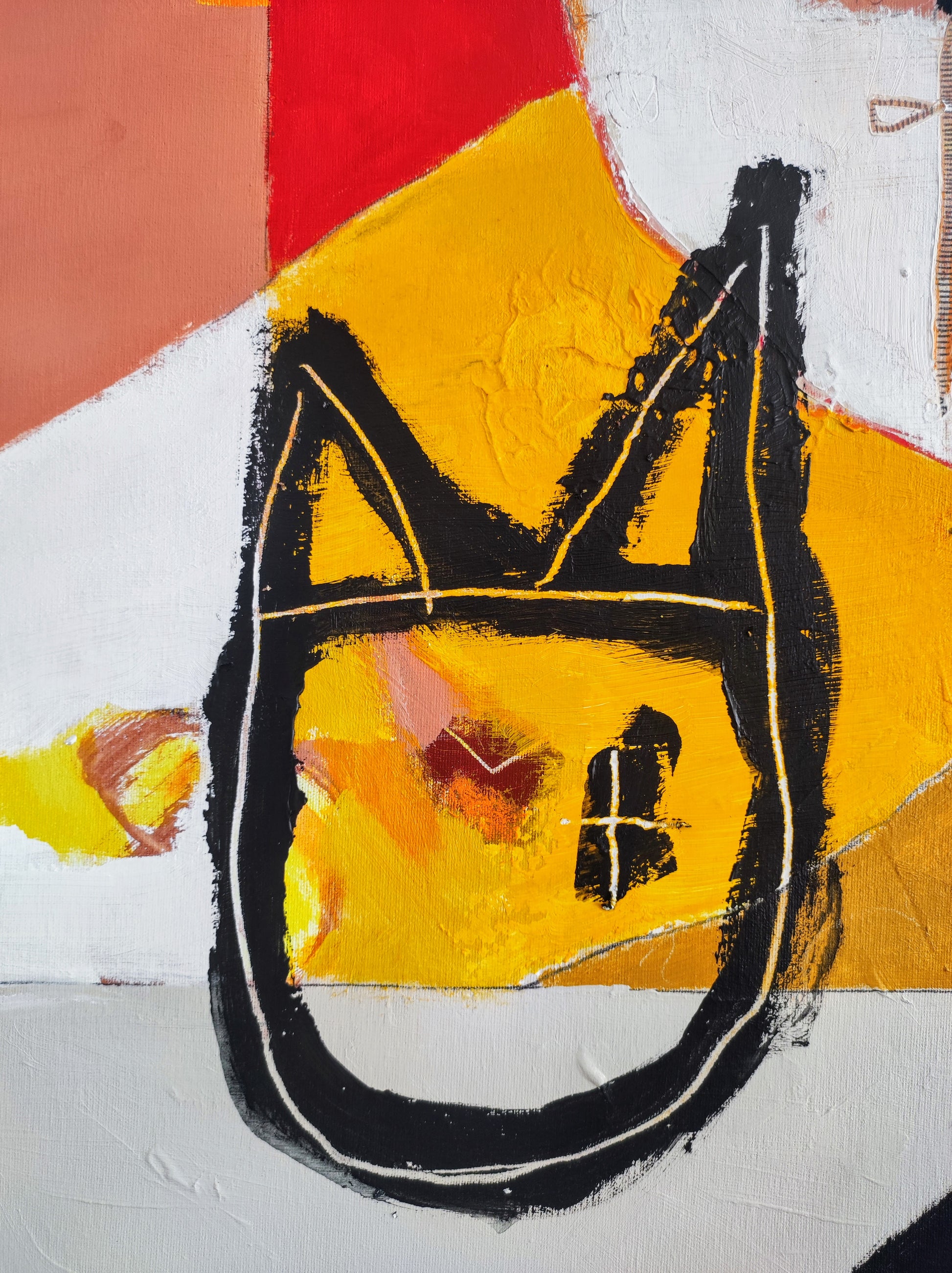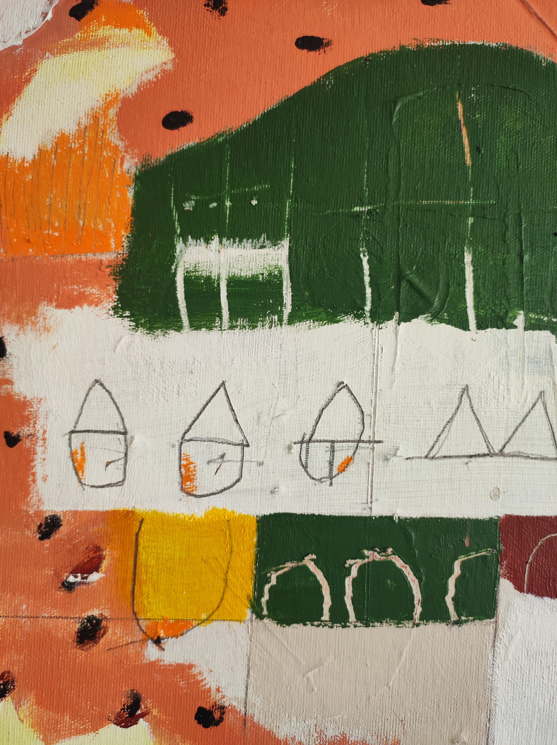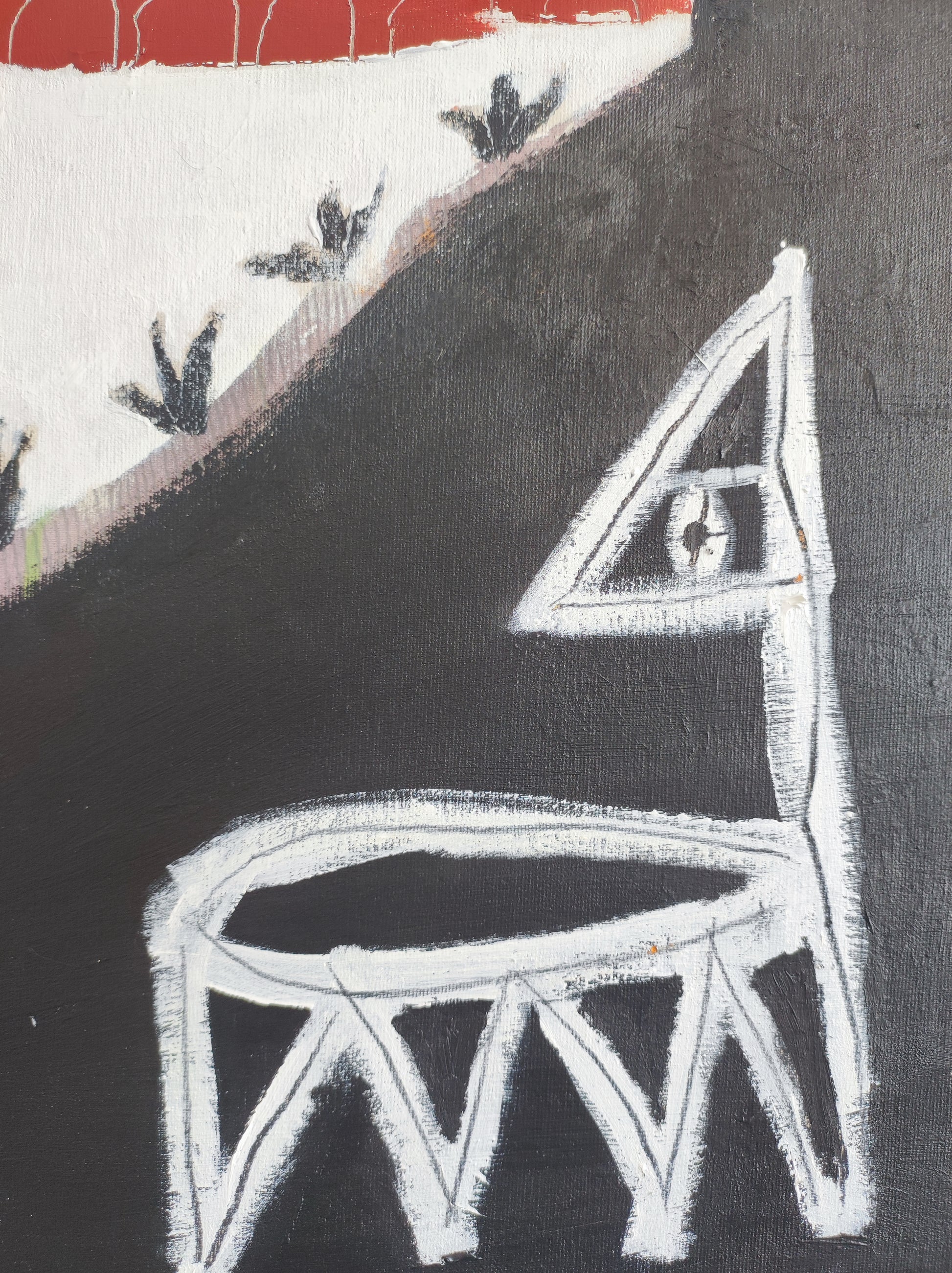 Pintura gestual, intuitiva, que deja que las cosas pasen y se apoya sobre lo que aparece. Aprovechando el accidente y aceptando las consecuencias.