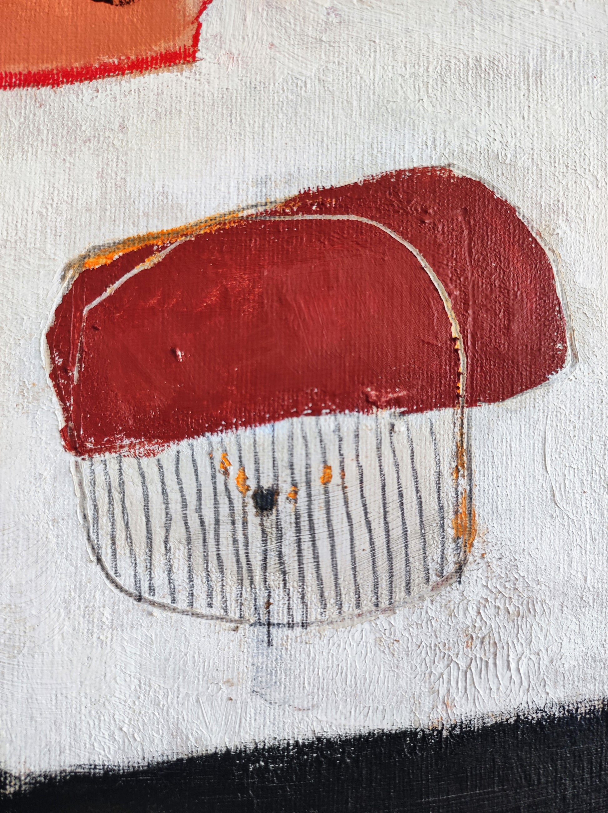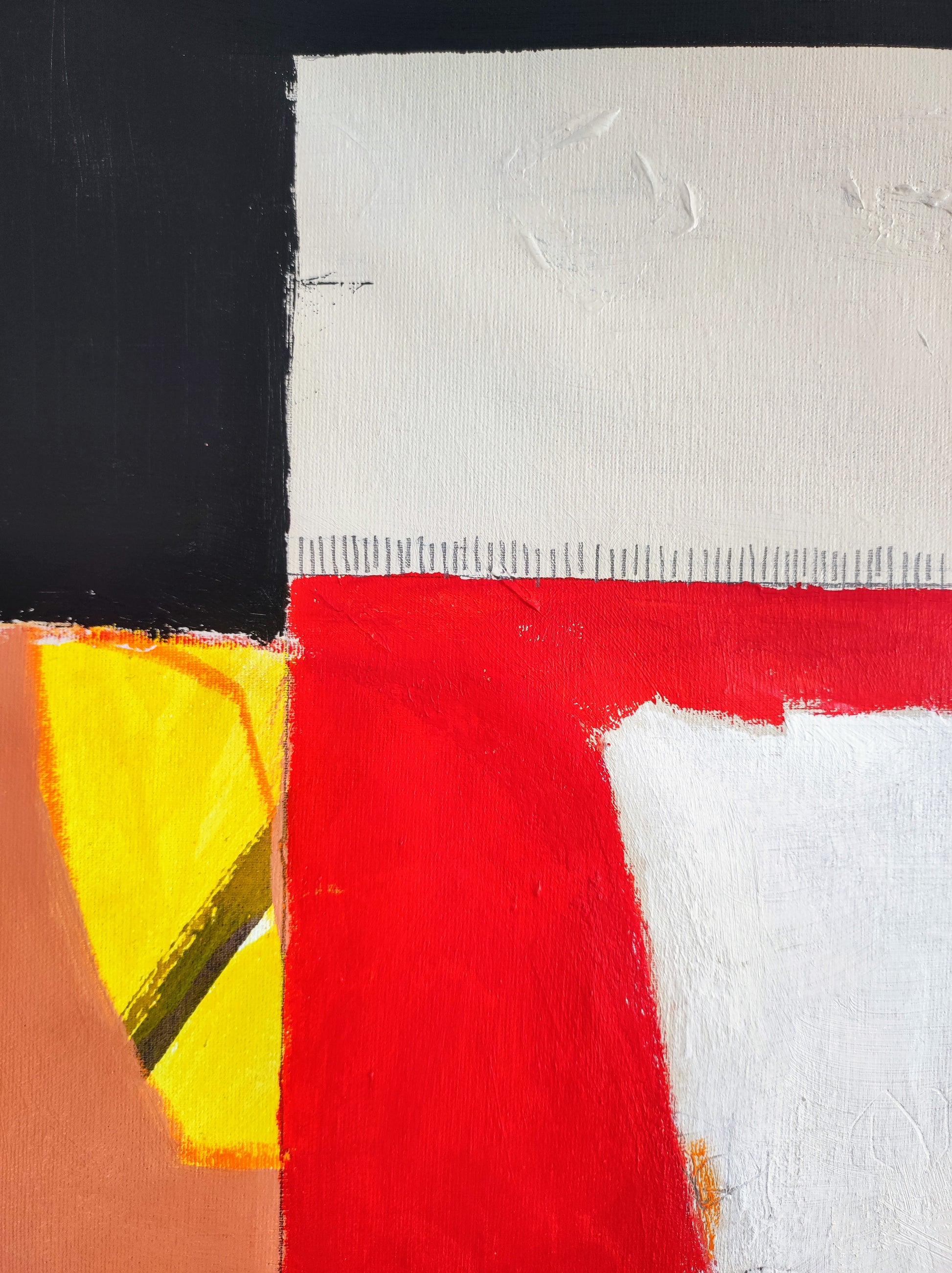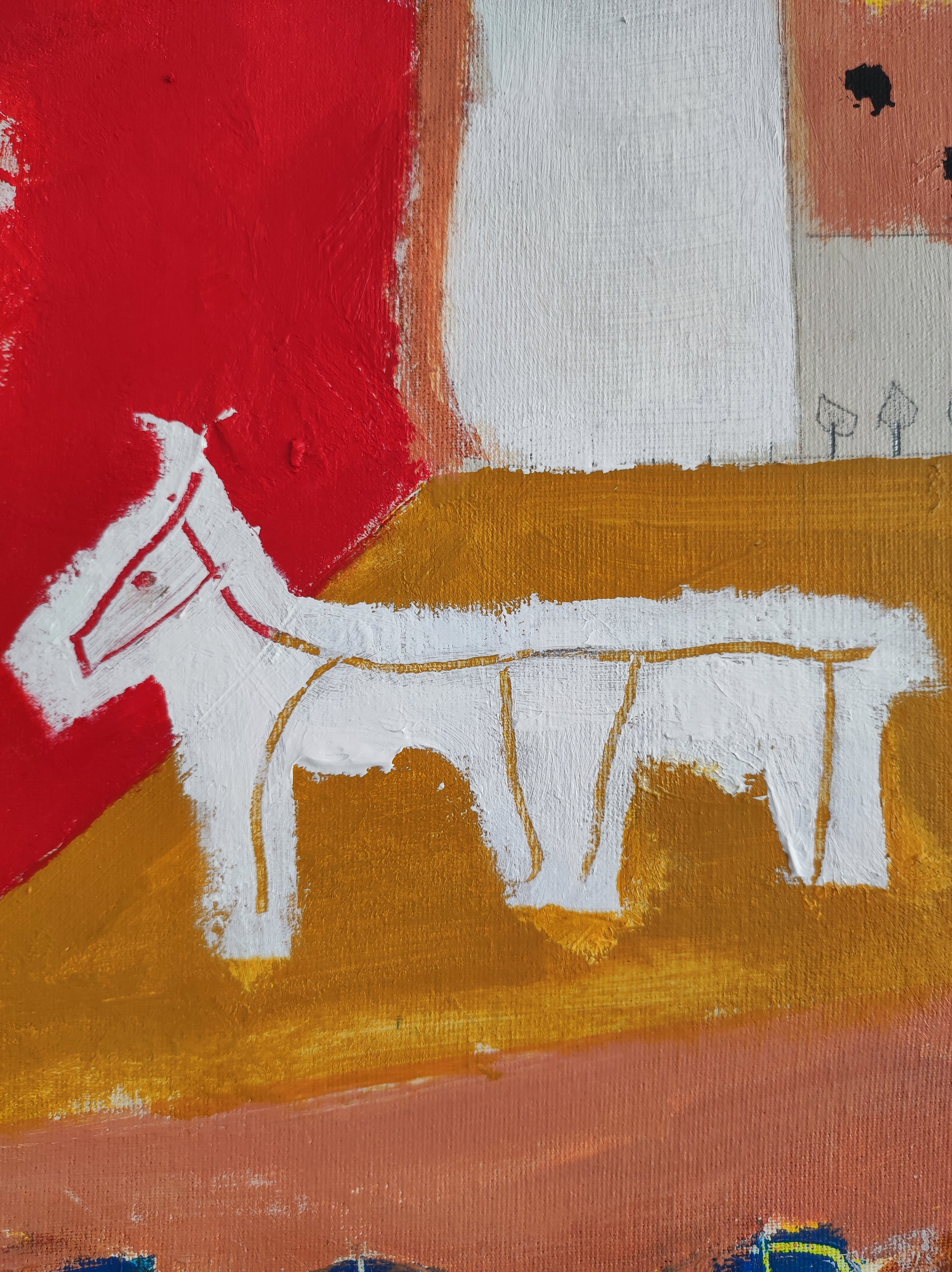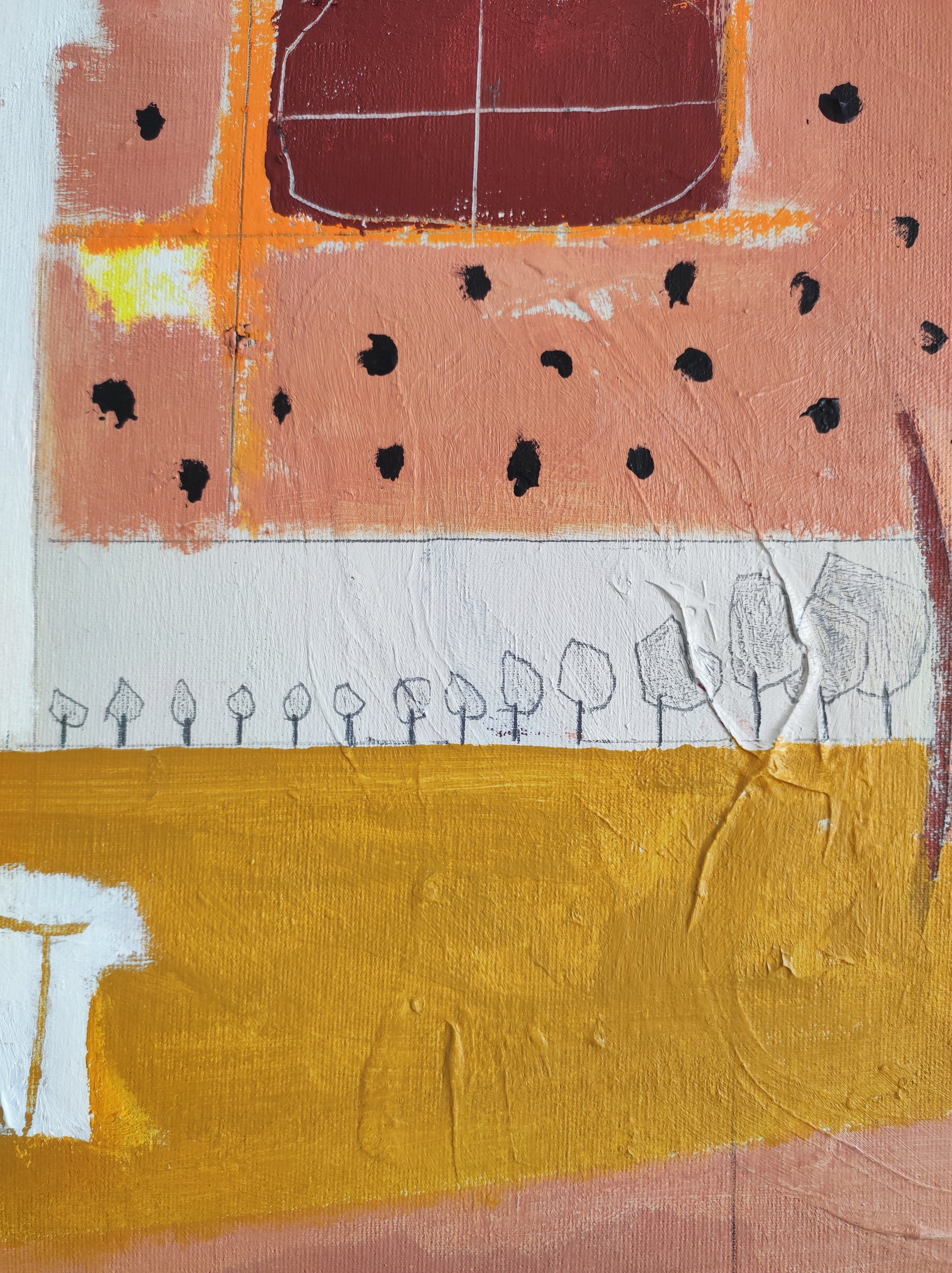 Pintura gestual, intuitiva, que deja que las cosas pasen y se apoya sobre lo que aparece. Aprovechando el accidente y aceptando las consecuencias.