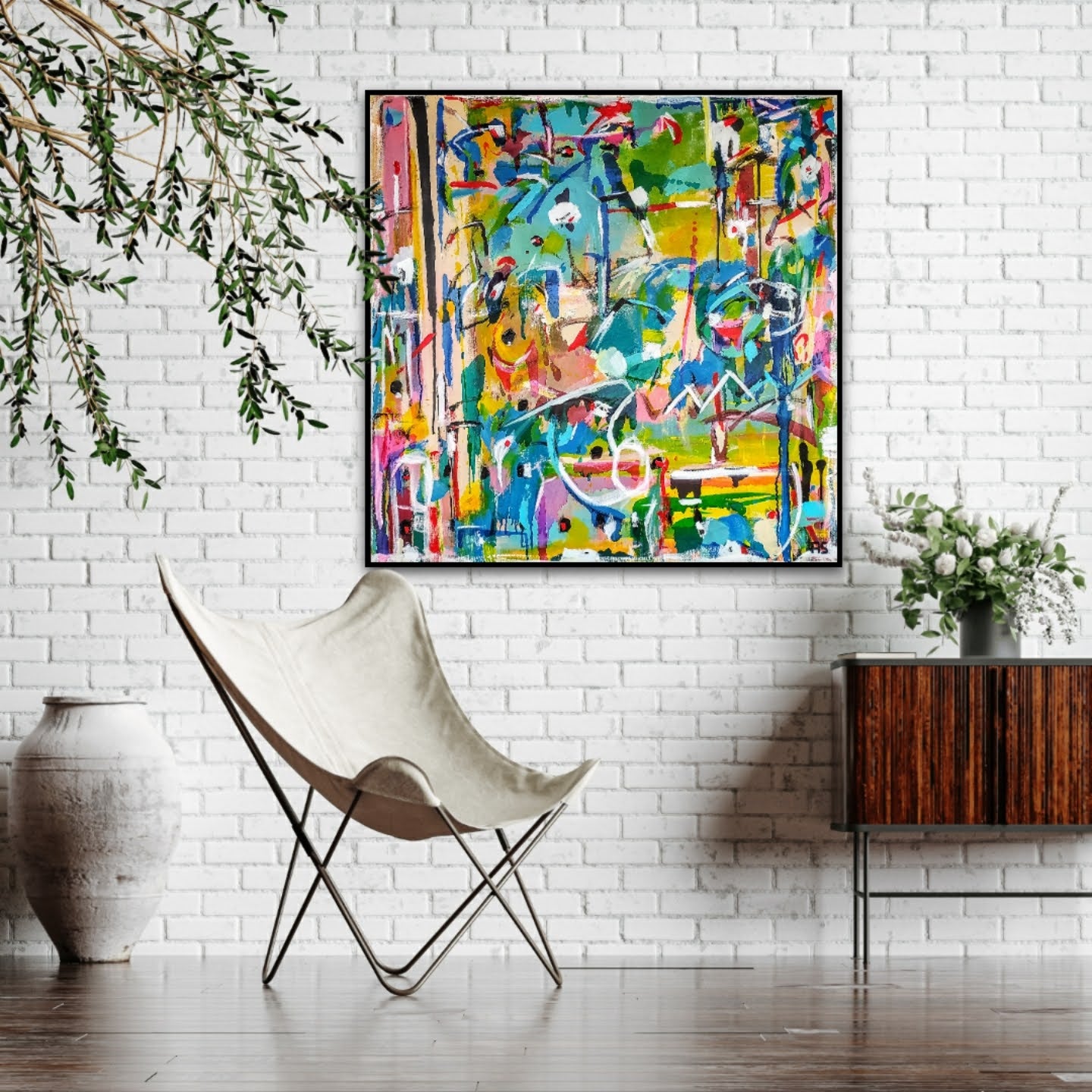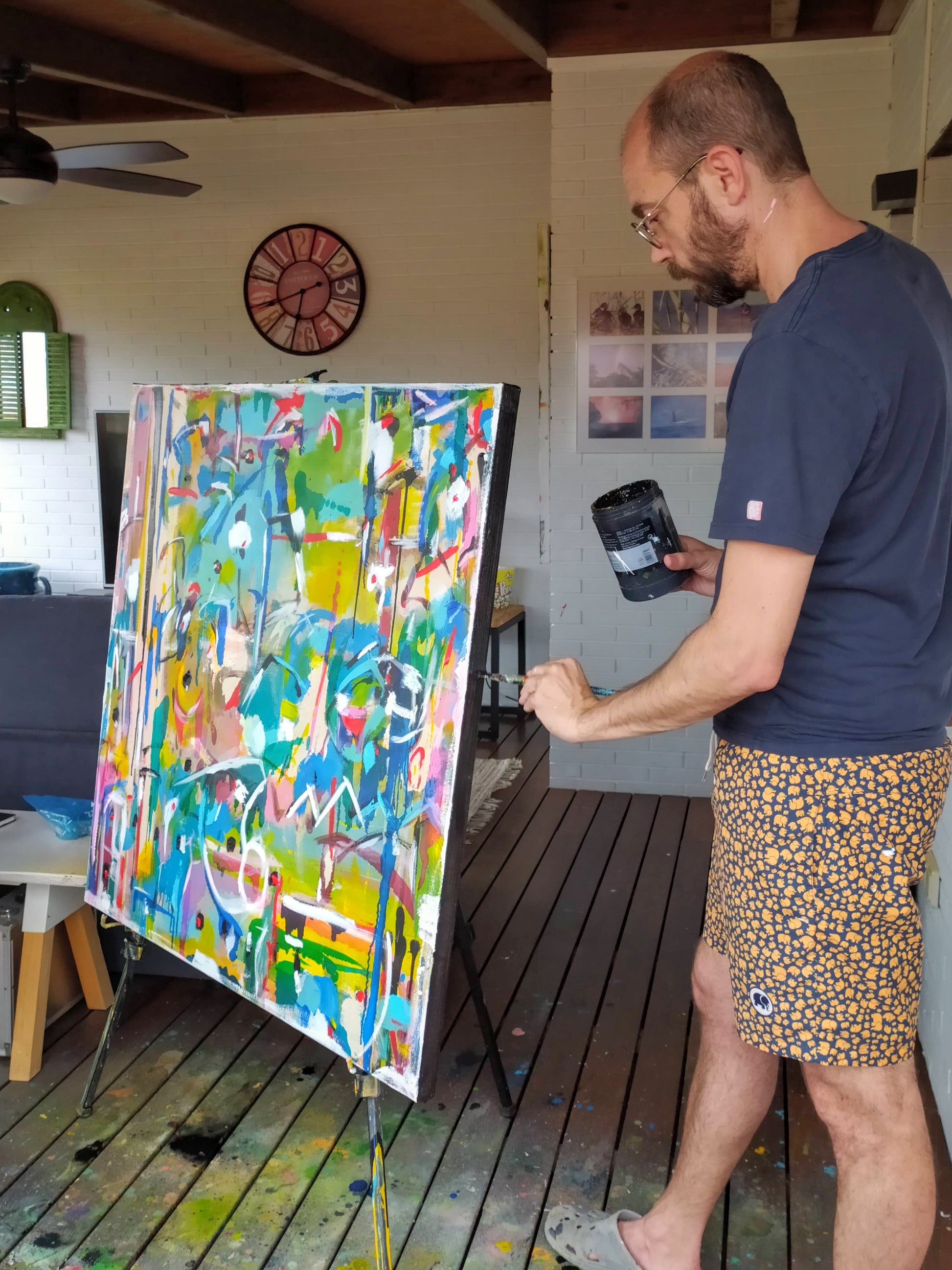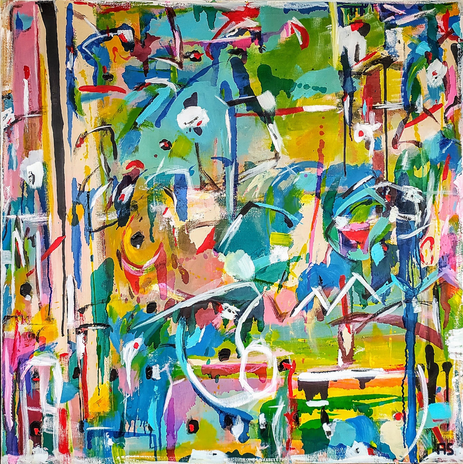 Cuadro trabajado desde la improvisación libre. Action painting, inicio del verano 2021. Versiones de Summertime (Miles Davis, Janis Joplin, Chet Baker, The Zombies, Billie Holiday...)