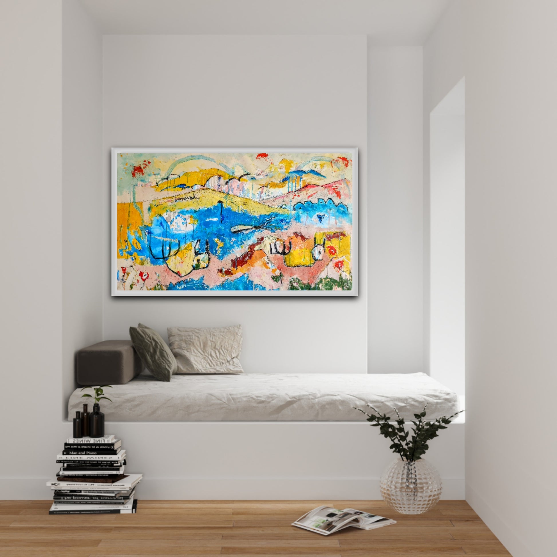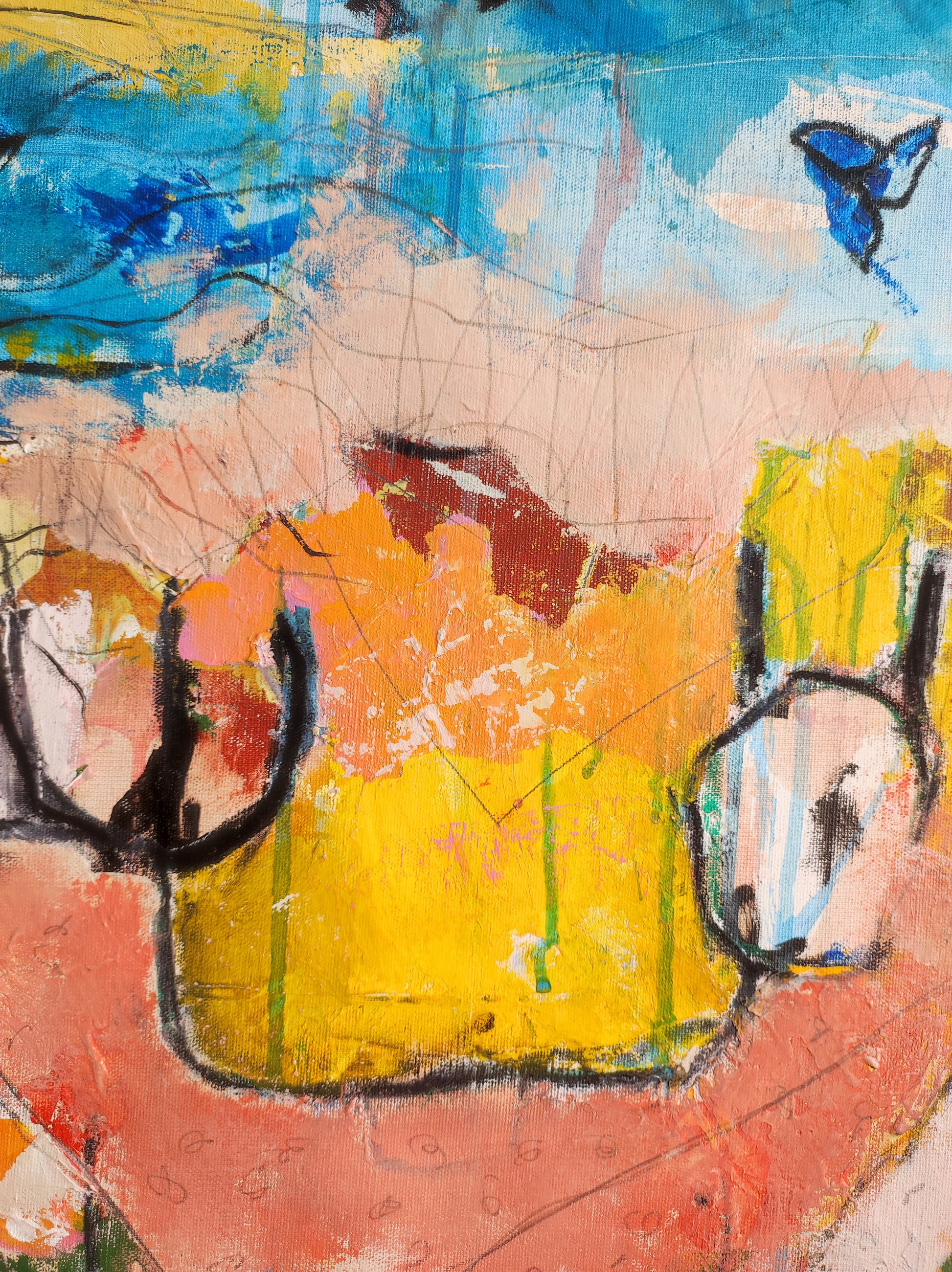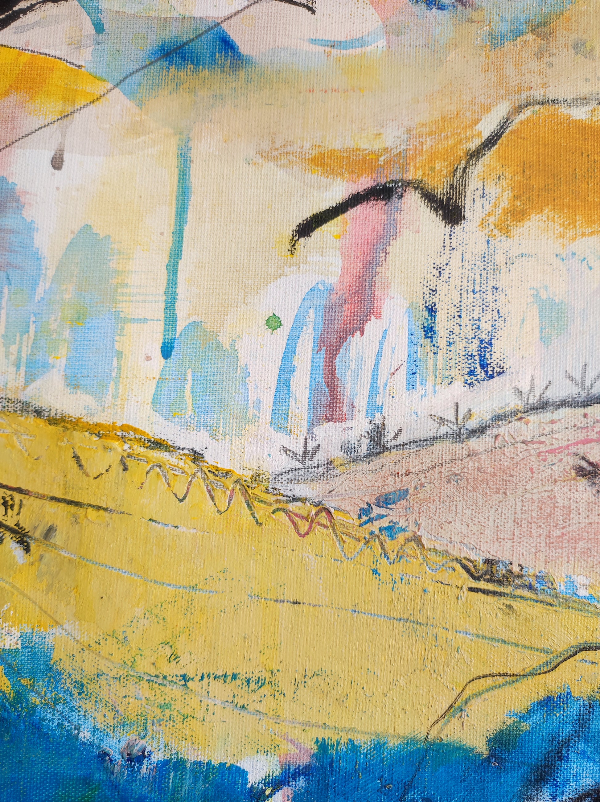 Pintura gestual, intuitiva, que deja que las cosas pasen y se apoya sobre lo que aparece. Aprovechando el accidente y aceptando las consecuencias.