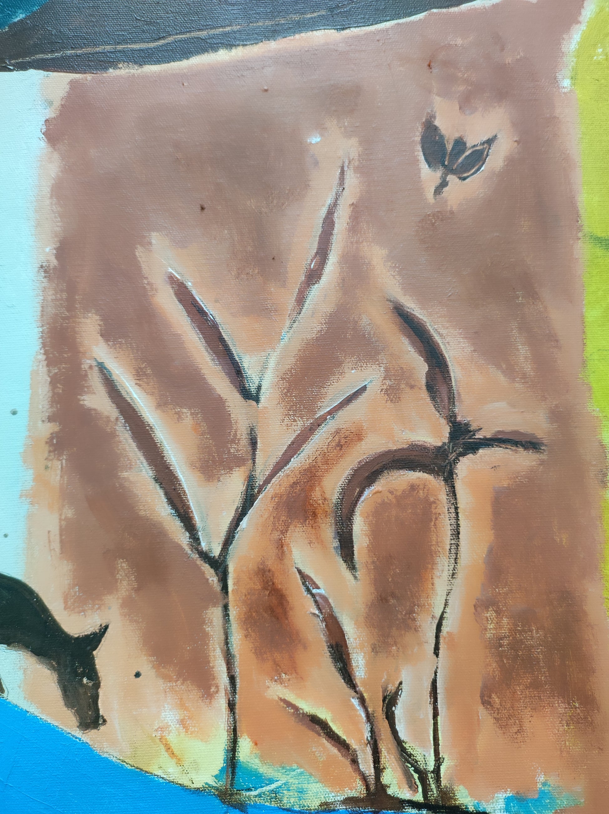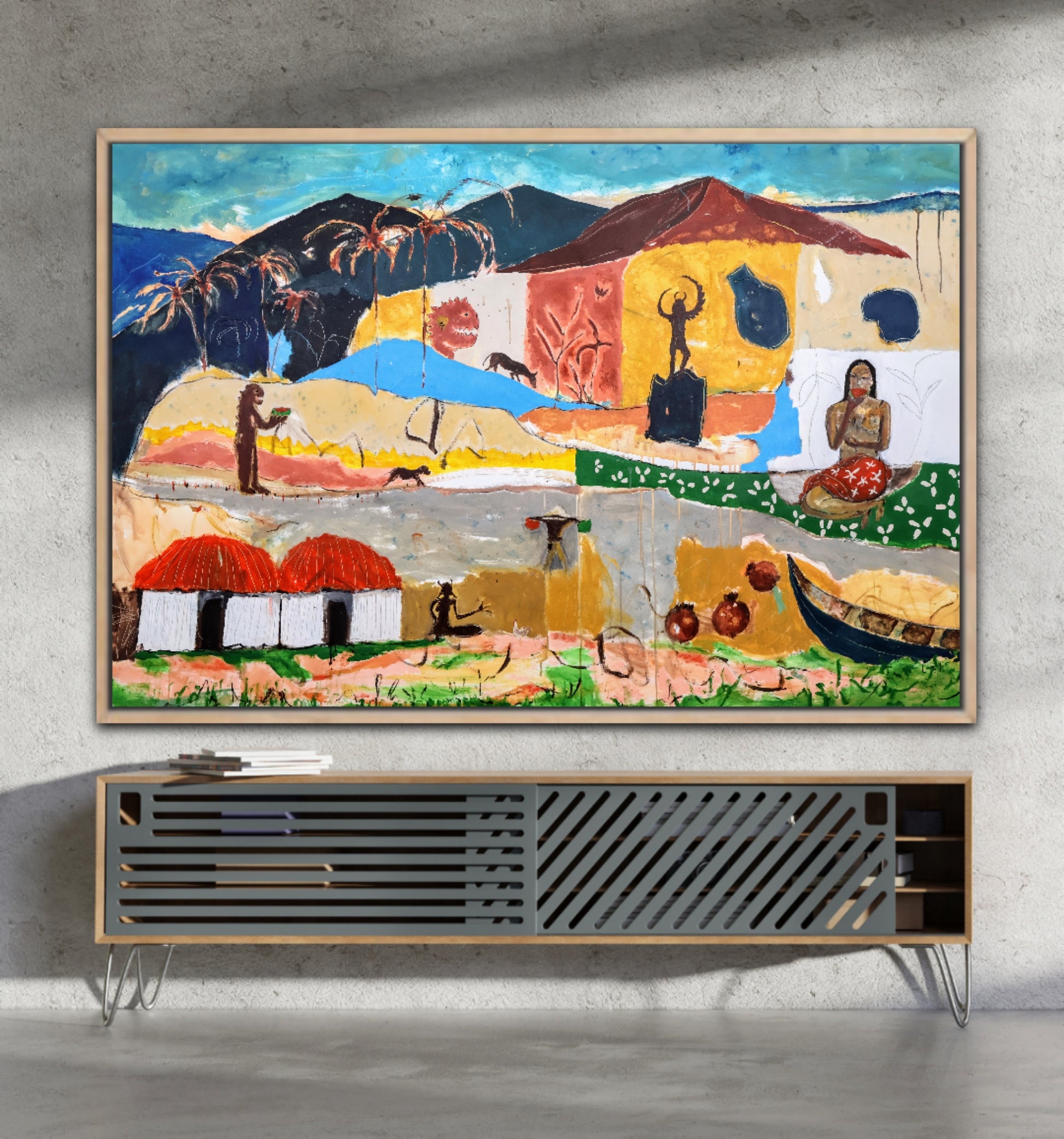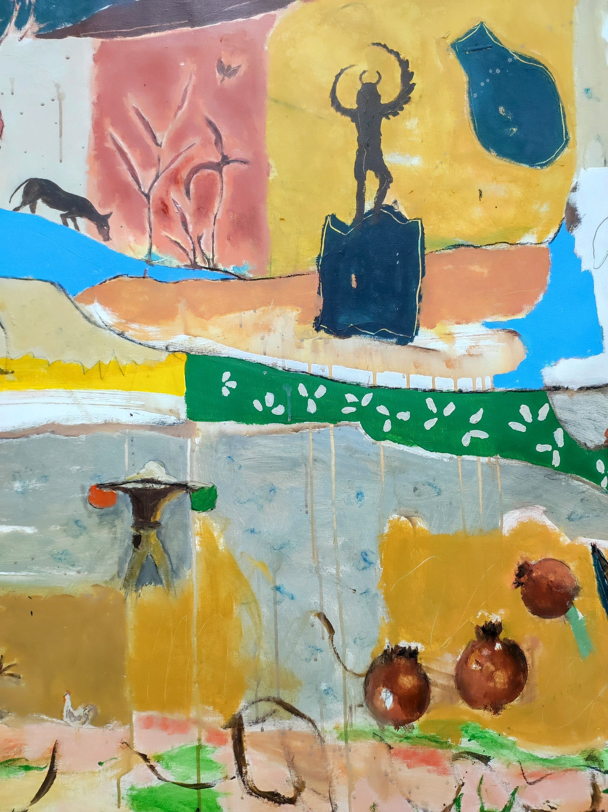 Técnica: acrílico, pigmentos, lápiz, gesso y carboncillo.