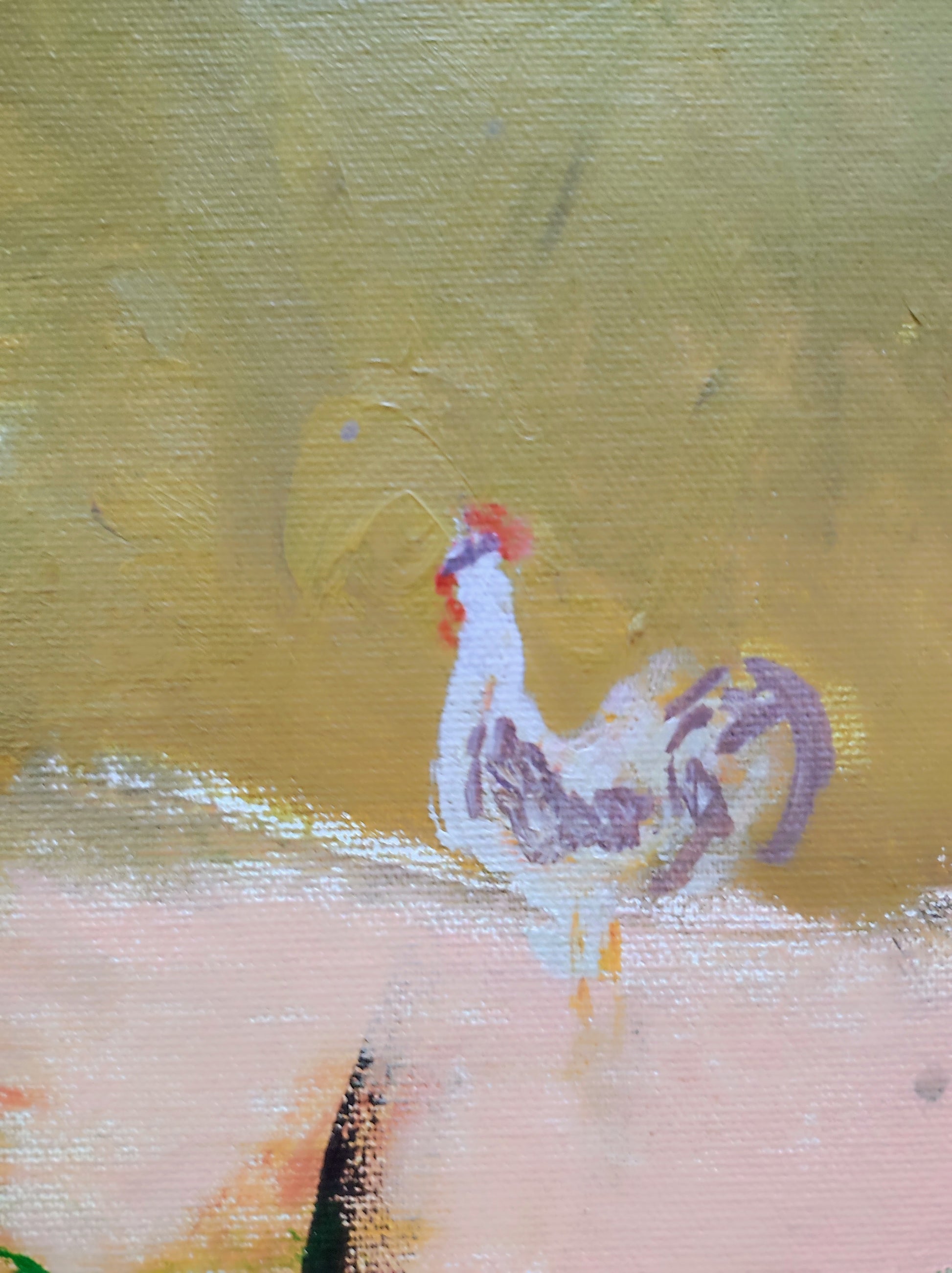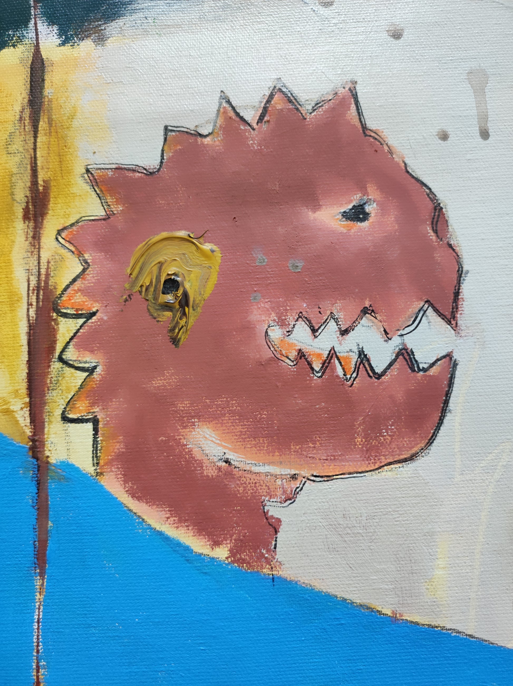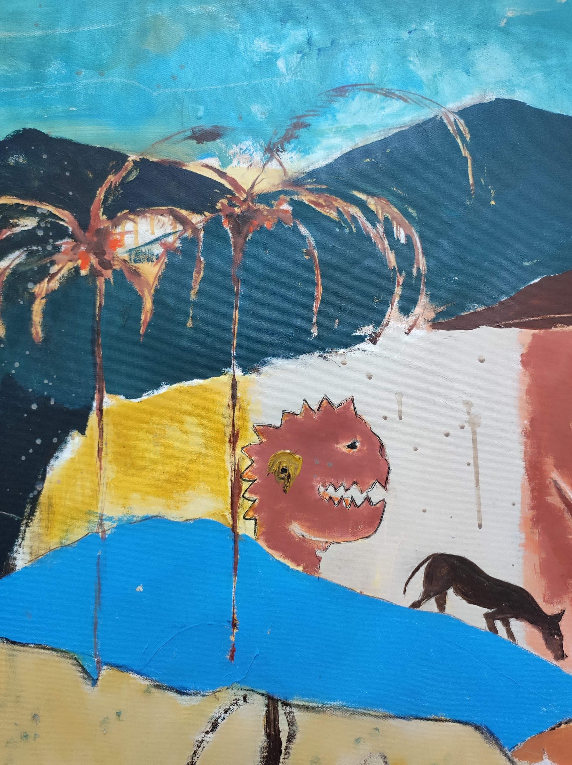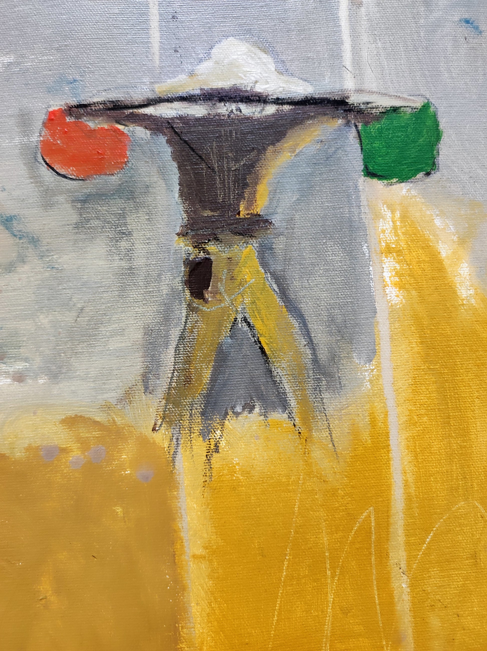 Pintura gestual, intuitiva, que deja que las cosas pasen y se apoya sobre lo que aparece. Aprovechando el accidente y aceptando las consecuencias.