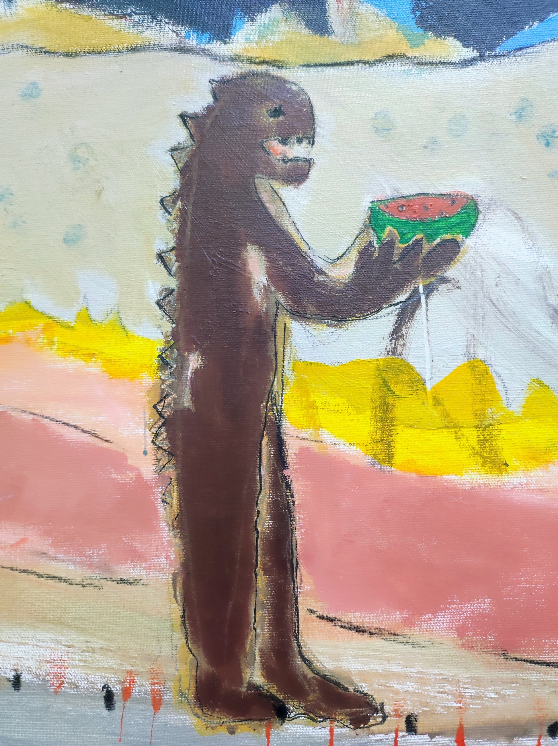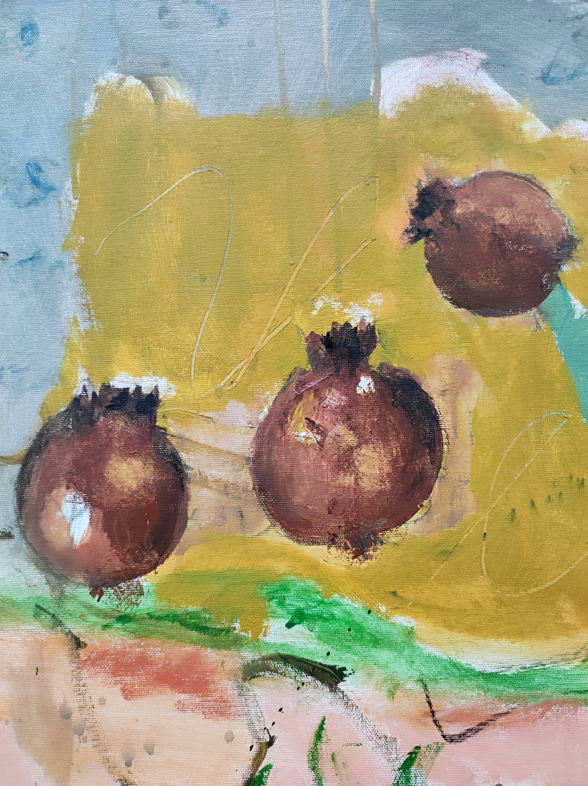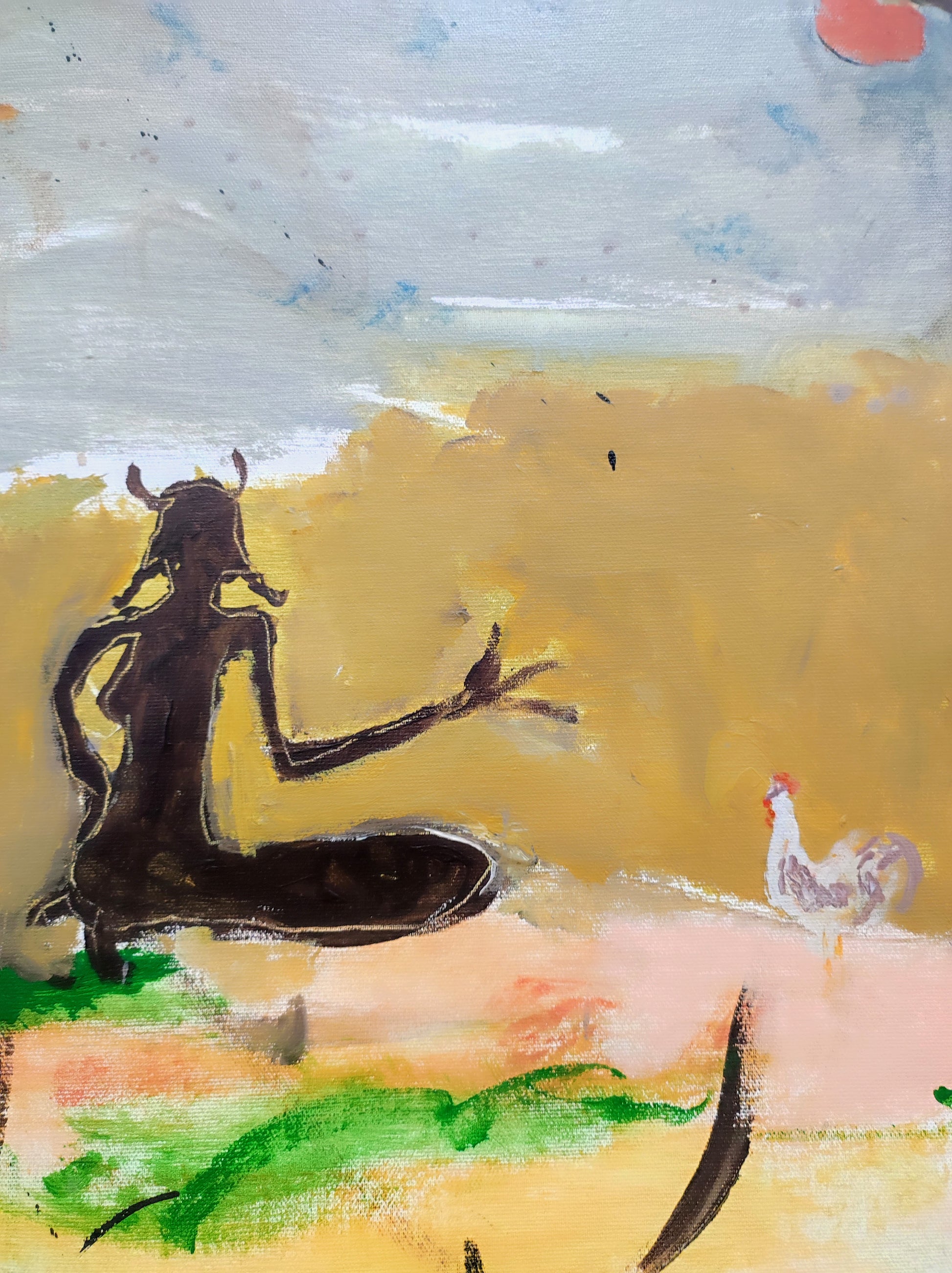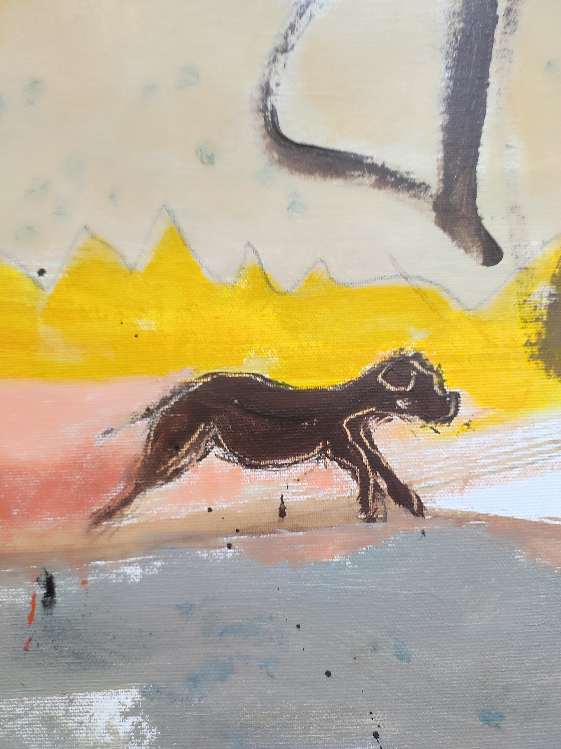 Pintura gestual, intuitiva, que deja que las cosas pasen y se apoya sobre lo que aparece. Aprovechando el accidente y aceptando las consecuencias.