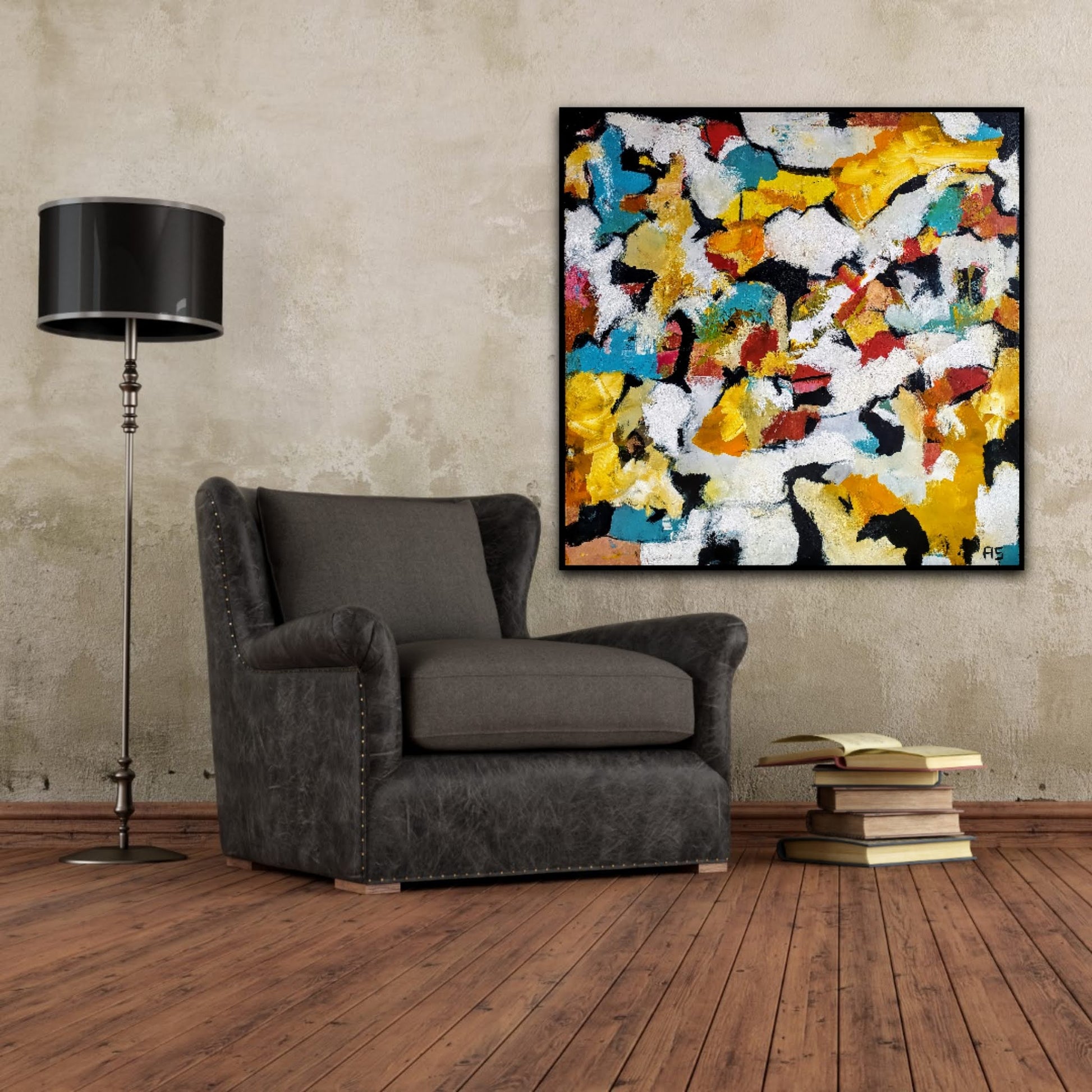 Cuadro trabajado desde la improvisación libre. Action painting con música de Leiva y poesías de Luís García Montero.