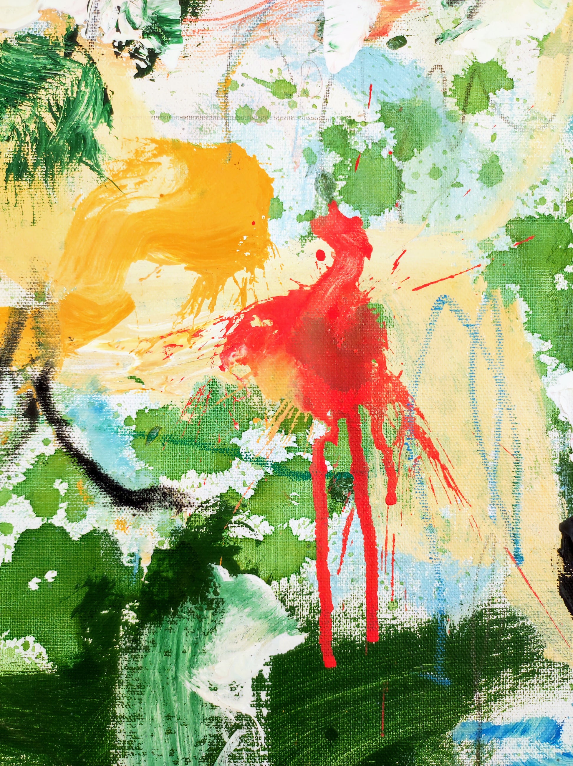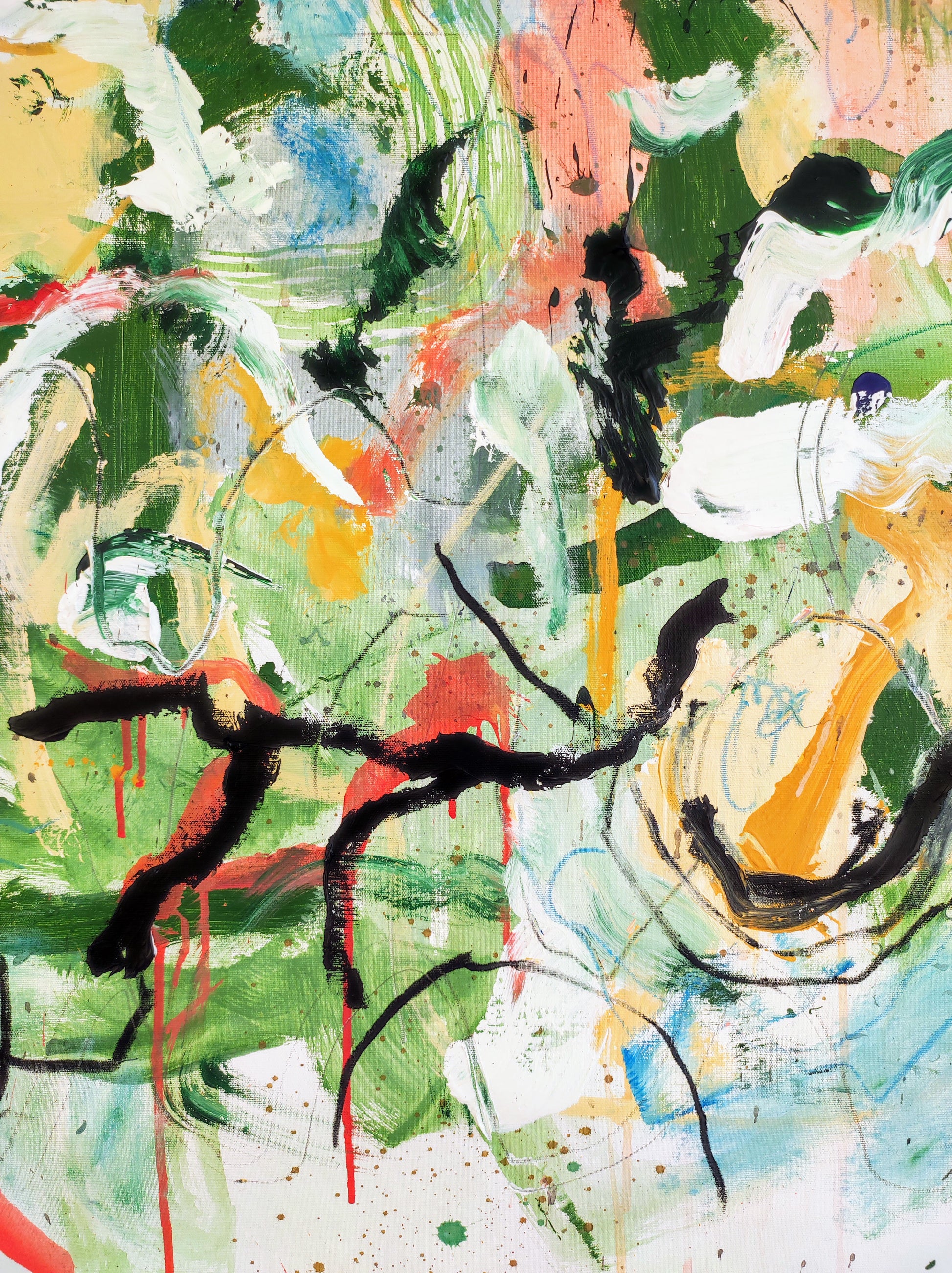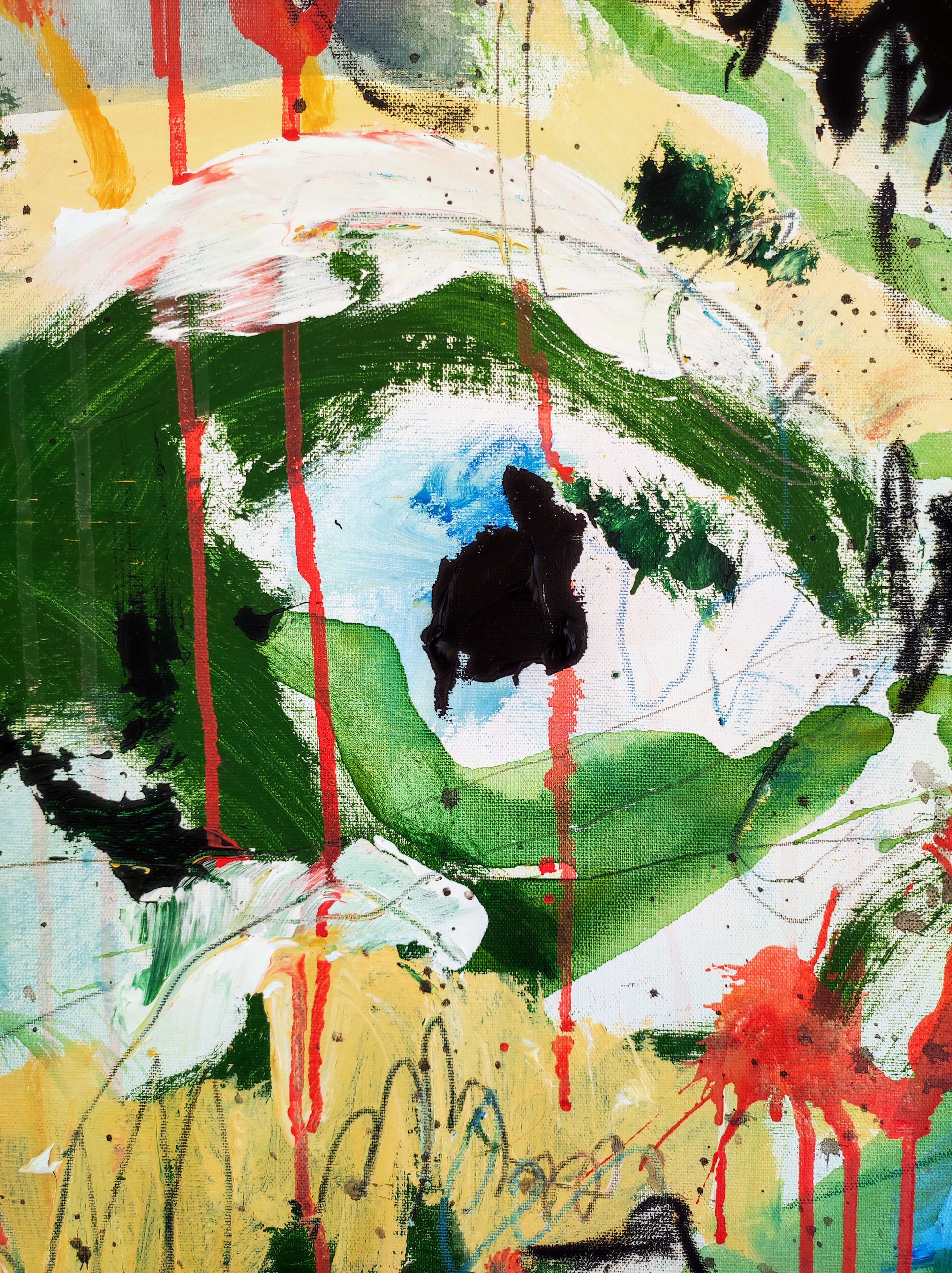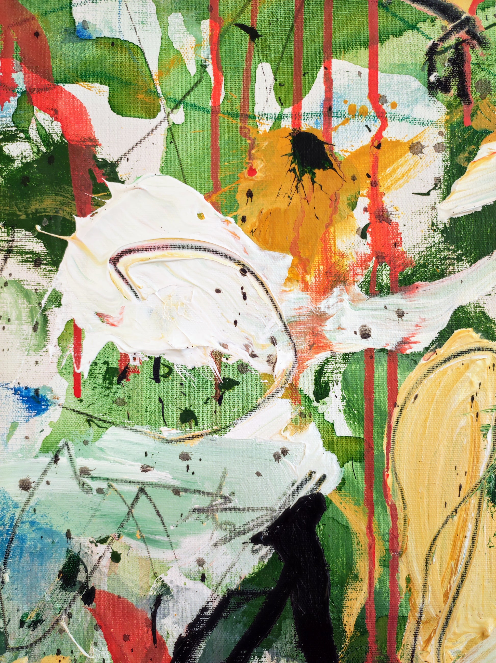 Pintura gestual, intuitiva, que deja que las cosas pasen y se apoya sobre lo que aparece. Aprovechando el accidente y aceptando las consecuencias.