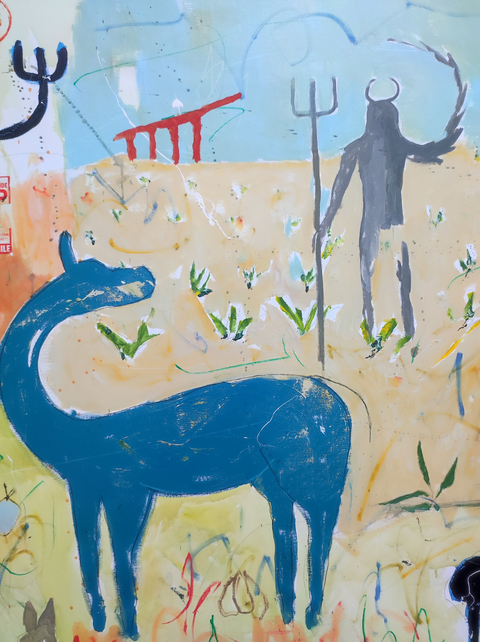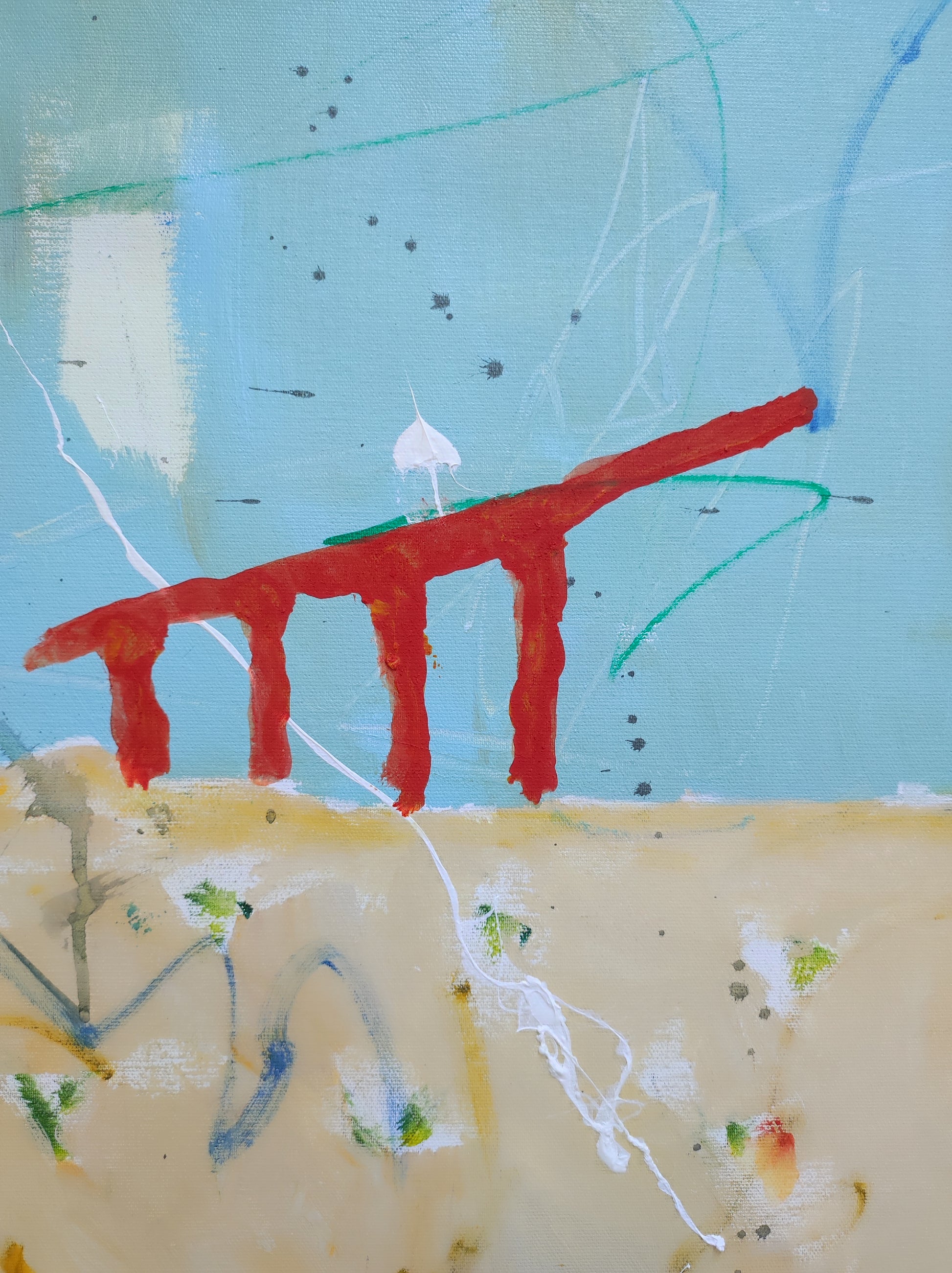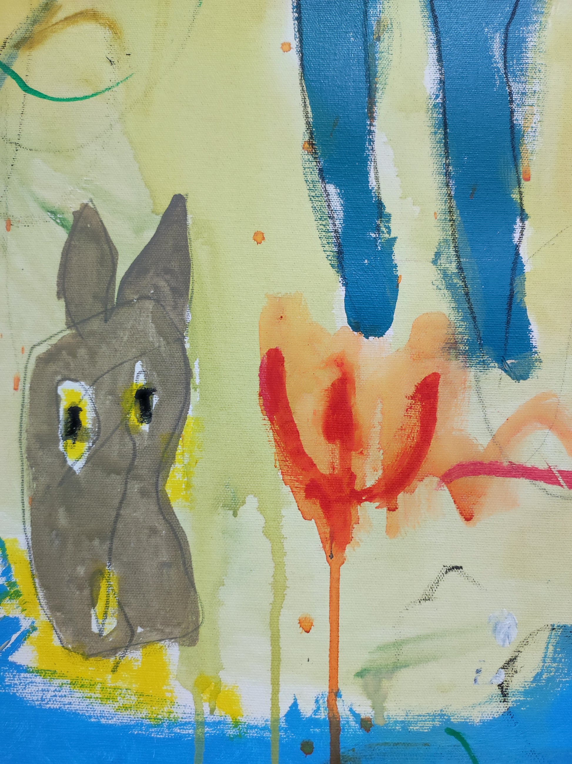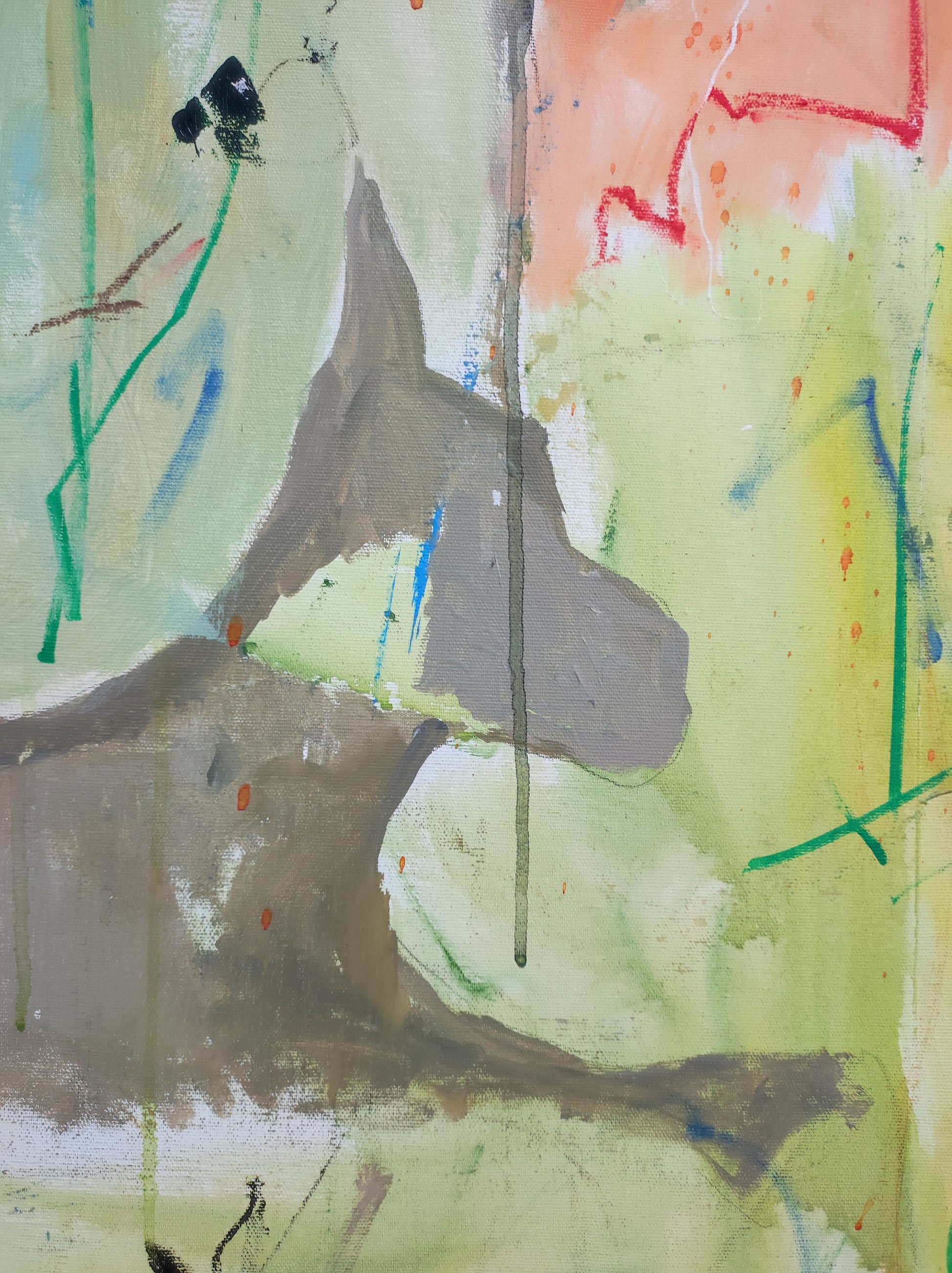 Pintura gestual, intuitiva, que deja que las cosas pasen y se apoya sobre lo que aparece. Aprovechando el accidente y aceptando las consecuencias.