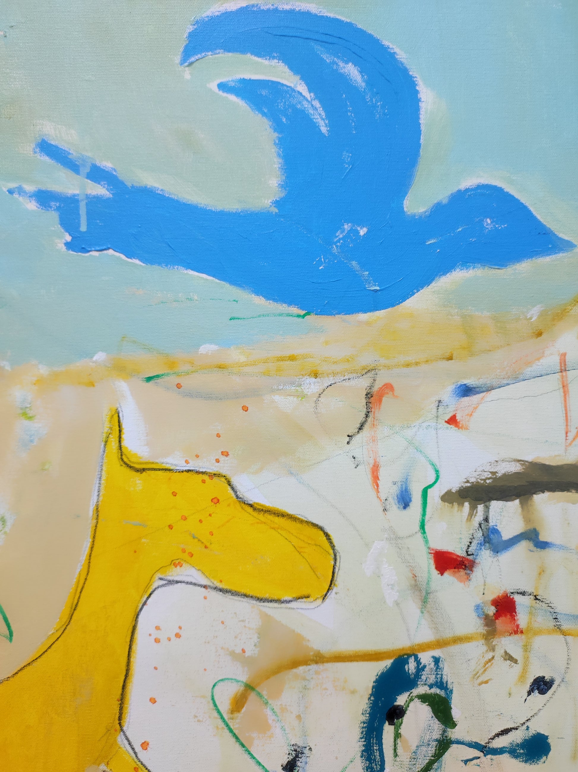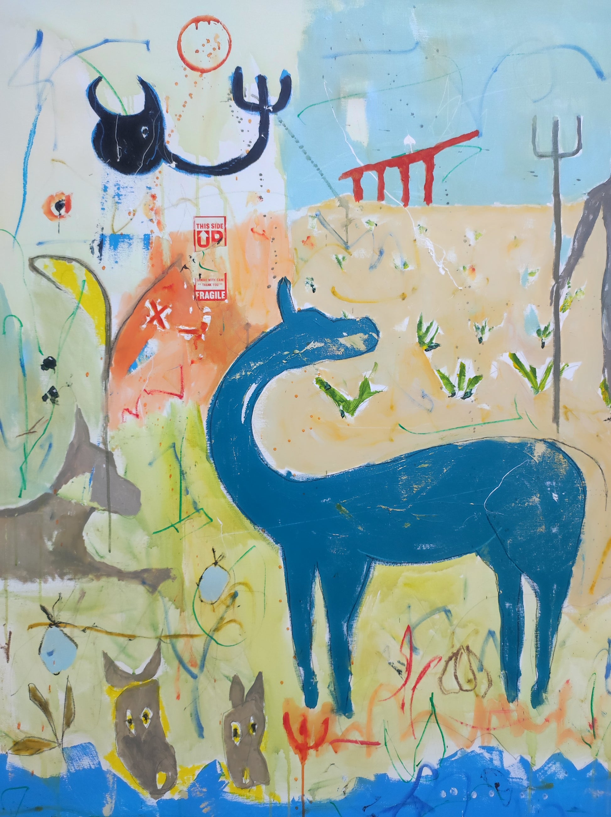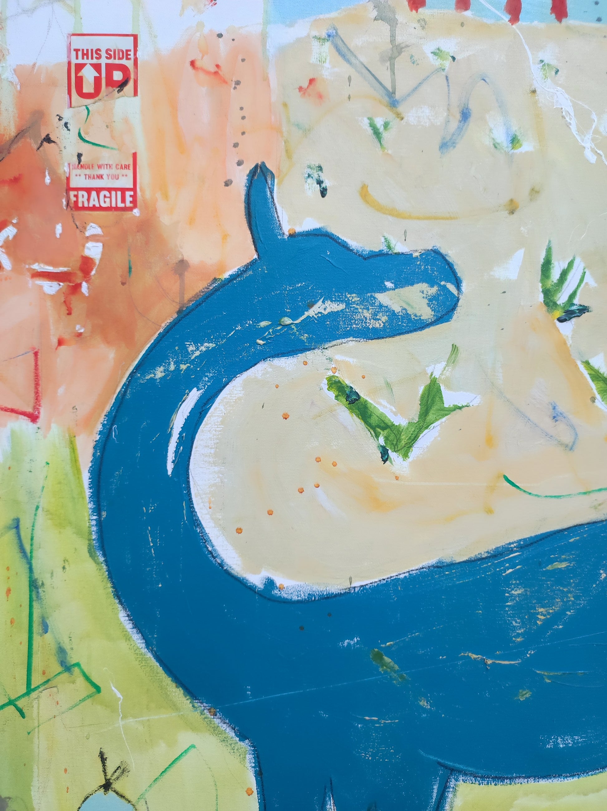 Pintura gestual, intuitiva, que deja que las cosas pasen y se apoya sobre lo que aparece. Aprovechando el accidente y aceptando las consecuencias.