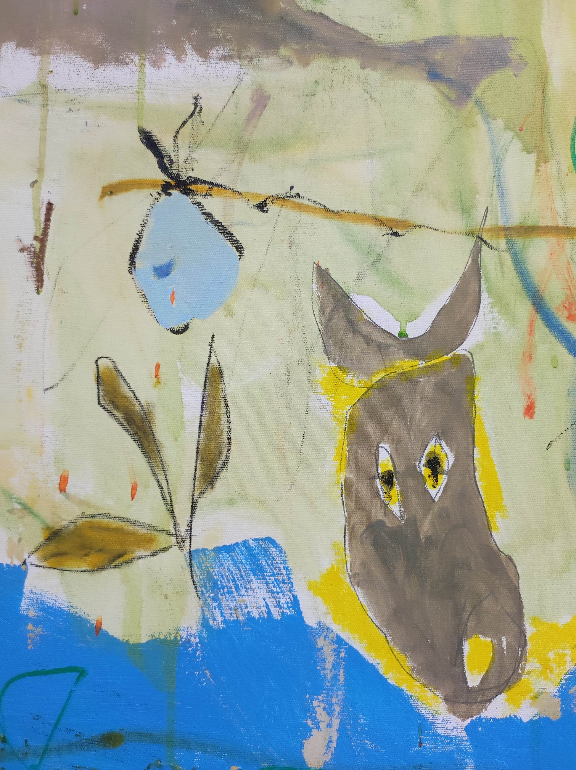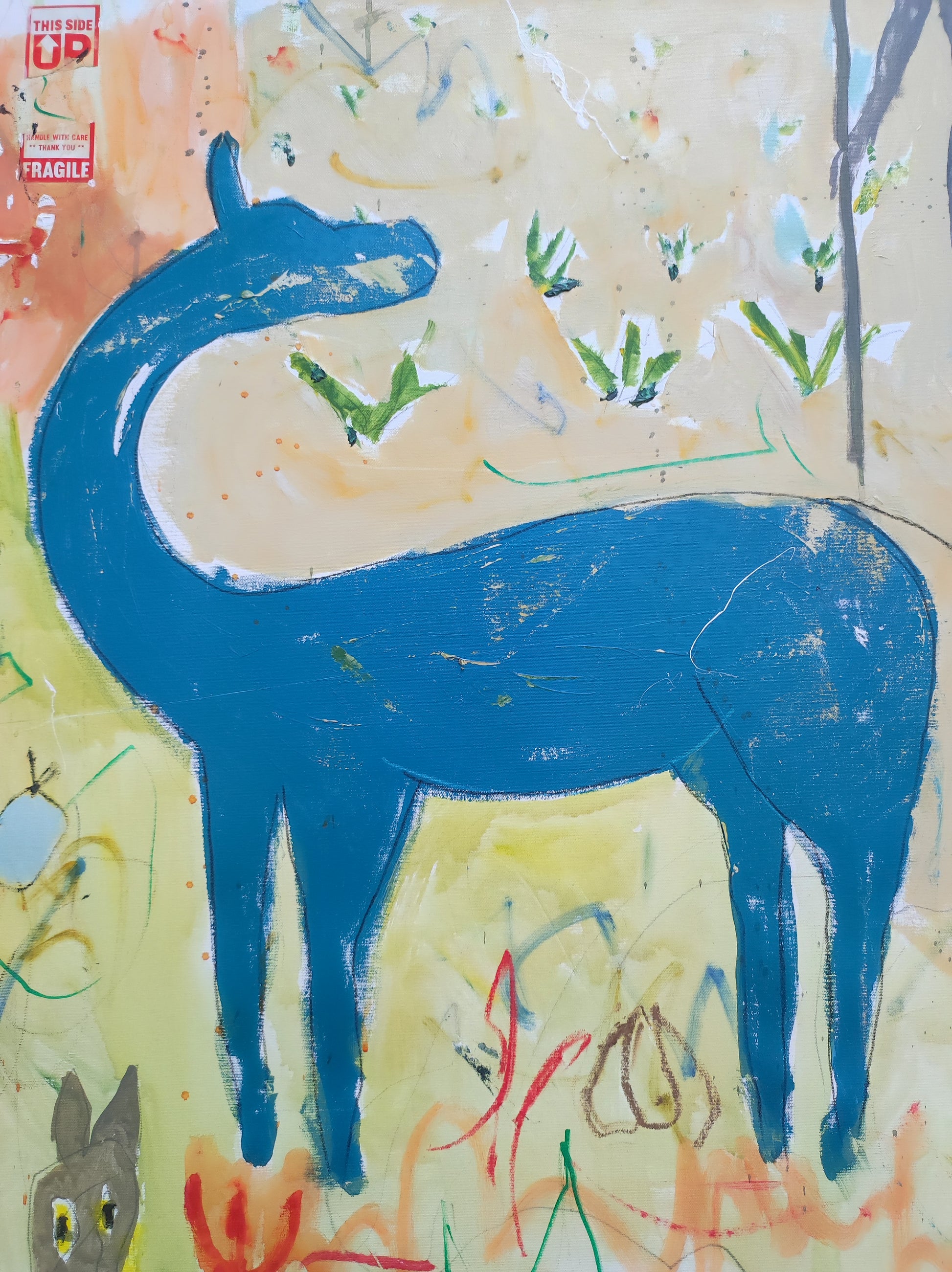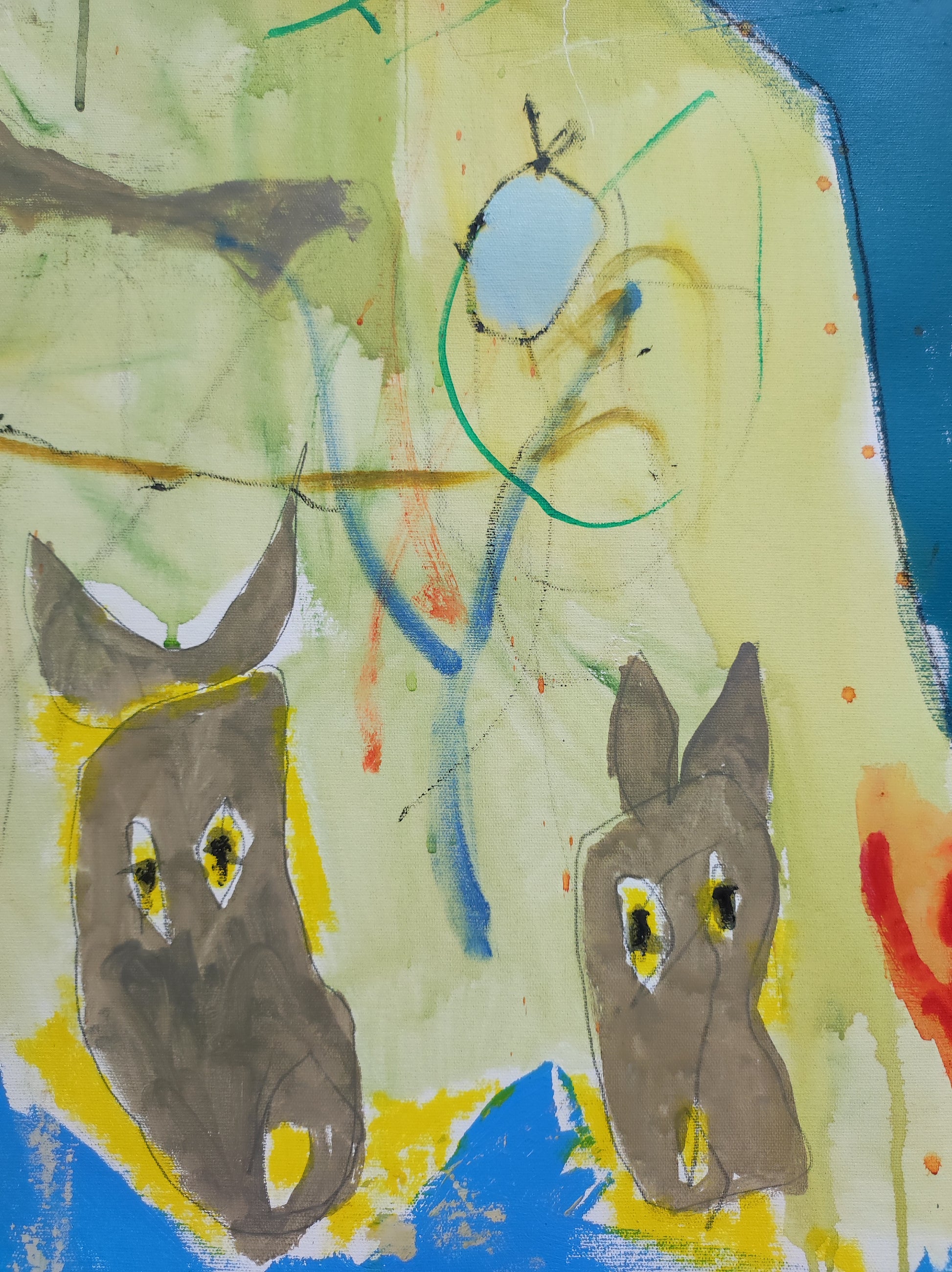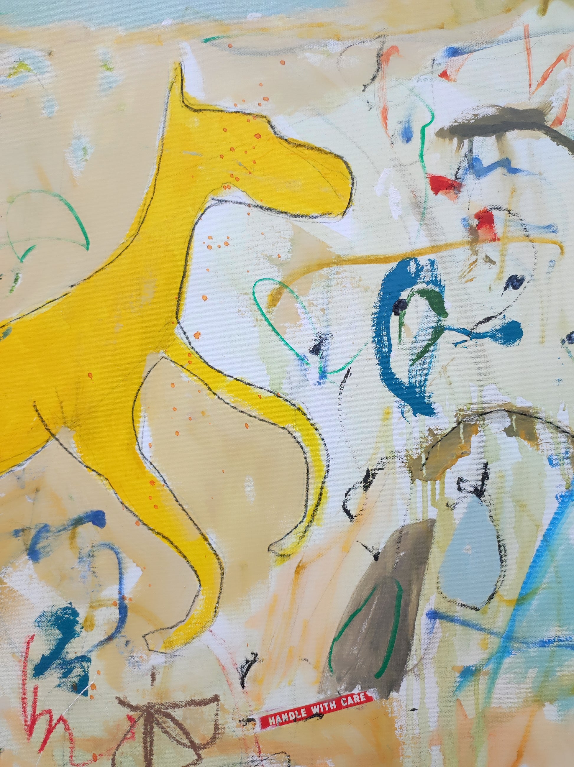 Pintura gestual, intuitiva, que deja que las cosas pasen y se apoya sobre lo que aparece. Aprovechando el accidente y aceptando las consecuencias.