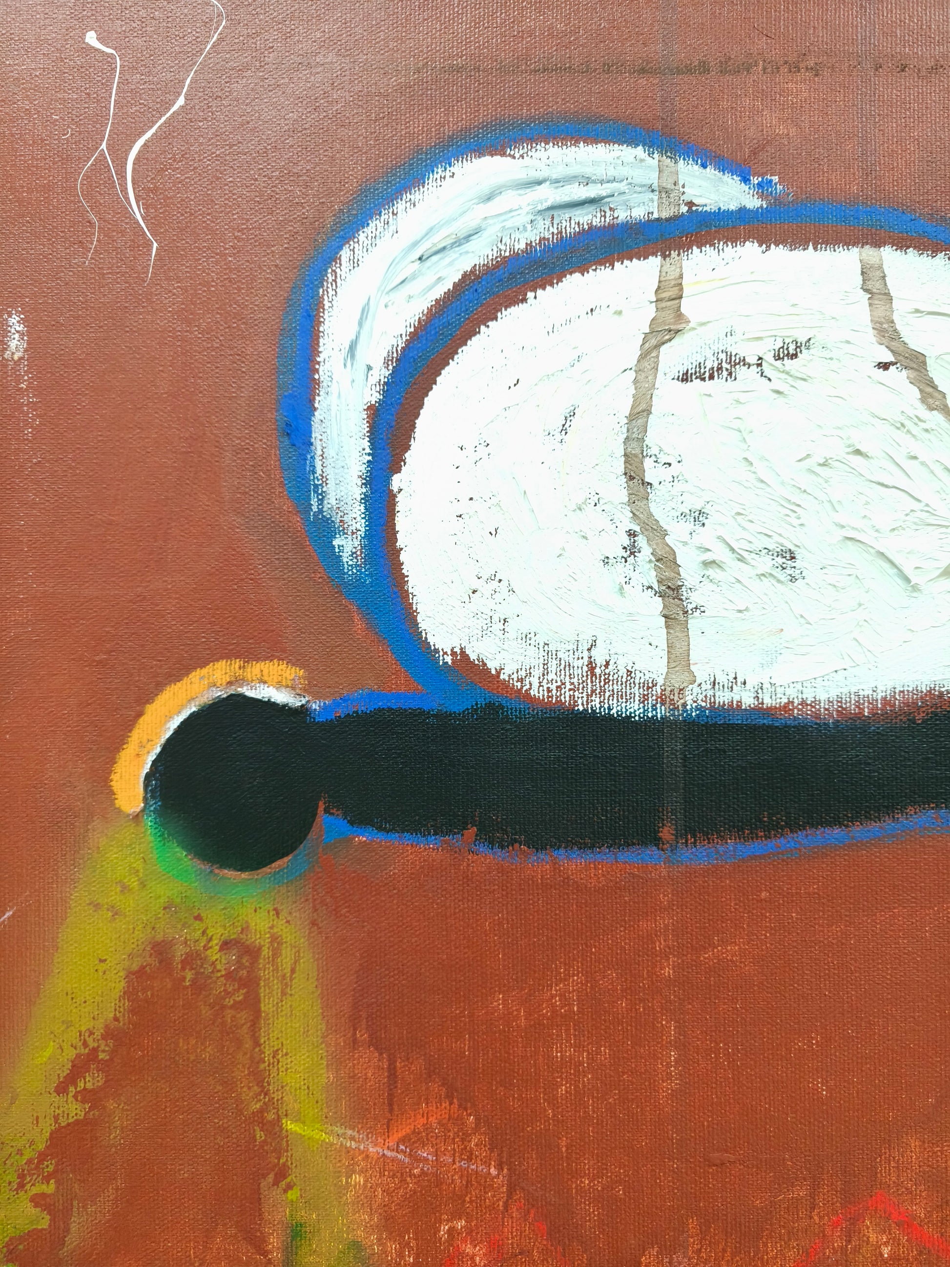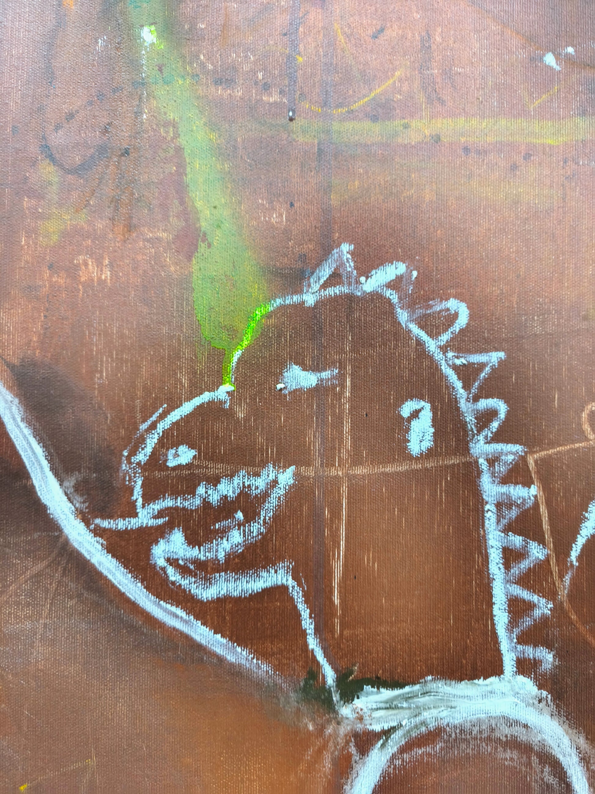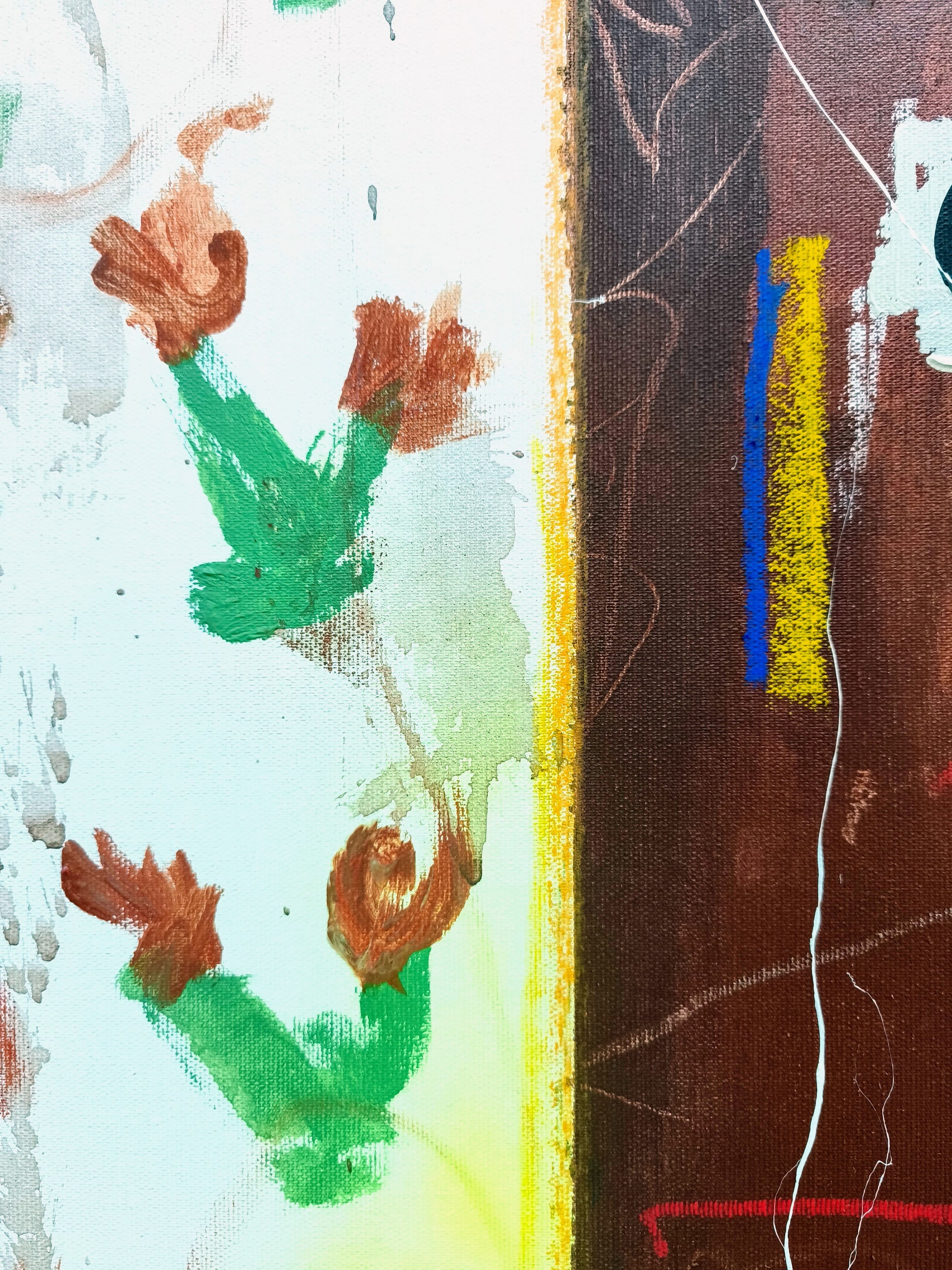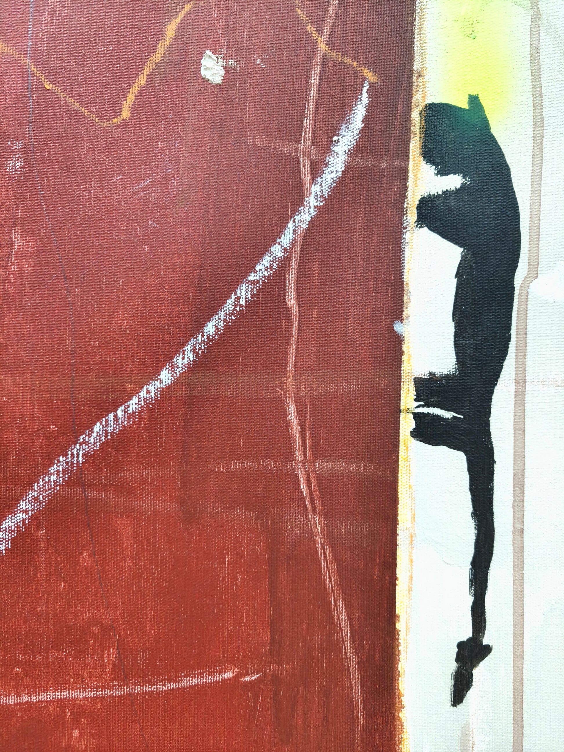 Pintura gestual, intuitiva, que deja que las cosas pasen y se apoya sobre lo que aparece. Aprovechando el accidente y aceptando las consecuencias.