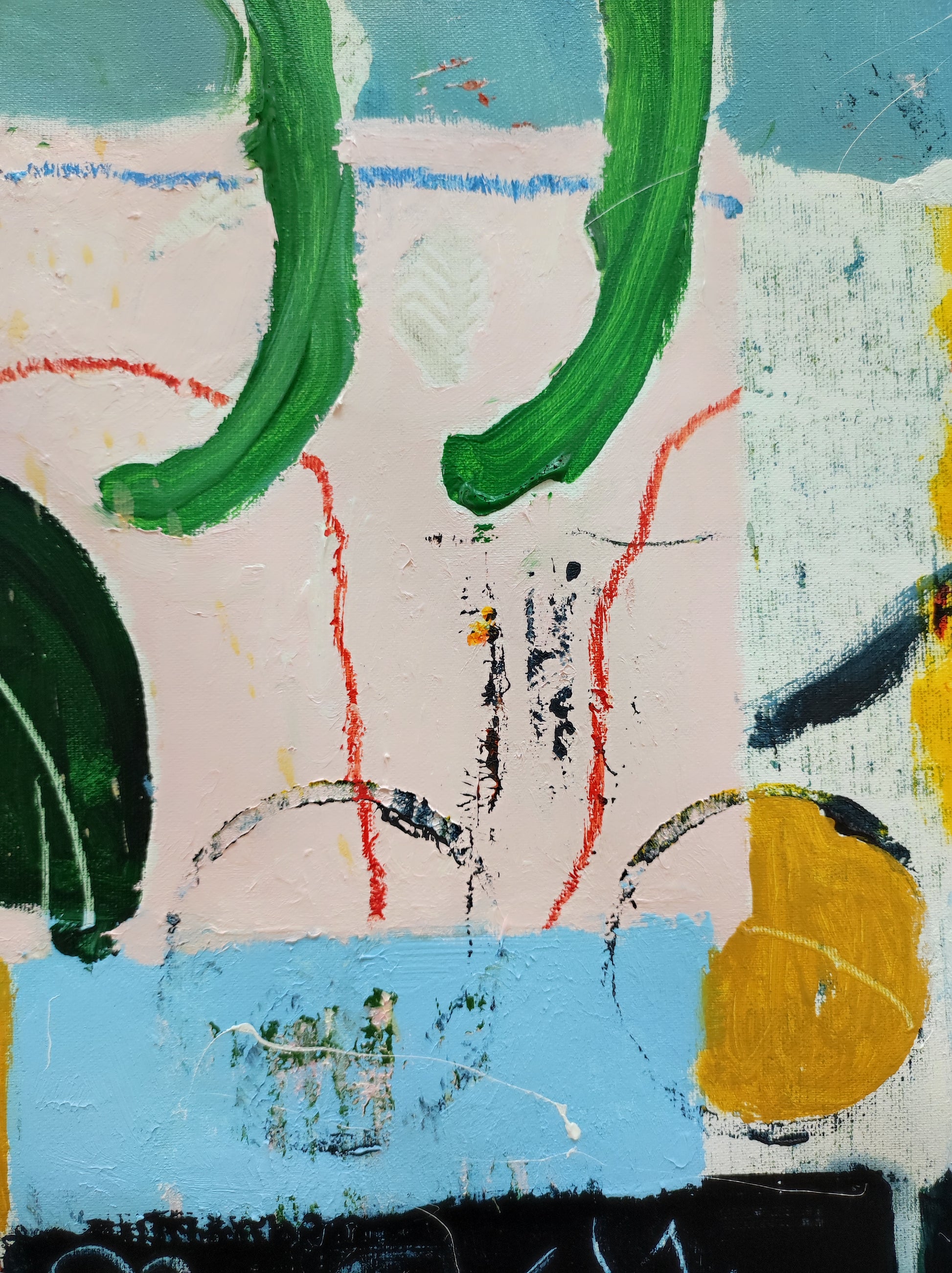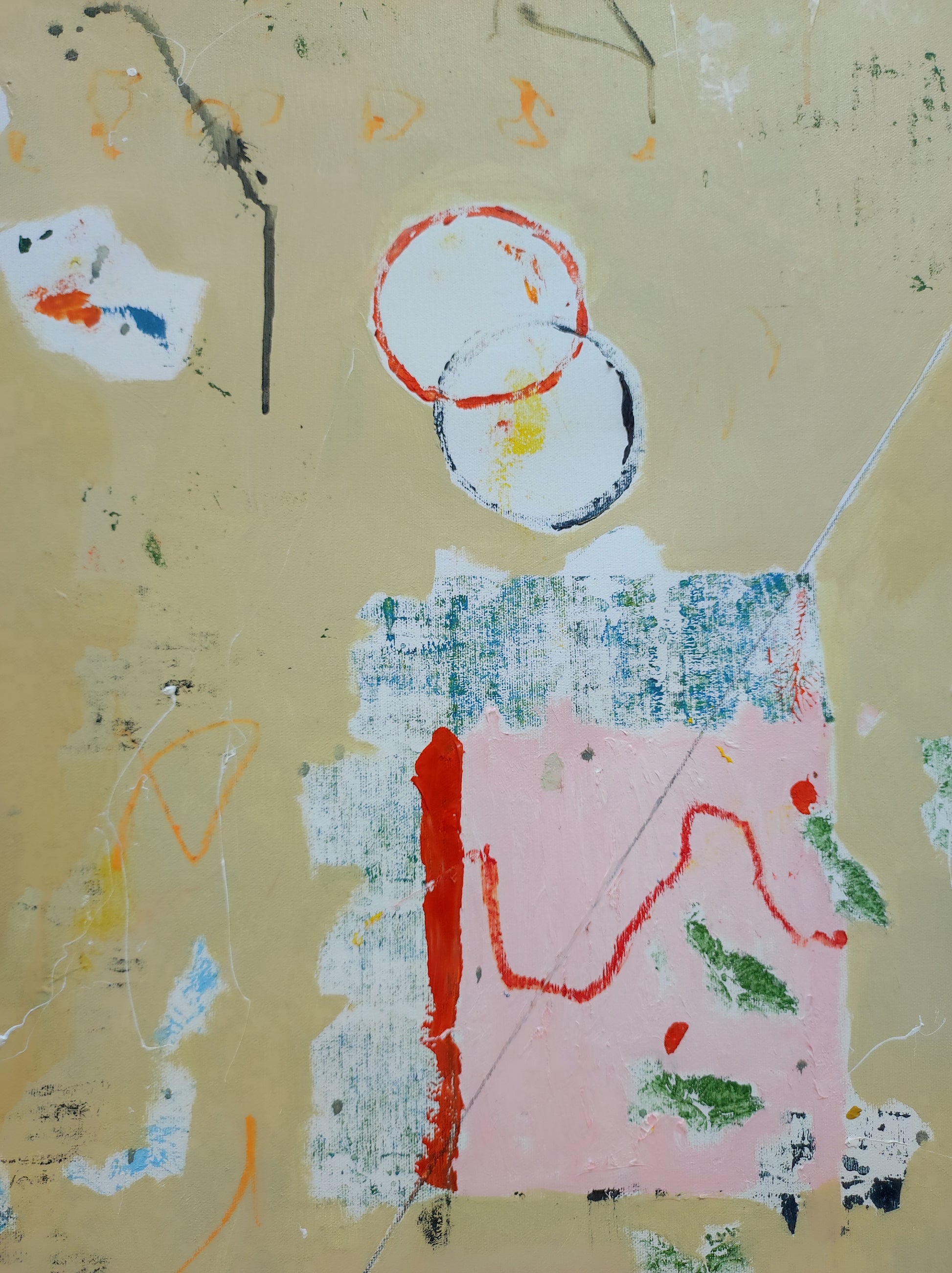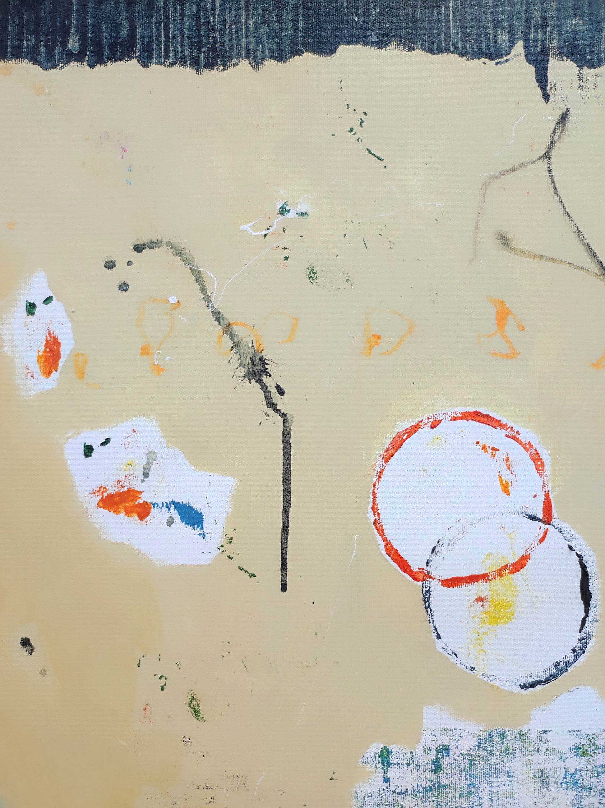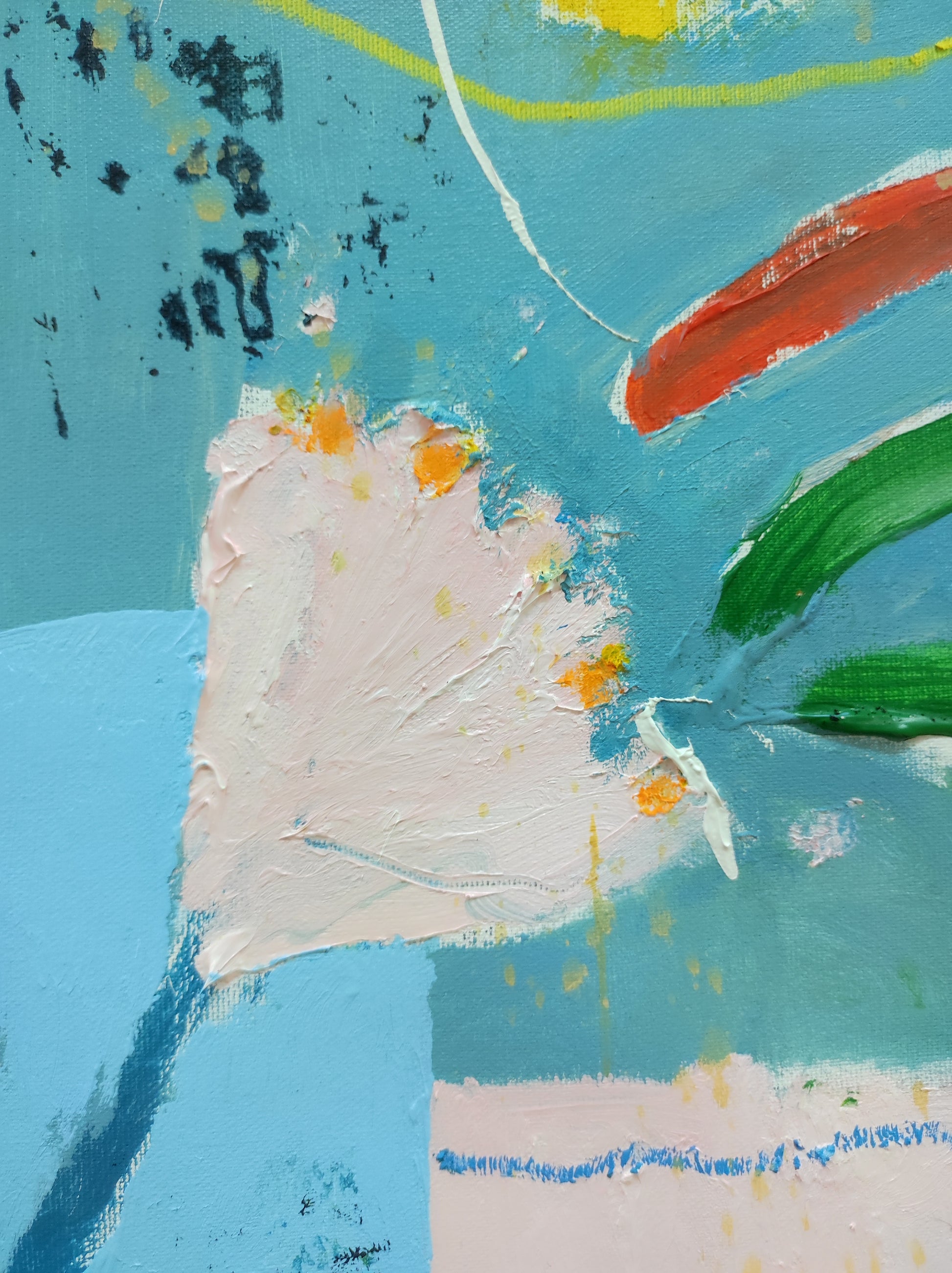 Pintura gestual, intuitiva, que deja que las cosas pasen y se apoya sobre lo que aparece. Aprovechando el accidente y aceptando las consecuencias.