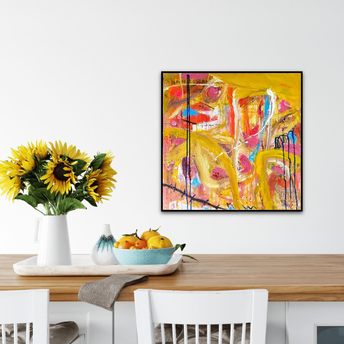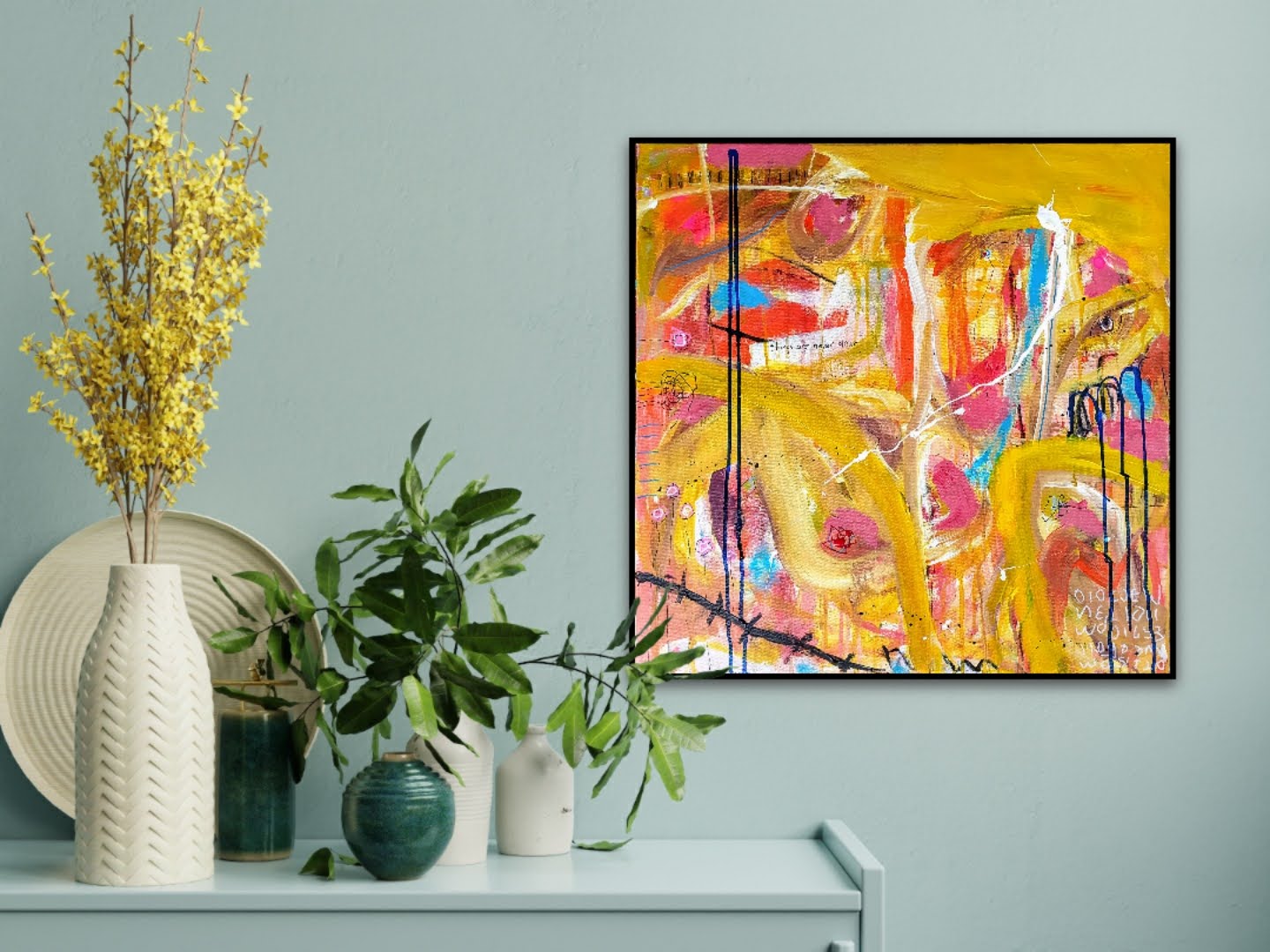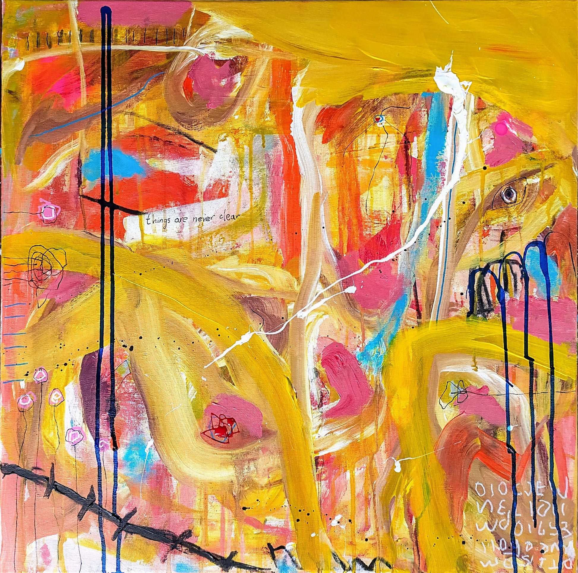 Trabajo con múltiples capas, donde finalmente destacan trazos tubulares amarillos, tonos rojos, azules y rosas. Marcas, dripping, pequeños dibujos y la frase "things are never clear".