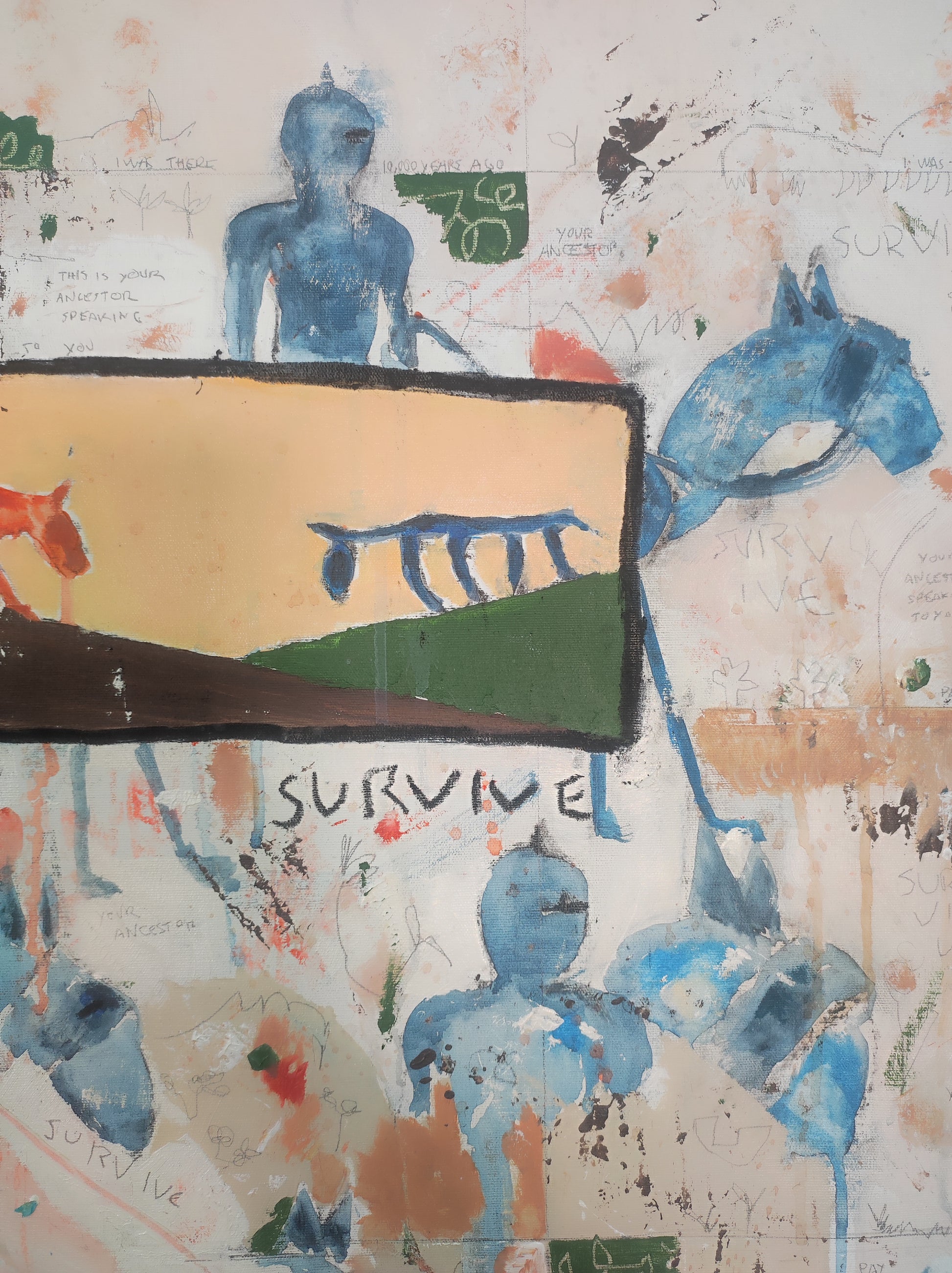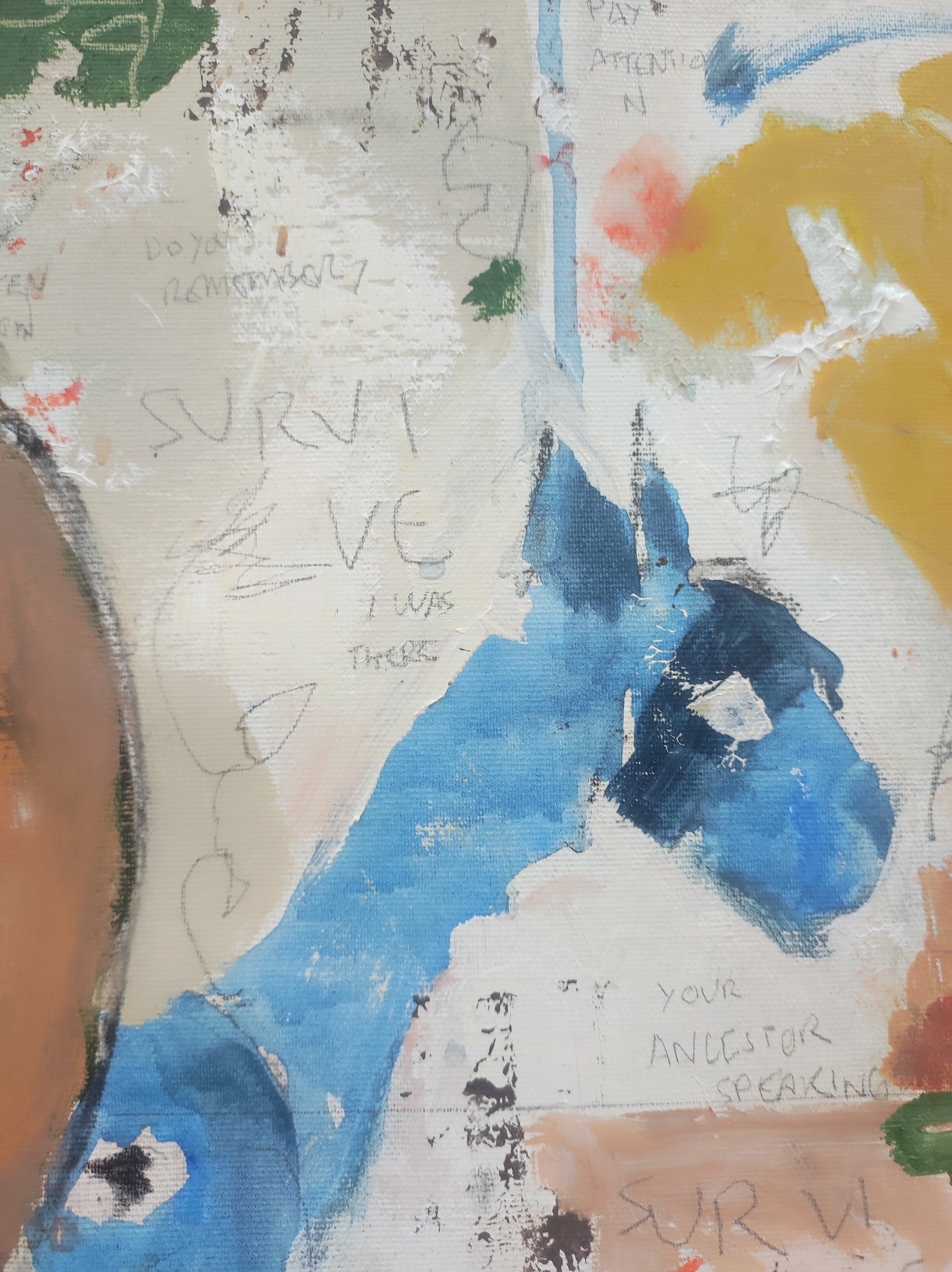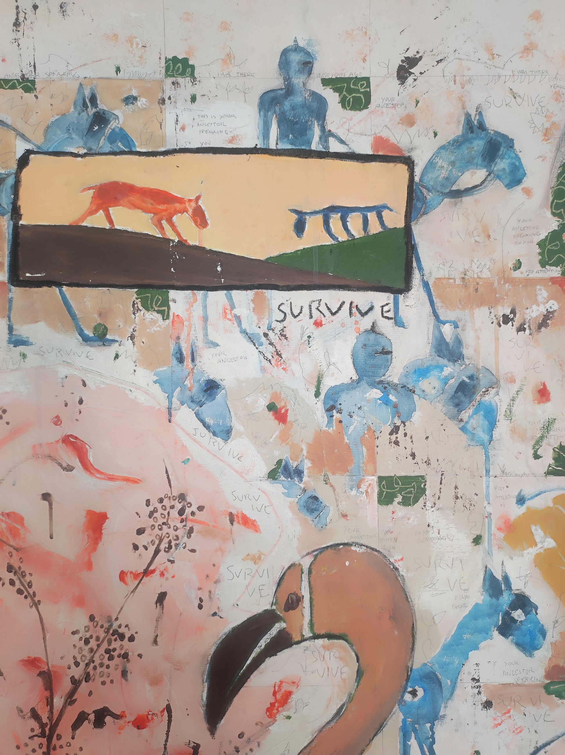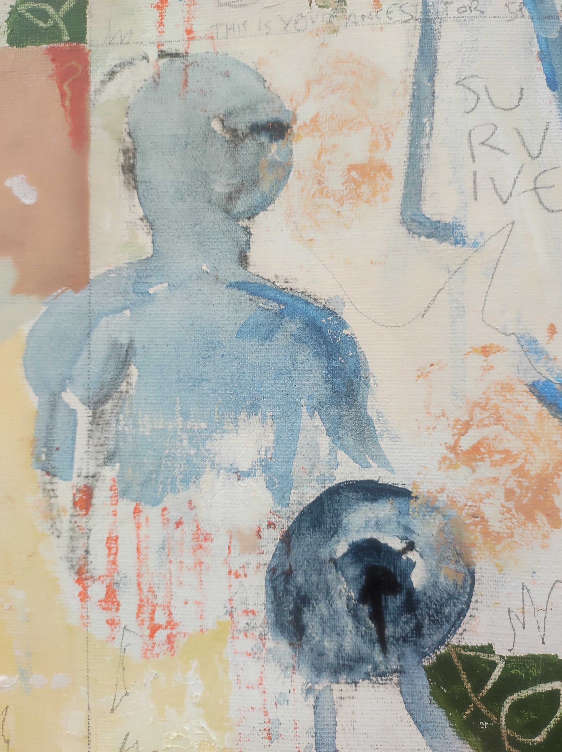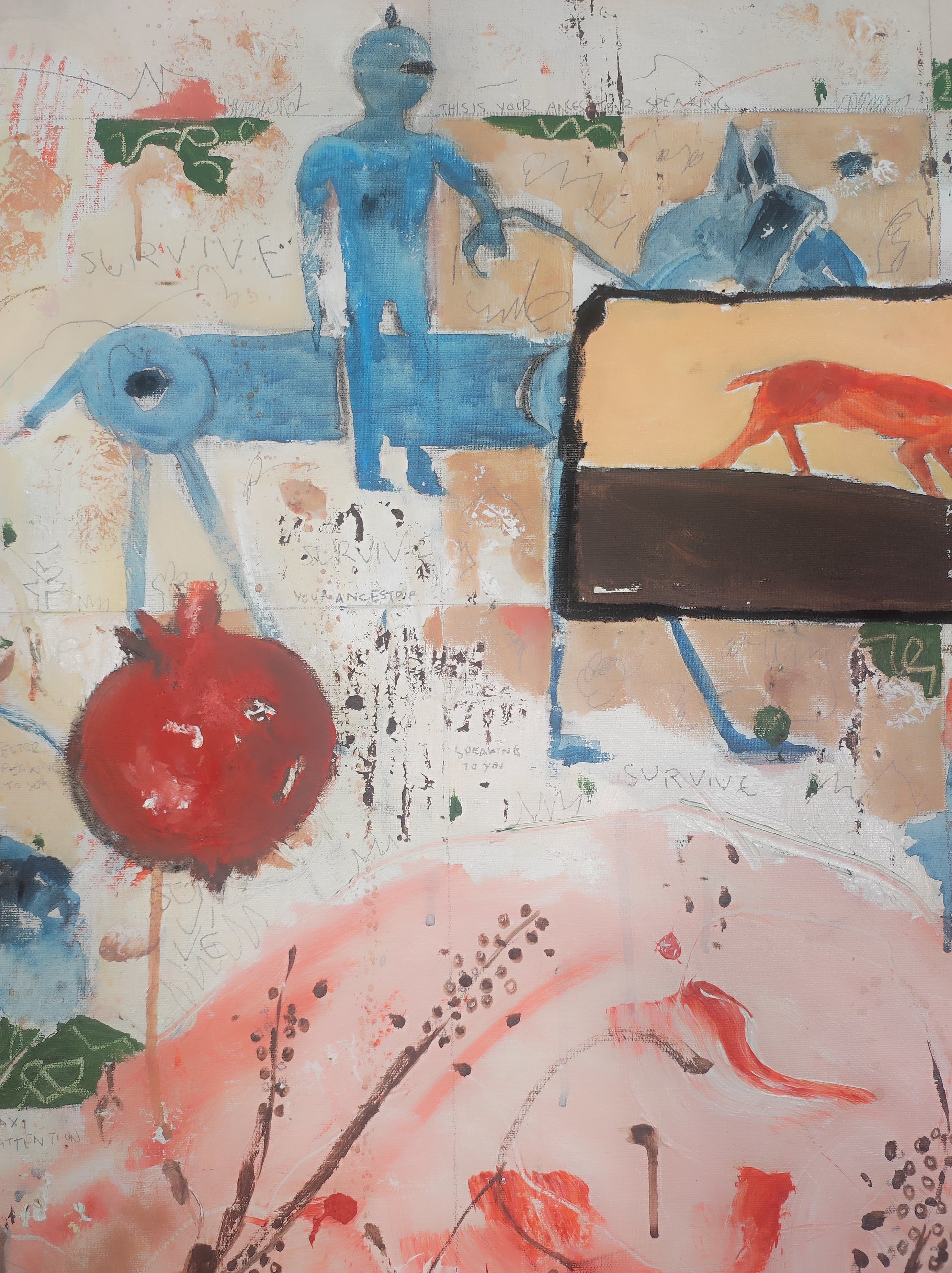 Técnica: acrílico, pigmentos, lápiz, carboncillo, tinta china y gesso.