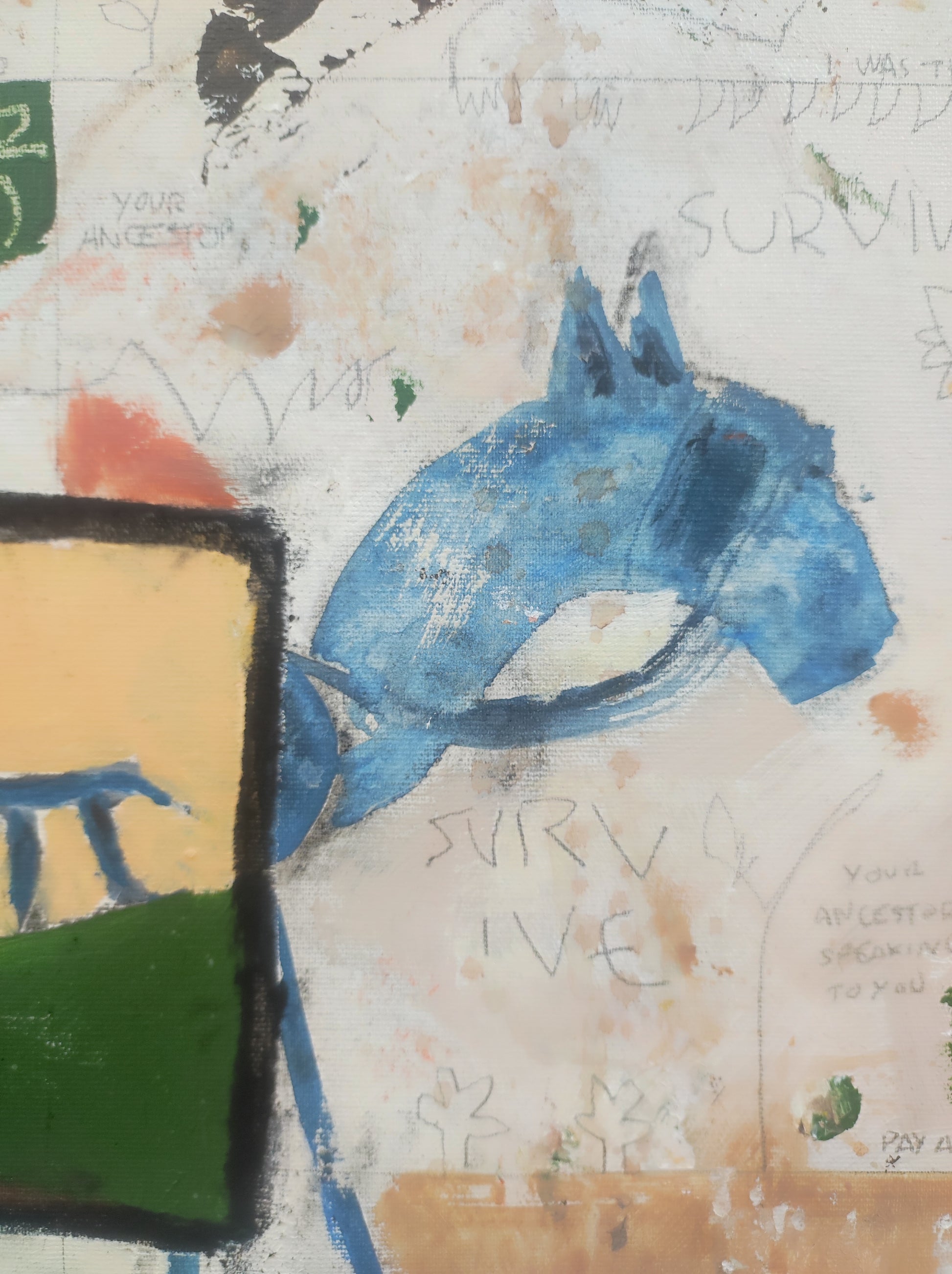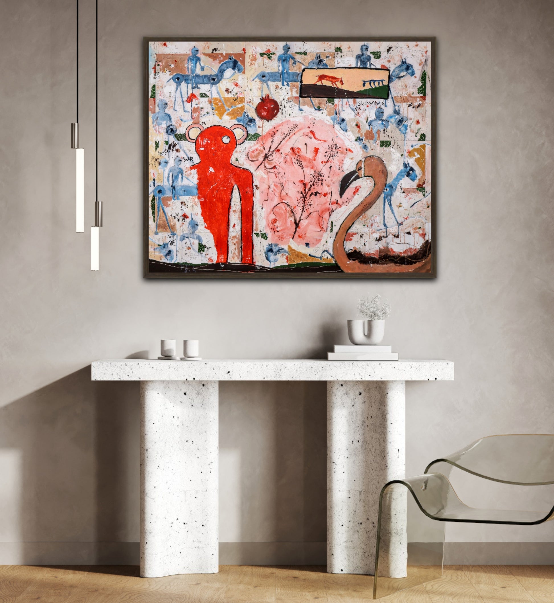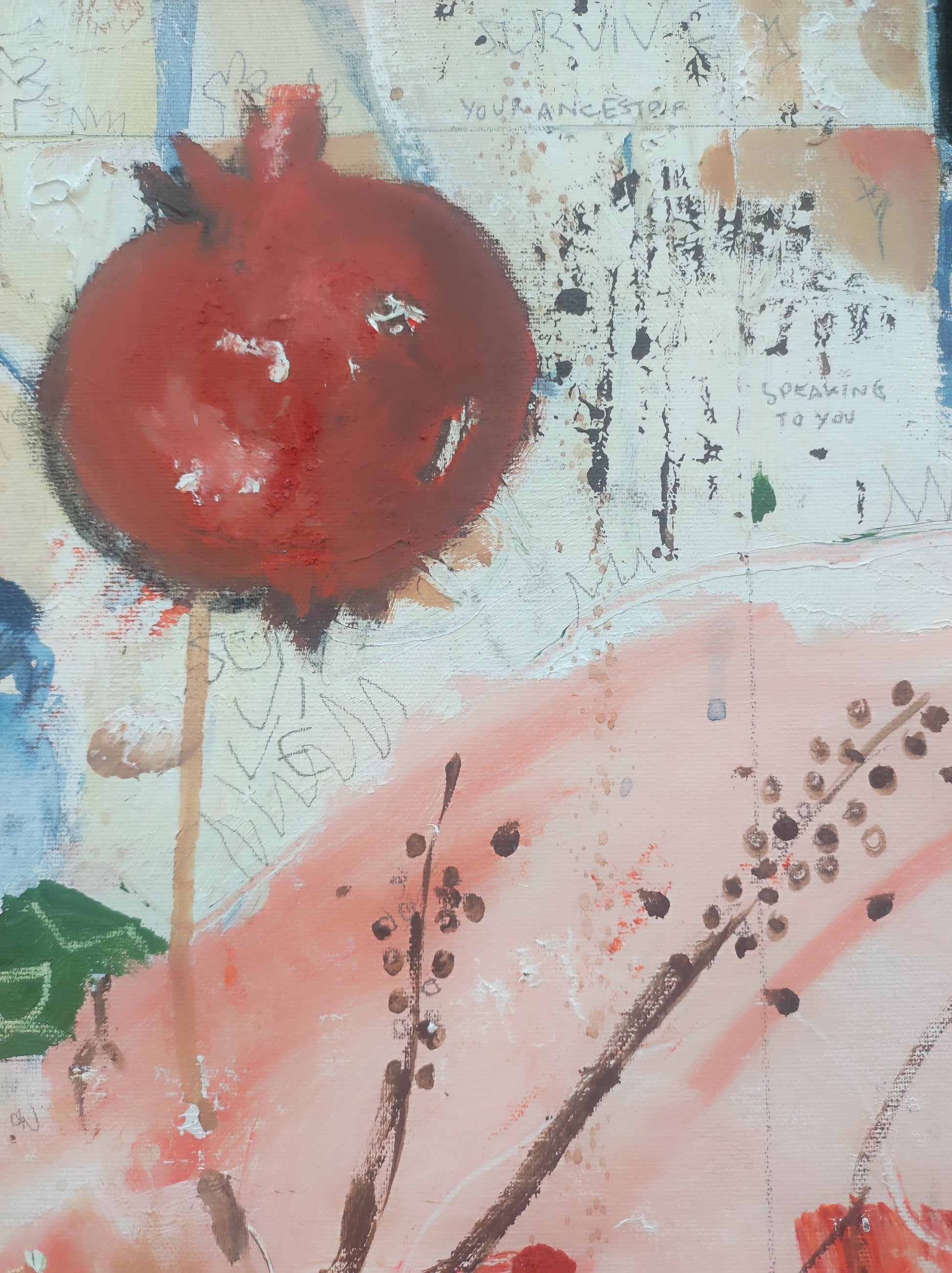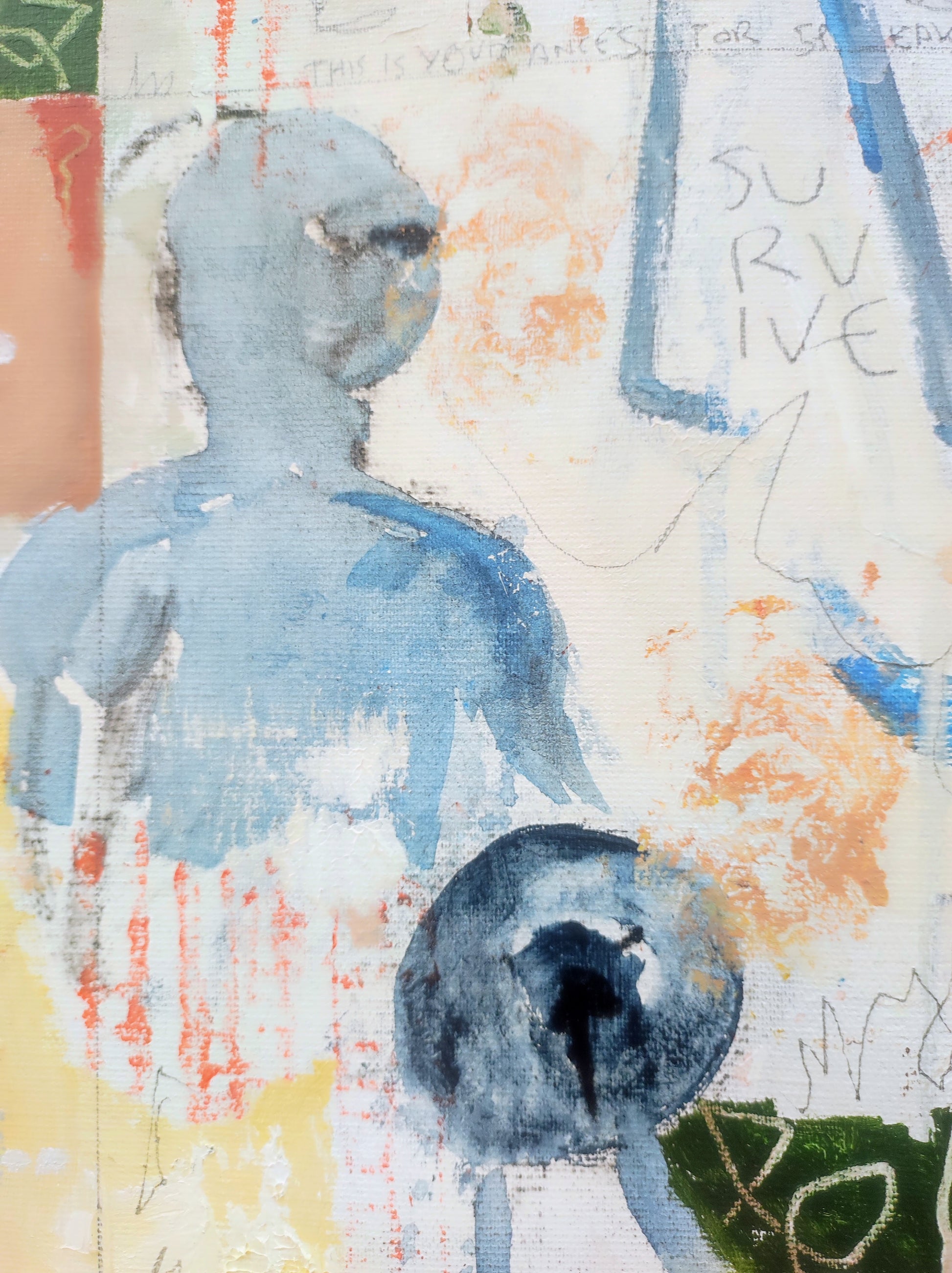 Técnica: acrílico, pigmentos, lápiz, carboncillo, tinta china y gesso.